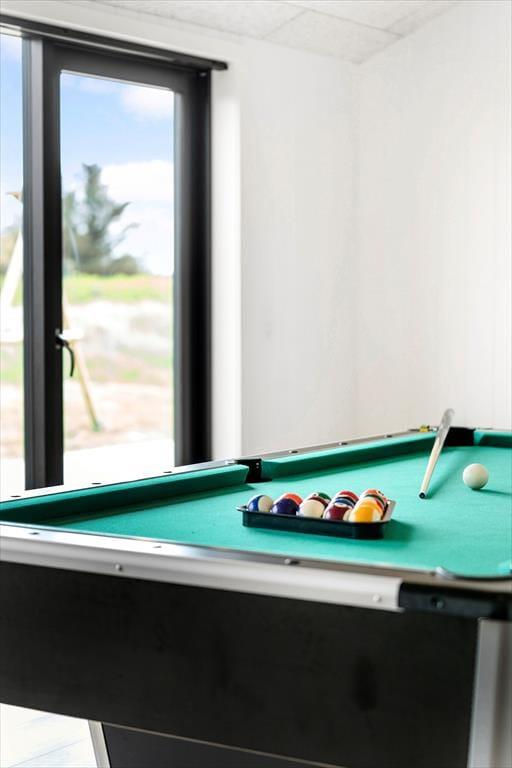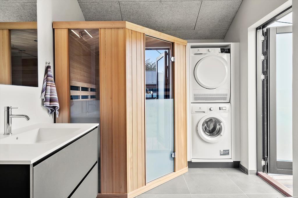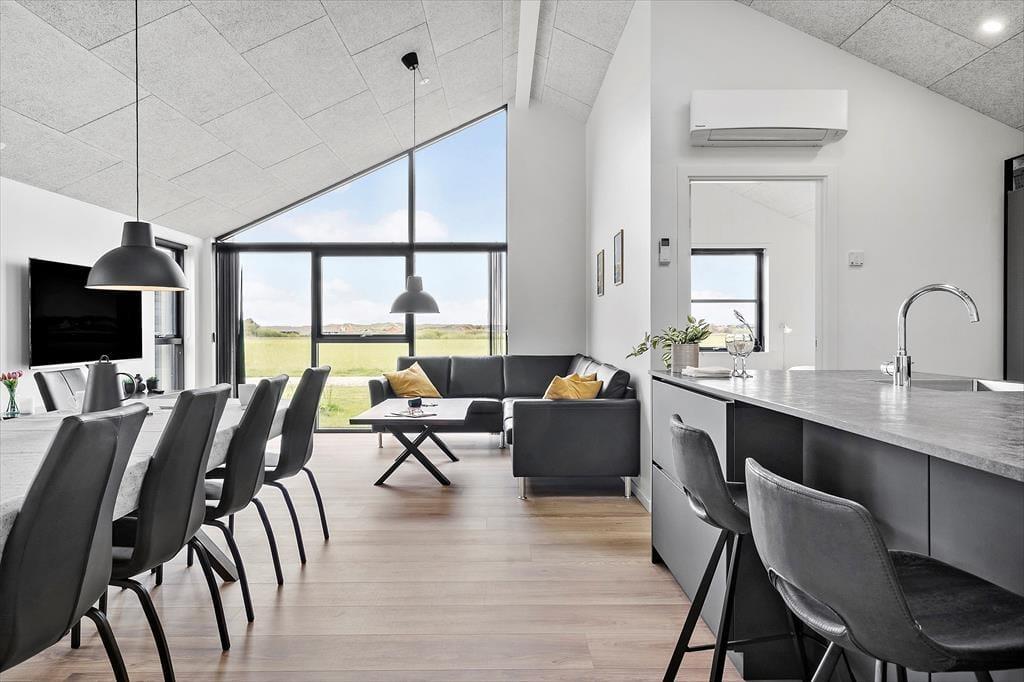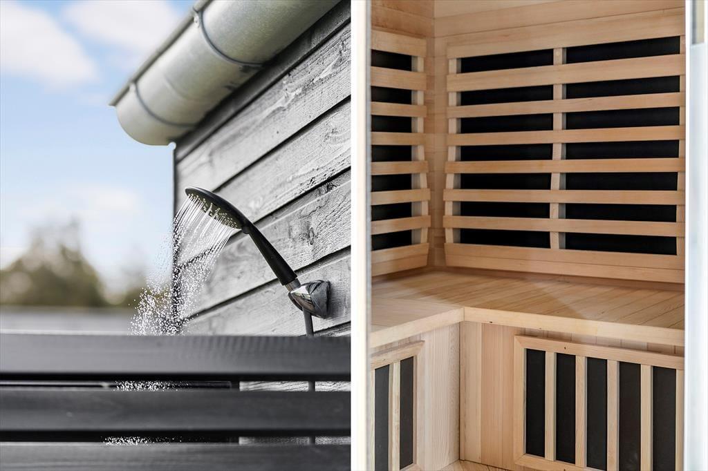 Das 2022 erbaute Ferienhaus beeindruckt mit einer hellen und großzügigen Atmosphäre, hohen Decken und großen Fenstern, die das Tageslicht hereinströmen lassen. Die fünf Schlafzimmer sind mit bequemen Betten ausgestattet – drei davon mit Doppelbetten und zwei mit Einzelbetten, was Platz für bis zu zehn Personen bietet. Die beiden Badezimmer befinden sich an den gegenüberliegenden Enden des Hauses. Das größere Badezimmer verfügt über eine Sauna und direkten Zugang zur Terrasse, wo eine Außendusche und der Whirlpool auf dich warten. Der Wohnbereich kombiniert Küche, Essbereich und Wohnzimmer in einem offenen Raum, ideal für gemeinsames Kochen und gemütliche Abende vor dem Flachbildfernseher. Der angrenzende Aktivitätsraum mit Billardtisch sorgt für Unterhaltung, während der Wintergarten mit flexiblen Glaselementen es ermöglicht, die Natur bei jedem Wetter zu genießen.