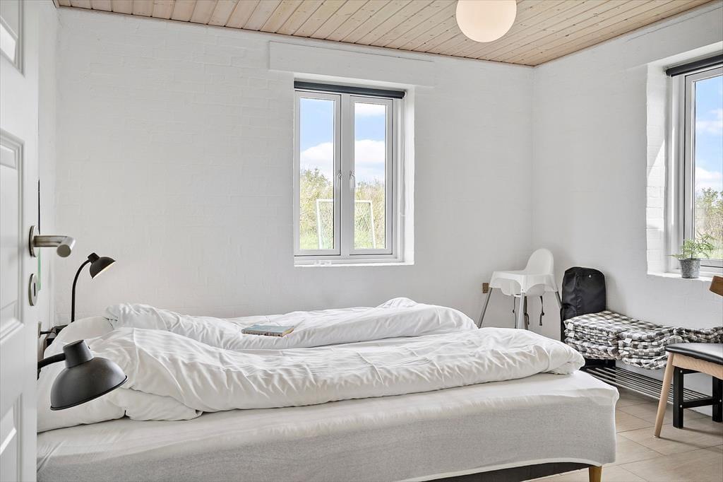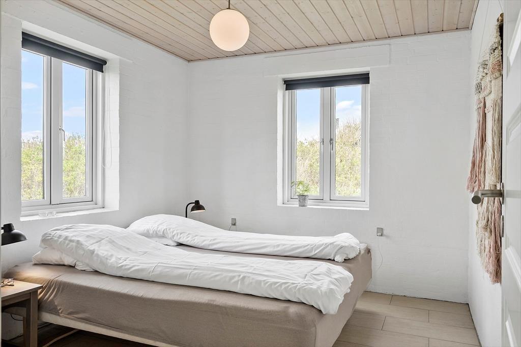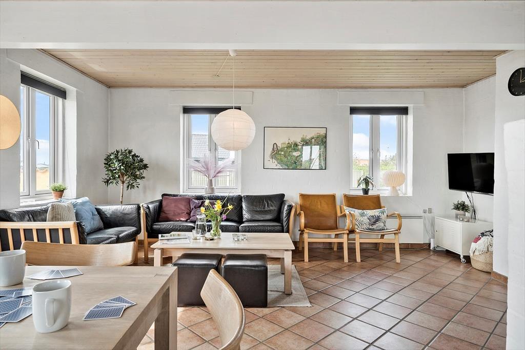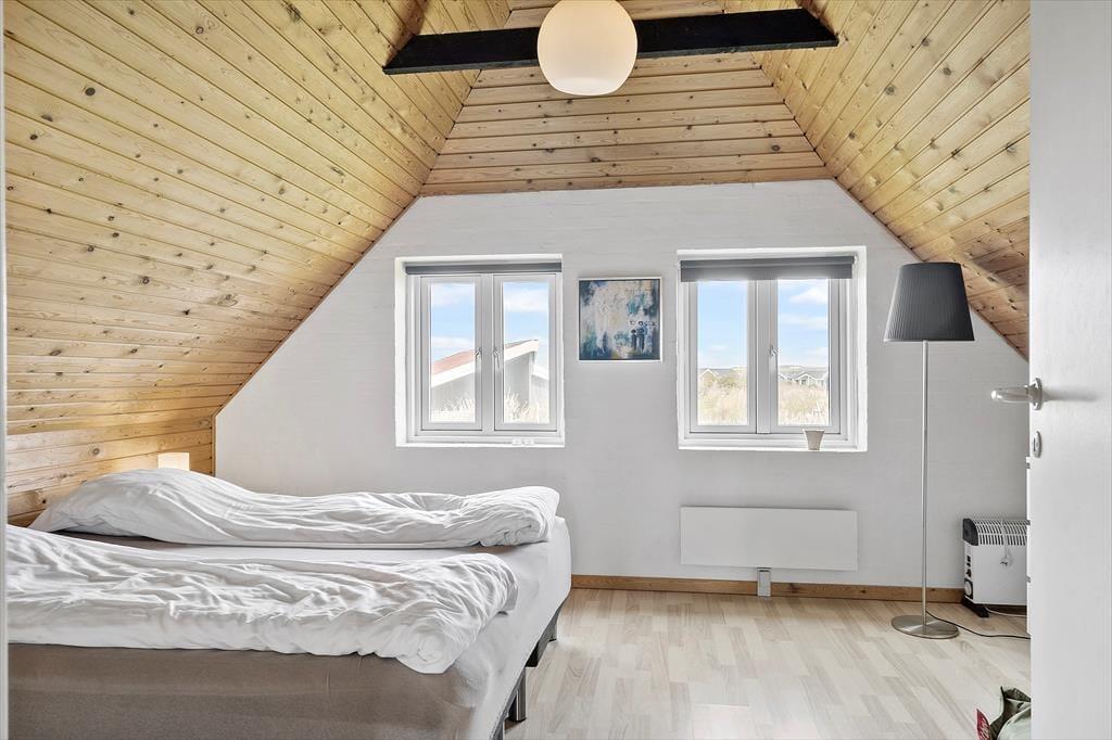 Der Whirlpool und die Sauna sind nur zwei der Annehmlichkeiten, die deinen Urlaub in diesem 138 m² großen Ferienhaus besonders erholsam machen. Dank des im ersten Stock platzierten Gäste-WCs genießt du deine entspannten Wellnessstunden im Badezimmer ohne unangenehme Störungen. Die Wohnfläche ist optimal auf eine Belegung mit zehn Personen ausgerichtet. Neben fünf Schlafräumen steht ein schöner Aufenthaltsraum mit einer Polstersitzgruppe, einem Kaminofen und einem Esstisch zur Verfügung. In der offenen, zweiseitigen Küche wird die gemeinsame Zubereitung der Mahlzeiten zum geselligen Vergnügen. Besondere Erwähnung bedarf das Obergeschoss, da du hier gen Süden mit einem reizvollen Blick über offene Felder und über den See von Ferring bis zum Leuchtturm Bovbjerg Fyr verwöhnt wirst.