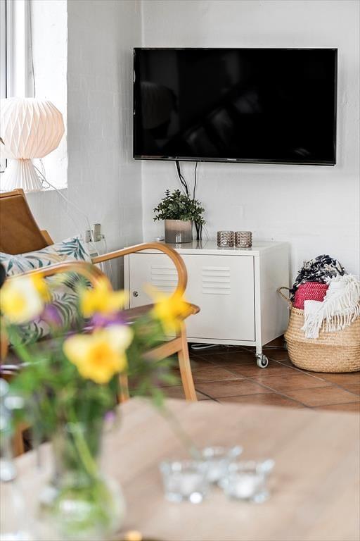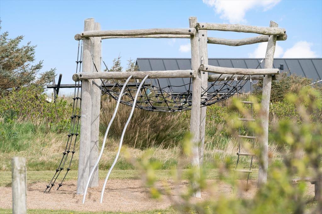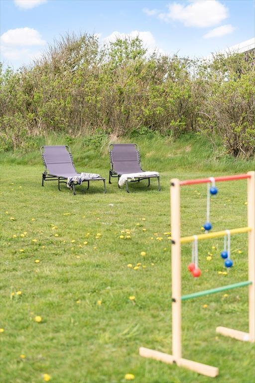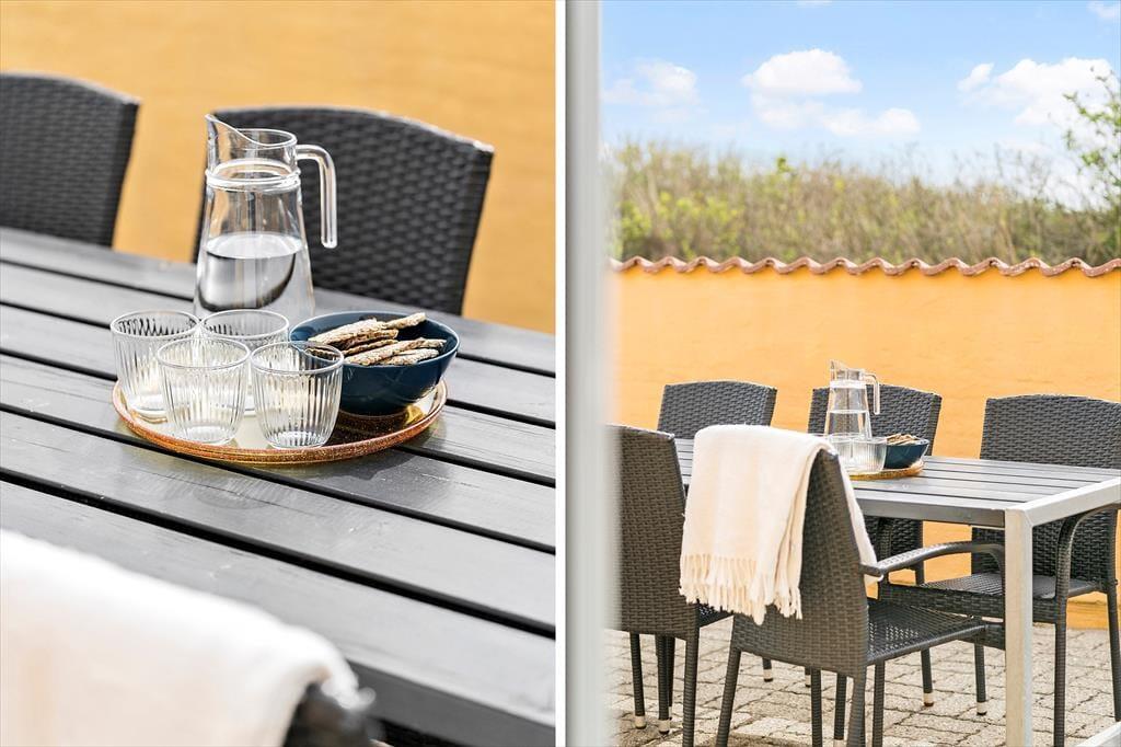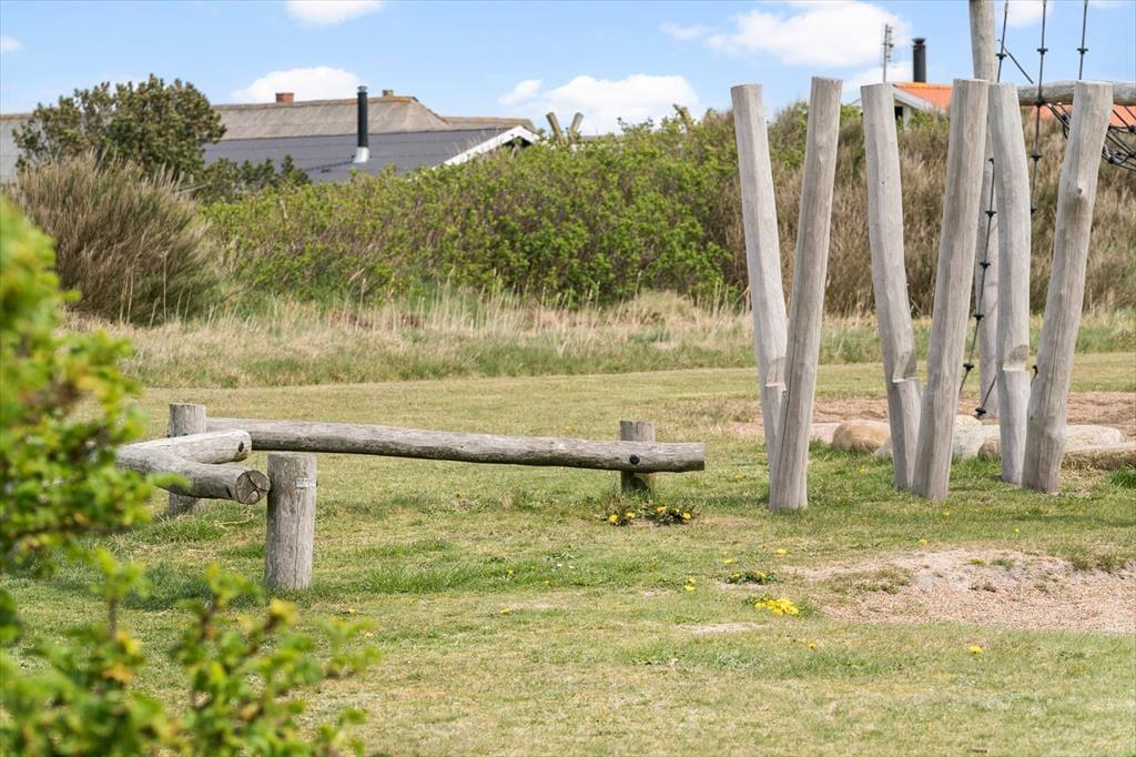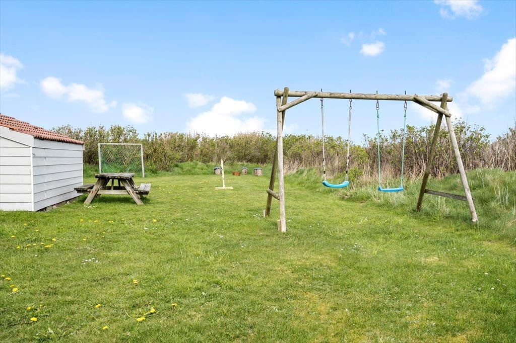 Die Terrasse des Mietobjektes ist schön zur Sonne hin ausgerichtet. Die gelbe Steinmauer schirmt die Außenbereiche ein wenig ab, sodass du hier mit deinen Lieben wunderbar das Mittagessen im Freien und ein anschließendes Nickerchen genießen kannst. Spiel und Spaß werden auf dem Grundstück großgeschrieben. Während die Jüngsten schaukeln, kann der Rest deiner Familie auf der Grasfläche Fußball- und Leitergolf spielen. Allabendlich lädt die Feuerstelle zum gemütliche Tagesausklang ein. Am Ende des Weges führt ein Pfad zum nächstgelegenen Spielplatz. Während die größeren Kinder allein auf dem Spielplatz toben, gönnst du dir in aller Ruhe einen frischen Kaffee. Nach der Rückkehr der Kinder brecht ihr alle gemeinsam an den Strand auf.