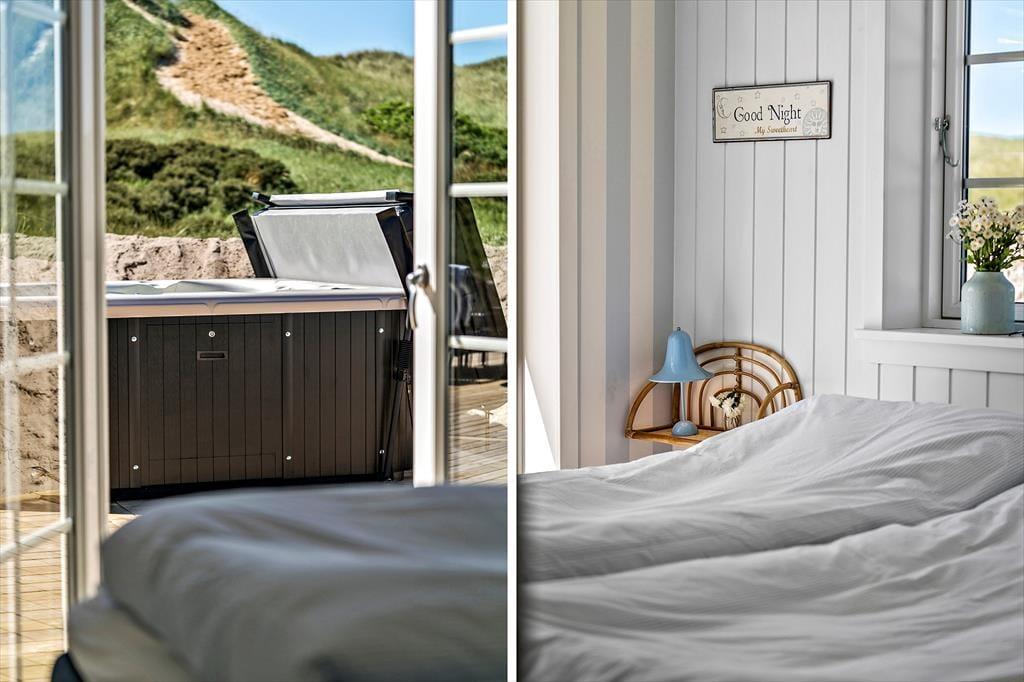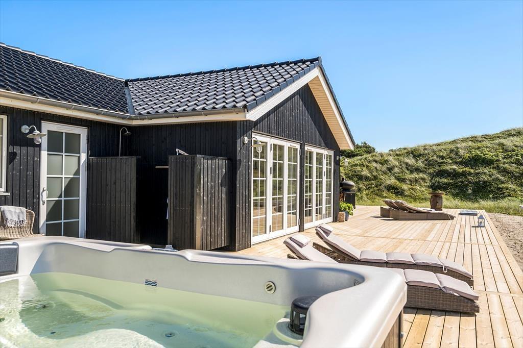 Dieses wunderschöne Ferienhaus in Vejlby Klit ist ein fantastischer Ort, um Urlaub zu machen. Der Stil ist hell und elegant, so dass es fast so ist, als ob du in einem klassischen Badehotel an der Westküste einchecken würdest – aber gleichzeitig genießt du alle Vorteile, die ein vollständig ausgestattetes Ferienhaus bietet, mit einer luxuriösen Küche, einer Sauna im einen Badezimmer und einem Whirlpool auf der Sonnenterrasse.