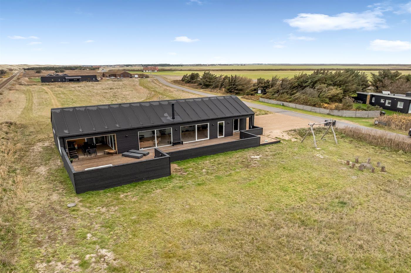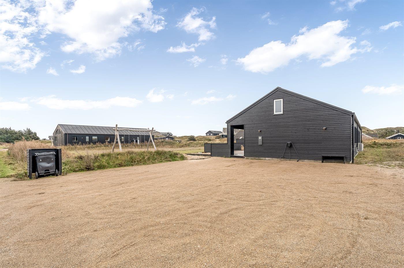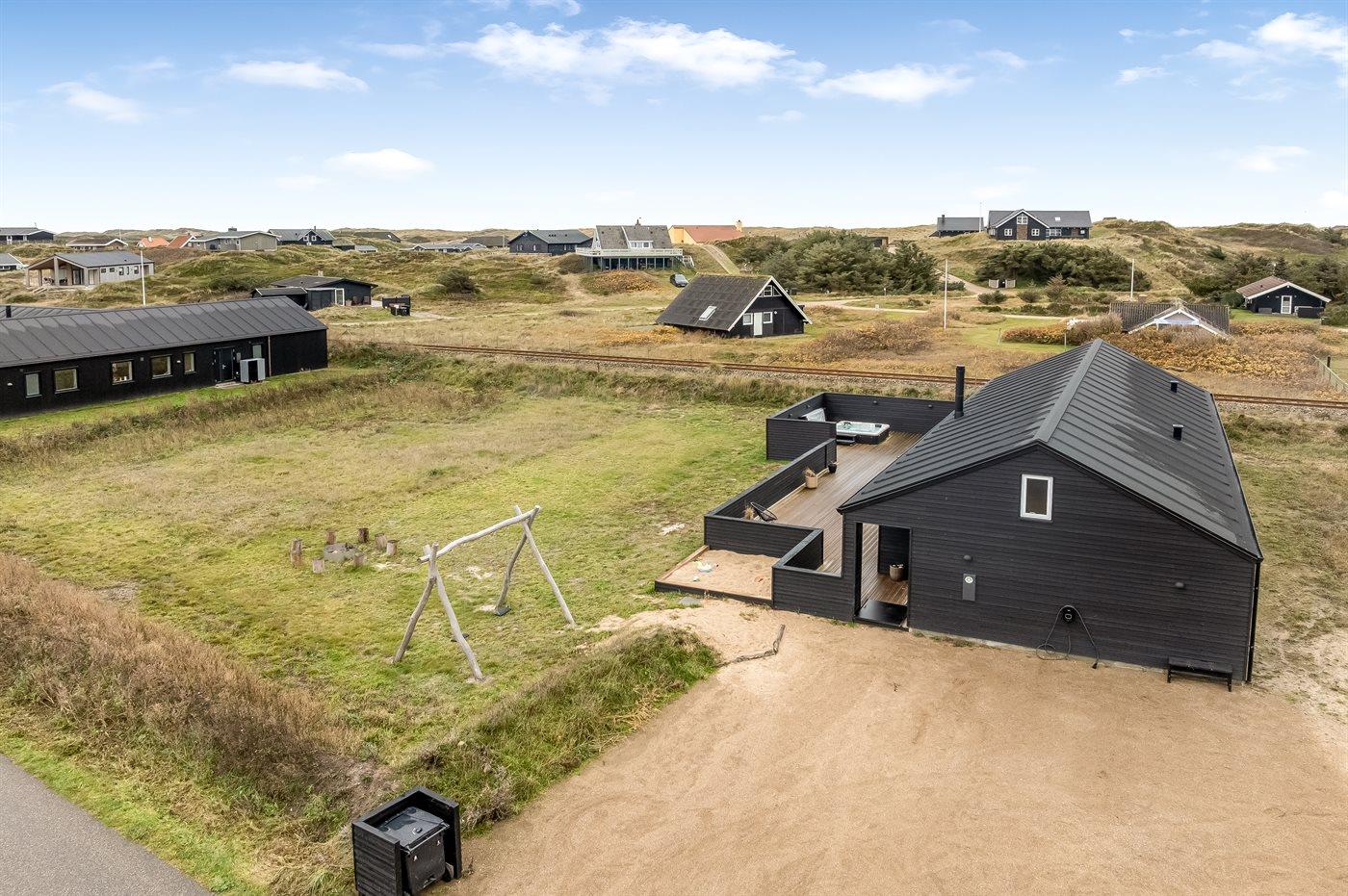 Die Ferienunterkunft liegt auf einem 2000 m² großen Dünengrundstück. Die Entfernung zum Meer beträgt 300 m. Es steht ein offenes Terrassenareal zur Verfügung. Außerdem gibt es überdachte Terrasse. Schaukel. Sandkasten. Es ist ein Ladestecker für Elektroautos installiert. Ladestecker Typ 2. Parkplatz auf dem Grundstück.