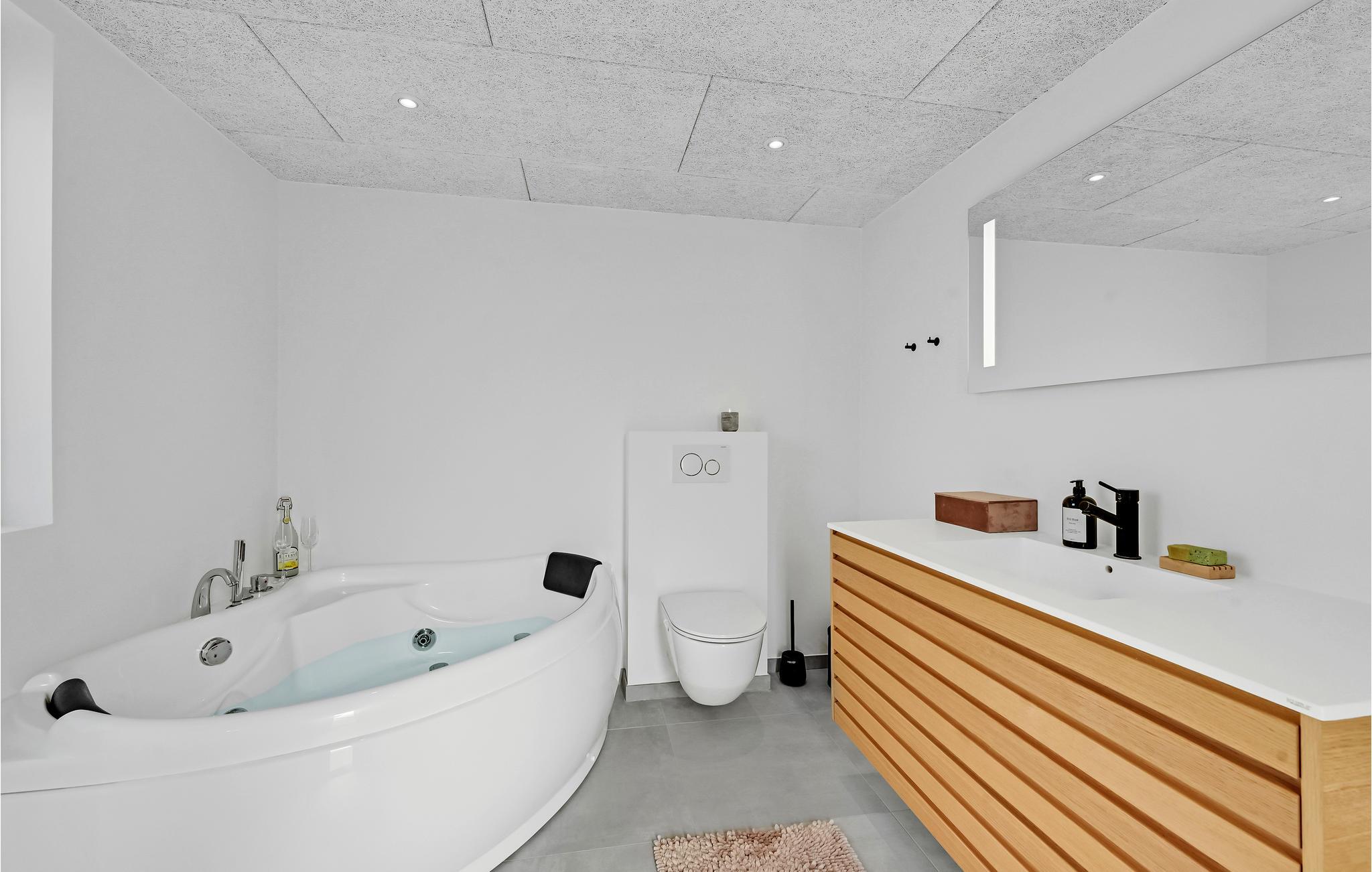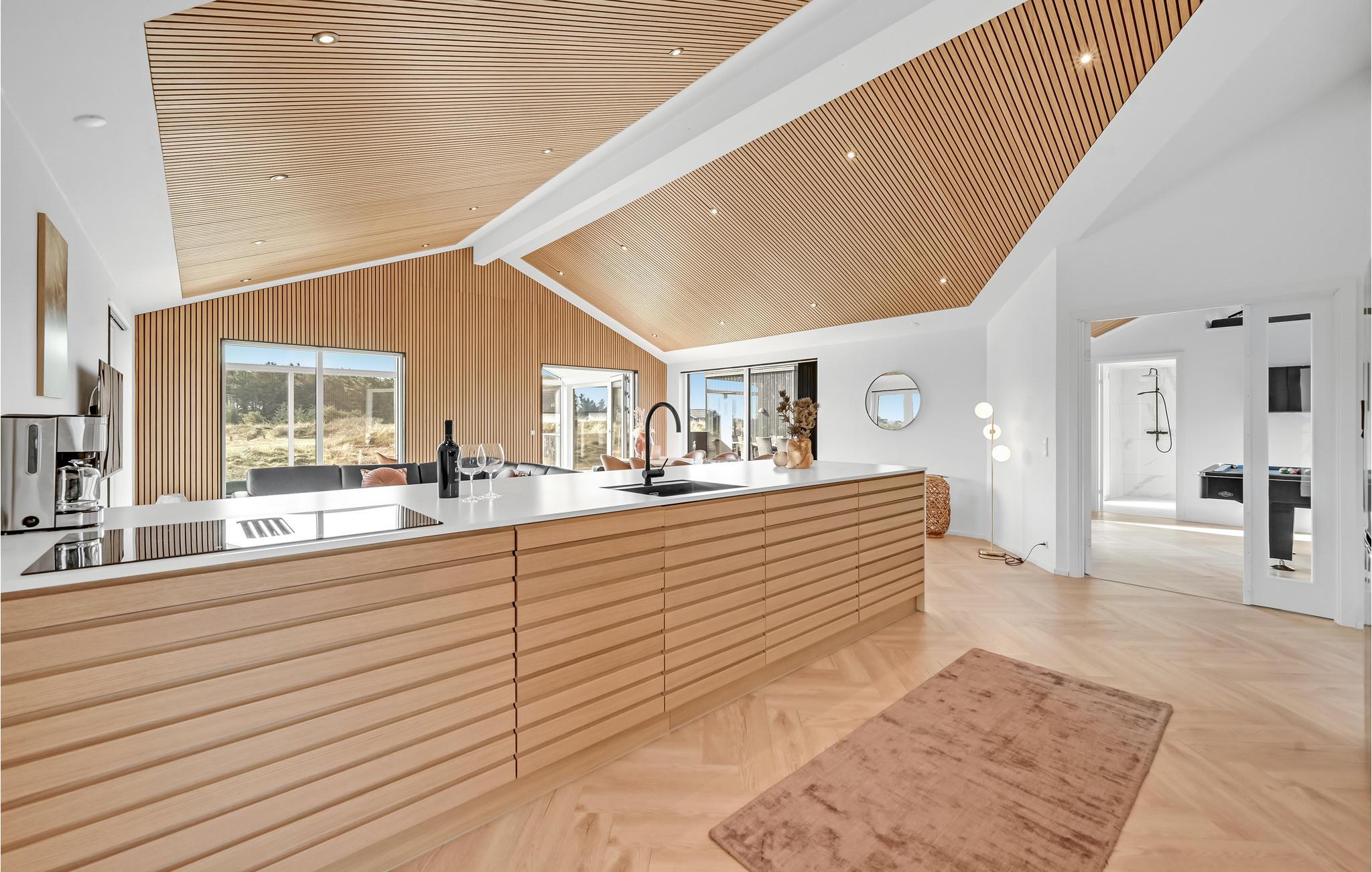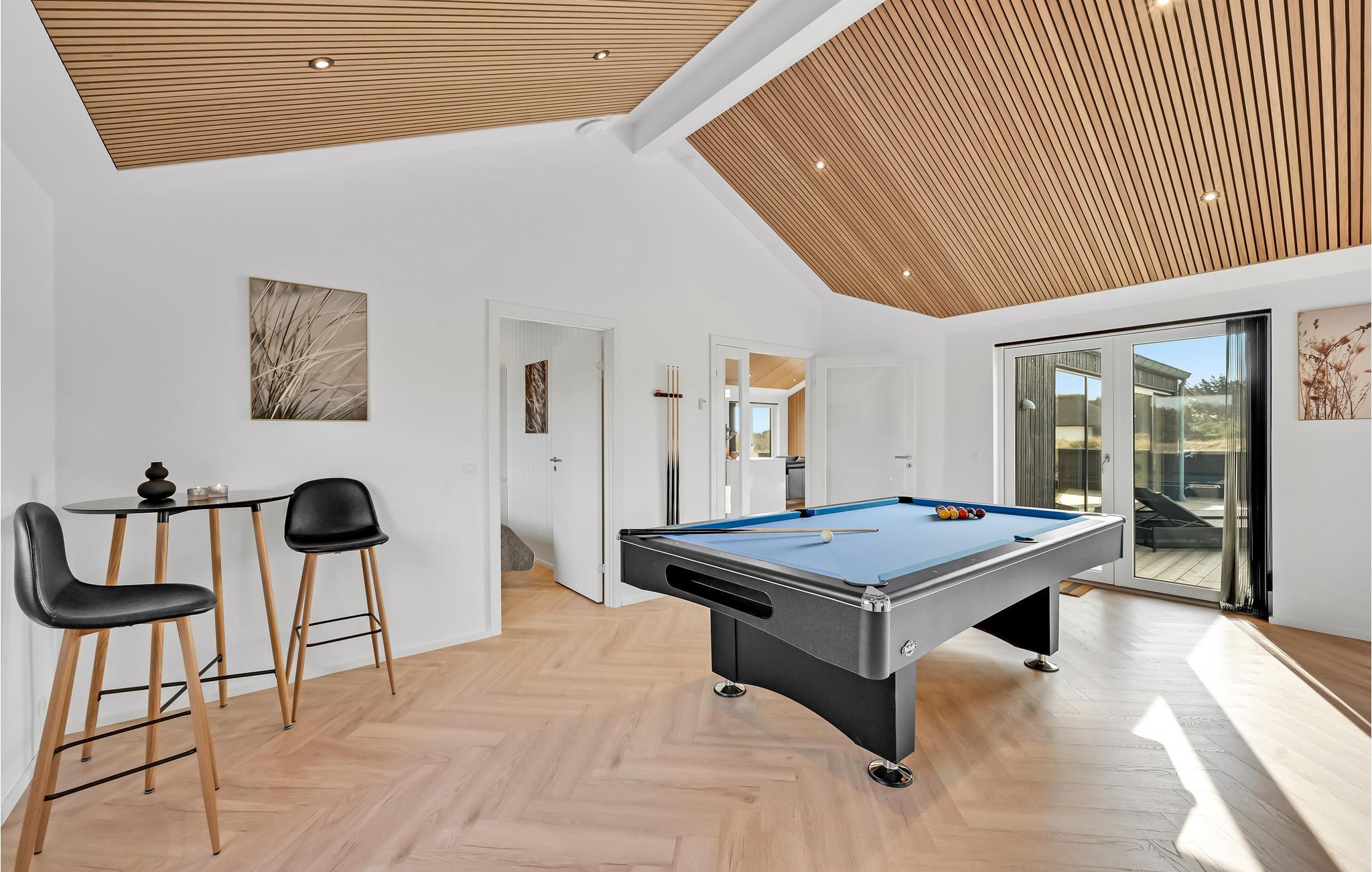 Sie treten ein in ein modernes und edles mit stilvollen Möbeln ausgestattetes Ferienhaus. Die hohe Decke und spannende Konstruktion dieser bietet Ihnen genug Raum zum Atmen und ebenso ein geräumiges Gefühl. Dank der großen Fensterfronten gelangt unglaublich viel Licht in den Raum, welches das natürliche Flair noch etwas verstärkt. Alle Gäste kommen hier auf ihre Kosten, nicht zuletzt im Aktivitätsraum, wo ein Billardtisch und Darts Sie erwarten. Draußen befindet sich eine große geschlossene Terrasse, sowie Gartenmöbeln und Grill, somit lässt es sich wunderbar bei einem Grillabend oder einem köstlichen Frühstück aushalten. Das Outdoor-Whirlpool und die Sauna laden Sie ein sich so richtig zu entspannen.