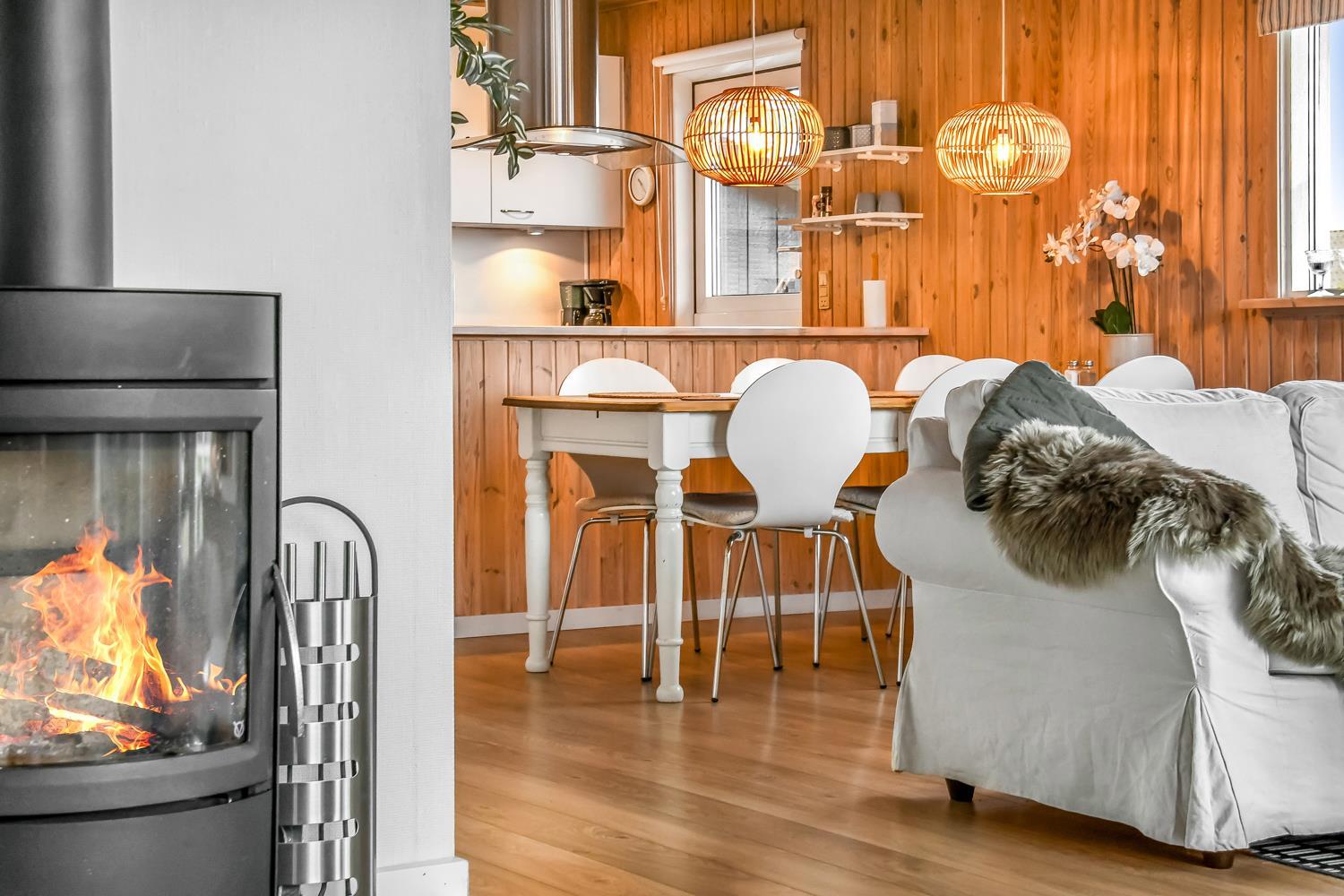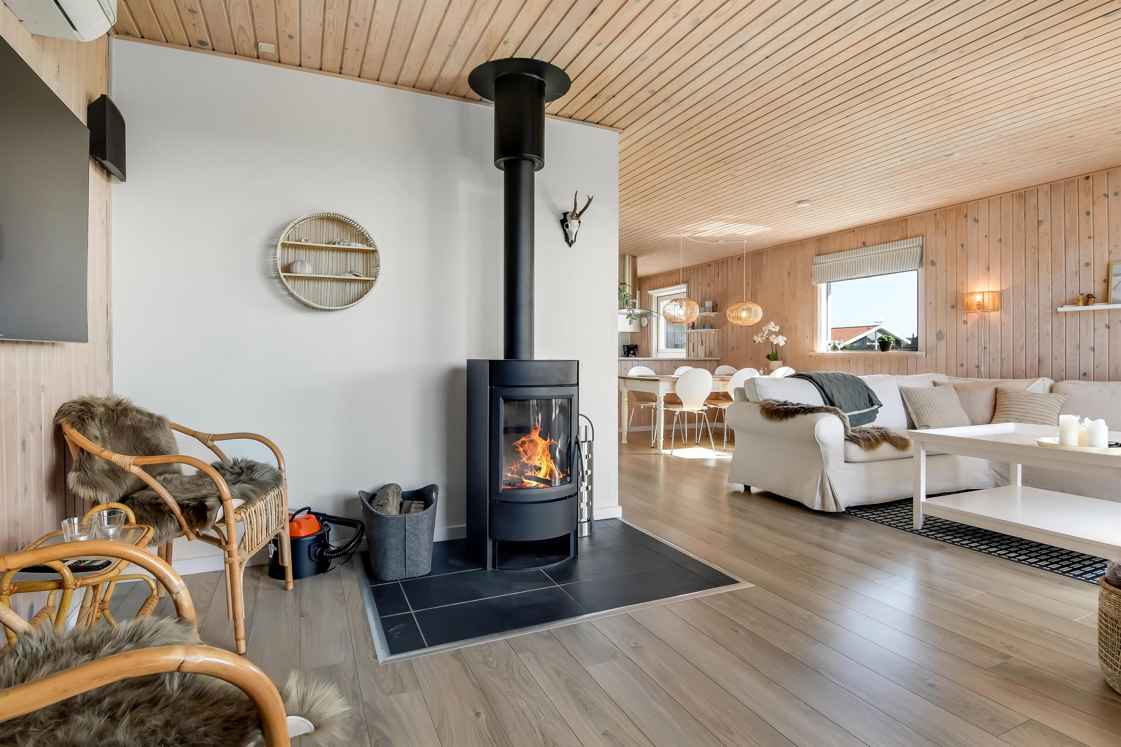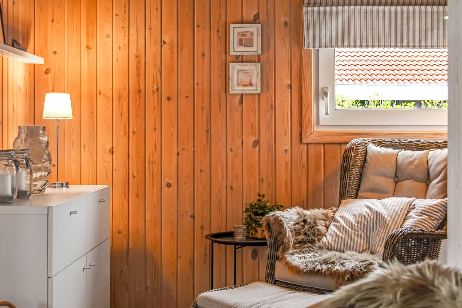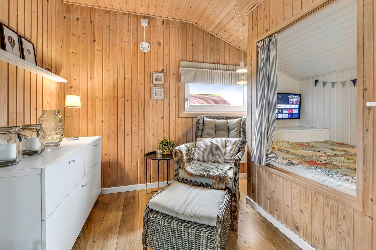 Das Wohnzimmer verfügt über eine Sofaecke, einen Couchtisch und einen Esstisch. Entspannen Sie sich vor dem knisternden Kaminofen, der zusammen mit der Wärmepumpe hilft, die Heizkosten zu senken. Ein Flachbildfernseher mit deutschen und dänischen Programmen, ein CD-Player sowie eine Alkove mit Platz für zwei Personen sind ebenfalls vorhanden.