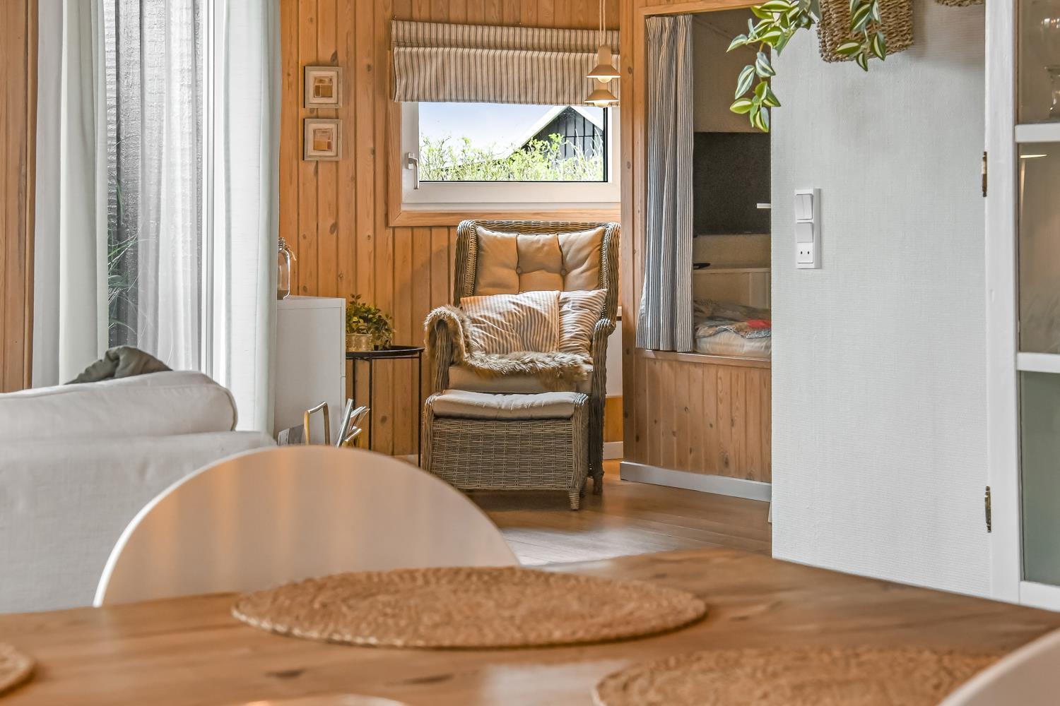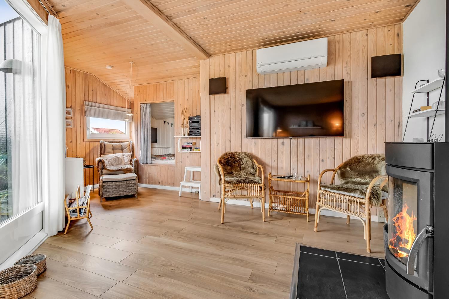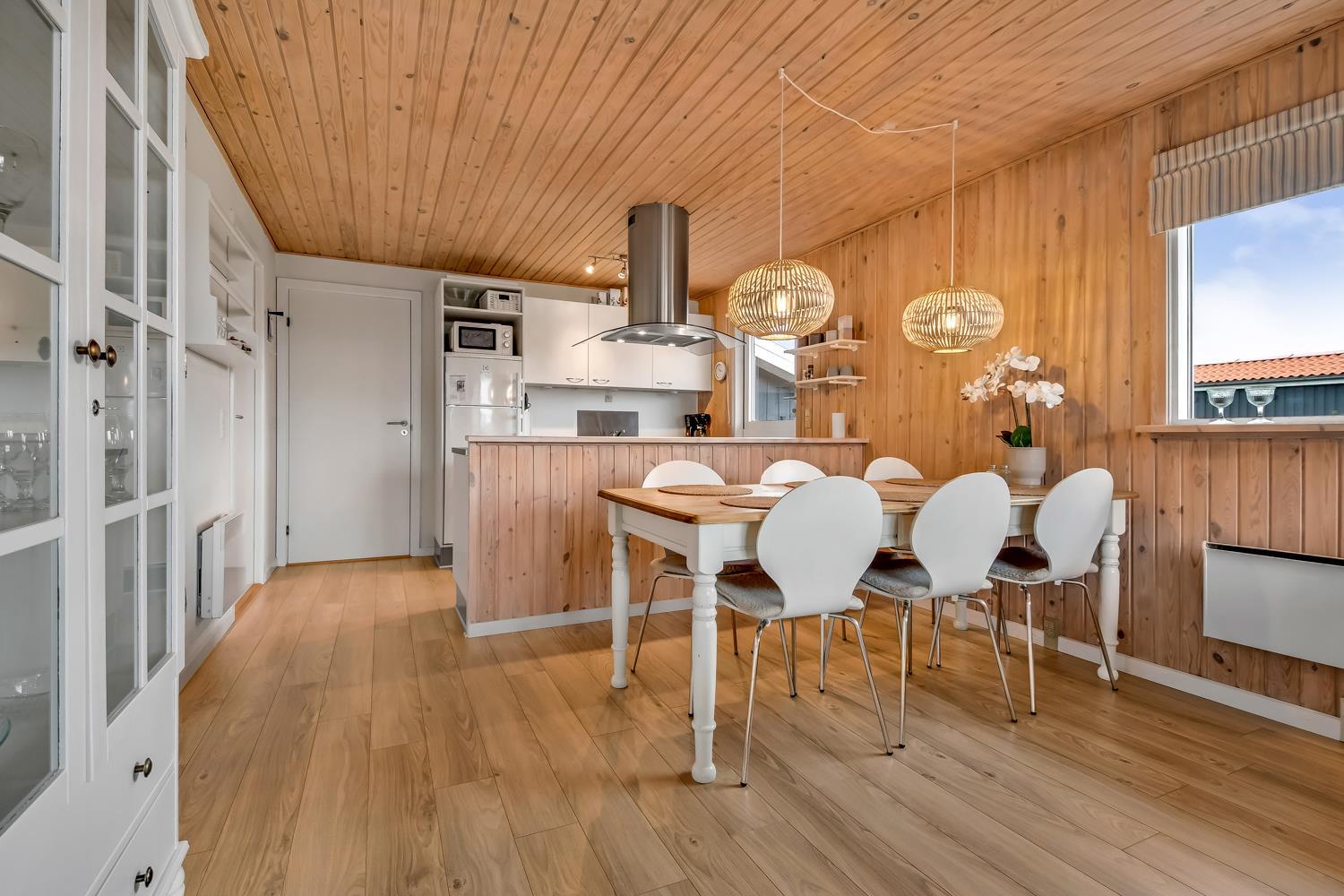 Das Wohnzimmer verfügt über eine Sofaecke, einen Couchtisch und einen Esstisch. Entspannen Sie sich vor dem knisternden Kaminofen, der zusammen mit der Wärmepumpe hilft, die Heizkosten zu senken. Ein Flachbildfernseher mit deutschen und dänischen Programmen, ein CD-Player sowie eine Alkove mit Platz für zwei Personen sind ebenfalls vorhanden.