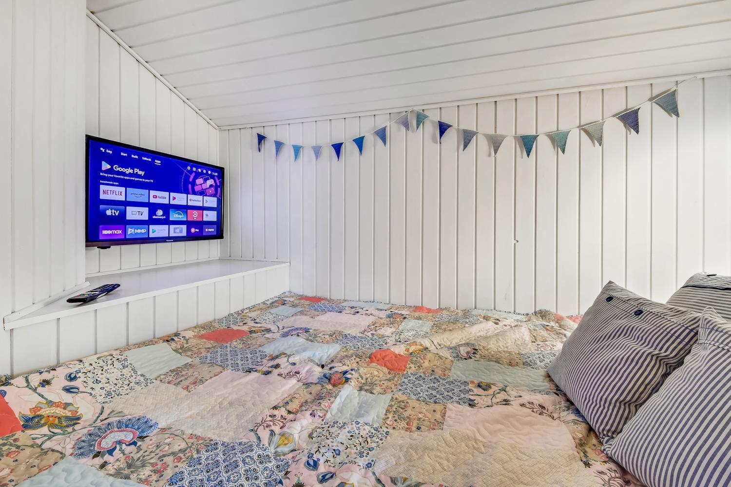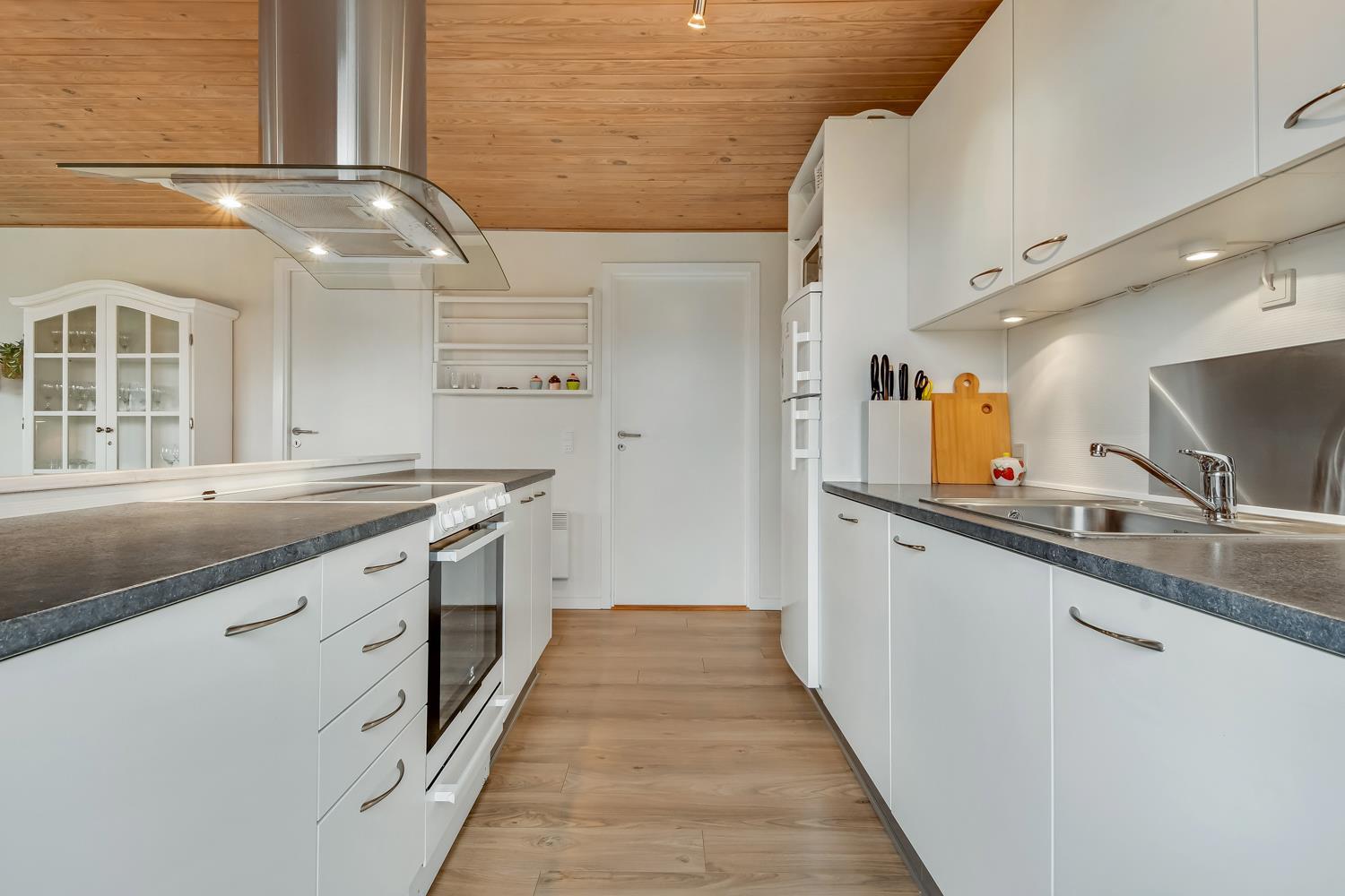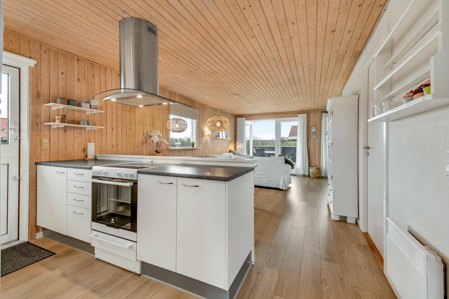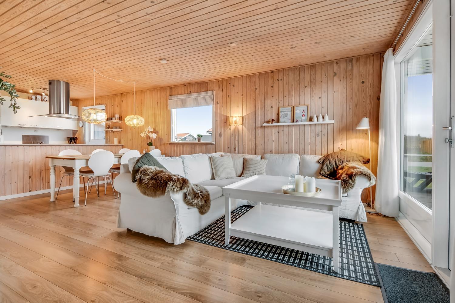 Das Wohnzimmer verfügt über eine Sofaecke, einen Couchtisch und einen Esstisch. Entspannen Sie sich vor dem knisternden Kaminofen, der zusammen mit der Wärmepumpe hilft, die Heizkosten zu senken. Ein Flachbildfernseher mit deutschen und dänischen Programmen, ein CD-Player sowie eine Alkove mit Platz für zwei Personen sind ebenfalls vorhanden.