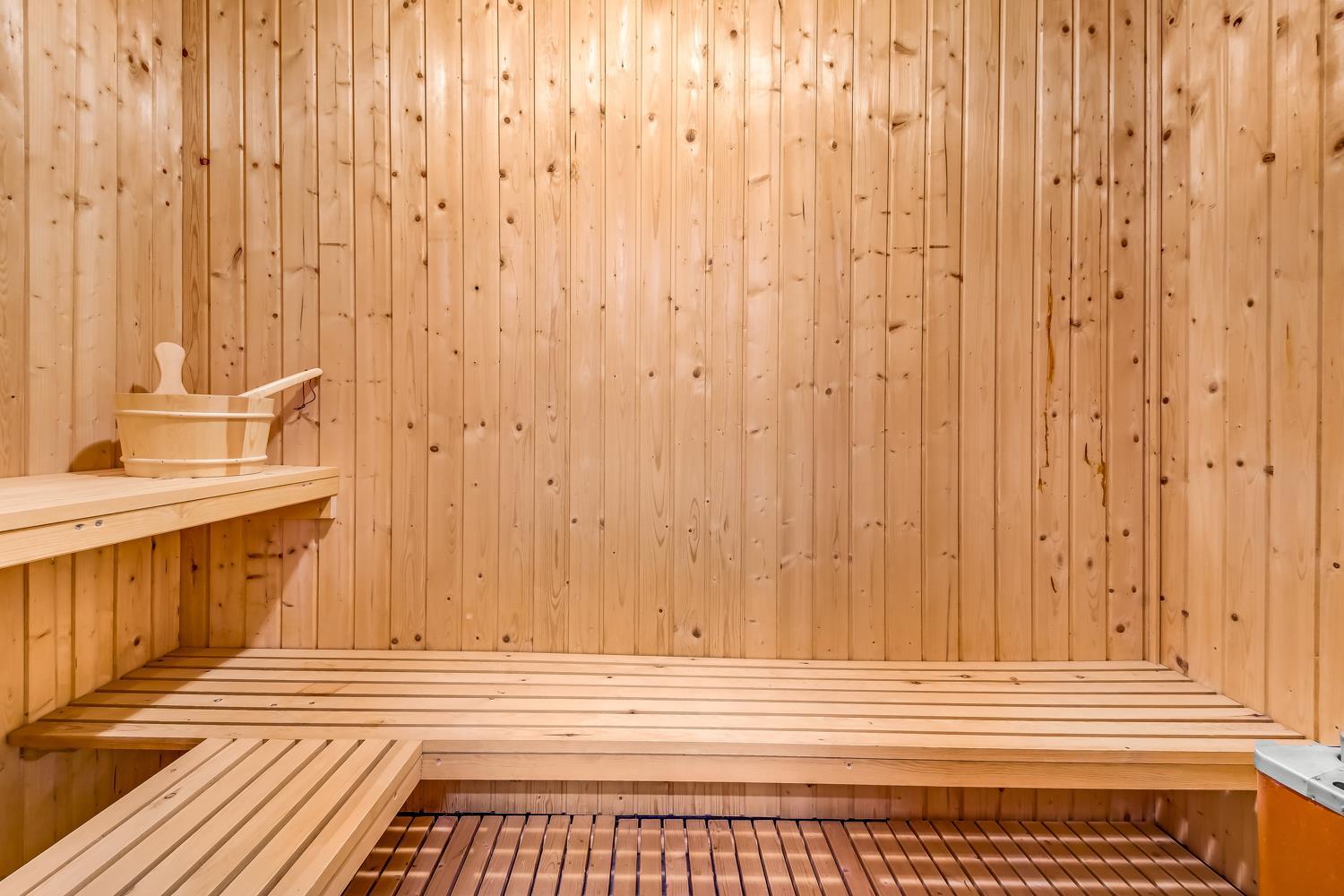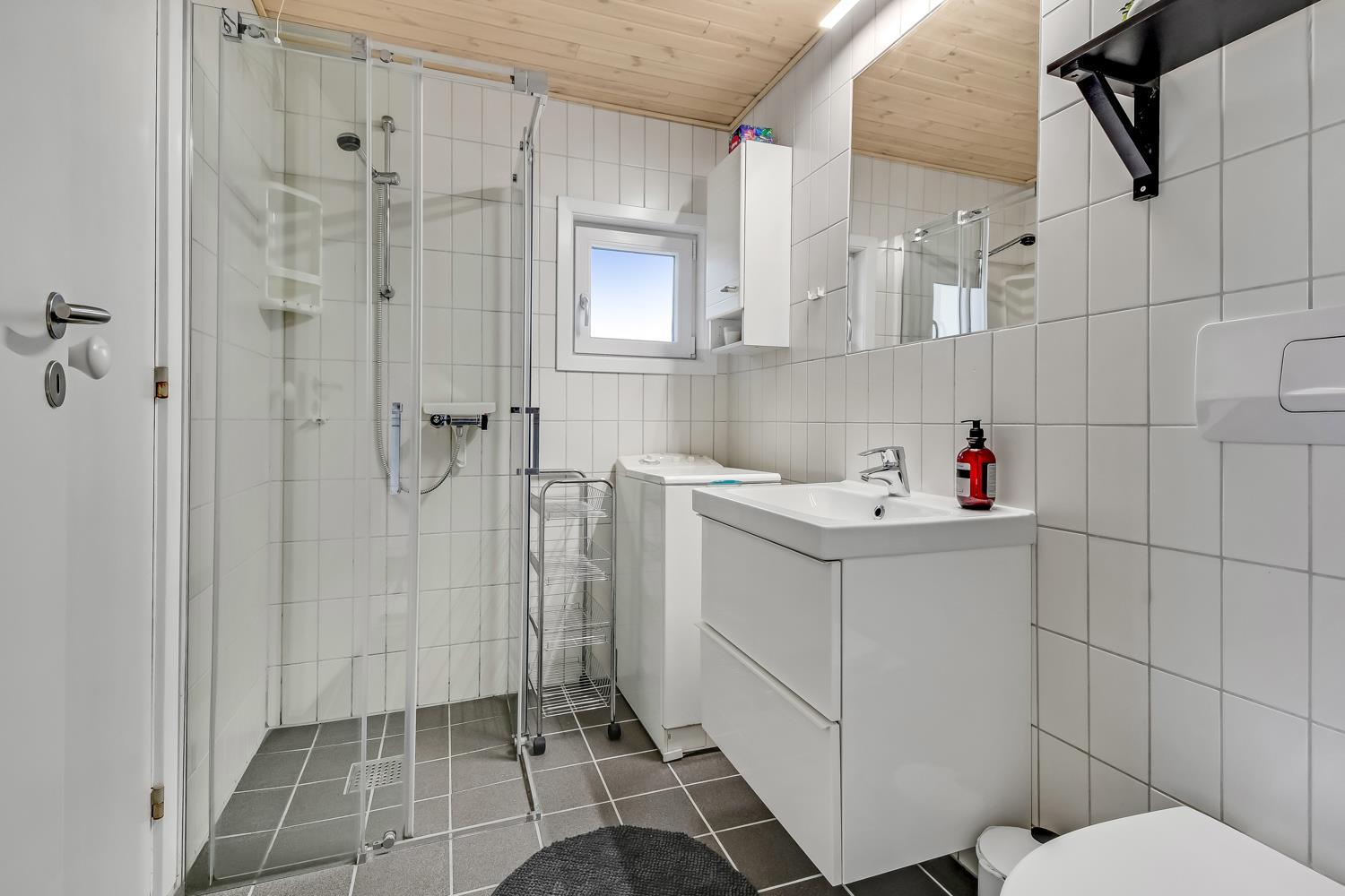 Das Badezimmer bietet ein Waschbecken, eine Dusche, eine Toilette, Fußbodenheizung und eine Waschmaschine sowie Zugang zur Sauna. Es gibt drei Schlafzimmer – zwei mit Doppelbetten und eines mit einem Etagenbett.