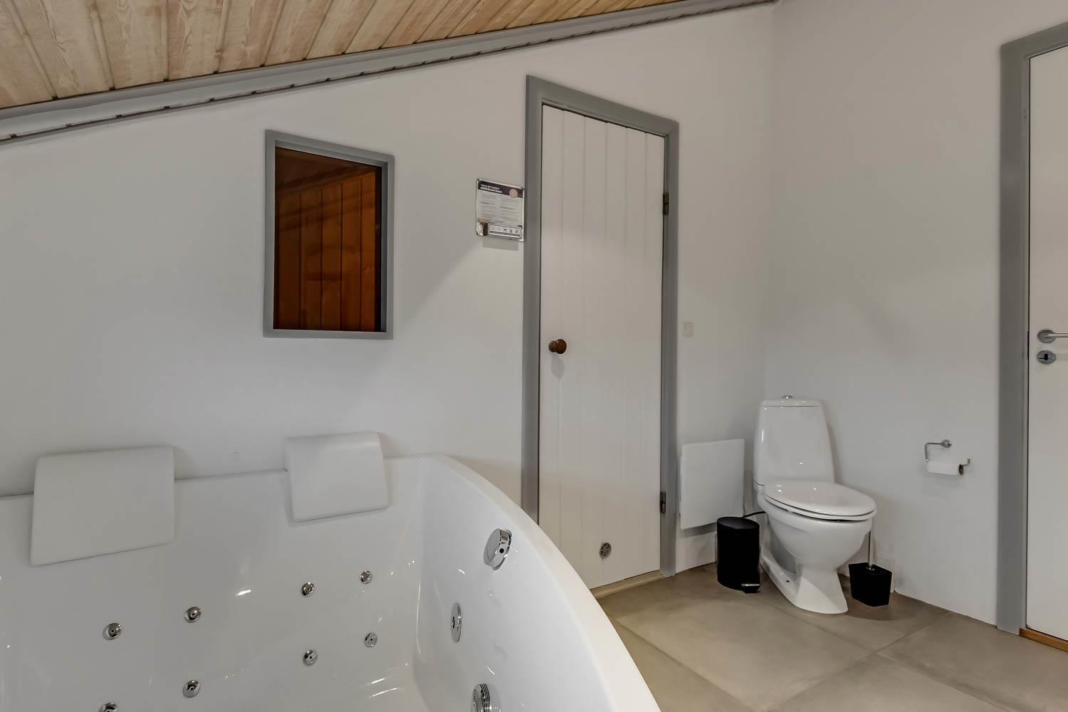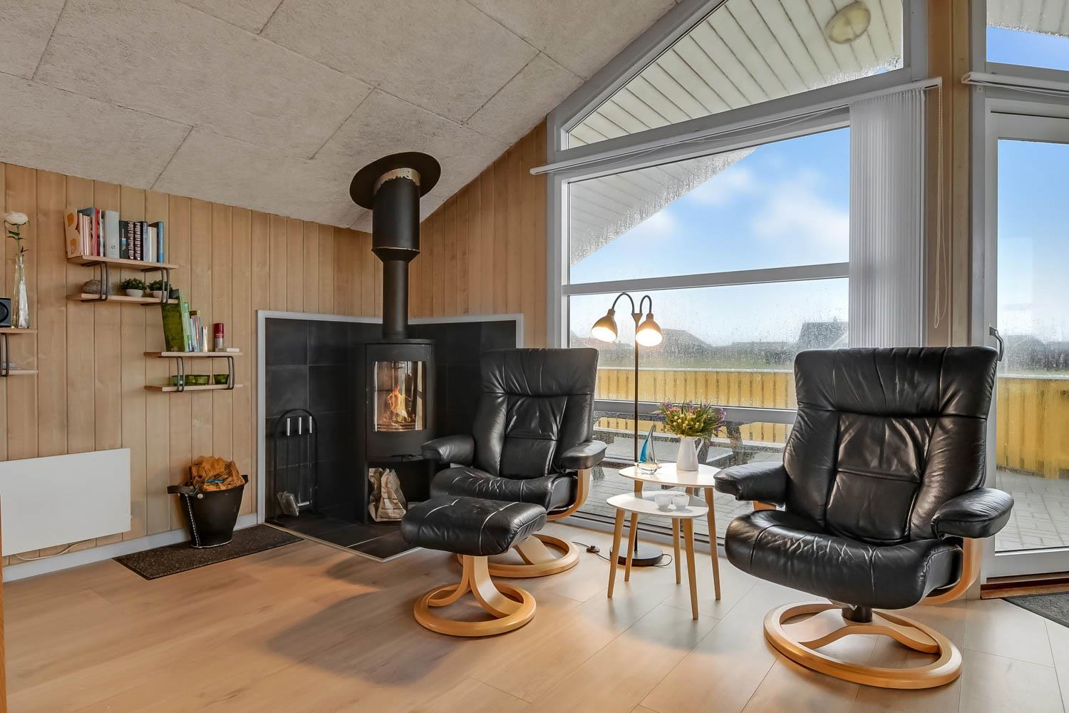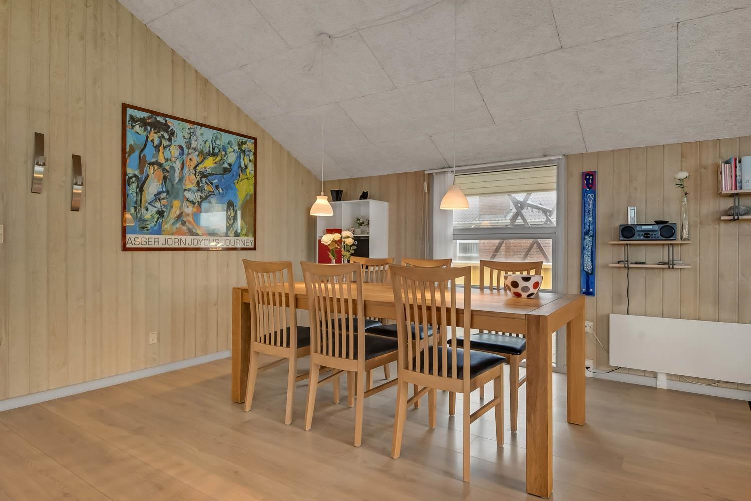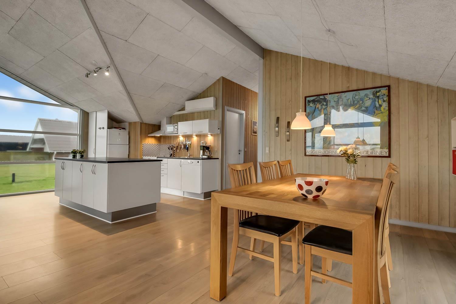 Das Haus verfügt über ein gemütliches Wohnzimmer mit schallgedämmter Decke, Kaminofen, DVD-Player, Stereoanlage mit CD-Player und TV mit dänischem (DR1, TV2) und deutschem Programm (Satellitenempfang). Offene Küche mit Wohn- und Essbereich, gut ausgestattet, u. a. mit Geschirrspüler, 40-Liter-Gefrierschrank und Mikrowelle. Hier unterhalten Sie sich beim Kochen mit Ihrer Familie, die im Wohnzimmer auf dem Sofa sitzt. Es gibt 3 Schlafzimmer, 2 Zimmer mit Doppelbetten (2 DB) und 1 Zimmer mit Einzelbetten (2 EB). Ein Badezimmer mit Dusche, Sauna, Waschbecken, Toilette, Whirlpool, Trockner und Waschmaschine. Ein weiteres kleines Badezimmer mit Toilette, Waschbecken und Dusche. Im Haus ist eine Wärepumpe installiert und das bedeutet, Sie als Gast sparen an die Heizkosten - die Wärmepumpe liefert bis zu 4-mal so viel Strom. Für die Anwender bedeutet dies, dass jede Kilowattstunde, die die Pumpe verbraucht, als Wärme auf ca. 4 kW Energie ausgenutzt werden kann.Für die Kleinen stehen Kinderbett und Hochstuhl zur Verfügung. 2 Hunde sind erlaubt. Nichtraucherhaus.