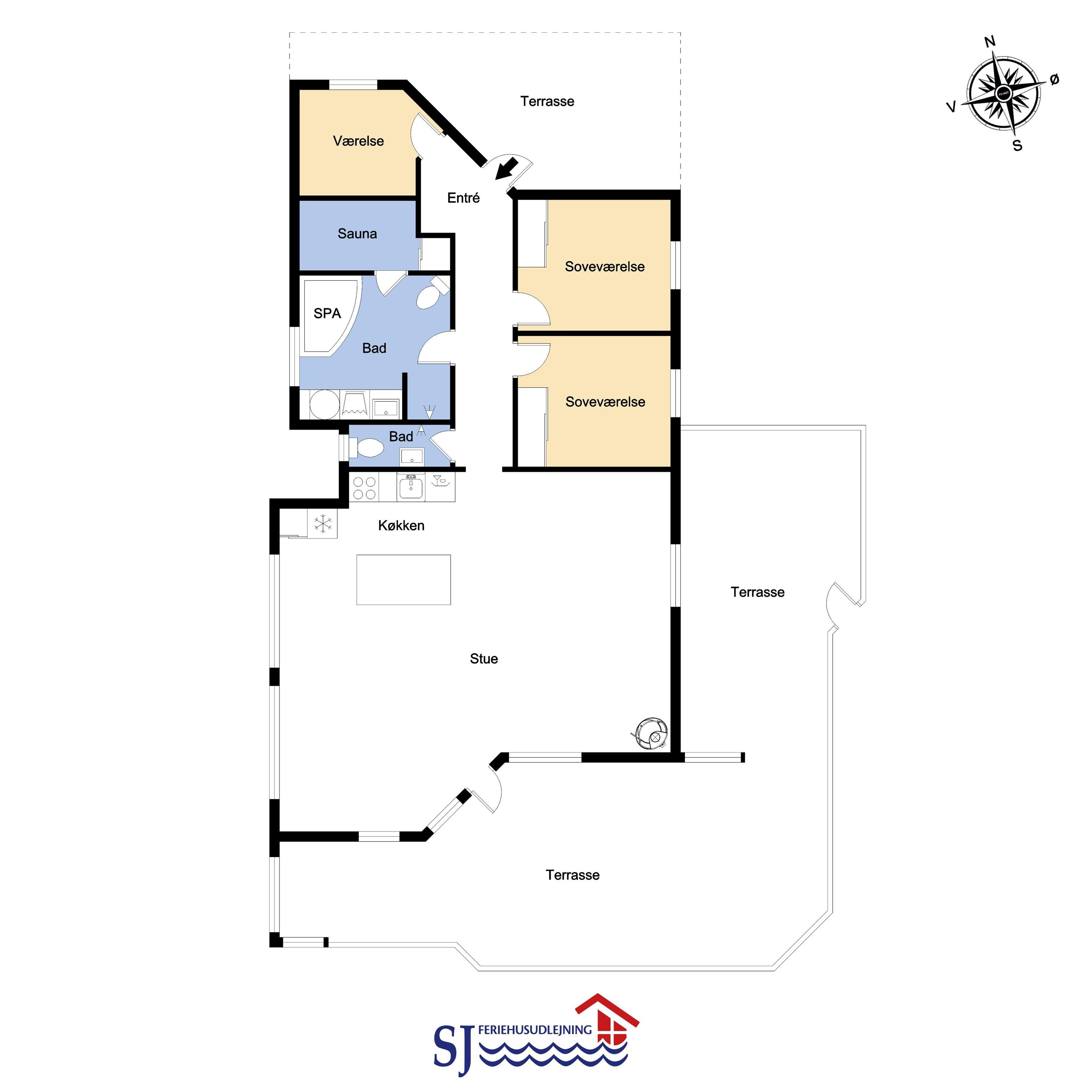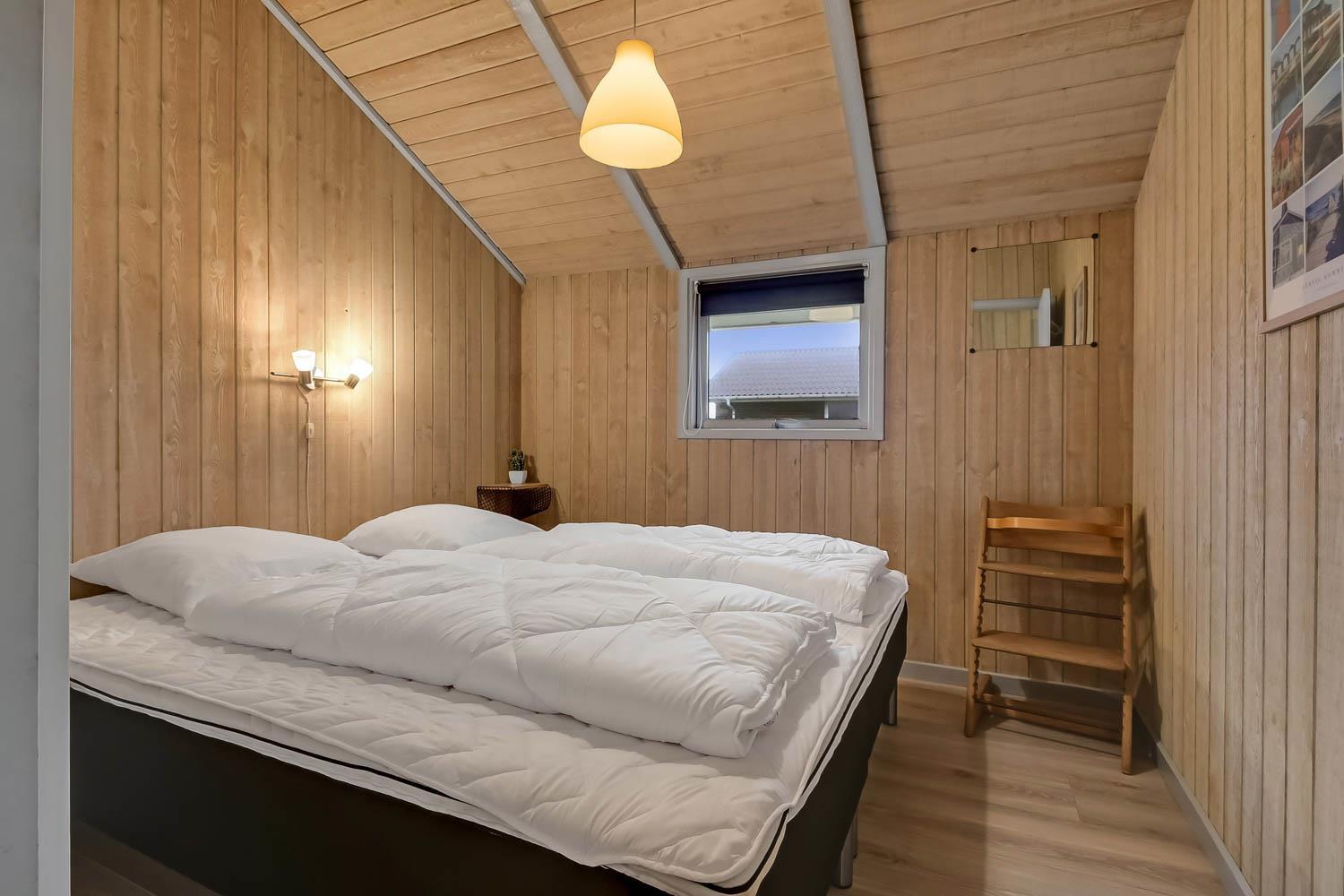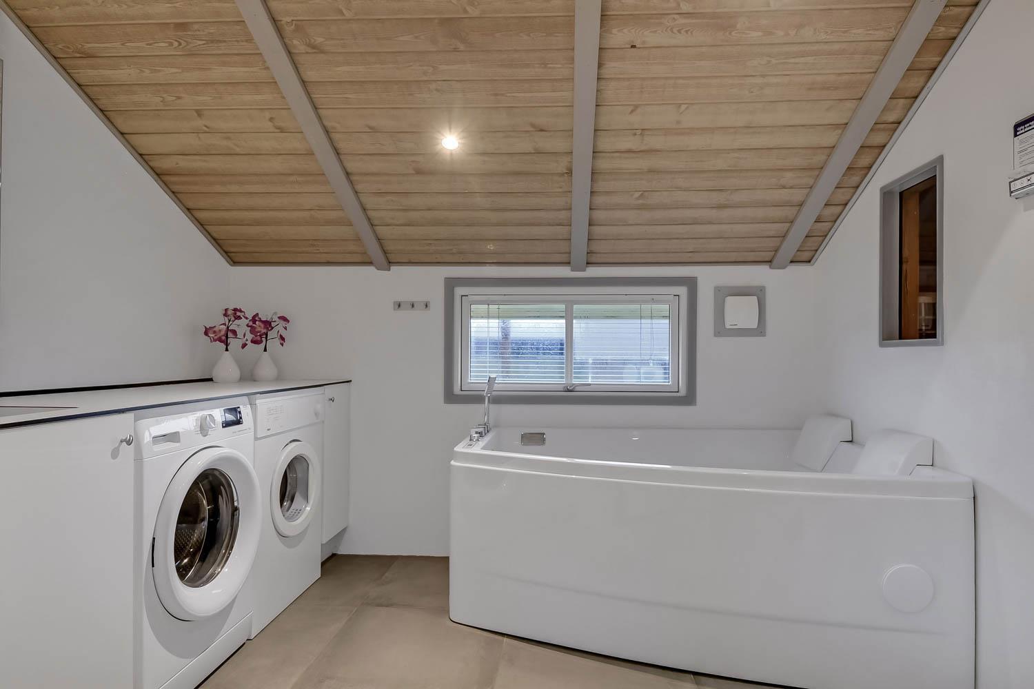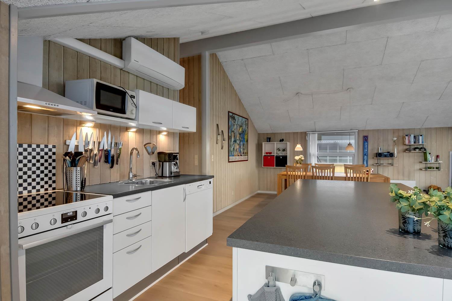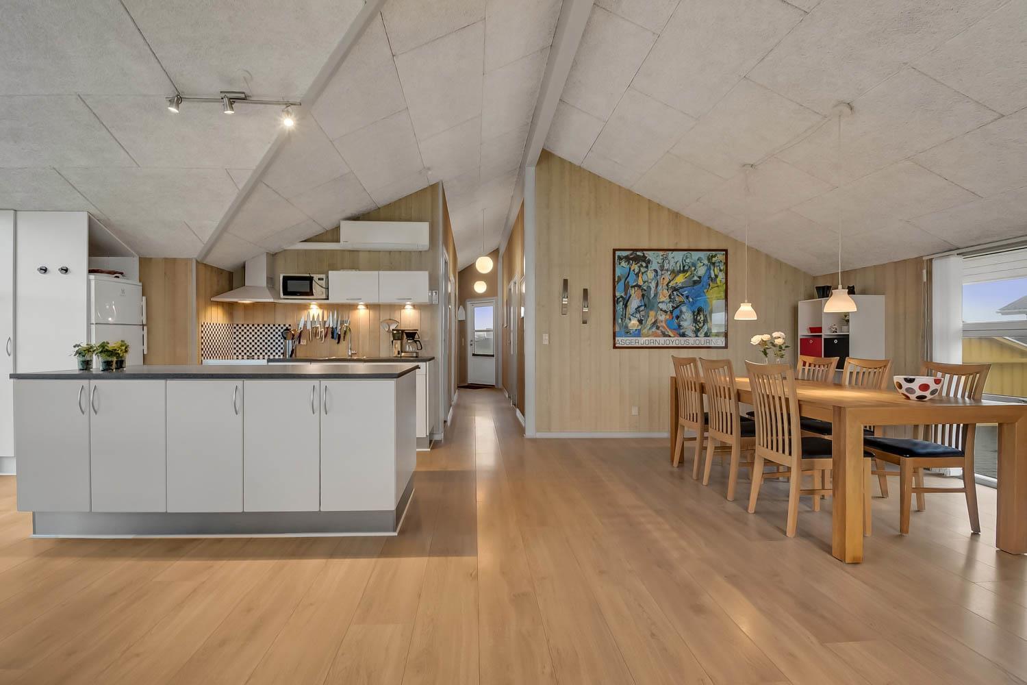 Das Haus verfügt über ein gemütliches Wohnzimmer mit schallgedämmter Decke, Kaminofen, DVD-Player, Stereoanlage mit CD-Player und TV mit dänischem (DR1, TV2) und deutschem Programm (Satellitenempfang). Offene Küche mit Wohn- und Essbereich, gut ausgestattet, u. a. mit Geschirrspüler, 40-Liter-Gefrierschrank und Mikrowelle. Hier unterhalten Sie sich beim Kochen mit Ihrer Familie, die im Wohnzimmer auf dem Sofa sitzt. Es gibt 3 Schlafzimmer, 2 Zimmer mit Doppelbetten (2 DB) und 1 Zimmer mit Einzelbetten (2 EB). Ein Badezimmer mit Dusche, Sauna, Waschbecken, Toilette, Whirlpool, Trockner und Waschmaschine. Ein weiteres kleines Badezimmer mit Toilette, Waschbecken und Dusche. Im Haus ist eine Wärepumpe installiert und das bedeutet, Sie als Gast sparen an die Heizkosten - die Wärmepumpe liefert bis zu 4-mal so viel Strom. Für die Anwender bedeutet dies, dass jede Kilowattstunde, die die Pumpe verbraucht, als Wärme auf ca. 4 kW Energie ausgenutzt werden kann.Für die Kleinen stehen Kinderbett und Hochstuhl zur Verfügung. 2 Hunde sind erlaubt. Nichtraucherhaus.