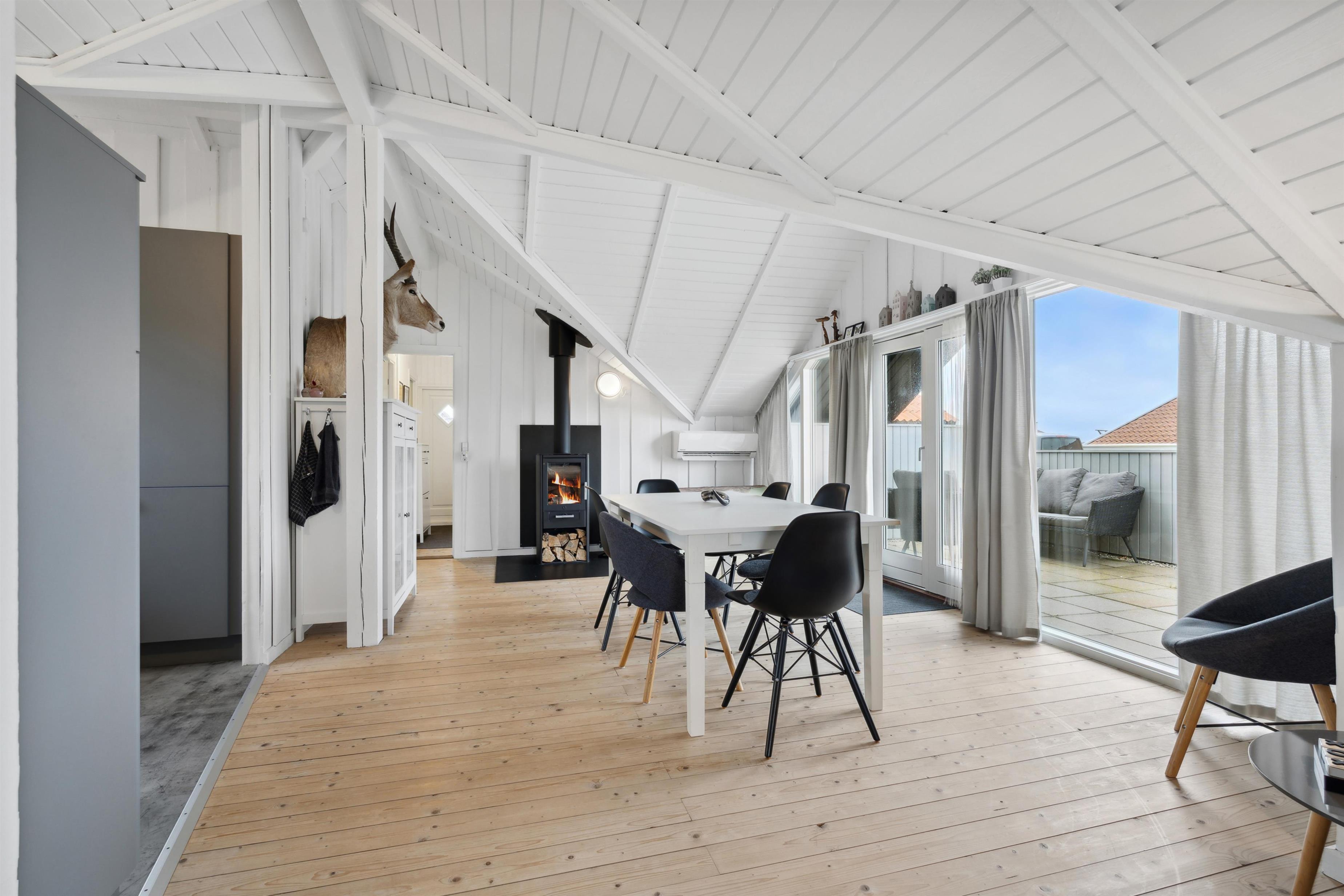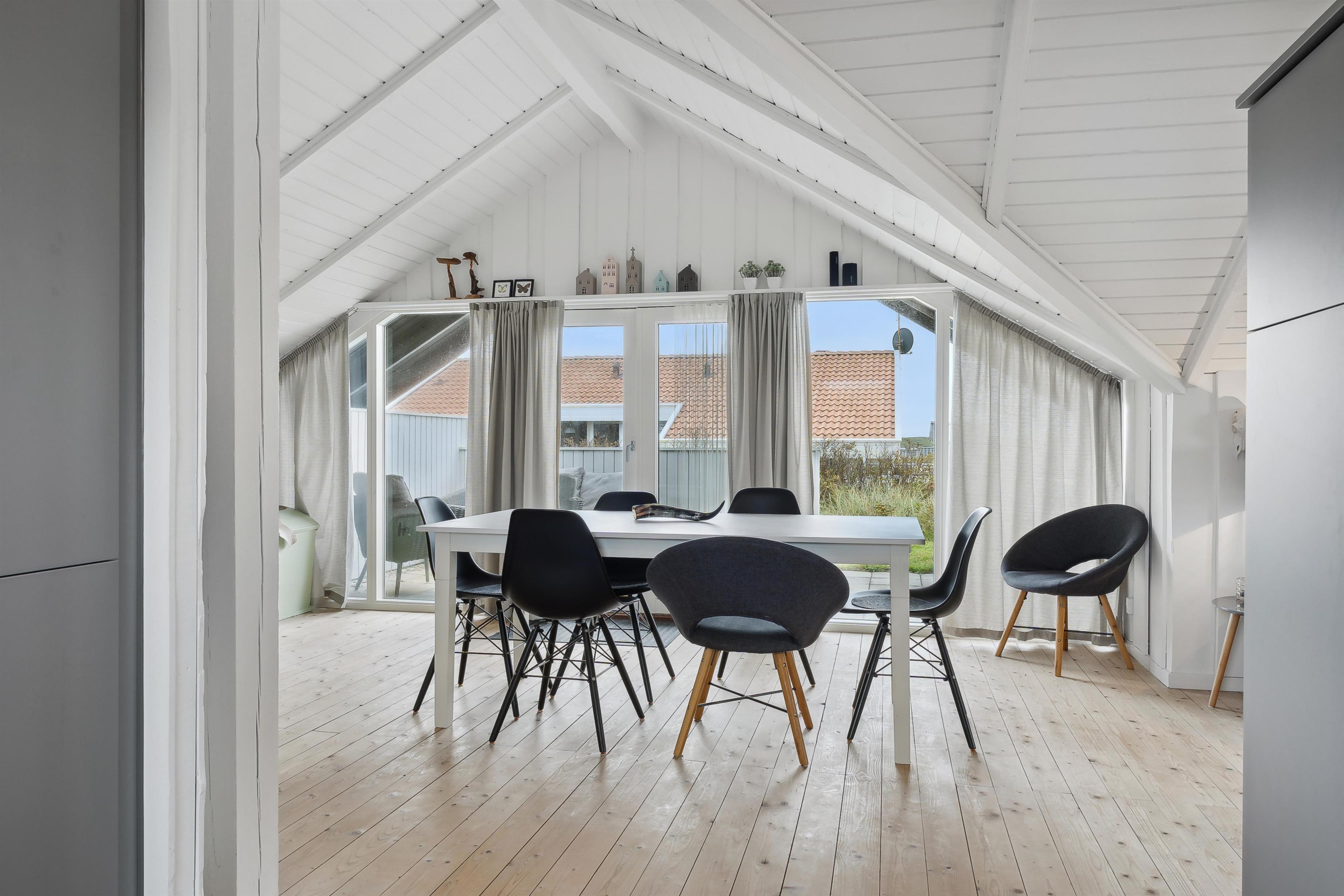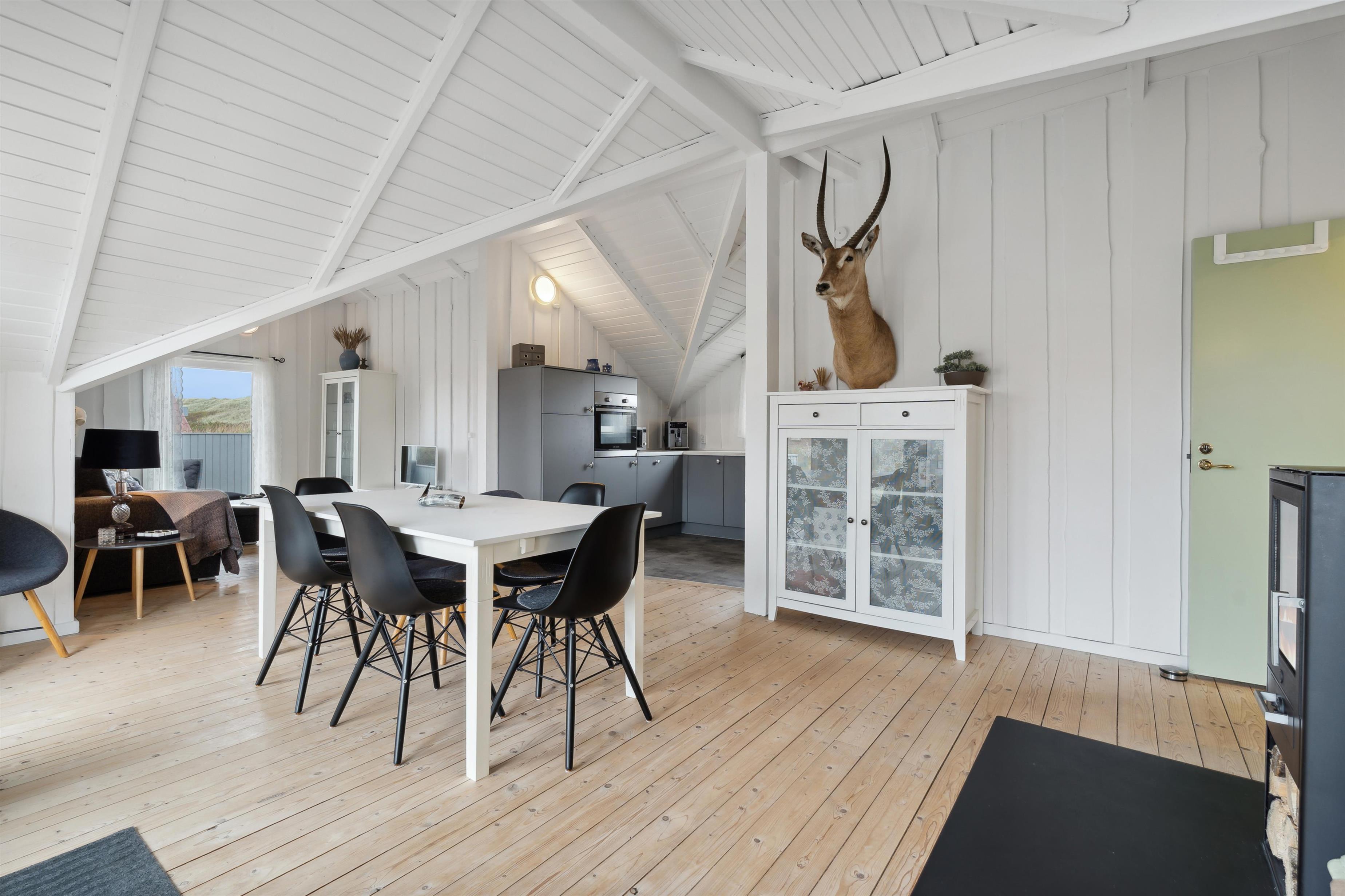 Das Ferienhaus ist 75 m² groß und äußerst gepflegt. Der Wohnraum ist hell und luftig mit offenem Dachgiebel, schönen Holzböden und einer angenehmen, nordischen Atmosphäre. Im Wohnzimmer können Sie die Wärme und Gemütlichkeit des Kaminofens genießen, während die Wärmepumpe ganzjährig für ein behagliches Innenklima sorgt. Es gibt Fibernet-TV, Fiber-Internet und gute Polstermöbel, die echte Entspannung nach einem aktiven Tag in der Umgebung ermöglichen. Der Wohnraum ist offen mit der funktionellen Küche verbunden, die mit elektrischen Keramikkochfeldern, Geschirrspüler, Einbaubackofen sowie Kühl-/Gefrierschrank ausgestattet ist – perfekt, um die Mahlzeiten des Urlaubs in ruhiger Umgebung zuzubereiten und zu genießen.