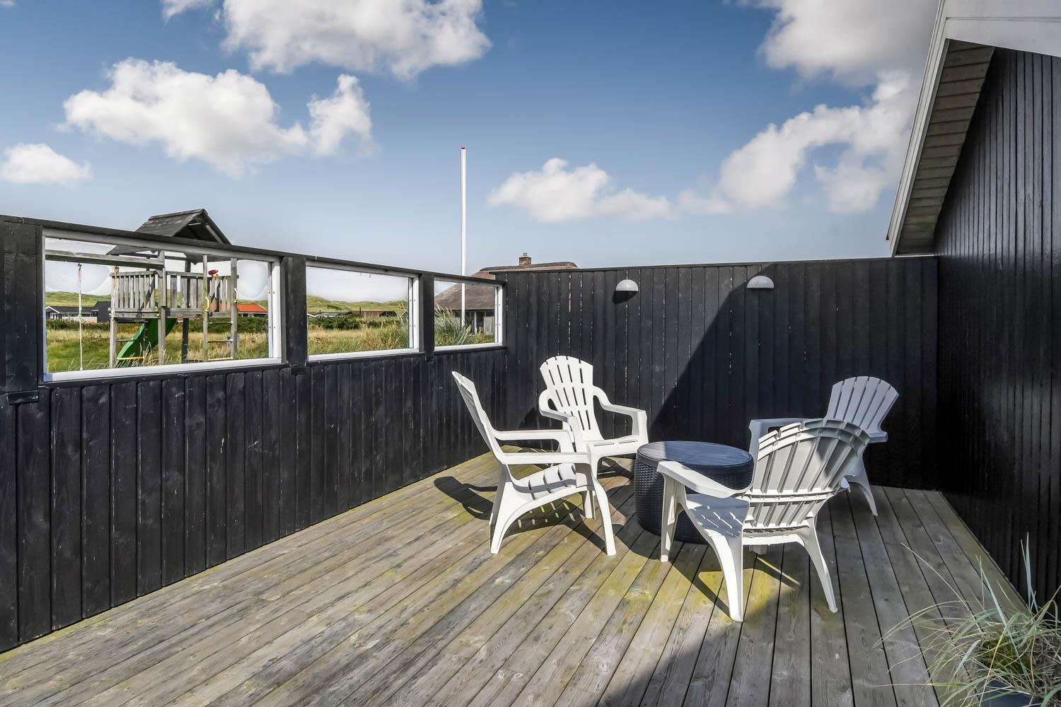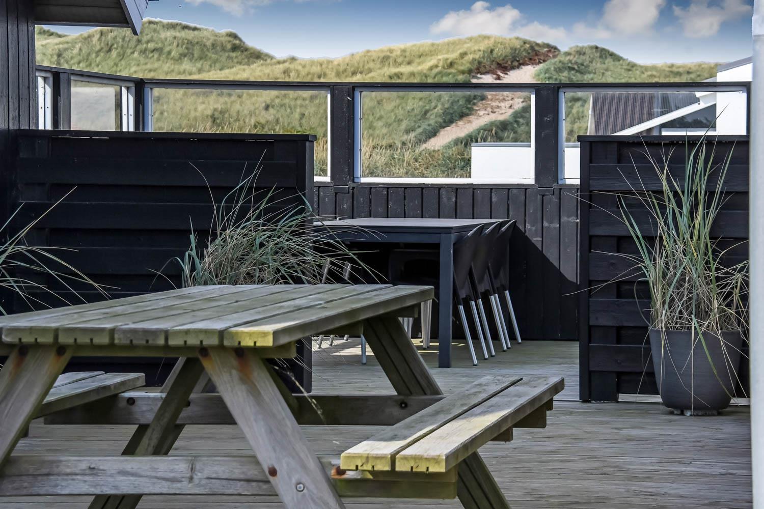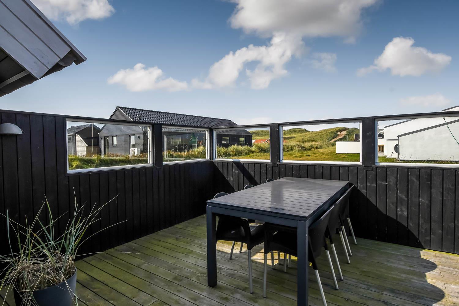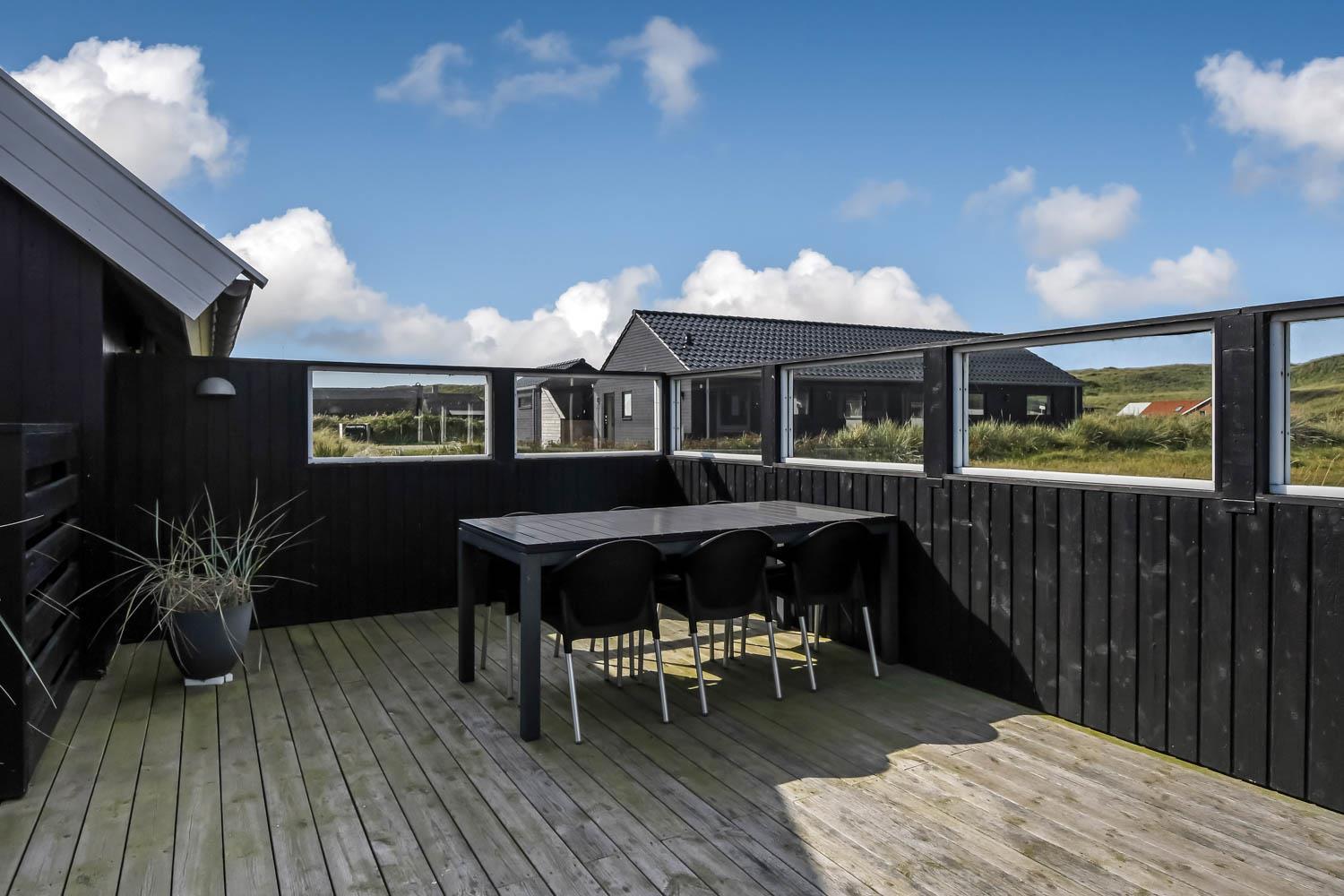 Vom Wohnzimmer aus haben Sie einen direkten Zugang zu einer schönen, nach Westen ausgerichteten, teilweise überdachten Terrasse. Vom Eingang aus haben Sie Zugang zu einer absolut fantastischen Holzterrasse mit schönem Schatten. Darüber hinaus gibt es einen fantastischen Balkon mit Blick auf die Dünen. Es gibt einen einzigartigen Außenbereich, in dem Sie sich auf Gartenmöbeln und Sonnenliegen bewegen können und in dem es immer eine schöne Ecke mit Windschutz und einen Platz in der Sonne geben kann. Das Haus befindet sich auf einem 1.200 m² großen Dünengelände. Nur wenige Gehminuten vom Haus entfernt gibt es auch einen Ballplatz und einen Spielplatz. Das Restaurant und das Lebensmittelgeschäft sind saisonal geöffnet und nur wenige Gehminuten vom Haus entfernt. Innerhalb von 5 Autominuten erreichen Sie Harboøre mit verschiedenen Aktivitäten und Einkaufsmöglichkeiten. Egal, ob Sie einen aktiven Urlaub verbringen oder sich total entspannen möchten, dieses schöne Ferienhaus bietet eine perfekte Kulisse in Bezug auf Haus, Lage und Umgebung.