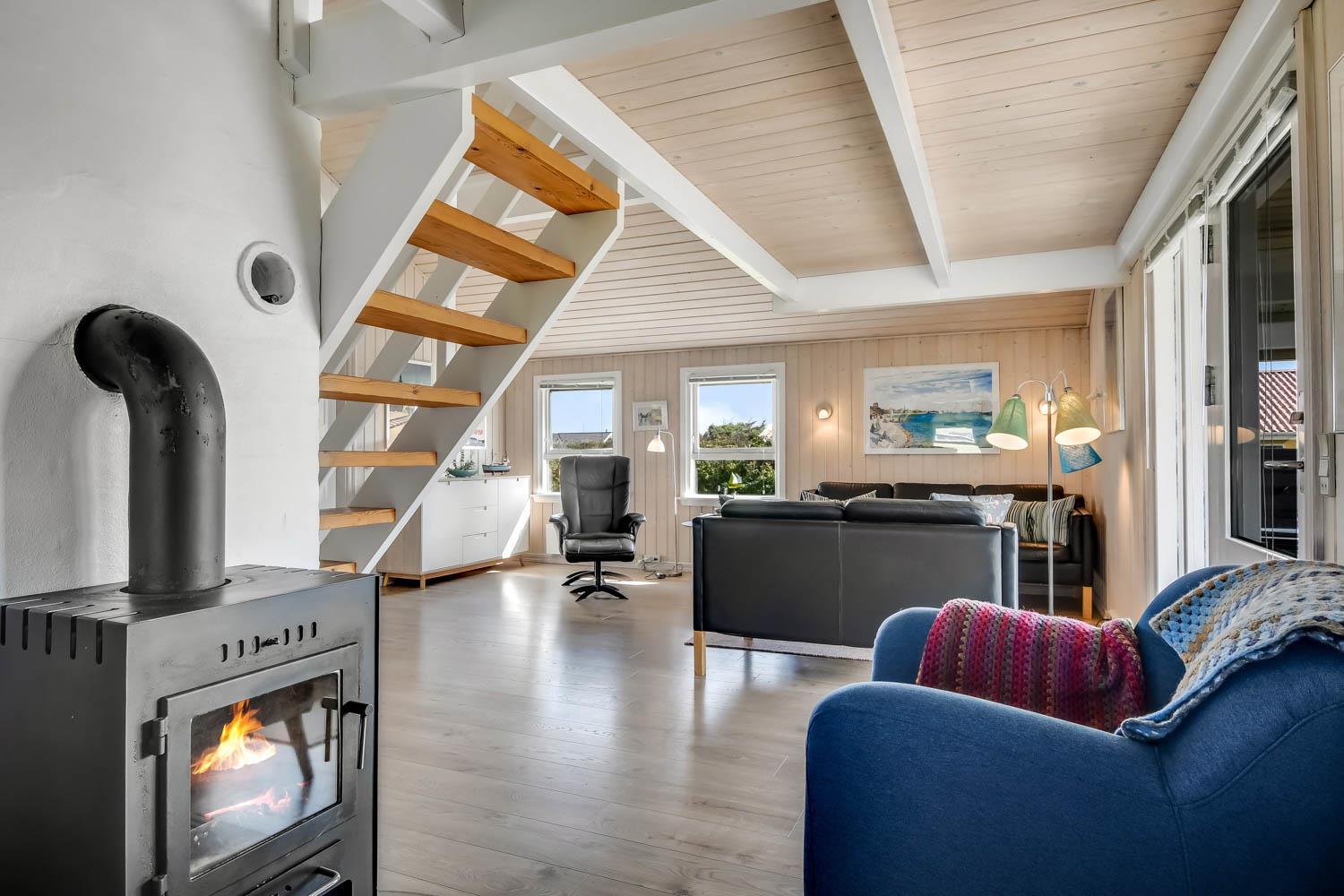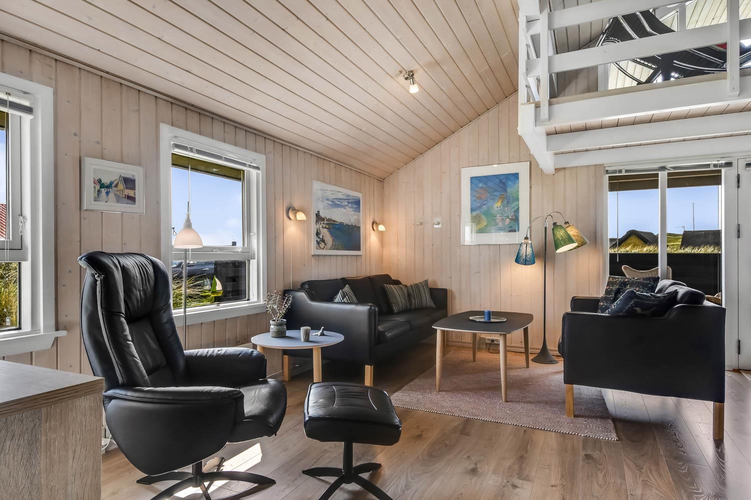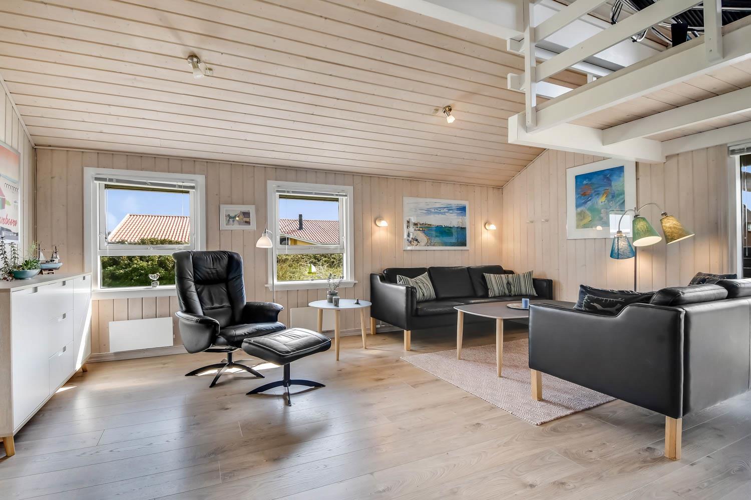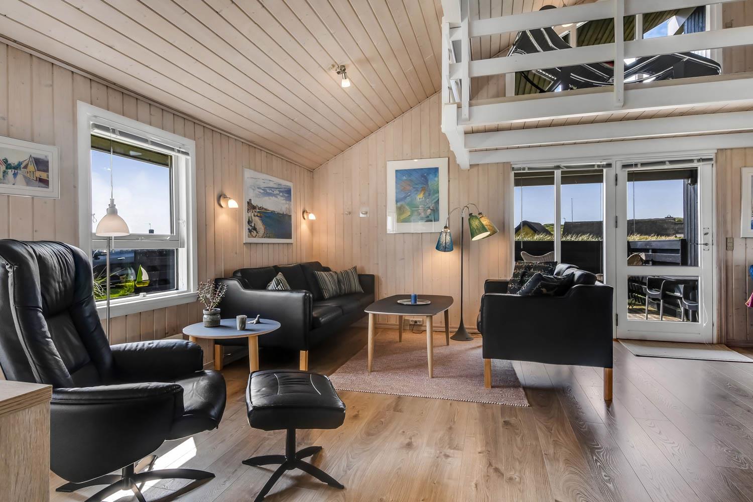 Gut zu nutzendes, renoviertes (2007) Ferienhaus mit 125 m² und freiem WLAN. Das Haus ist schön eingerichtet und man spürt sofort die ganz spezielle Atmosphäre, für die der Eigentümer gesorgt hat. Es gibt helle und freundliche Räume und der Kerne vom Haus ist der kombinierte Wohnraum/Küche. 3 gute Schlafräume. Im Erdgeschoss gibt es 2 Schlafräume: 1DB + 1DB und von der Treppe im Wohnraum gibt es einen Zugang zu einem richtigen Luxusschlafzimmer mit 1 DB und Balkon. Es gibt auch einen schönen offenen Schlafboden, den Sie über die Leiter an der Wand erreichen. Auf dem Schlafboden gibt es 2 Sofas und einen Couchtisch, was es zu einem perfekten Ort macht, um Spiele zu spielen oder vielleicht ein gutes Buch zu lessen. Schöner Flur mit Platz für Jacken zum aufhängen. Der Wohnraum ist mit guten Qualitätsmöbeln, TV mit deutschen und dänischen Programmen, CD/Radio/DVD und einem gemütlichen Kaminofen, der zusammen mit einer Wärmepumpe für einen niedrigen Stromverbrauch sorgt, eingerichtet. Schöne und gut ausgestattete Küche mit Geschirrspüler, Herd mit Cerankochfeld, eingebautem Ofen, Abzugshaube, Mikrowelle, Kühl-/Gefrierschrank und allem an Service und Kochgeschirr. Es gibt ein einladenes und modernes Badezimmer mit Whirlpool, Waschbecken und Toilette und außerdem es gibt es noch ein Badezimmer mit Toilette, Waschbecken, Sauna und Dusche. Beide Badezimmer sind mit Fussbodenheizung. Waschmaschine. Es gibt Kinderbett und Kinderstuhl. Rauchen und Haustiere sind nicht erlaubt. Ein selten schönes Ferienhaus mit hoher Qualität und vielen schönen und tollen Einzelheiten. Wenn Sie ein Elektroauto oder einen Plug-in-Hybrid haben, verfügt das Haus über eine Ladebox.