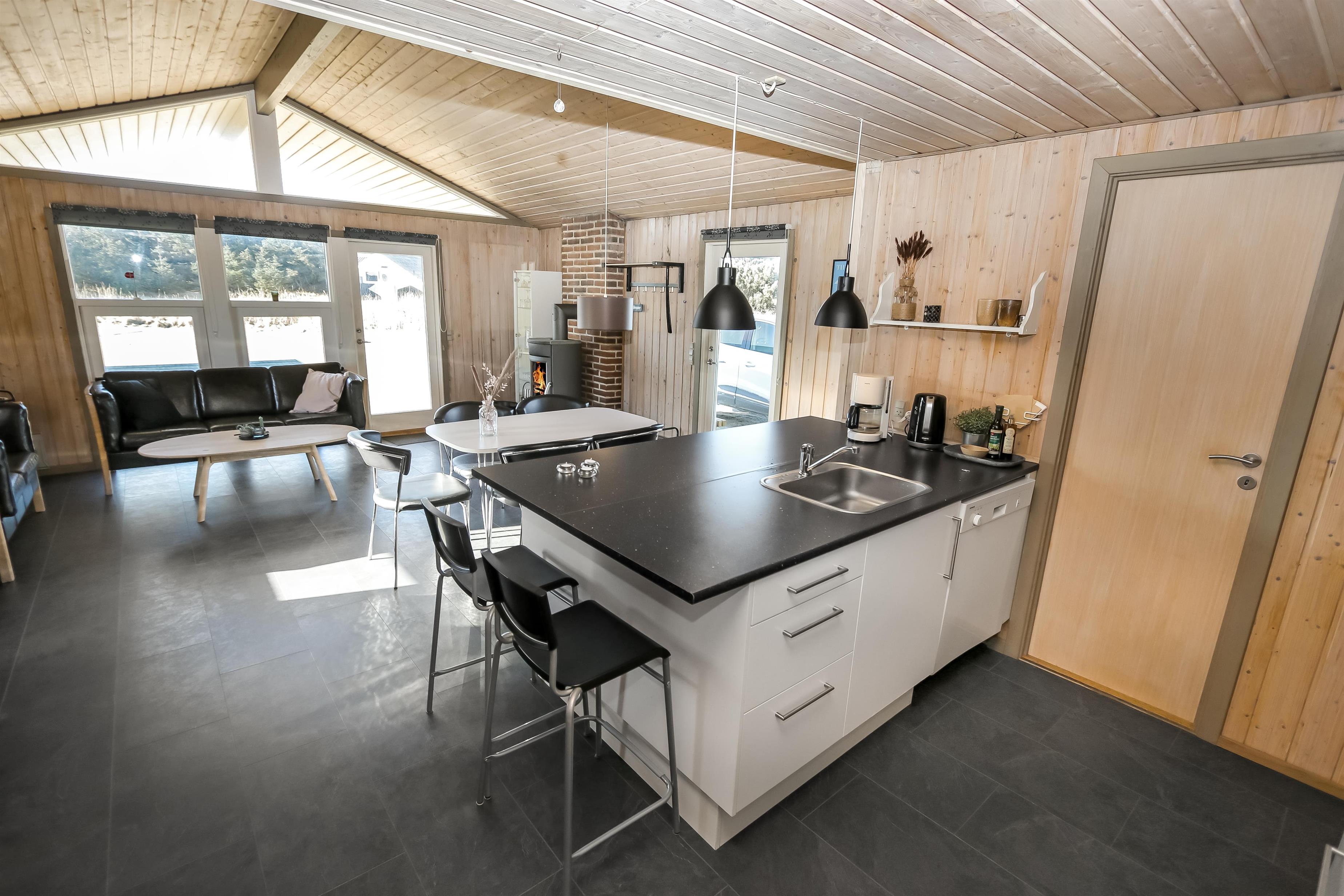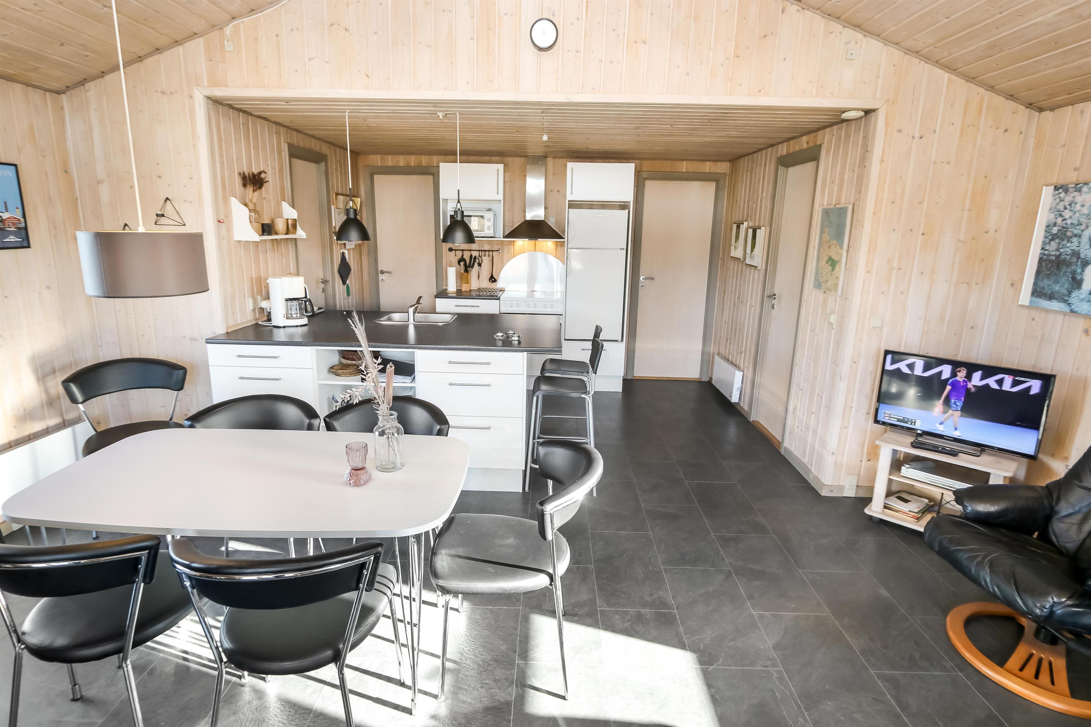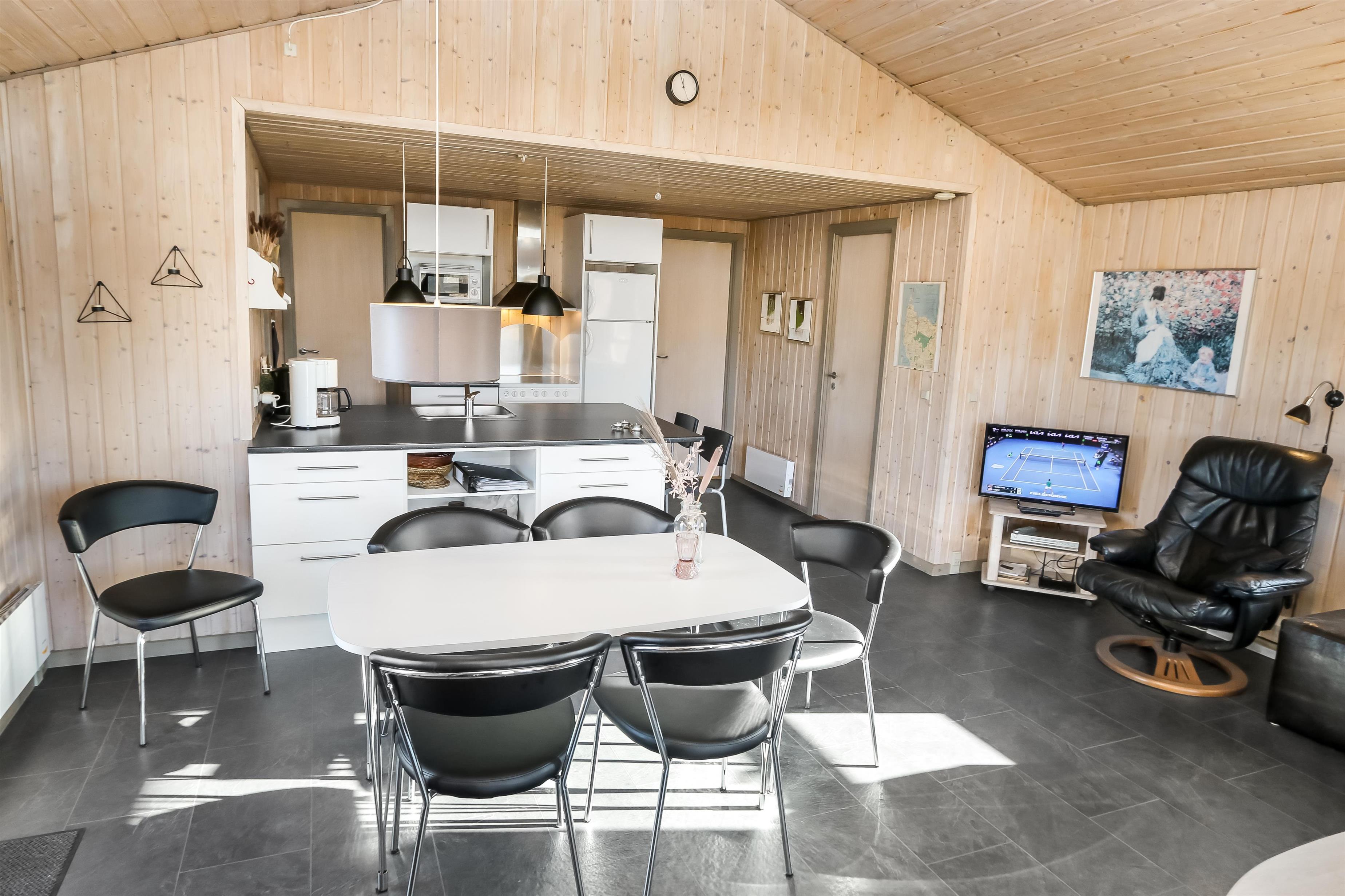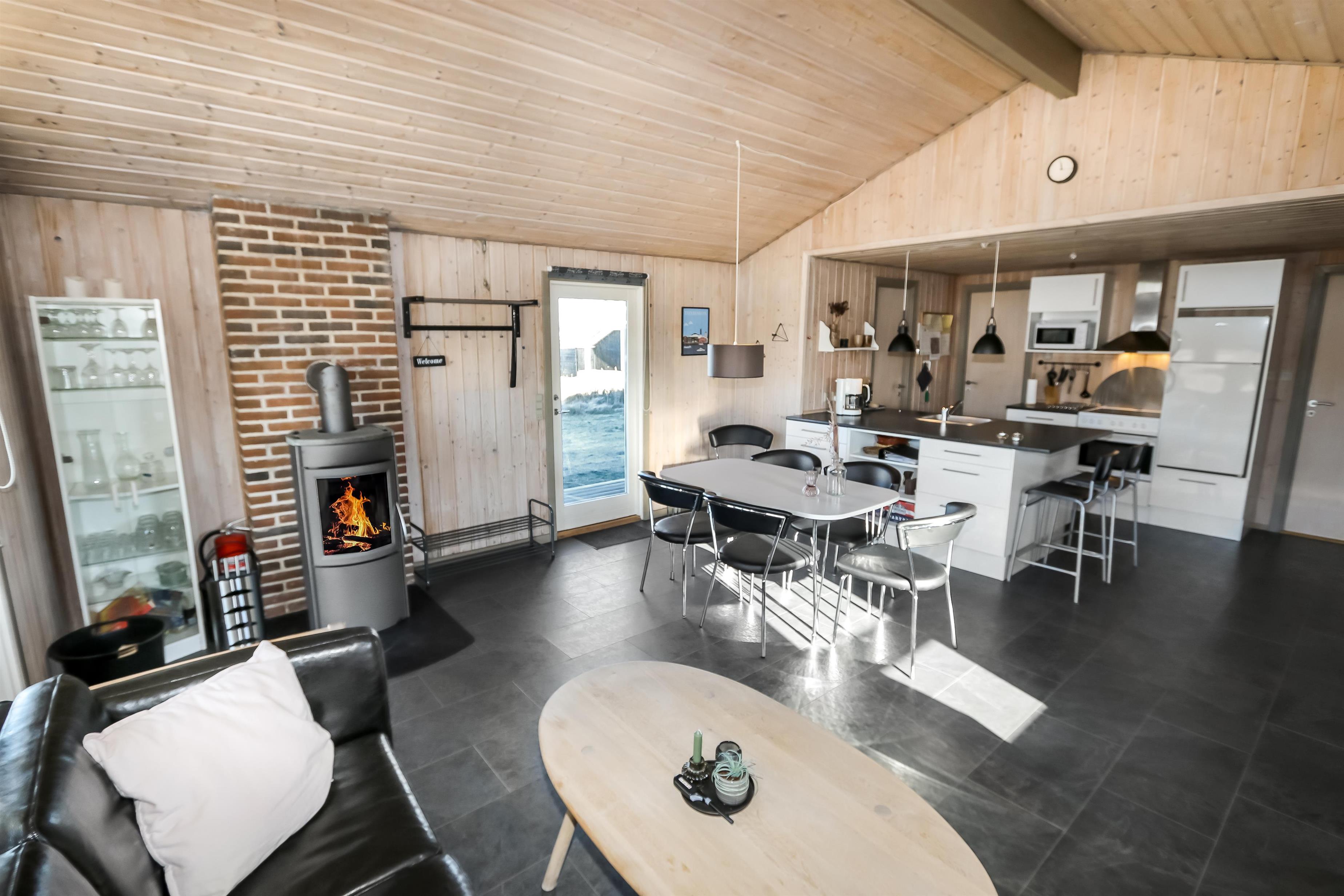 Offene Küche mit Wohn- und Essbereich. Wohnzimmer mit Holzofen, Flachbildschirm-TV mit dänischem (DR1, TV2) und deutschem Programm (Satellitenempfang). Die Küche ist gut ausgestattet mit Geschirrspüler und Mikrowelle. 3 Schlafzimmer mit Doppelbetten (DB) + 1 DB + 2B. Für die kleinsten Gäste gibt es ein Kinderbett und einen Hochstuhl. Das Badezimmer ist mit Waschbecken, Toilette, Dusche und Fußbodenheizung ausgestattet. Eine Waschmaschine ist vorhanden. Sie haben Zugang zur hauseigenen Sauna. 1 Haustier ist erlaubt. Nichtraucherhaus.