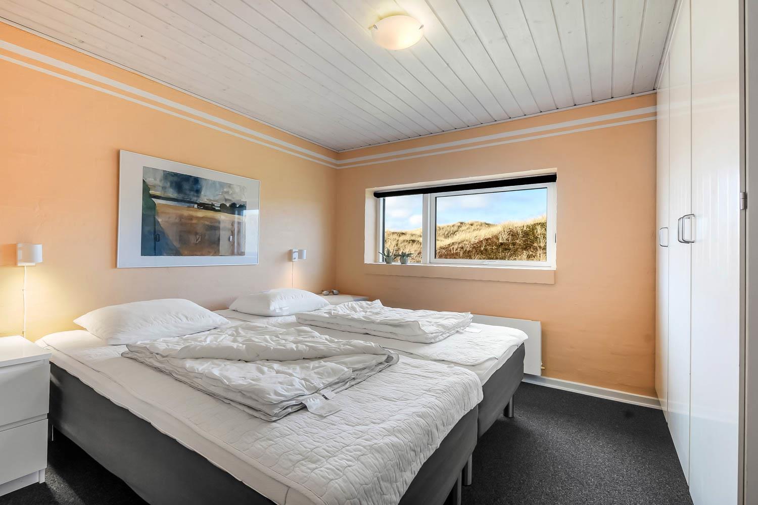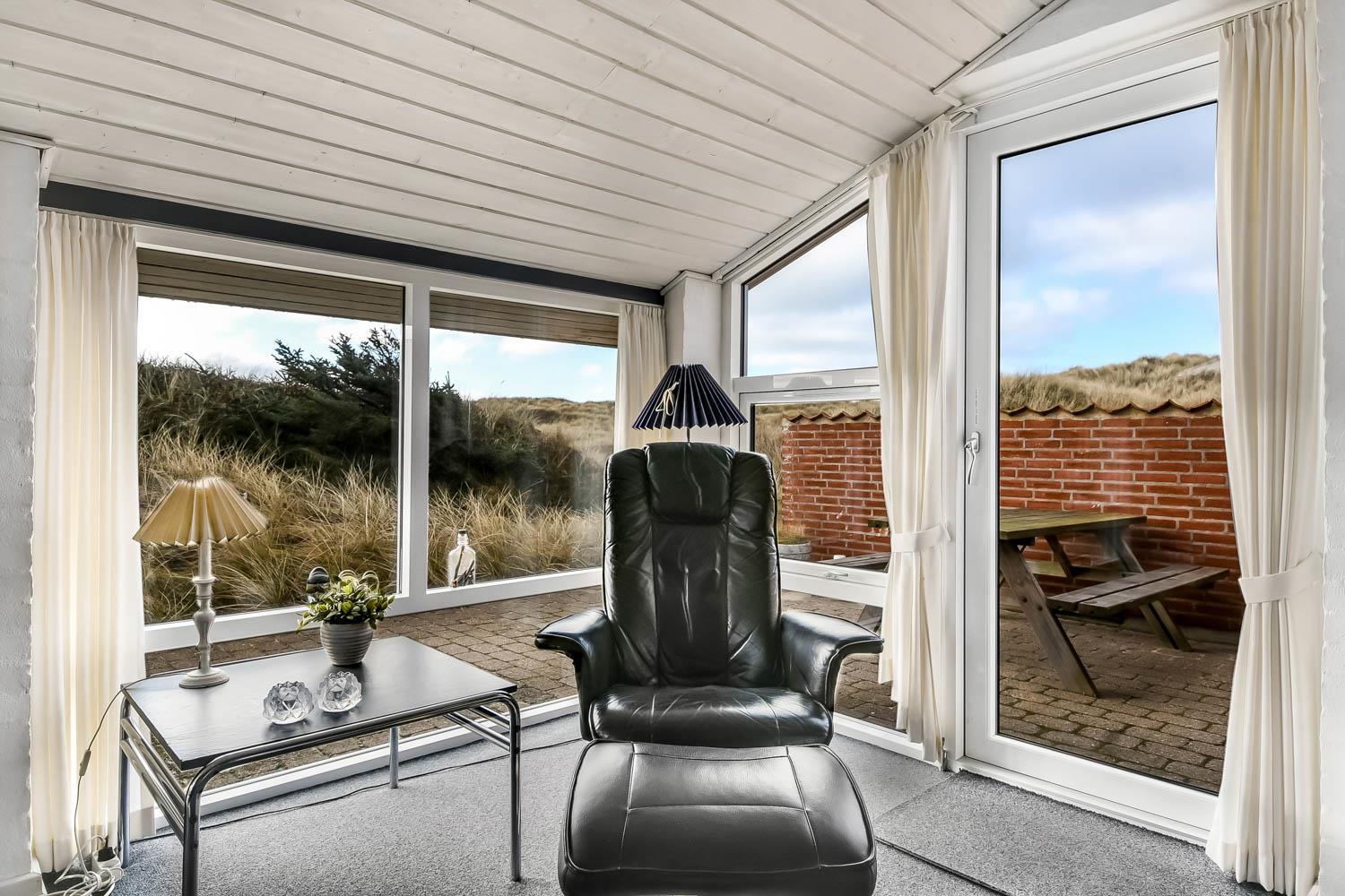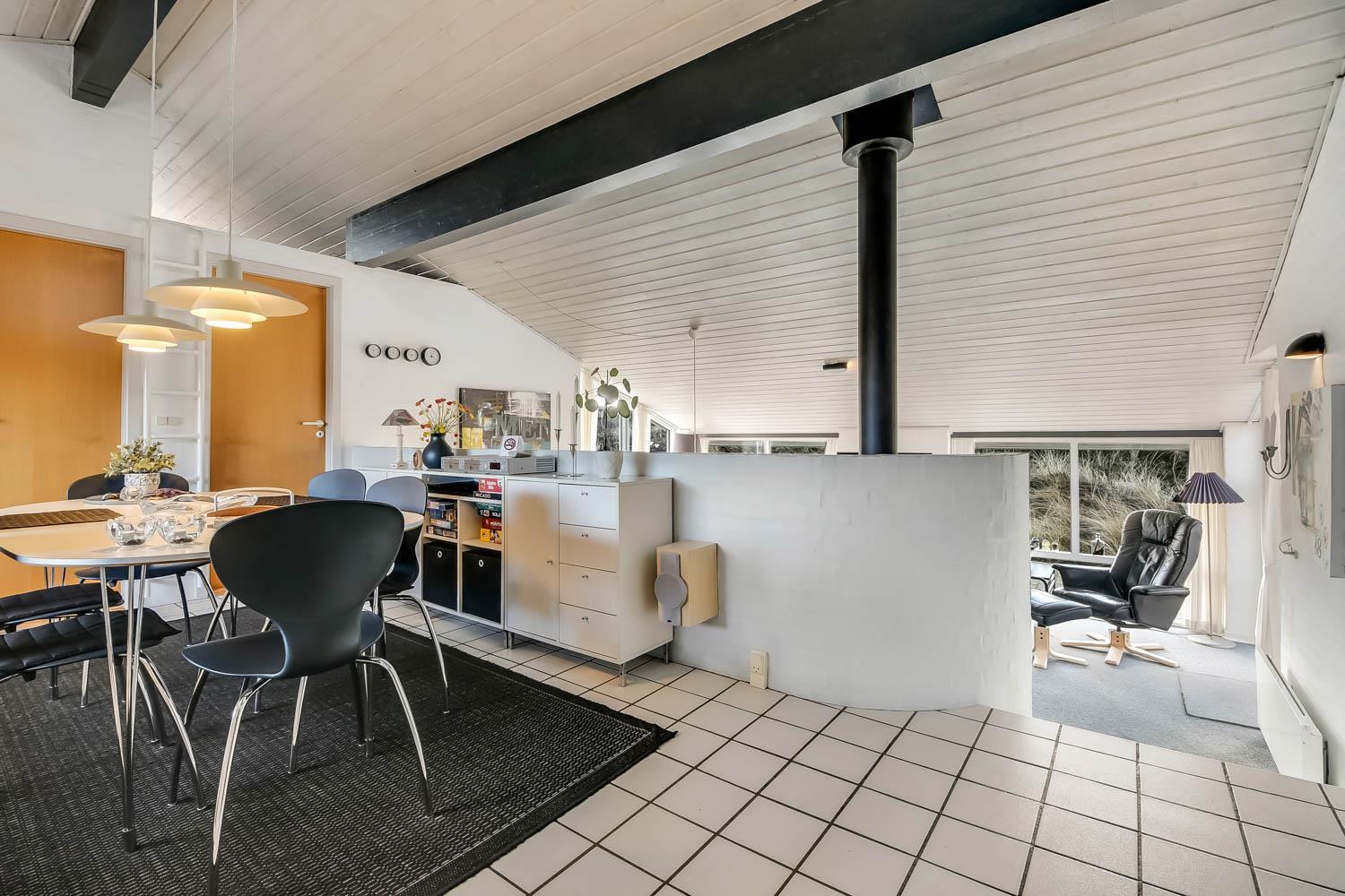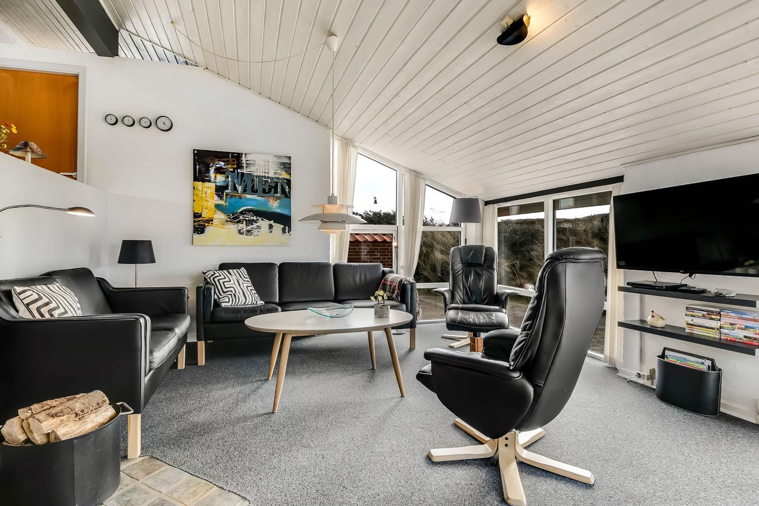 Der letzte Teil auf Ihrer Fahrt zum Haus geht durch die schöne Dünenlandschaft. Parken Sie das Auto auf dem schönen Parkplatz direkt vor dem Haus. Im Haus werden Sie eingeladen durch den ganz speziellen Flur, der die gut ausgerüstete Küchenecke abschirmt. In der Küche finden Sie alles, was Sie brauchen , z.B. Geschirrspüler, Ceranfeld, Abzugshaube, Mikrowelle, Kühlschrank mit Gefrierfach und einen schönen Essplatz für 6 Personen. Es gibt einen ganz tollen versenkten Wohnraum mit modernen Ledermöbeln, Fernseher mit dänischen und deutschen Programmen, DVD, CD. Geniessen Sie den einmaligen und schönen Blick auf die unberührte Dünenlandschaft und die hohen Dünen, oder öffnen Sie eins von den Fenstern oder die Terrassentür und hören das Meeresrauschen. Das Haus hat 3 schöne Schlafräume 1DB + 1DB + 2B. Das Badezimmer ist mit Dusche, Toilette, Waschbecken, Fliesenboden mit Fussbodenheizung und vielen schönen Mauerwerkdetails ausgestattet. Das Haus ist mit offener Decke gebaut und wurde laufend renoviert . Die vielen Fenster und die offene Decke geben einen sehr schönen Lichteinfall ins Haus. Kinderbett , Kinderstuhl und Kinderbadewanne stehen für die Kleinen bereit. Nichtraucherhaus. Haustiere nicht erlaubt.