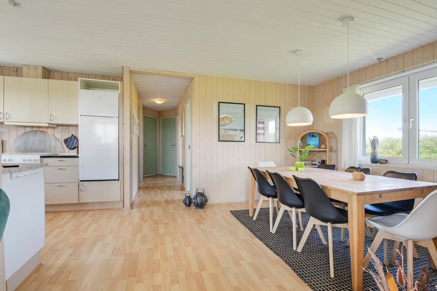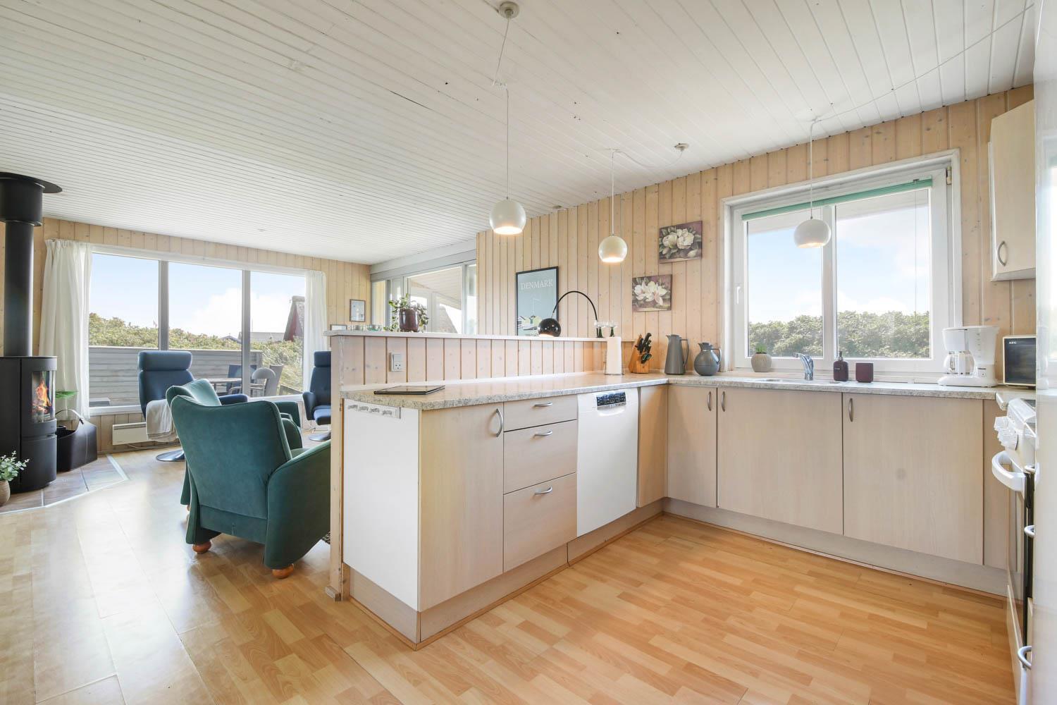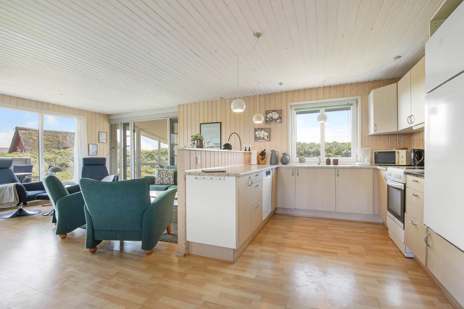 Das Haus ist max. für 6 Personen und 2 Haustiere. Es gibt 4 Schlafräume: 1DB + 1DB + 2B + 2B. Es gibt eine kombinierte Küche/Wohnraum. Die Küche ist mit Ceranfeld-Kochherd, Kühl-/Gefrierschrank, Geschirrspüler und Mikrowelle ausgestattet. Das Haus ist im Juni 2024 renoviert worden. Neue Betten, Decken, Kissen, TV, Brennofen, Wärmepumpe, Möbel, Porzellan u.a. Im Wohnraum gibt es Glasfasernetz, Smart-TV mit dänischen, deutschen, schwedischen und norwegischen TV-Programmen. Es besteht die Möglichkeit, Radio- und Musikprogramme über eine App auf dem Smart-TV zu empfangen. Gartenstube mit Loungemöbeln. Von hier aus haben Sie einen Panoramablick zur 1. Dünenreihe. Badezimmer mit Dusche und Fußbodenheizung. Im Flur gibt es Waschmaschine, 2 Hochstühle und 2 Kinderbetten.