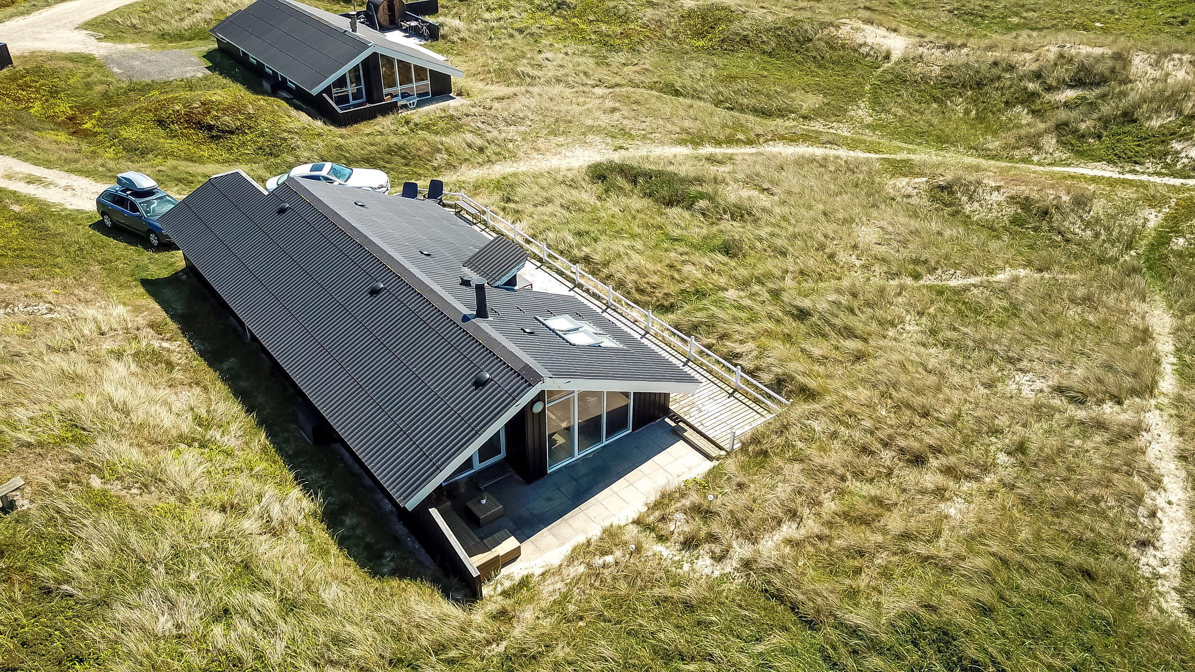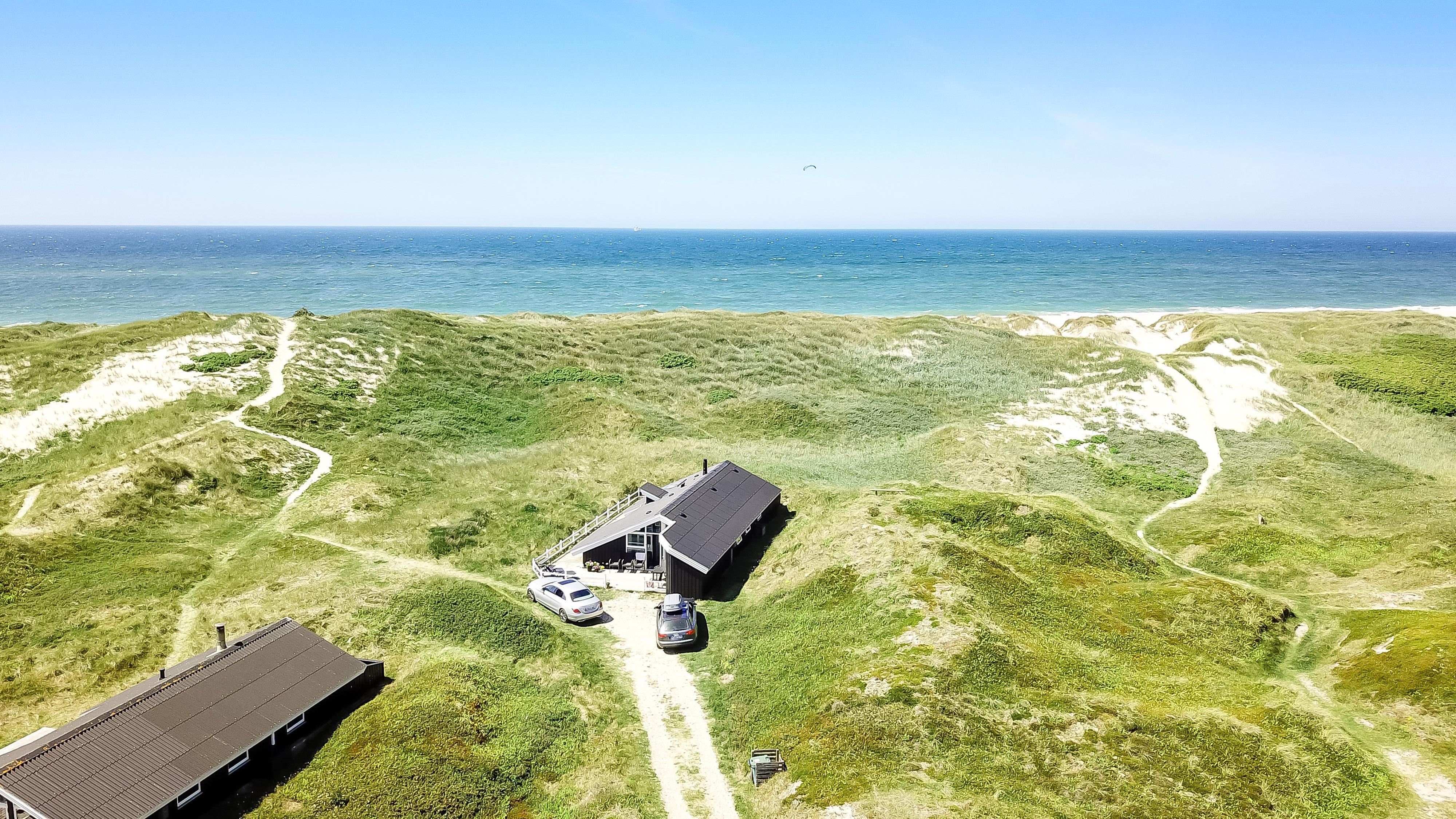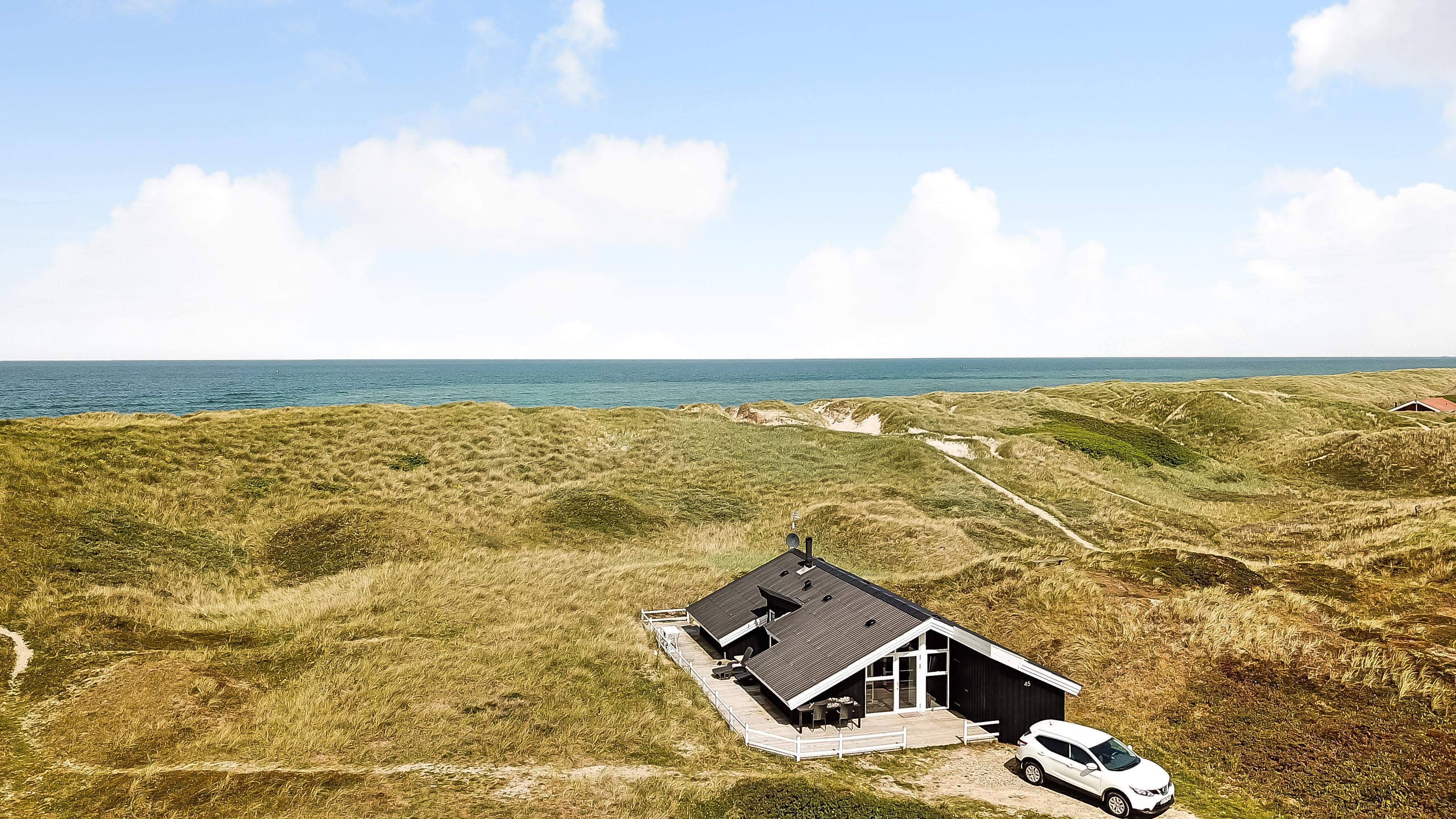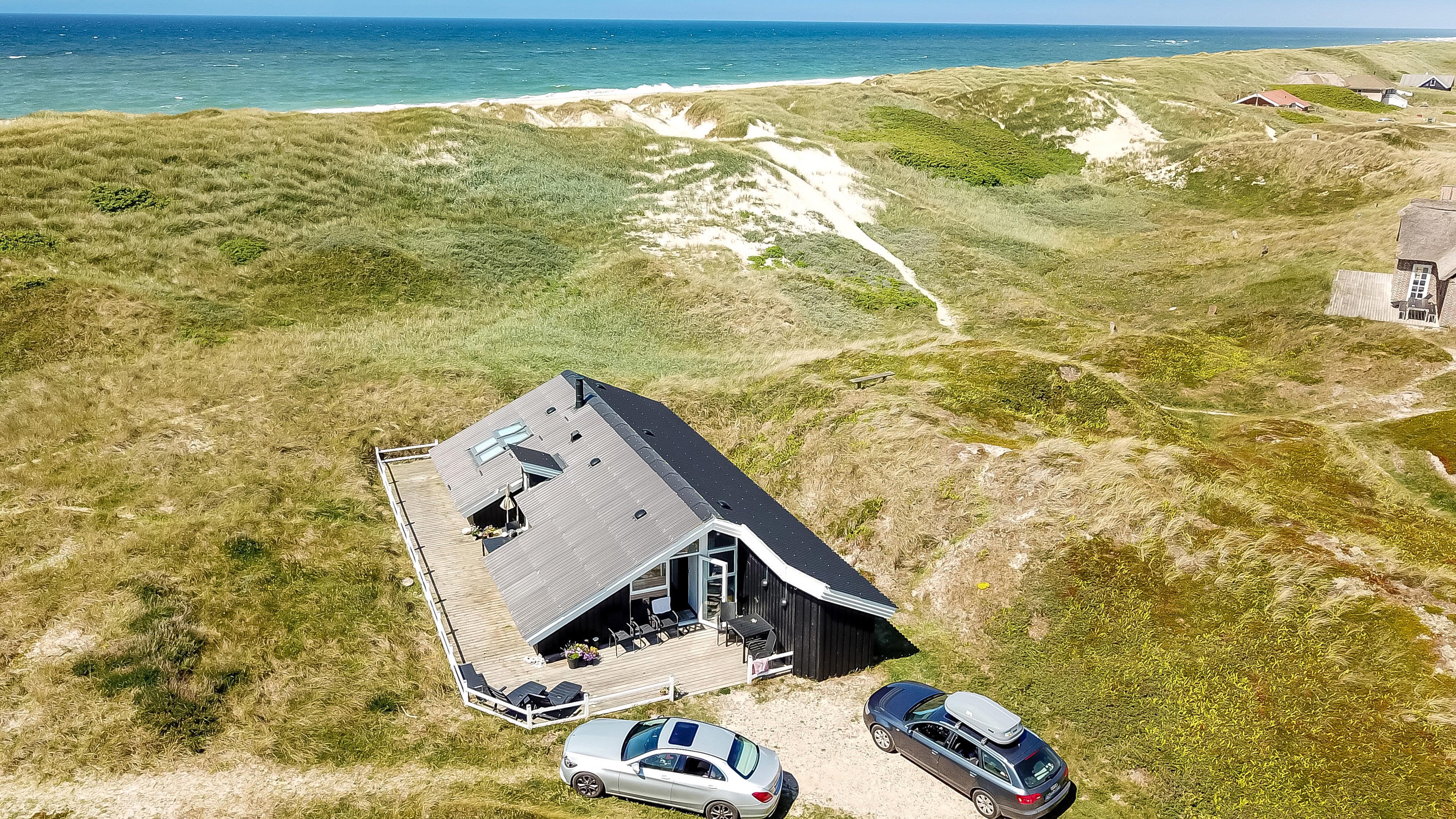 Eine große Terrasse umgibt den größten Teil des Hauses, von der man das Meer rauschen hört. Sie ist mit Gartenmöbeln, Sonnenliegen und Grill ausgestattet. Hier finden Sie immer ein geschütztes Plätzchen um die Sonne zu genießen. Vom Haus sind es nur 20 m bis zum weißen Sandstrand und vom Grundstück gelangt man direkt an die Nordsee. Hier können Sie lange Spaziergänge unternehmen, nach Steinen und Bernstein suchen, sich in einer Kuhle sonnen und das Meer genießen. Abends klettert man auf eine Düne und schaut den Sonnenuntergang über der Nordsee. Zugang zum Harboøre Center.