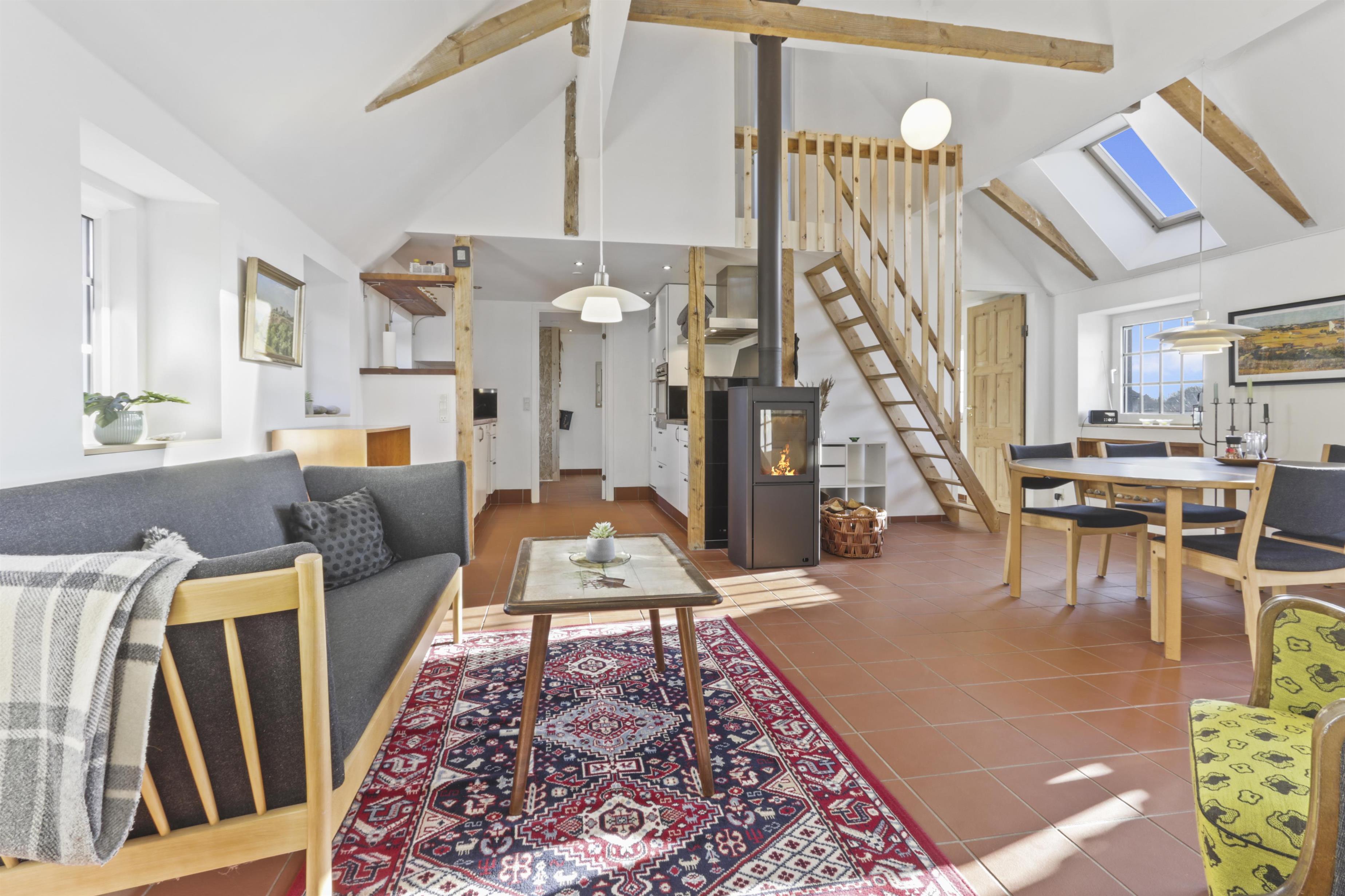 Die Küche ist ein Traum für Kochliebhaber – modern und funktional mit allen notwendigen Geräten. Von hier aus gelangen Sie zum offenen Wohnzimmer und Essbereich, der viel Platz für Entspannung und gemeinsames Beisammensein bietet. Vom Wohnzimmer haben Sie Zugang zu drei Schlafzimmern: einem mit Doppelbett und zwei mit Einzelbetten. Eine Treppe führt zu einem vierten Schlafzimmer im Obergeschoss, das zwei Einzelbetten und einen herrlichen Blick auf die umliegenden Felder bietet.