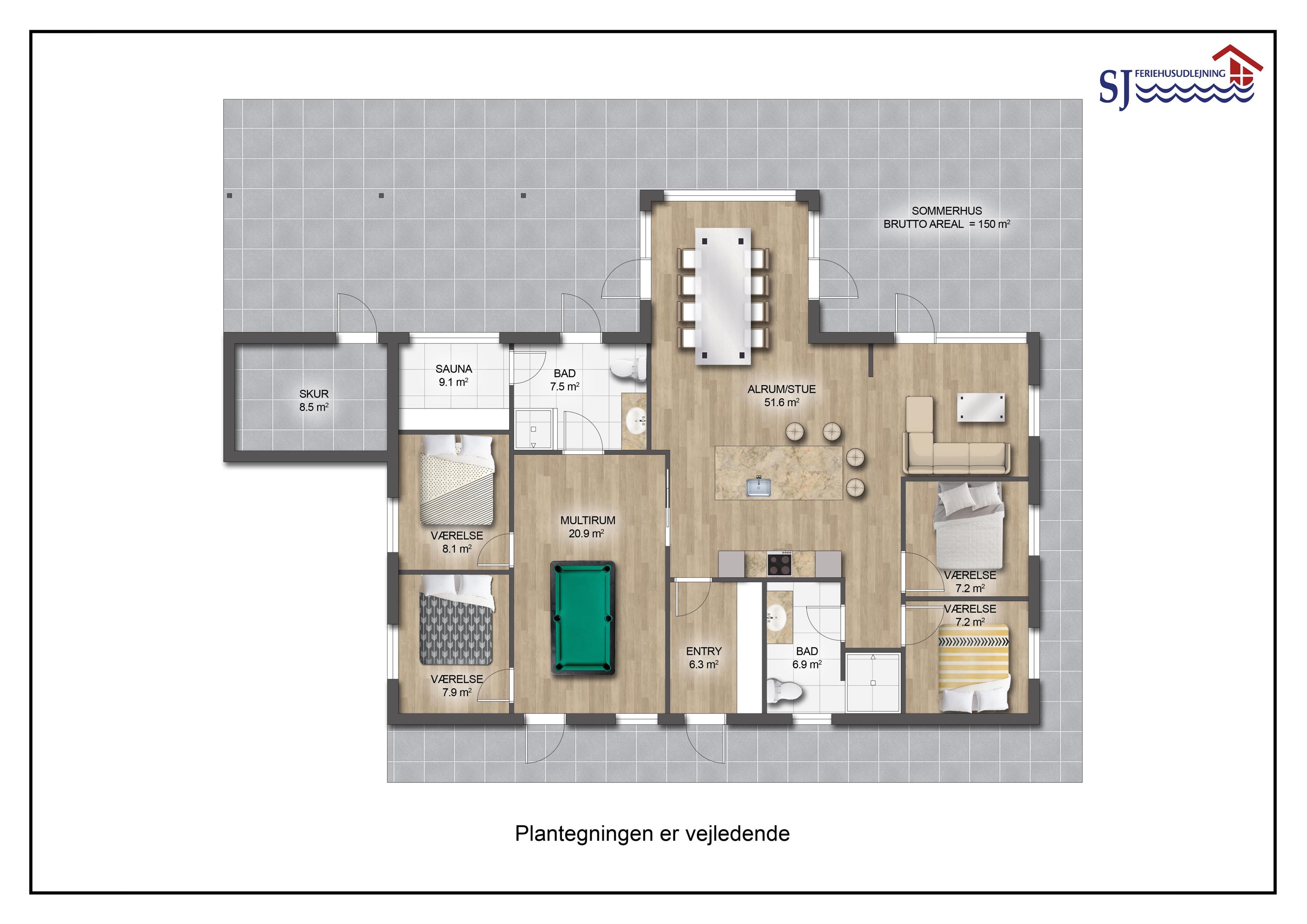 Das Haus hat eine Wohnfläche von 150 m² und verfügt über 4 schöne Schlafzimmer (1 DB, 1 DB, 1 DB, 1 DB), ausgestattet mit neuen und hochwertigen Betten.