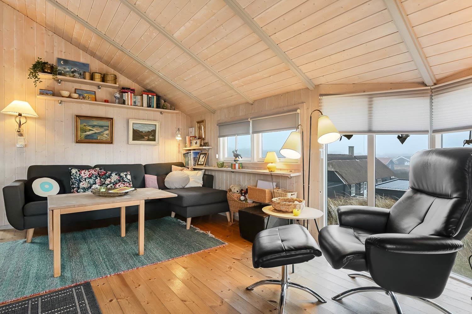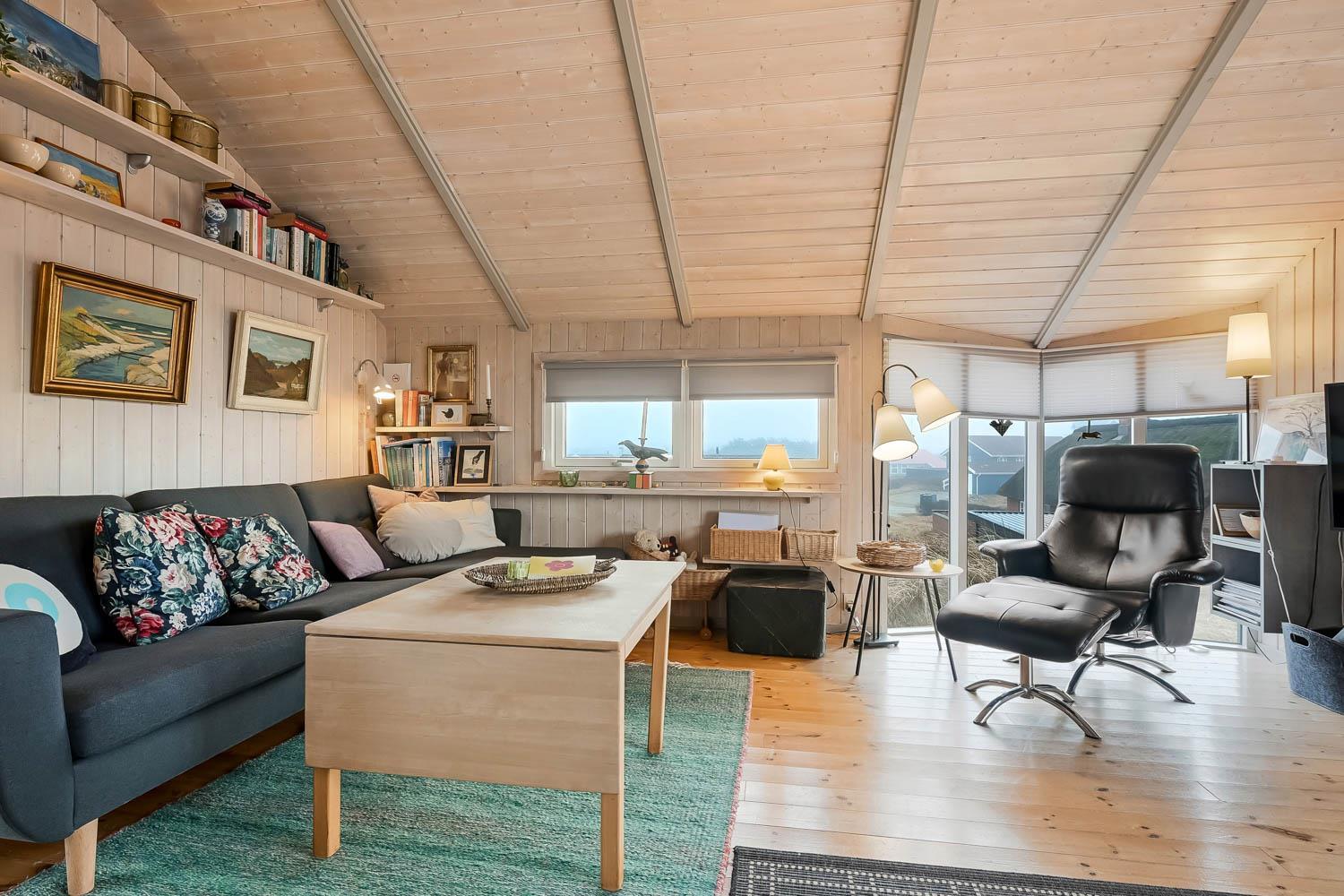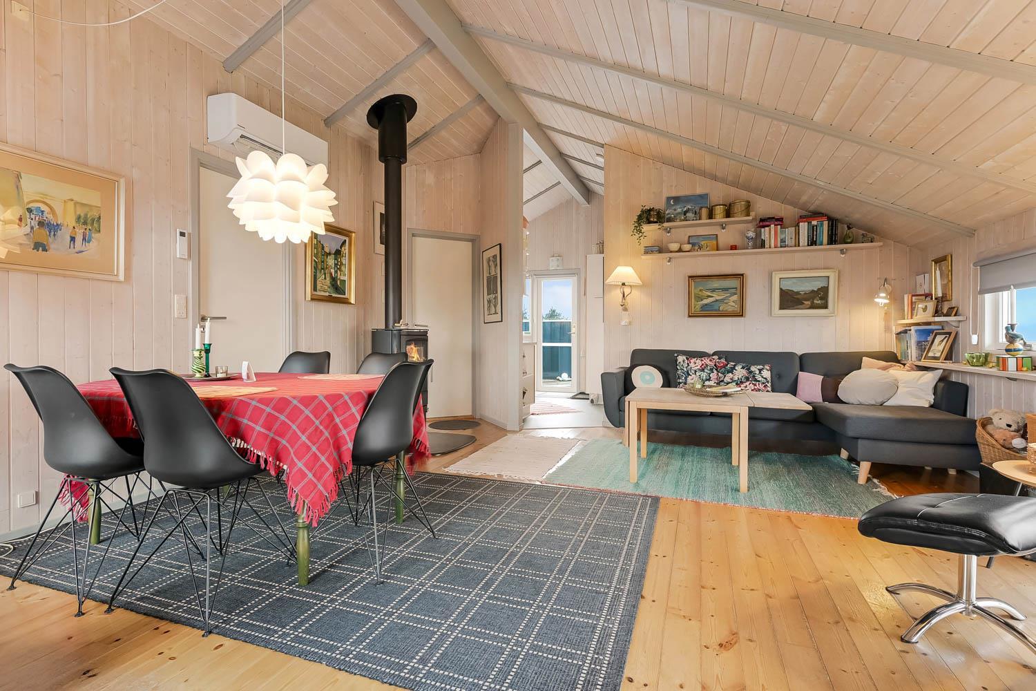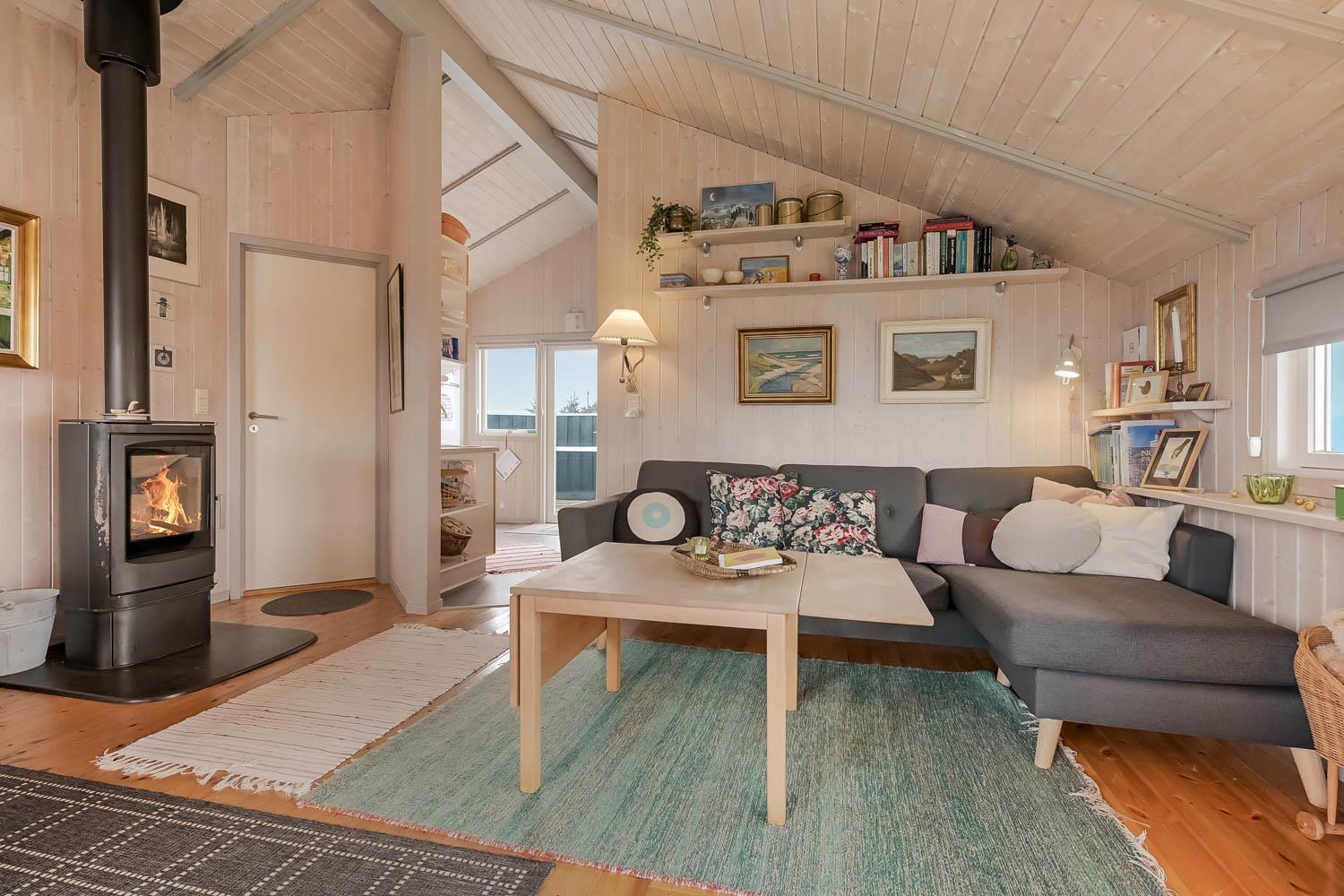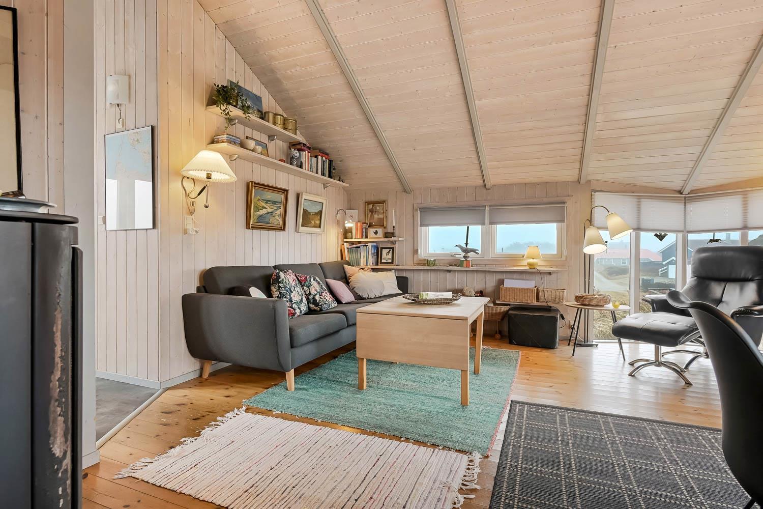 Das Haus ist hell und freundlich durch die grossen Fensterpartien und Erkern. Der Wohnraum ist der Sammelpunkt im Haus und ist mit Holzboden ausgelegt und darüber liegen lose Teppiche. Hier gibt es einen Esstisch, eine schöne Sofagruppe und Flachbildschirm mit dänischem TV und TV2 und ausserdem haben Sie die Möglichkeit deutsche Programme durch Parabol zu sehen. Geniessen Sie das Licht im Wohnraum und machen Sie den Kaminofen an, dann können Sie es sich ganz gemütlich machen. Wänmepumpe im Haus. Die Küche ist mit Abzugshaube, E-Herd, Kühl-/Gefrierschrank mit 30 l, Mikrowelle und Geschirrspüler. Es gibt 2 Schlafräume: 1DB + 1DB. Ausserdem gibt es ein Badezimmer mit Toilette, Dusche, Whirlpool und Sauna.