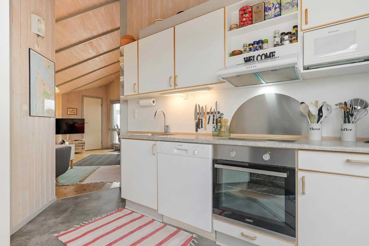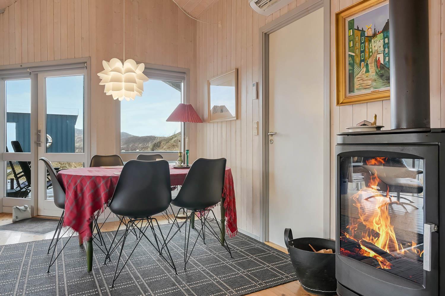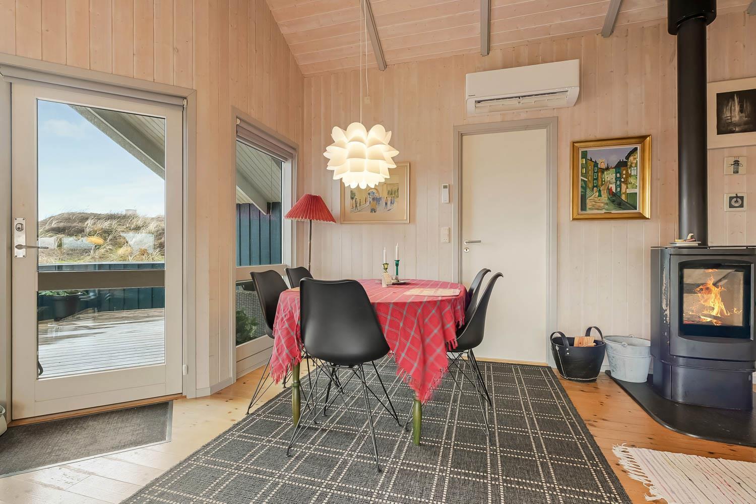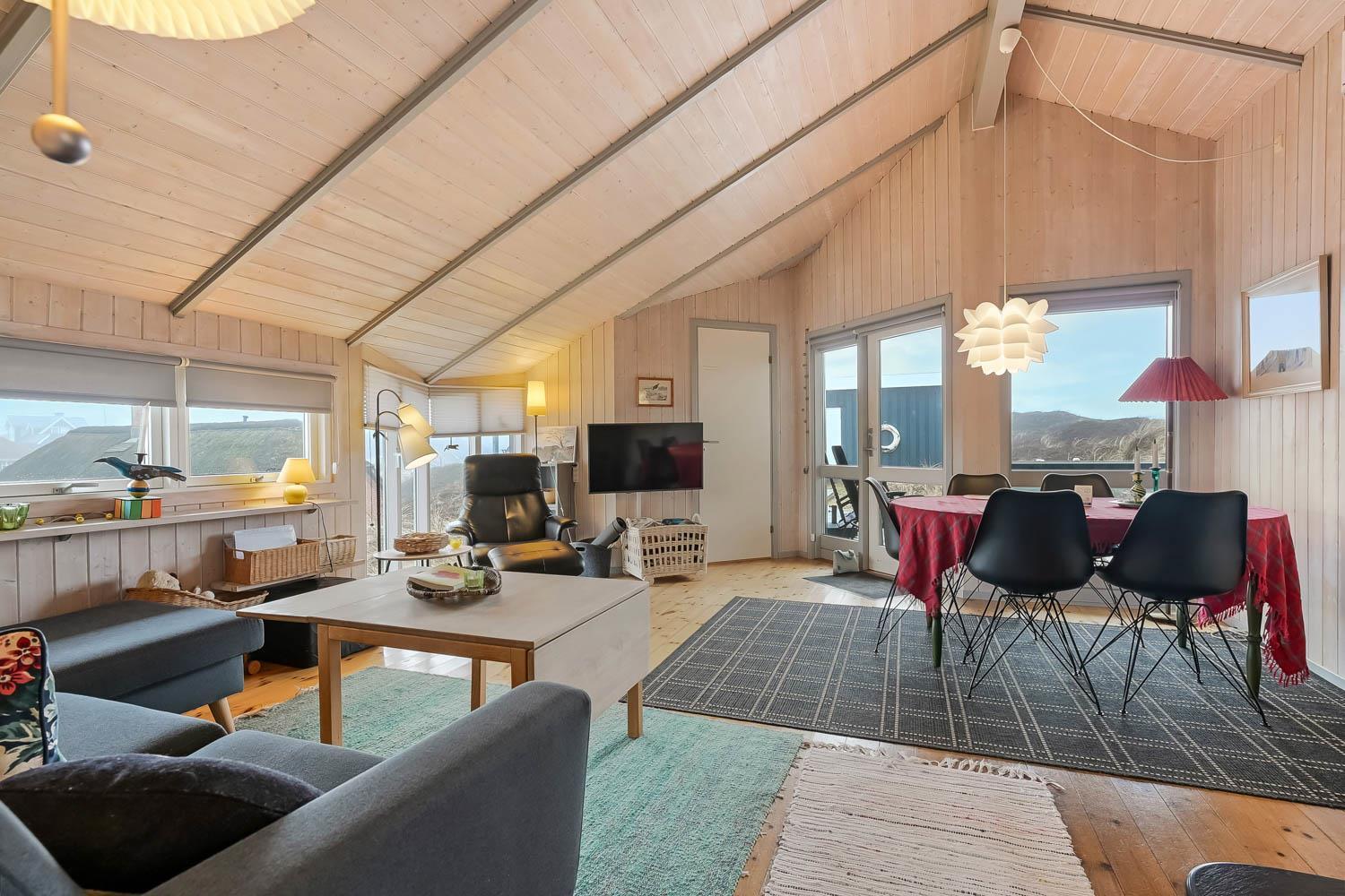 Das Haus ist hell und freundlich durch die grossen Fensterpartien und Erkern. Der Wohnraum ist der Sammelpunkt im Haus und ist mit Holzboden ausgelegt und darüber liegen lose Teppiche. Hier gibt es einen Esstisch, eine schöne Sofagruppe und Flachbildschirm mit dänischem TV und TV2 und ausserdem haben Sie die Möglichkeit deutsche Programme durch Parabol zu sehen. Geniessen Sie das Licht im Wohnraum und machen Sie den Kaminofen an, dann können Sie es sich ganz gemütlich machen. Wänmepumpe im Haus. Die Küche ist mit Abzugshaube, E-Herd, Kühl-/Gefrierschrank mit 30 l, Mikrowelle und Geschirrspüler. Es gibt 2 Schlafräume: 1DB + 1DB. Ausserdem gibt es ein Badezimmer mit Toilette, Dusche, Whirlpool und Sauna.