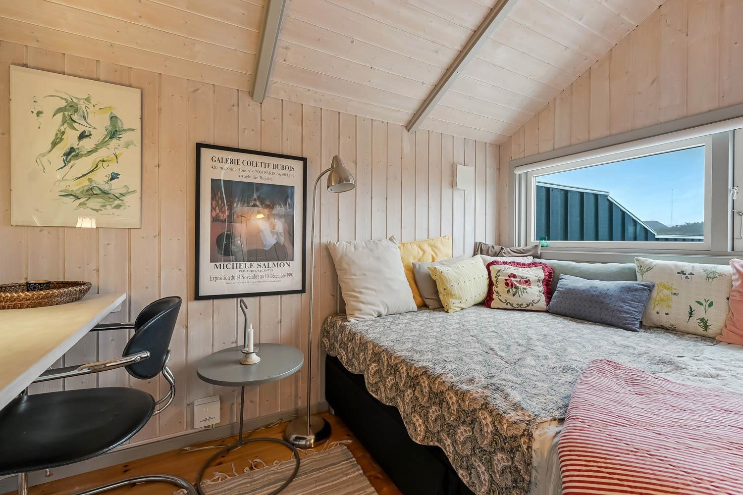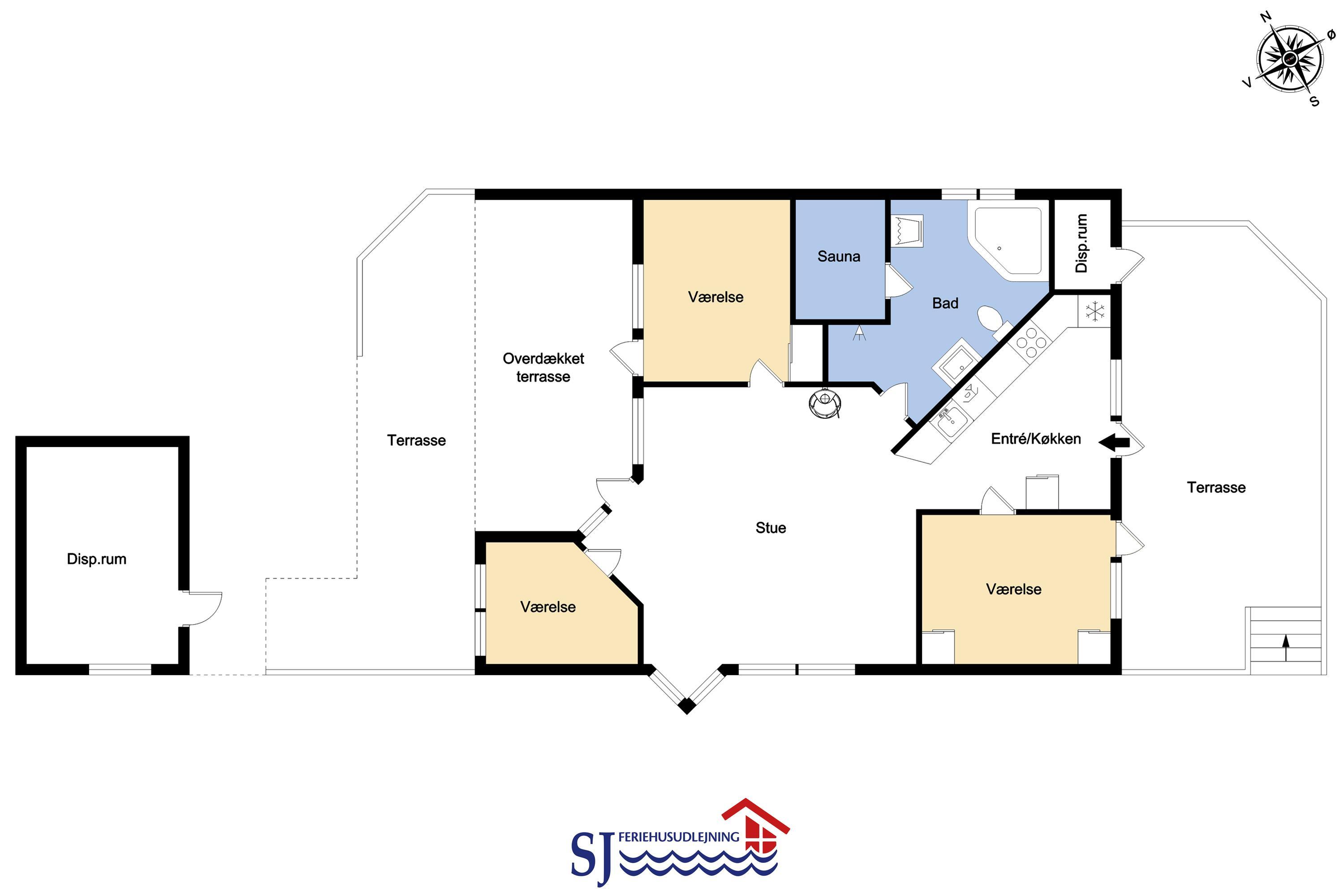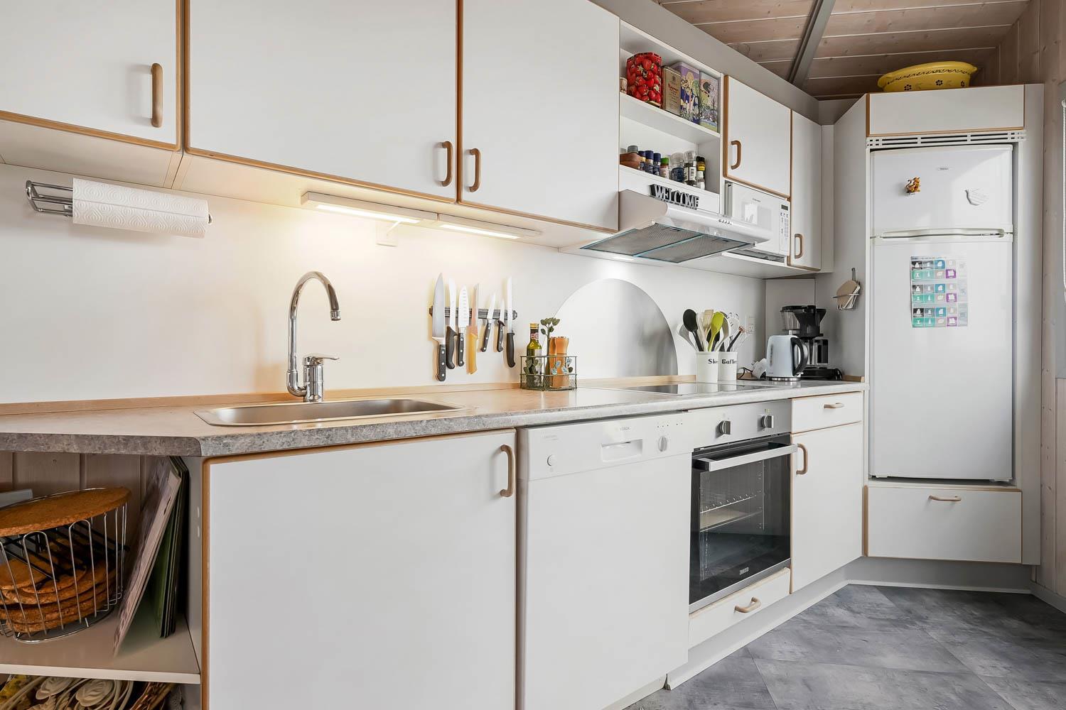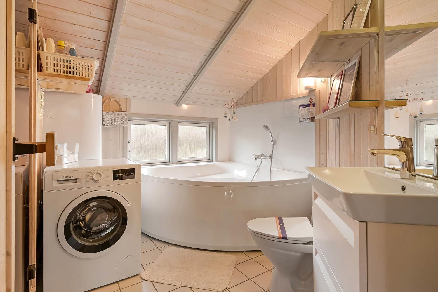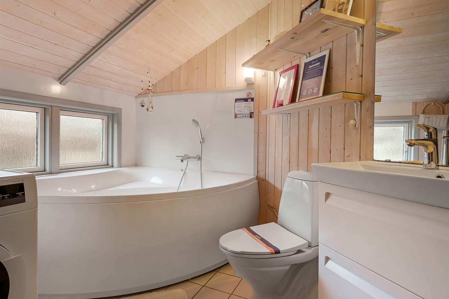 Das Haus ist hell und freundlich durch die grossen Fensterpartien und Erkern. Der Wohnraum ist der Sammelpunkt im Haus und ist mit Holzboden ausgelegt und darüber liegen lose Teppiche. Hier gibt es einen Esstisch, eine schöne Sofagruppe und Flachbildschirm mit dänischem TV und TV2 und ausserdem haben Sie die Möglichkeit deutsche Programme durch Parabol zu sehen. Geniessen Sie das Licht im Wohnraum und machen Sie den Kaminofen an, dann können Sie es sich ganz gemütlich machen. Wänmepumpe im Haus. Die Küche ist mit Abzugshaube, E-Herd, Kühl-/Gefrierschrank mit 30 l, Mikrowelle und Geschirrspüler. Es gibt 2 Schlafräume: 1DB + 1DB. Ausserdem gibt es ein Badezimmer mit Toilette, Dusche, Whirlpool und Sauna.