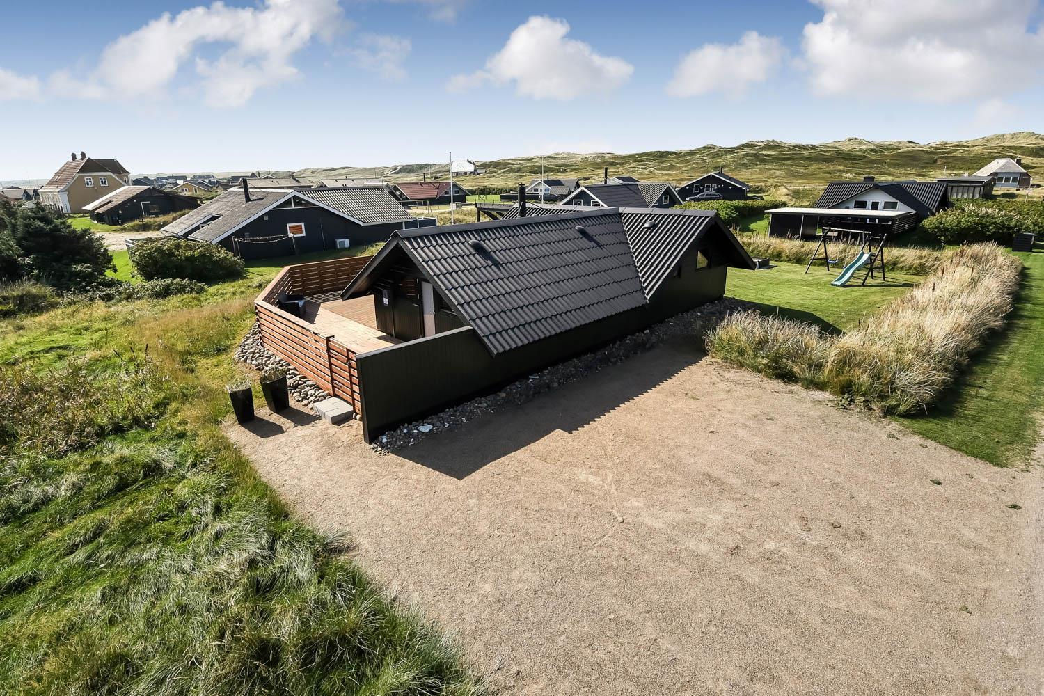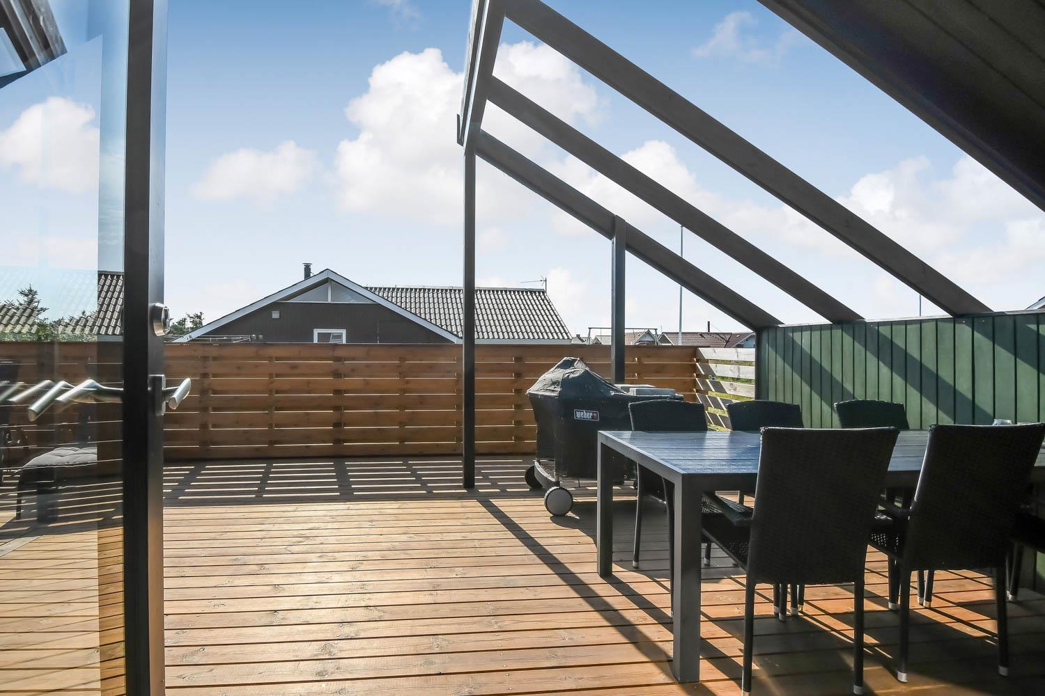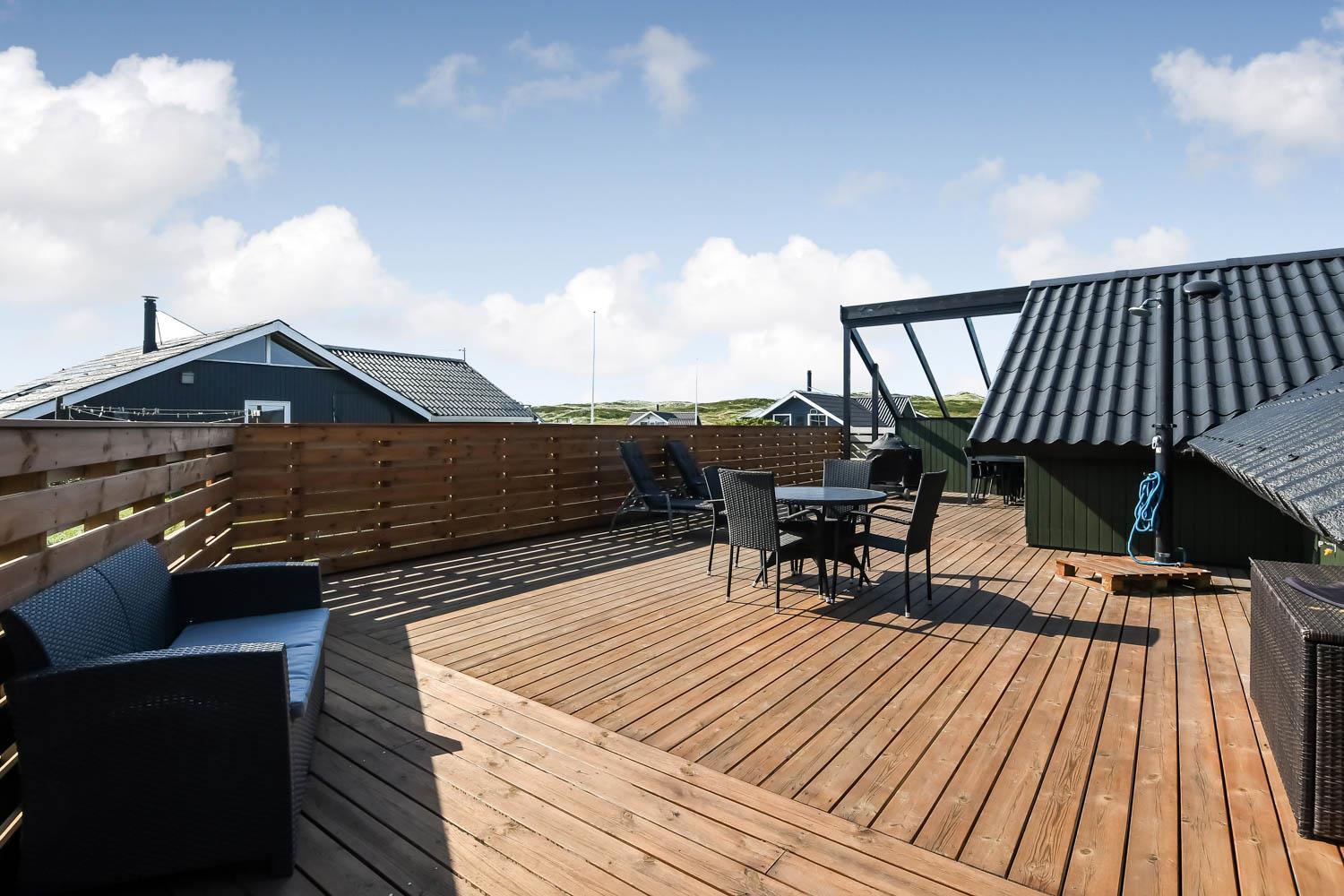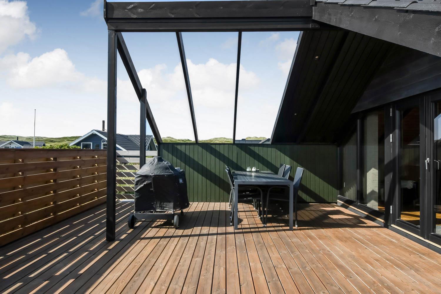 Die eingezäunte Terrasse liegt Richtung Süd und es ist teilweise überdacht. Sie können direkt vom Wohnraum auf die Terrasse kommen. Genießen Sie die Morgen- und Abendsonne in den Gartenmöbeln oder auf einer der 2 Sonnenliegen. Ein Grill ist natürlich auch Standard und die Kinder können sich auf der Schaukel, Rutsche oder im Sandkasten vergnügen, die alle bei der Terrasse sind. Das Haus liegt gut wenn Sie wandern möchten; es ist unweit zum Ferring See und der Nordsee. Im Sommerhalbjahr von Ostern bis zum Herbsturlaub ist es nur etwa 600 m zum Kaufmann in Vejlby Torv, wo es auch ein Café gibt, das in der Saison geöffnet hat. Im Winterhalbjahr müssen Sie die 6 km nach Harboøre fahren, wo es Aldi und Brugsen gibt.