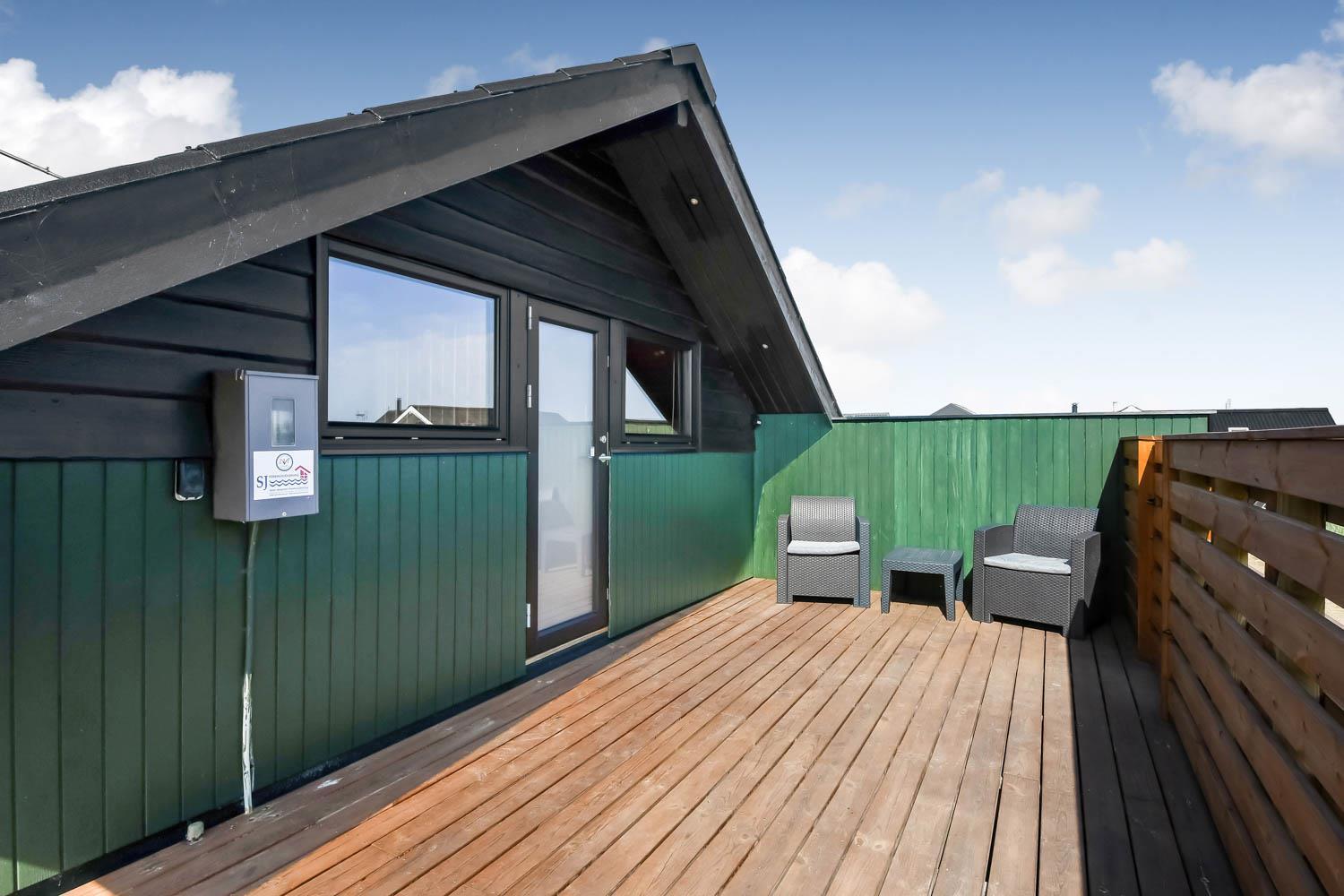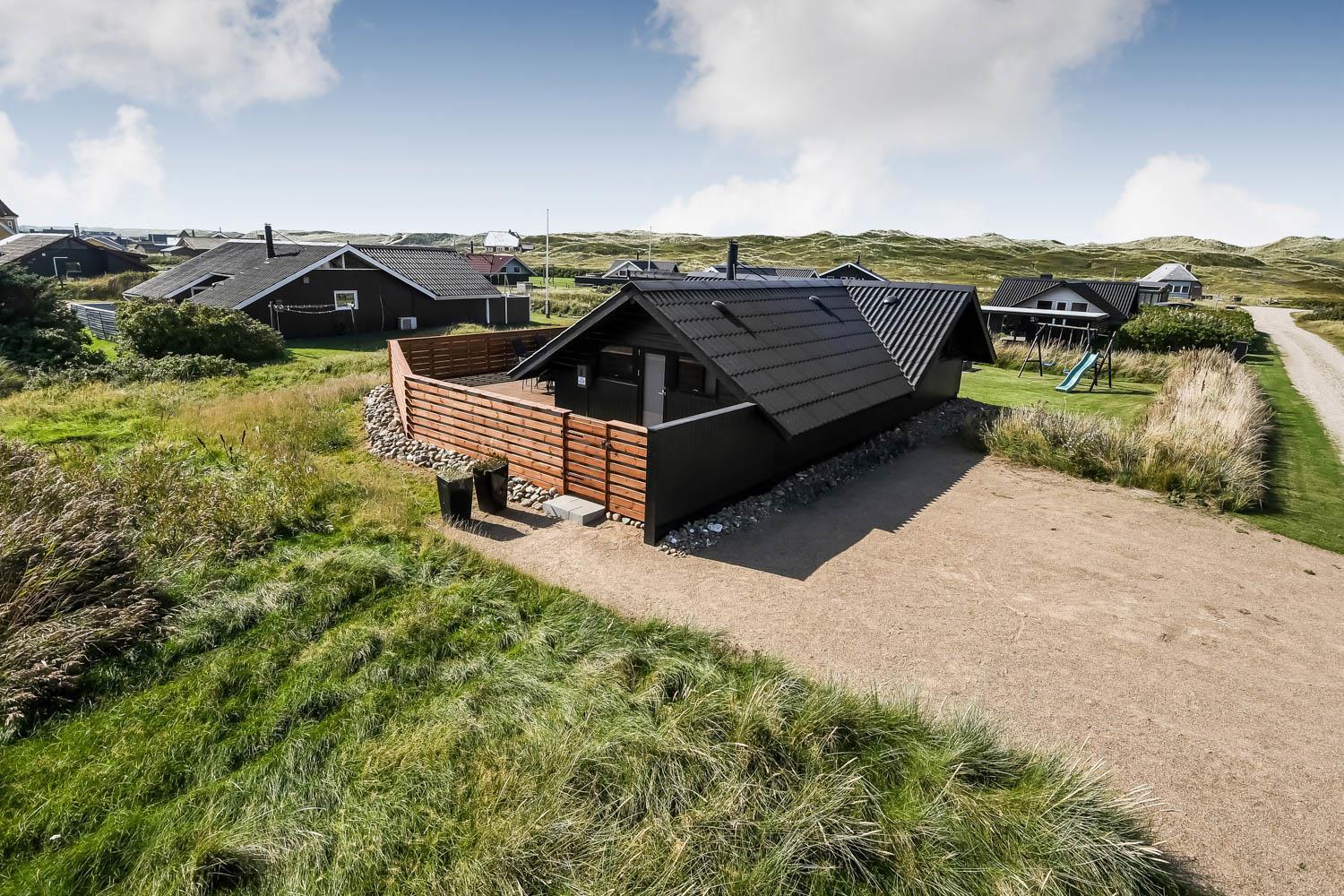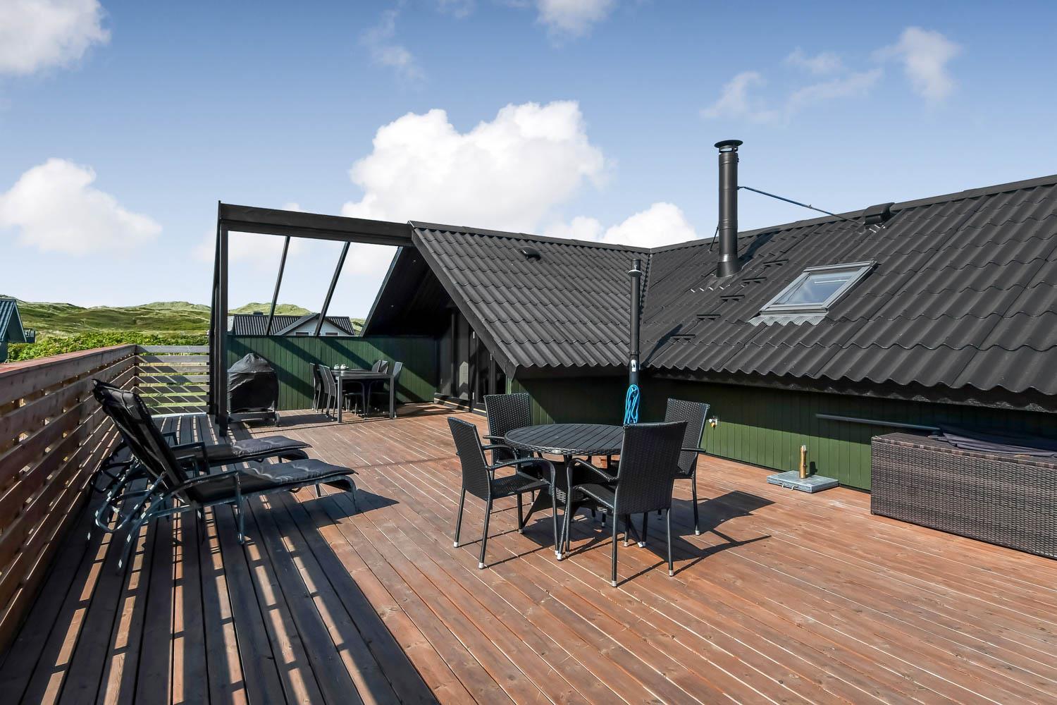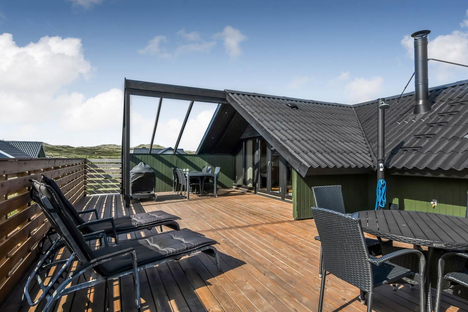 Die eingezäunte Terrasse liegt Richtung Süd und es ist teilweise überdacht. Sie können direkt vom Wohnraum auf die Terrasse kommen. Genießen Sie die Morgen- und Abendsonne in den Gartenmöbeln oder auf einer der 2 Sonnenliegen. Ein Grill ist natürlich auch Standard und die Kinder können sich auf der Schaukel, Rutsche oder im Sandkasten vergnügen, die alle bei der Terrasse sind. Das Haus liegt gut wenn Sie wandern möchten; es ist unweit zum Ferring See und der Nordsee. Im Sommerhalbjahr von Ostern bis zum Herbsturlaub ist es nur etwa 600 m zum Kaufmann in Vejlby Torv, wo es auch ein Café gibt, das in der Saison geöffnet hat. Im Winterhalbjahr müssen Sie die 6 km nach Harboøre fahren, wo es Aldi und Brugsen gibt.