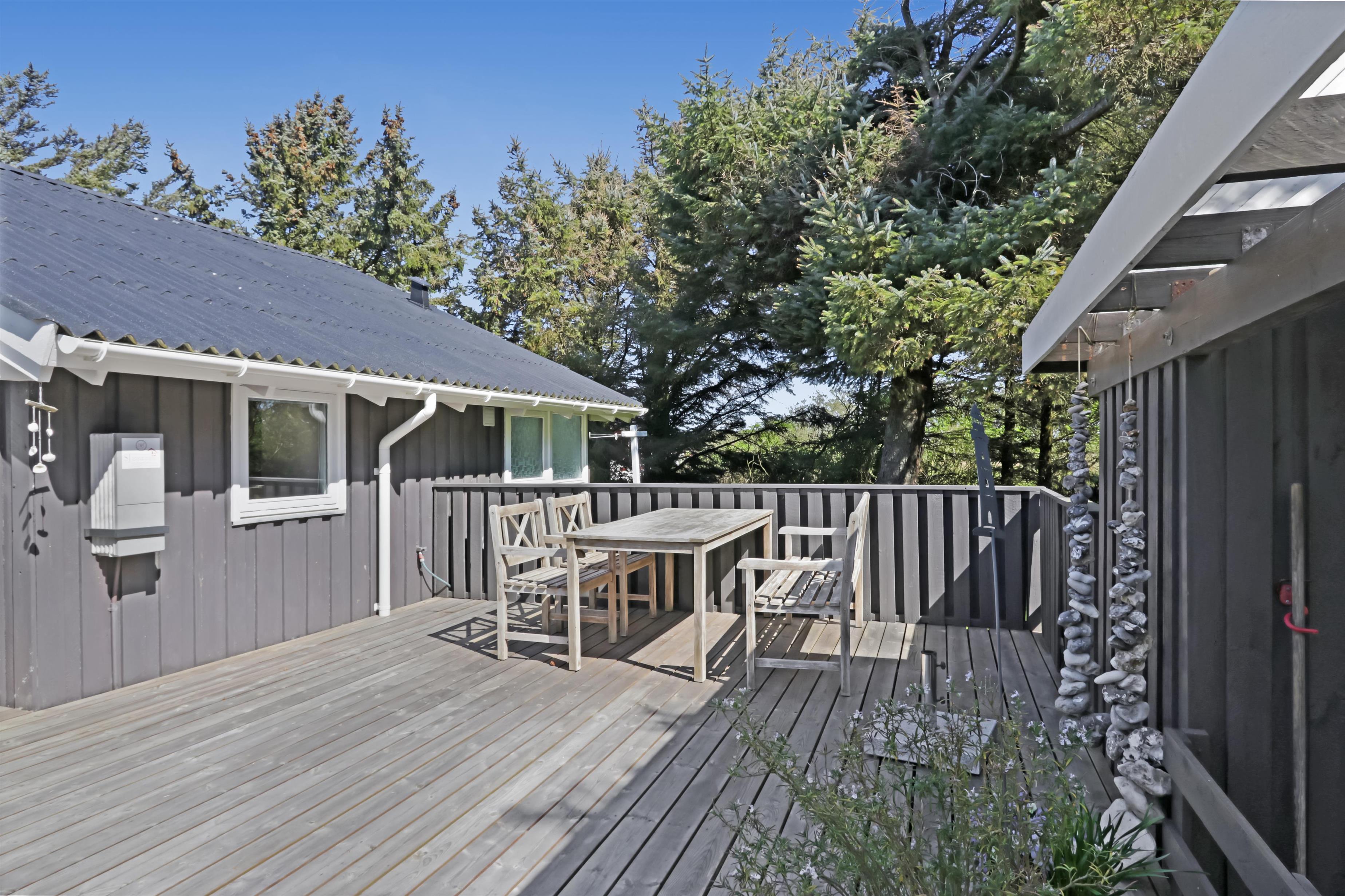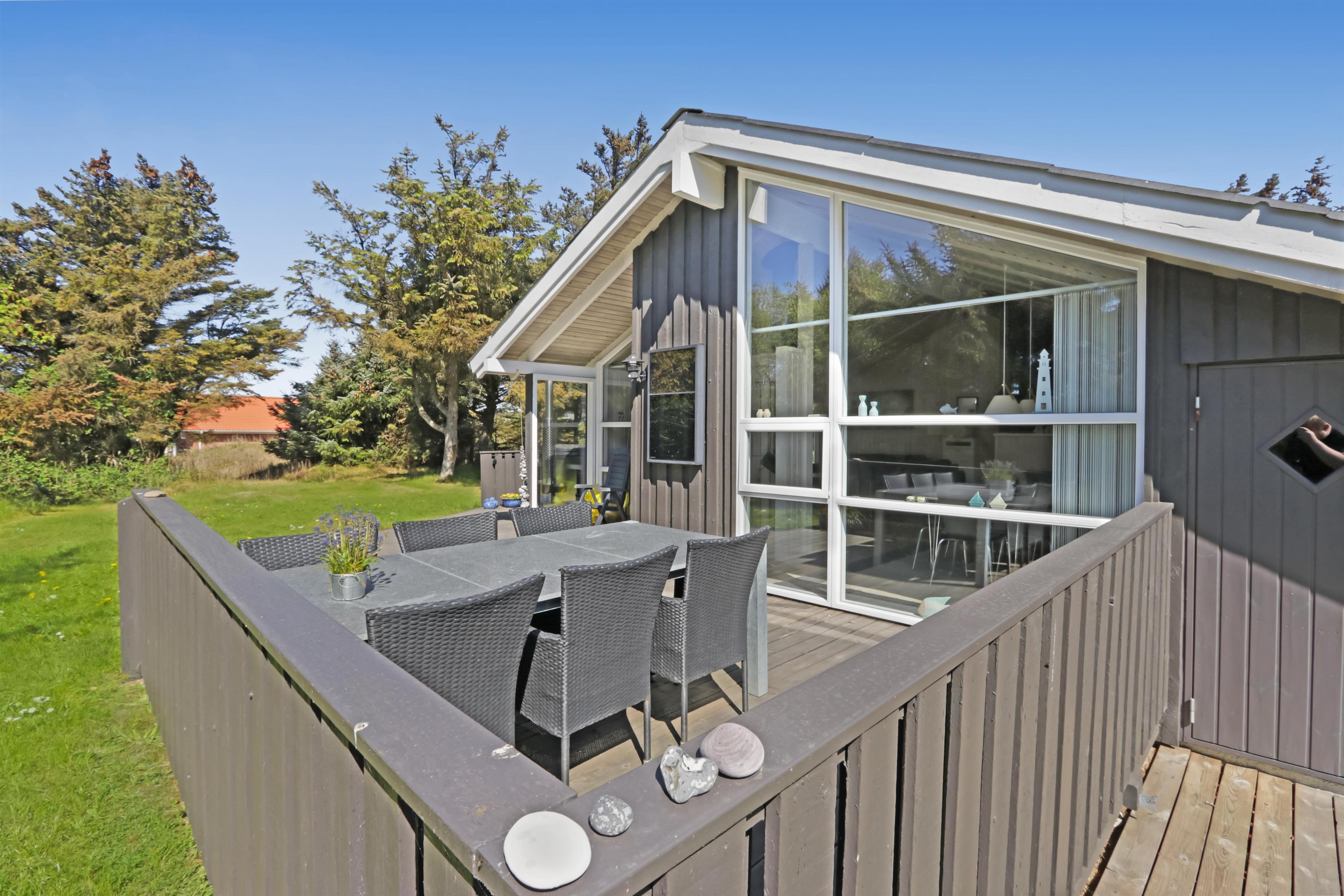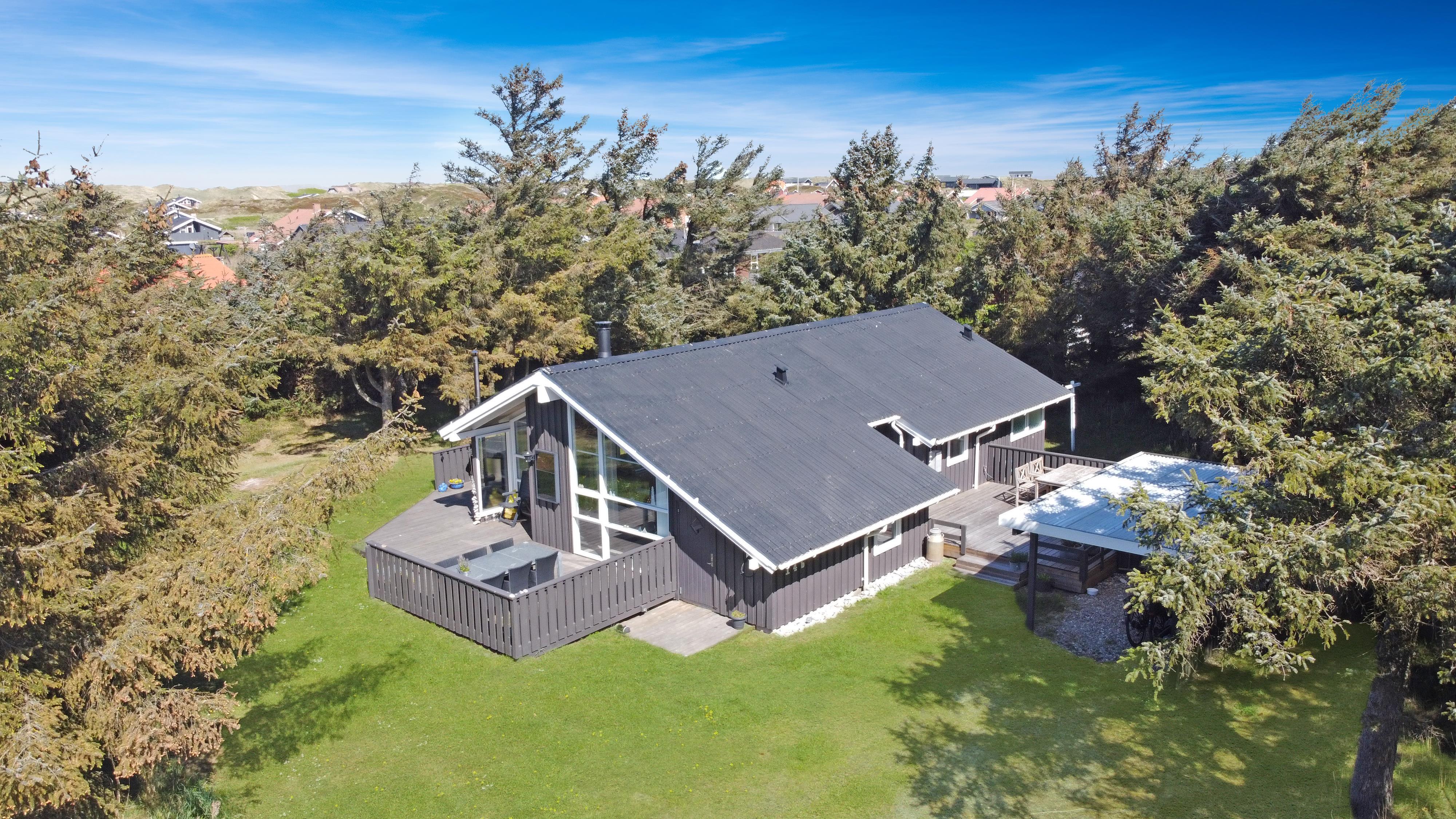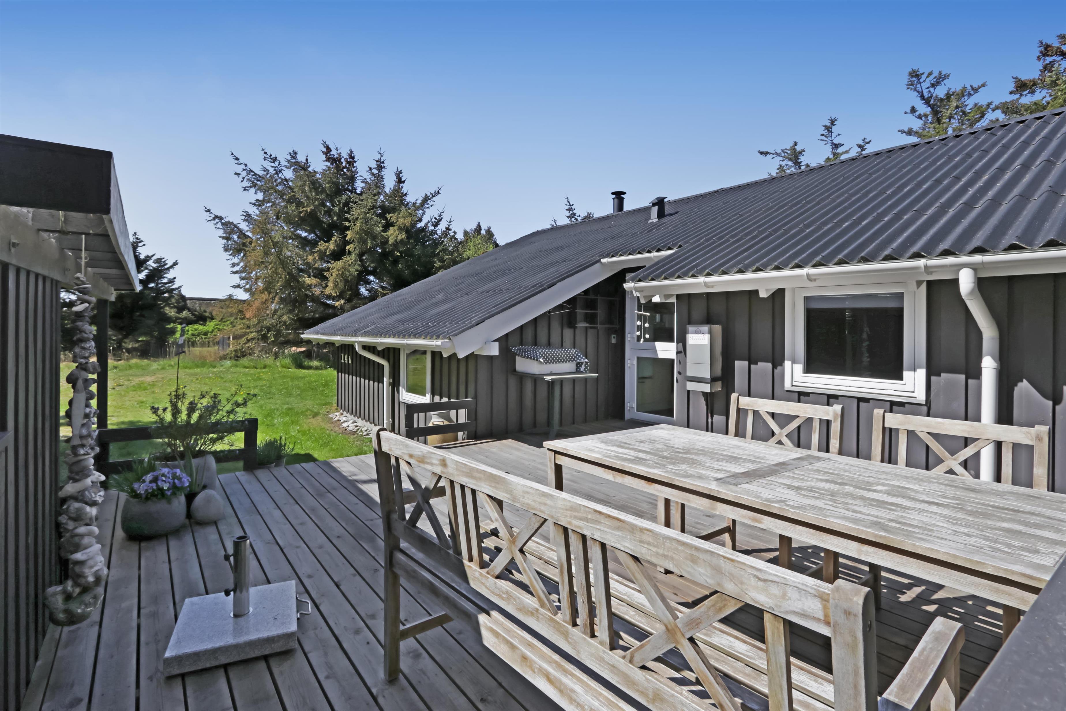 Das Haus liegt auf einem etwa 1.400 m² grossen, fantastischen Naturgrundstück bloss 250 m von der Nordsee entfernt. Es gibt einen Ausgang zu einer teilweise überdachten Holzterrassenanlage mit Gartenmöbeln, Sonnenliegen, Weber-Gasgrill und Weber Kohlegrill, die Sie nach Bedarf umstellen können - in die Sonne oder in den Schatten - Wunderbare Möglichkeit für “Grillenthusiasten“. Parken Sie das Auto im Carport und unmittelbar danach werden Sie das parkähnliche Gelände mit vielen schönen Bäumen bemerken, was bedeutet, dass das Haus und die Terrassen immer geschützt sind. In Vejlby Klit und Umgebung gibt es wirklich gute Möglichkeiten zum Radfahren, Wandern oder Laufen und nur etwa 250 m vom Haus entfernt liegt die sprudelnde Nordsee, die jeden Tag ein neues malerisches Erlebnis bietet. In der Saison können Sie nur ca. 10 Min. vom Haus entfernt Frühstück oder Lebensmittel einkaufen, oder vielleicht die Familie zum Essen einladen. Egal, ob Sie einen aktiven oder total entspannten Urlaub wünschen,, dieses schöne Ferienhaus bietet den perfekten Rahmen in Bezug auf Haus, Lage und Umgebung.