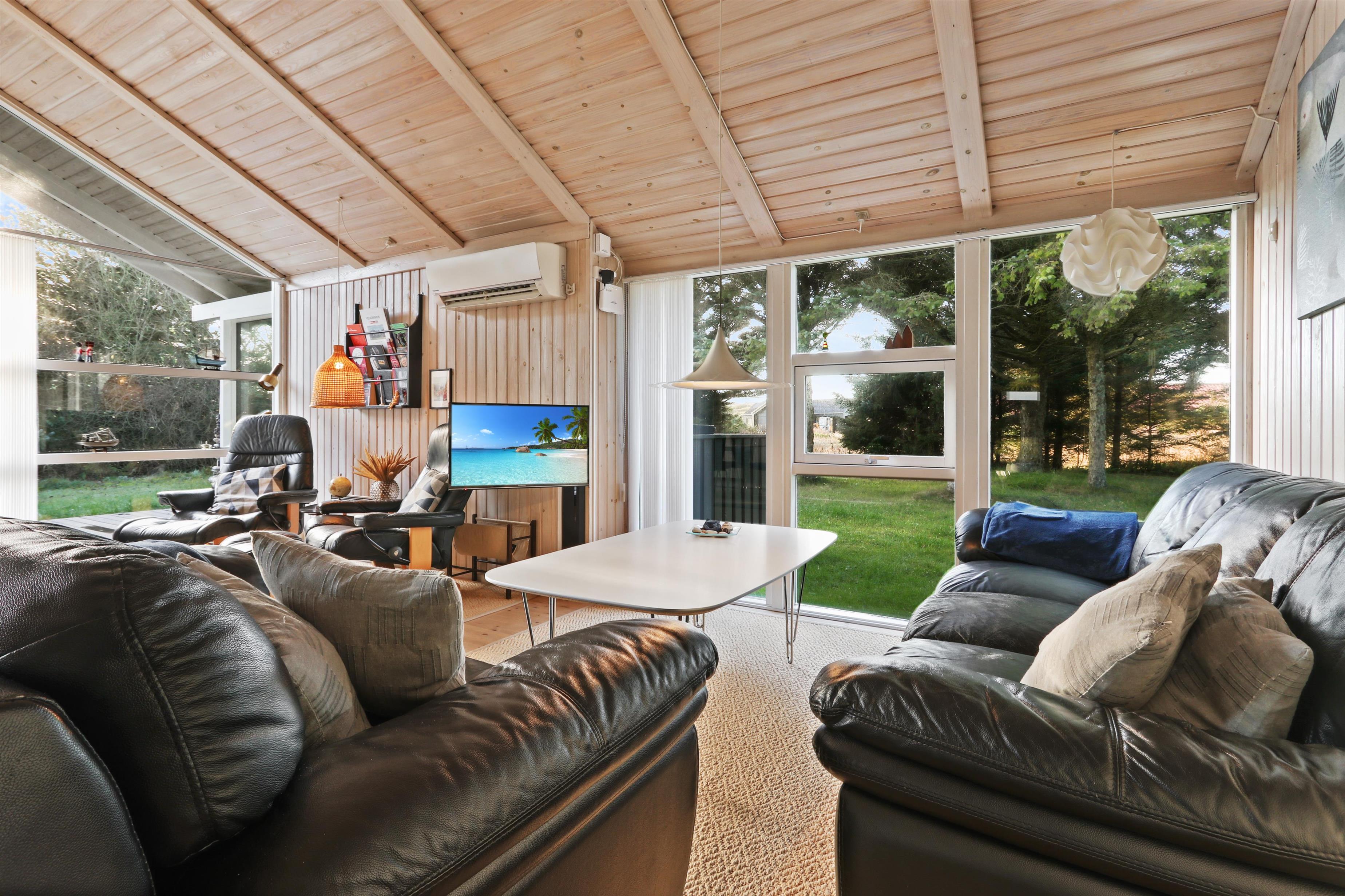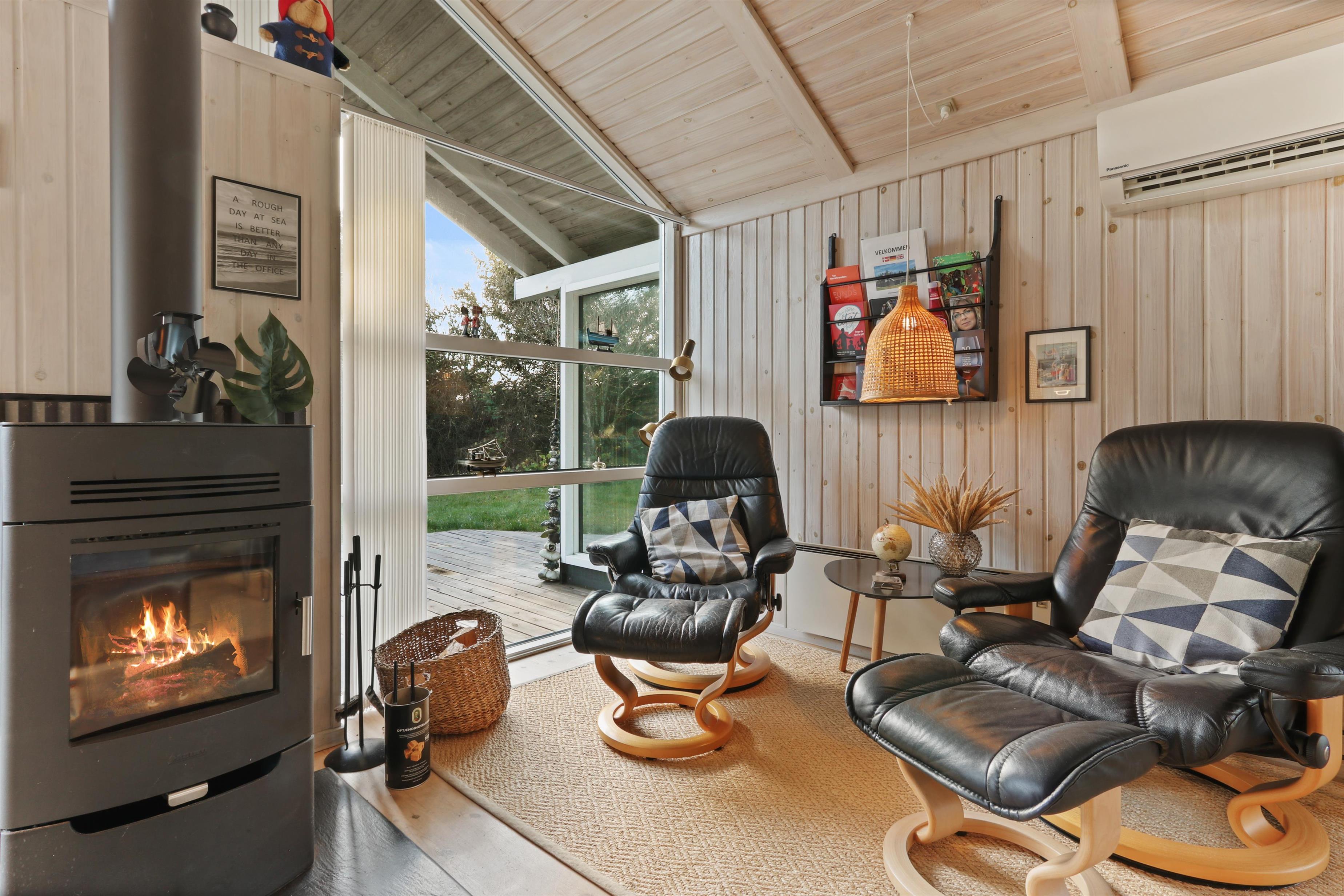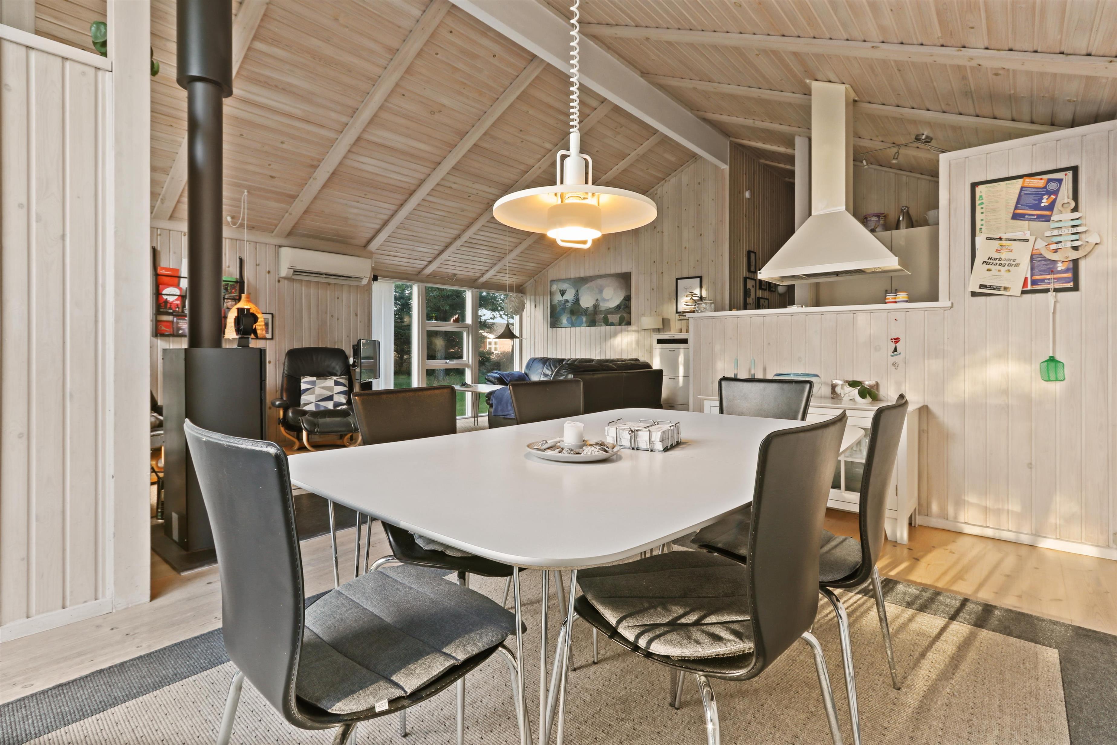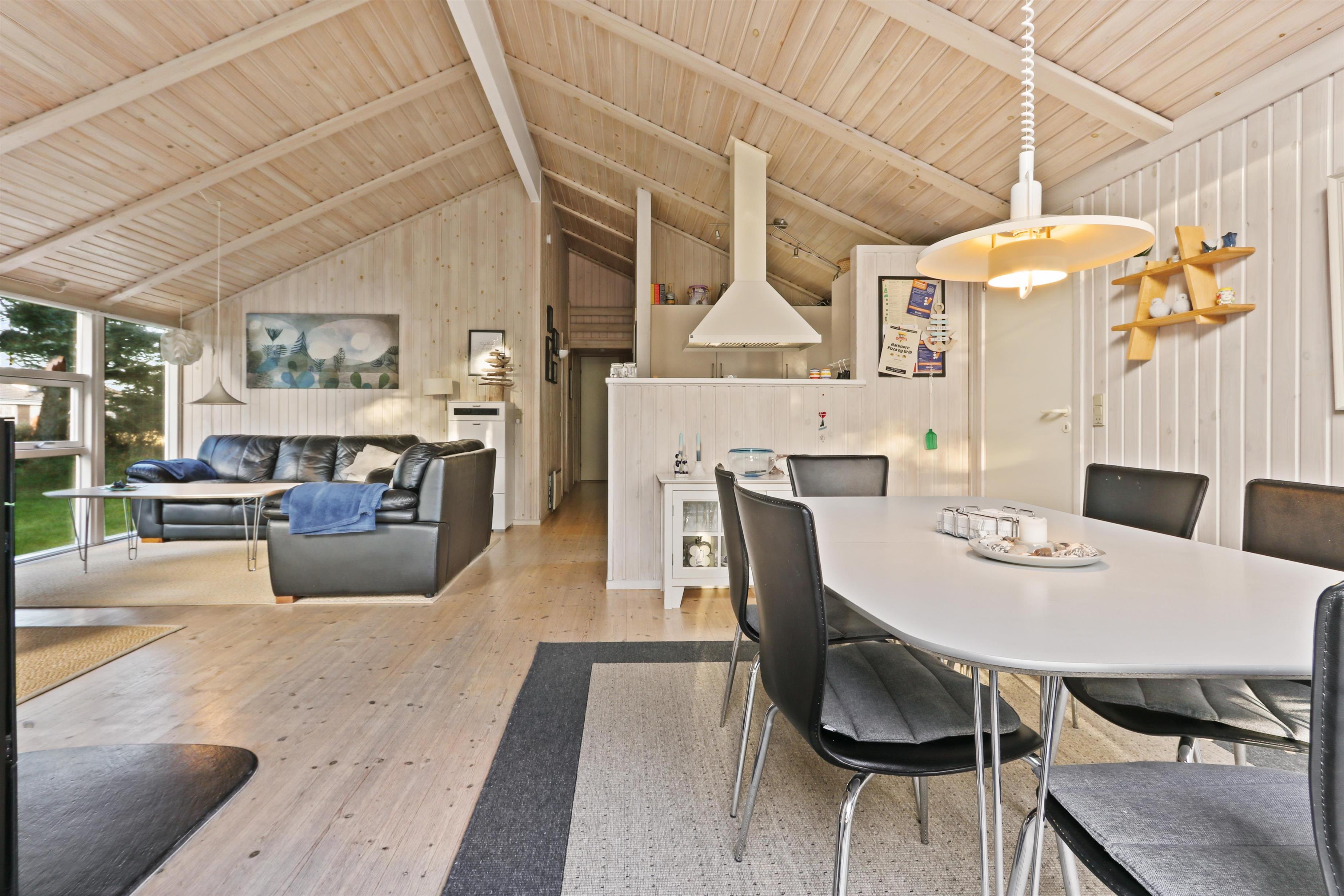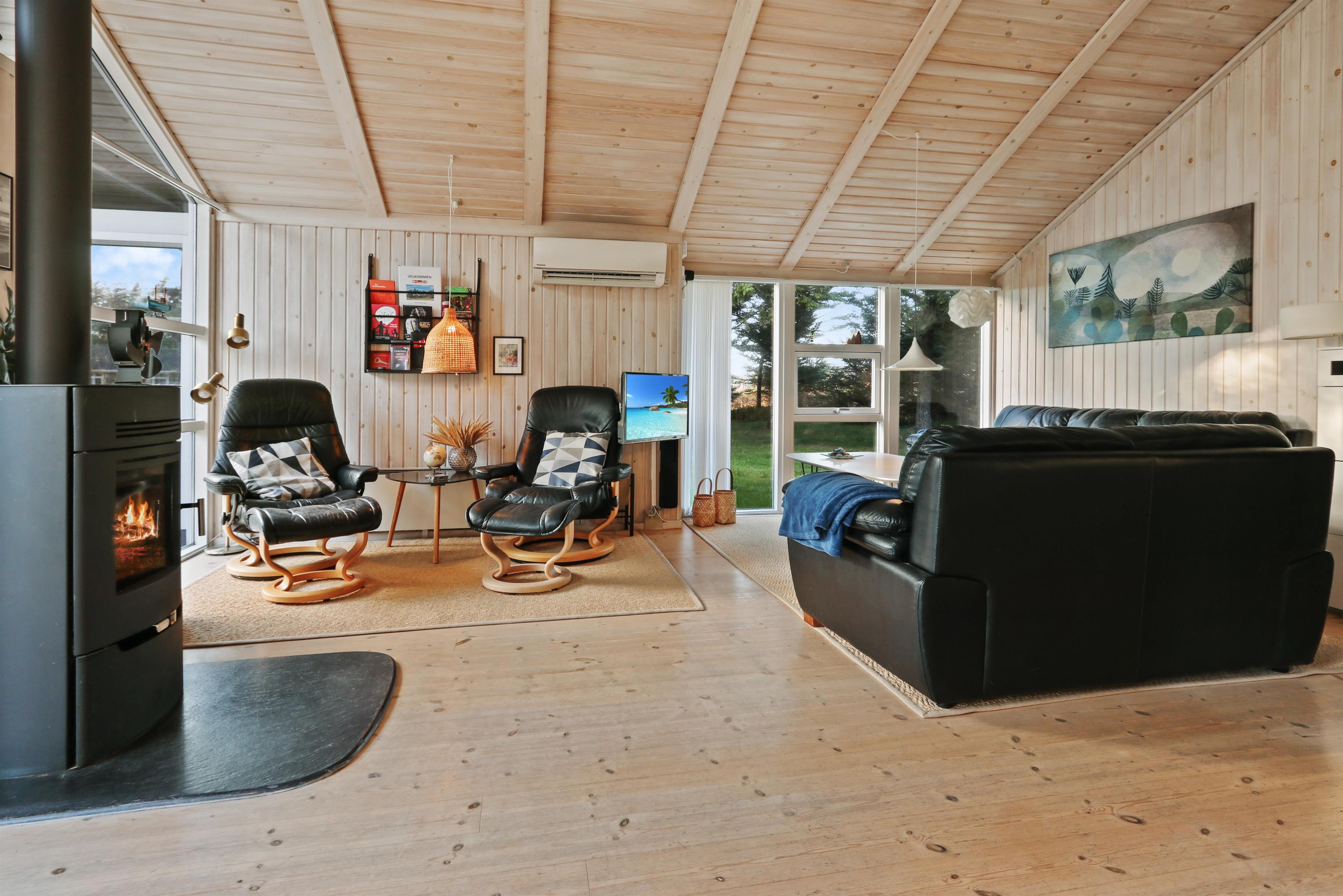 96 m² grosses, geräumiges, komfortabel eingerichtetes Holzhaus. Wohnraum mit offener Decke und sehr gemütlich und persönlich eingerichtet. Der Wohnraum ist aufgeteilt in Wohn- und Essraum, die mit der Küche kombiniert sind. Der Wohnraum ist mit Ledermöbeln, Esstisch und TV mit dänischen und deutschen Programmen eingerichtet. Entspannen Sie sich vor dem Kaminofen, der zusammen mit der Warmepumpe für eine reduzierte Stromrechnung sorgt. Praktische Holzböden im ganzem Haus. 4 gute Schlafräume: 1DB + 1DB + 1DB + 2B aber max 6 Personen darf das Haus bewohnen. Die Küchenecke mit allem an Service/Kochgeschirr, Herd mit Cerankochfeld, eingebautem Ofen, Abzugshaube, Geschirrspüler und Kühlschrank mit Gefrierfach ausgestattet. Extra Aufbewahrungsraum mit z.B. Mikrowelle. Das Haus hat 2 Badezimmer, beide mit Fliesenboden und Fussbodenheizung, Toilette und Waschbecken. Eines von den Bädern ist mit Whirlpool und direktem Zugang zur Sauna, Dusche und kombinierter Wachmaschine/Trockner. Nichtraucher-Haus. Haustiere sind nicht erlaubt. Wenn Sie ein Elektroauto oder einen Plug-in-Hybrid haben, verfügt das Haus über eine Ladebox.
