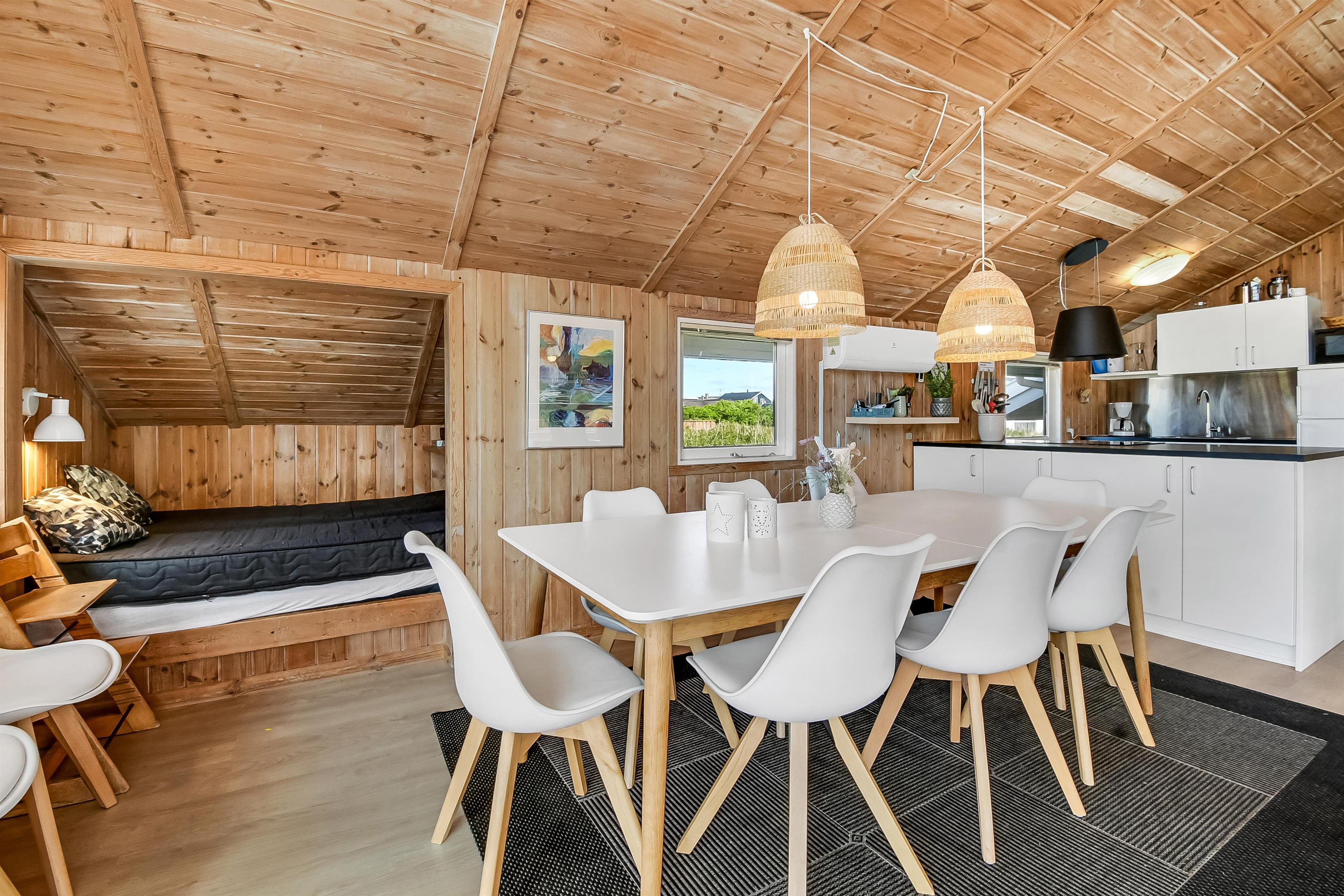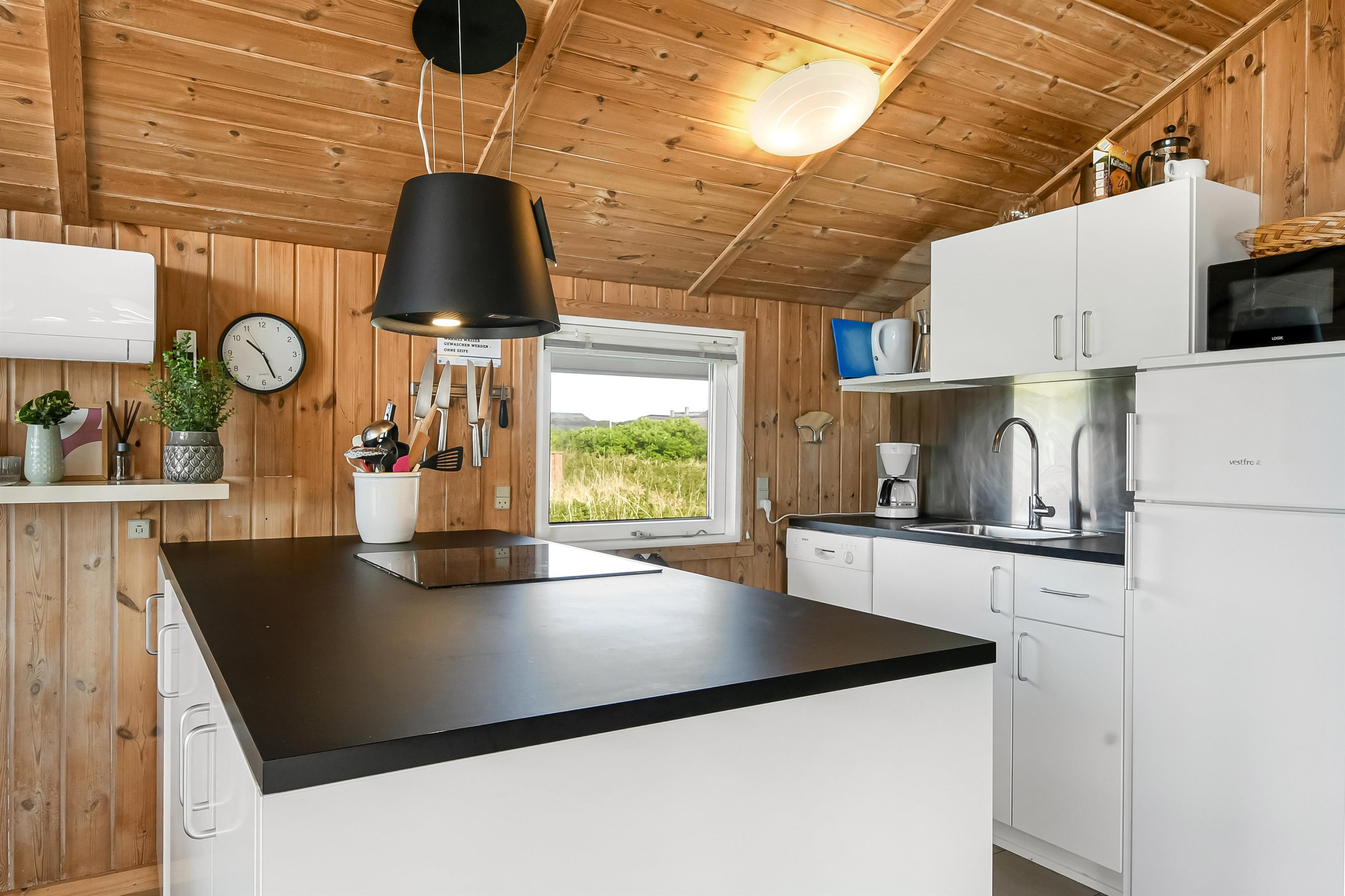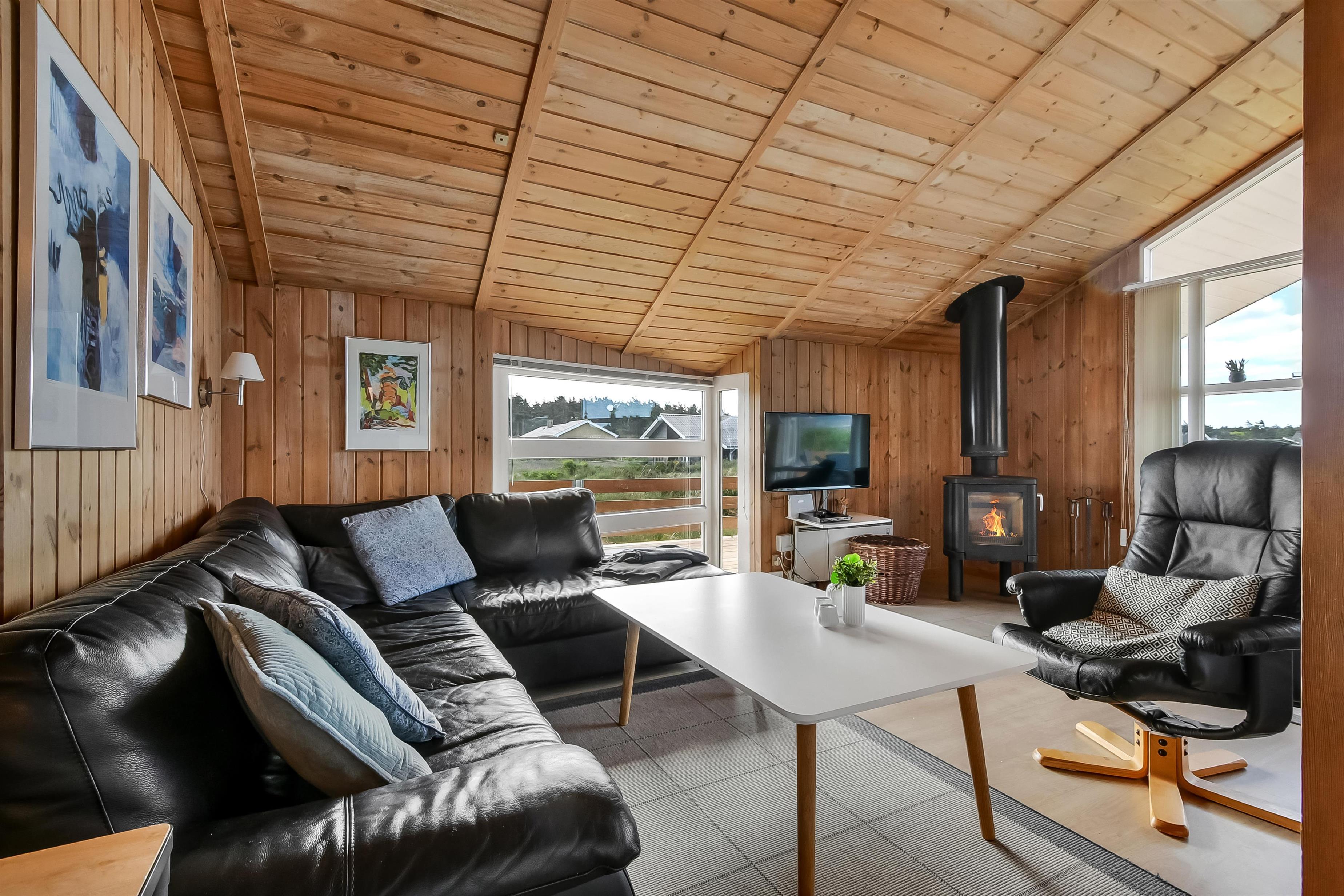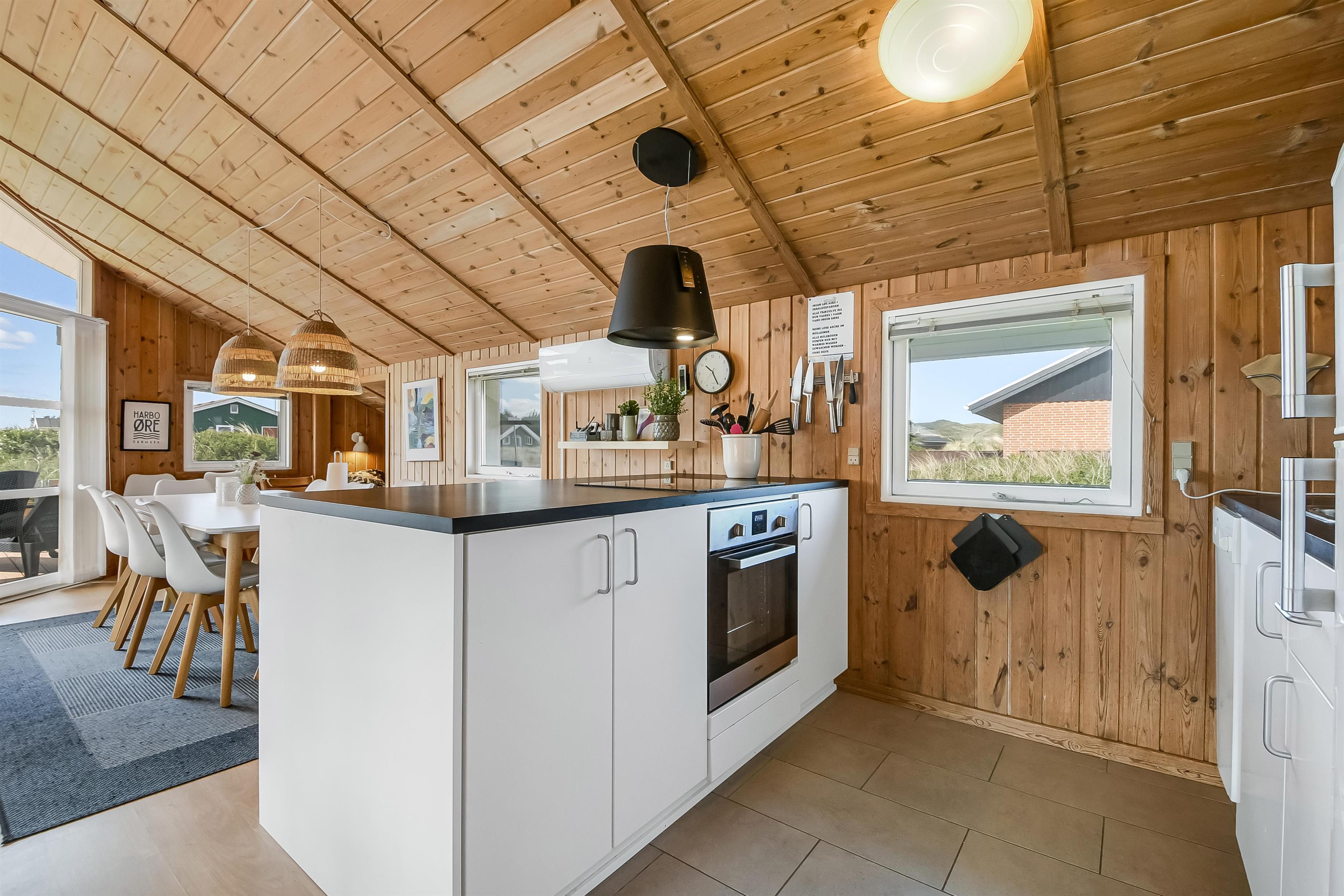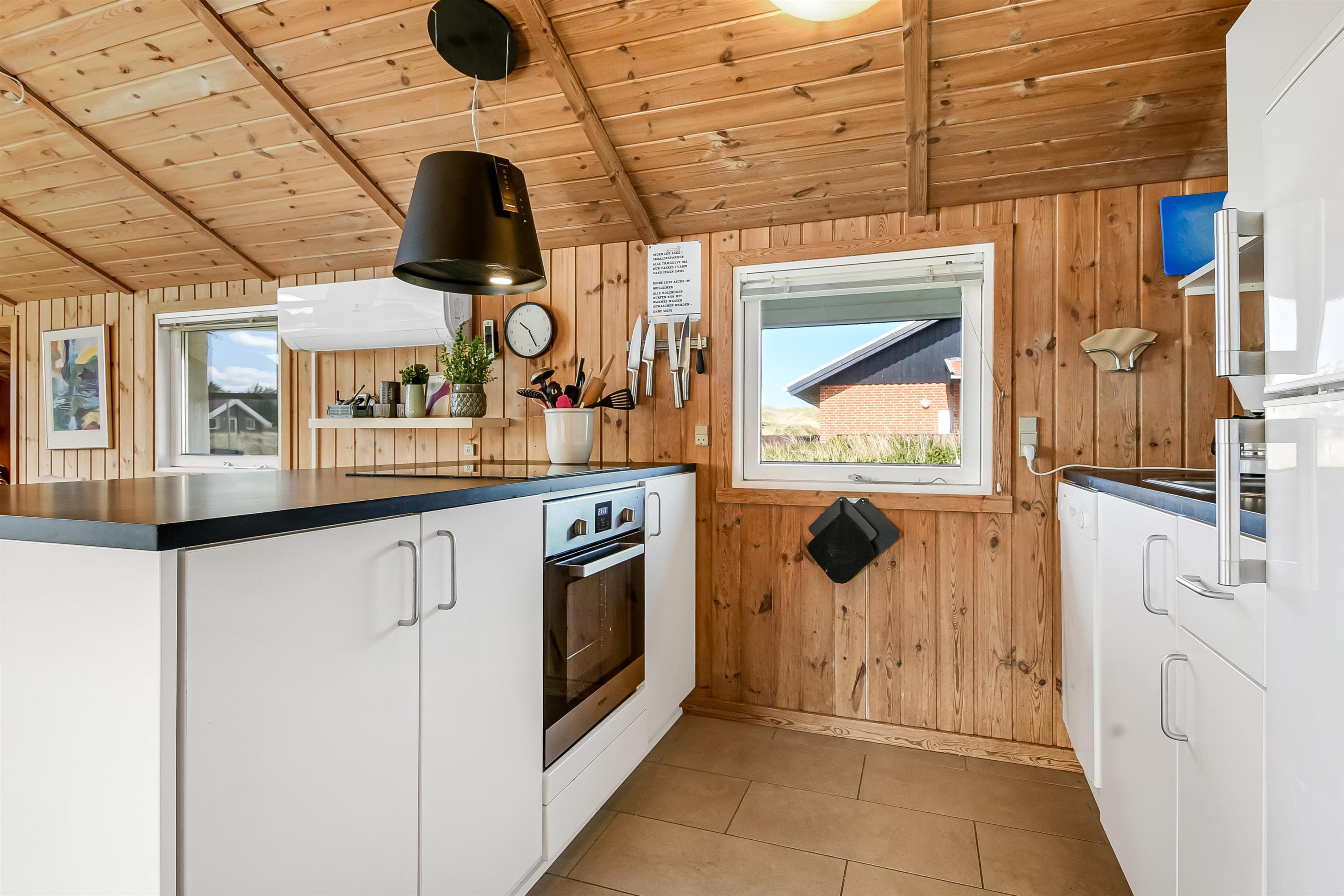 Die Küche und der Wohnraum sind kombiniert und die Wände im Haus sind mit Holz verkleidet, damit Sie das Gefül der Natur im ganzen Haus bekommen. Die Küche ist mit Abzugshaube, Herd mit Cerankochfeld, eingebautem Ofen, Kühl-/Gefrierschrank, Mikrowelle und Geschirrspüler ausgestattet. Im Wohnraum gibt es eine Sofagruppe, Esstisch,Kaminofen der zusammen mit der Wärmepumpe für niedrige Nebenkosten sorgt. Die Unterhaltung können Sie vom DVD-Spieler, der Stereoanlage mit CD und dem Fernseher mit DR 1, TV2 und deutschen Programmen bekommen. Am Ende des Wohnraums befinden sich grössere Fensterbereiche, die den Blick auf die Umgebung gewährleisten. Es gibt auch einen Ausgang vom Wohnraum, der zur Südterrasse führt. Es gibt 2 Badezimmer im Haus, eines davon ist mit Dusche, Toilette und Waschbecken, das andere hat Dusche, Waschbecken, Toilette, Sauna und Whirlpool. Es gibt Fussbodenheizung und Waschmaschine. Im Haus gibt es 4 Schlafräume: 1DB + 1DB + 1DB +1Schlafcoucht. Ausserdem gibt es 2 Schlafmöglichkeiten im Alkoven im Wohnraum.