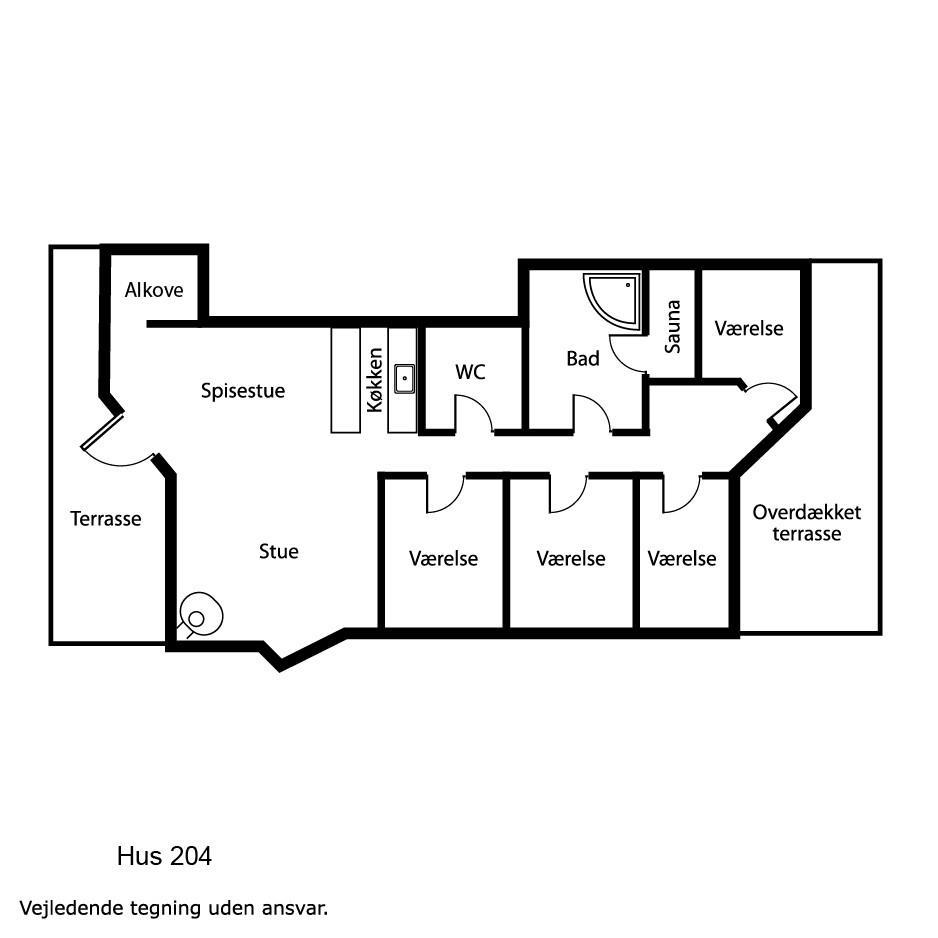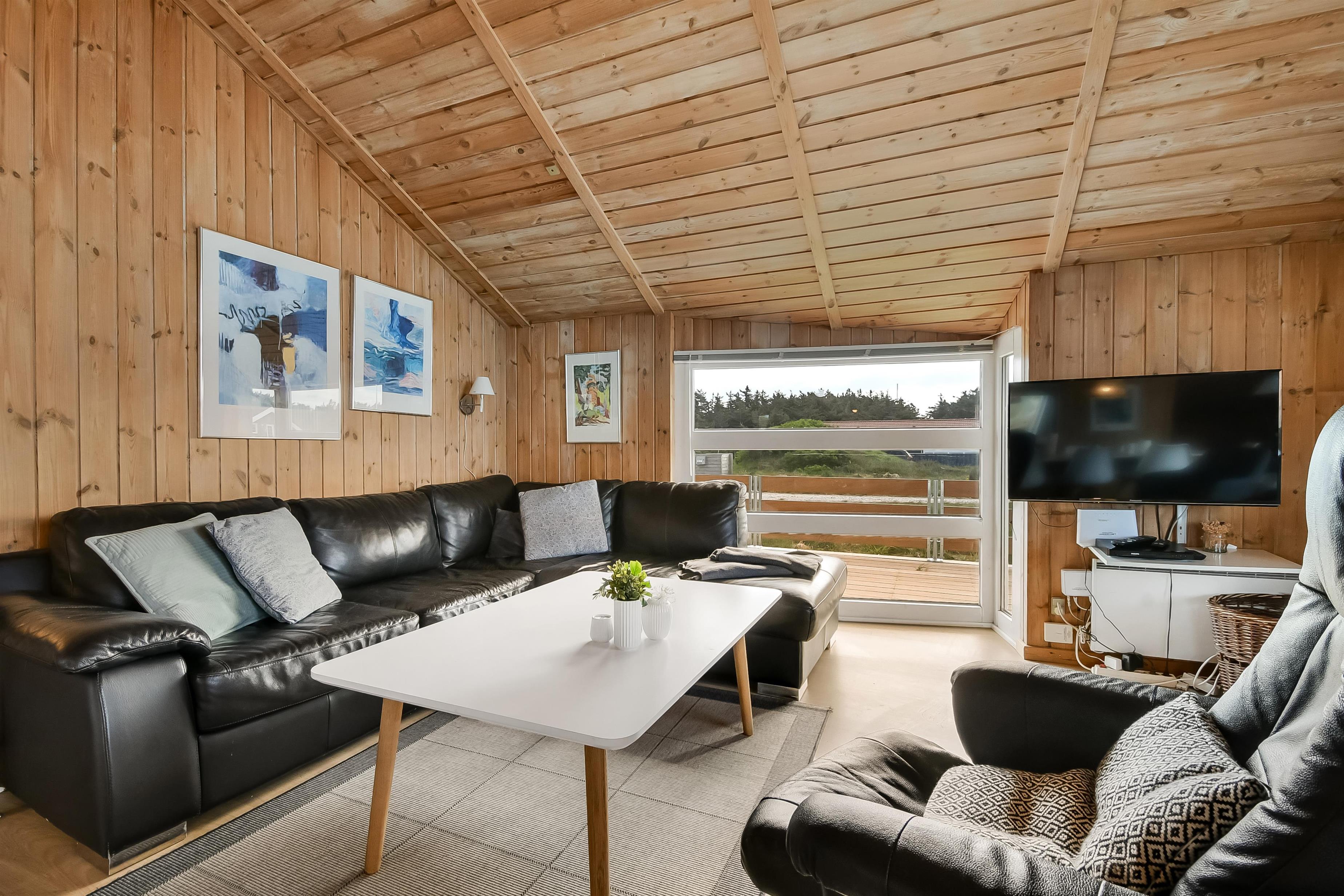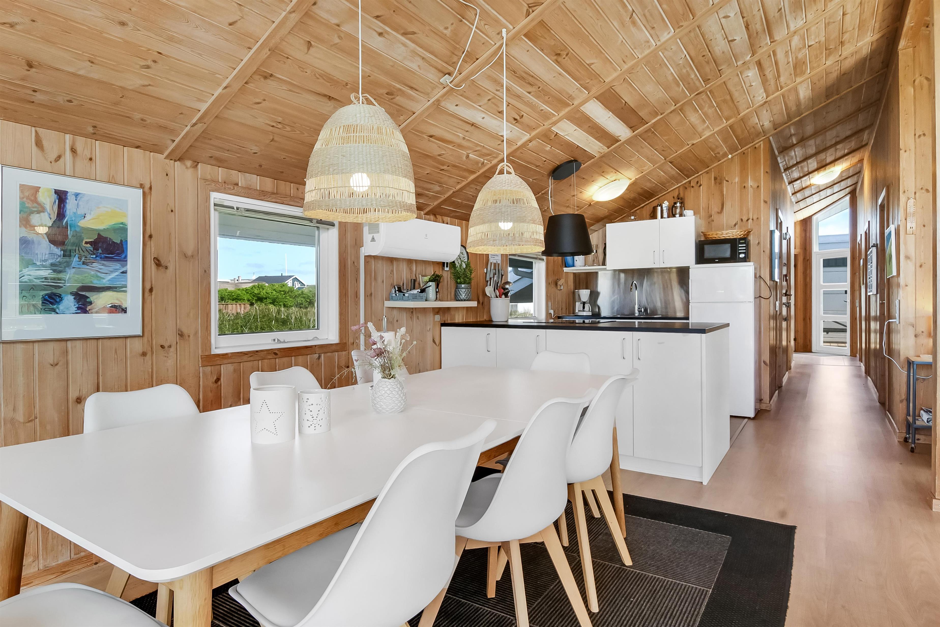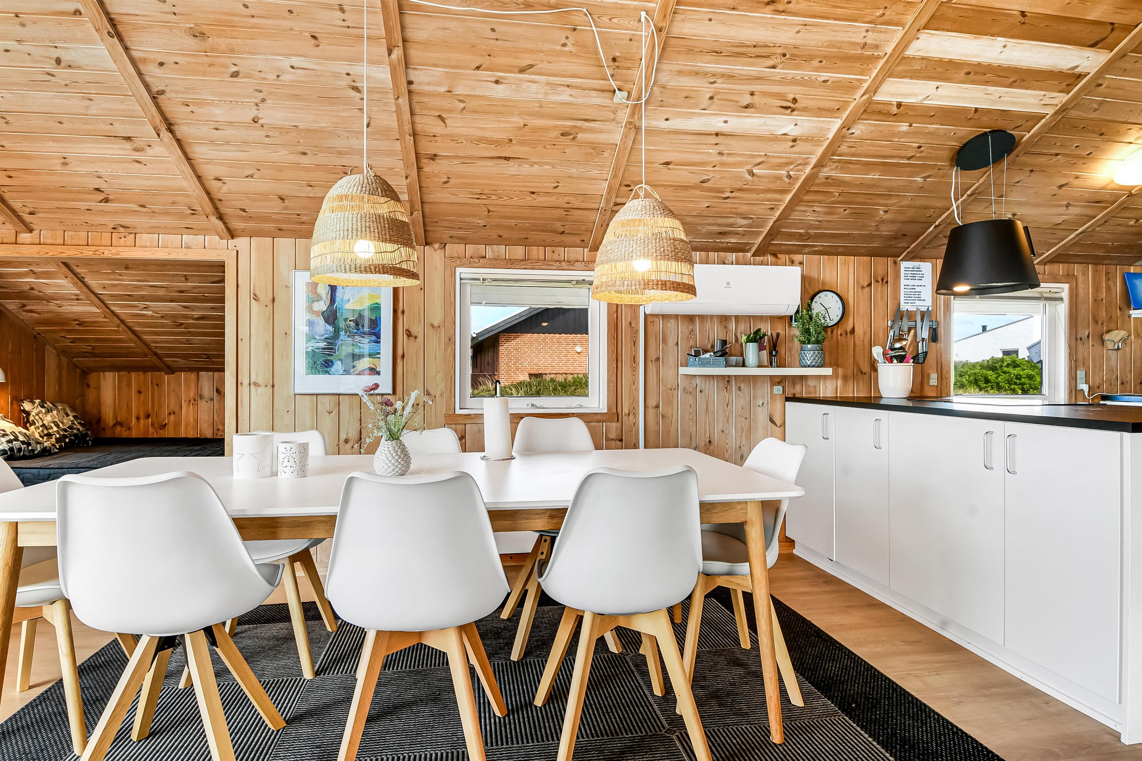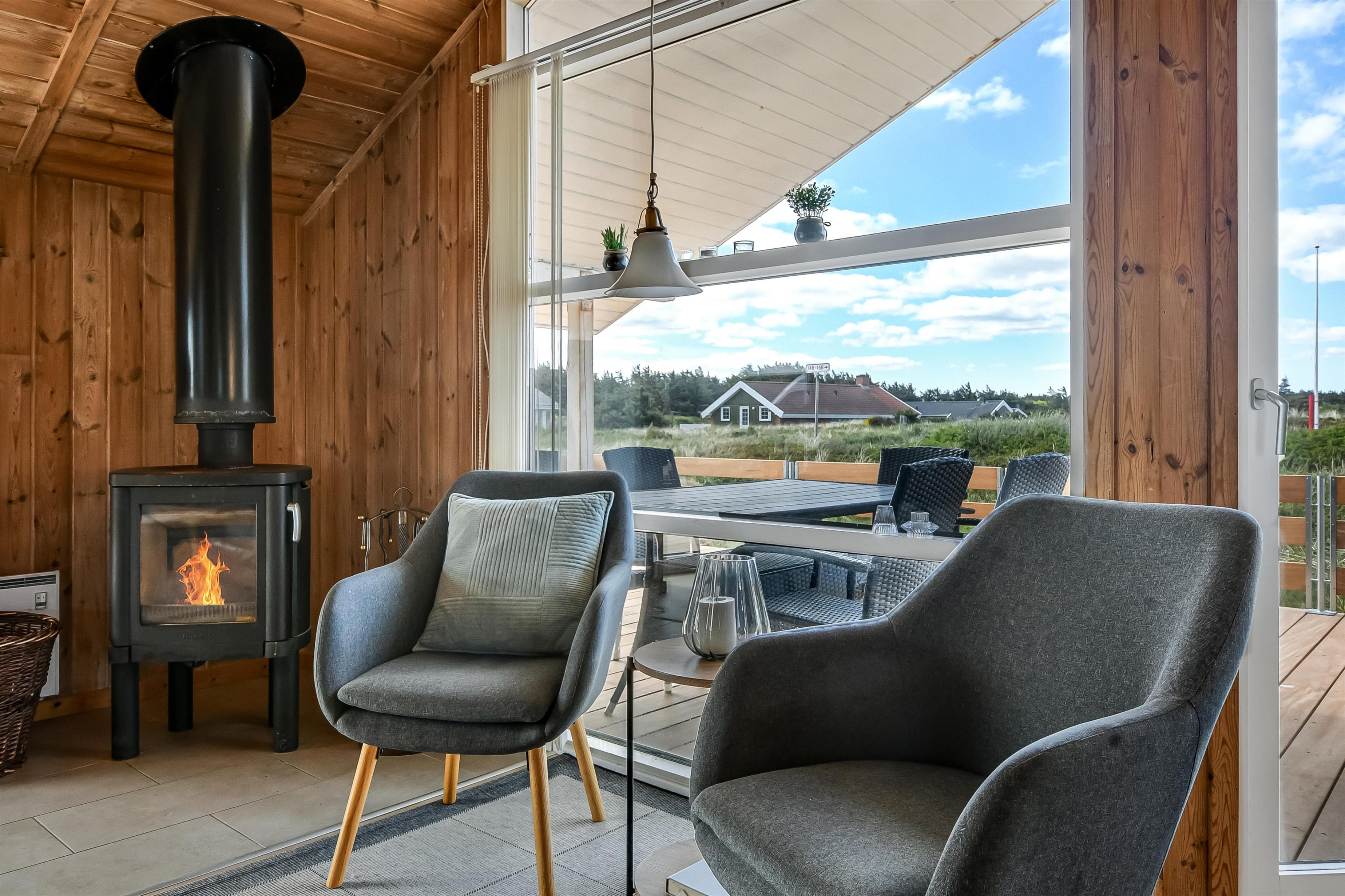 Die Küche und der Wohnraum sind kombiniert und die Wände im Haus sind mit Holz verkleidet, damit Sie das Gefül der Natur im ganzen Haus bekommen. Die Küche ist mit Abzugshaube, Herd mit Cerankochfeld, eingebautem Ofen, Kühl-/Gefrierschrank, Mikrowelle und Geschirrspüler ausgestattet. Im Wohnraum gibt es eine Sofagruppe, Esstisch,Kaminofen der zusammen mit der Wärmepumpe für niedrige Nebenkosten sorgt. Die Unterhaltung können Sie vom DVD-Spieler, der Stereoanlage mit CD und dem Fernseher mit DR 1, TV2 und deutschen Programmen bekommen. Am Ende des Wohnraums befinden sich grössere Fensterbereiche, die den Blick auf die Umgebung gewährleisten. Es gibt auch einen Ausgang vom Wohnraum, der zur Südterrasse führt. Es gibt 2 Badezimmer im Haus, eines davon ist mit Dusche, Toilette und Waschbecken, das andere hat Dusche, Waschbecken, Toilette, Sauna und Whirlpool. Es gibt Fussbodenheizung und Waschmaschine. Im Haus gibt es 4 Schlafräume: 1DB + 1DB + 1DB +1Schlafcoucht. Ausserdem gibt es 2 Schlafmöglichkeiten im Alkoven im Wohnraum.