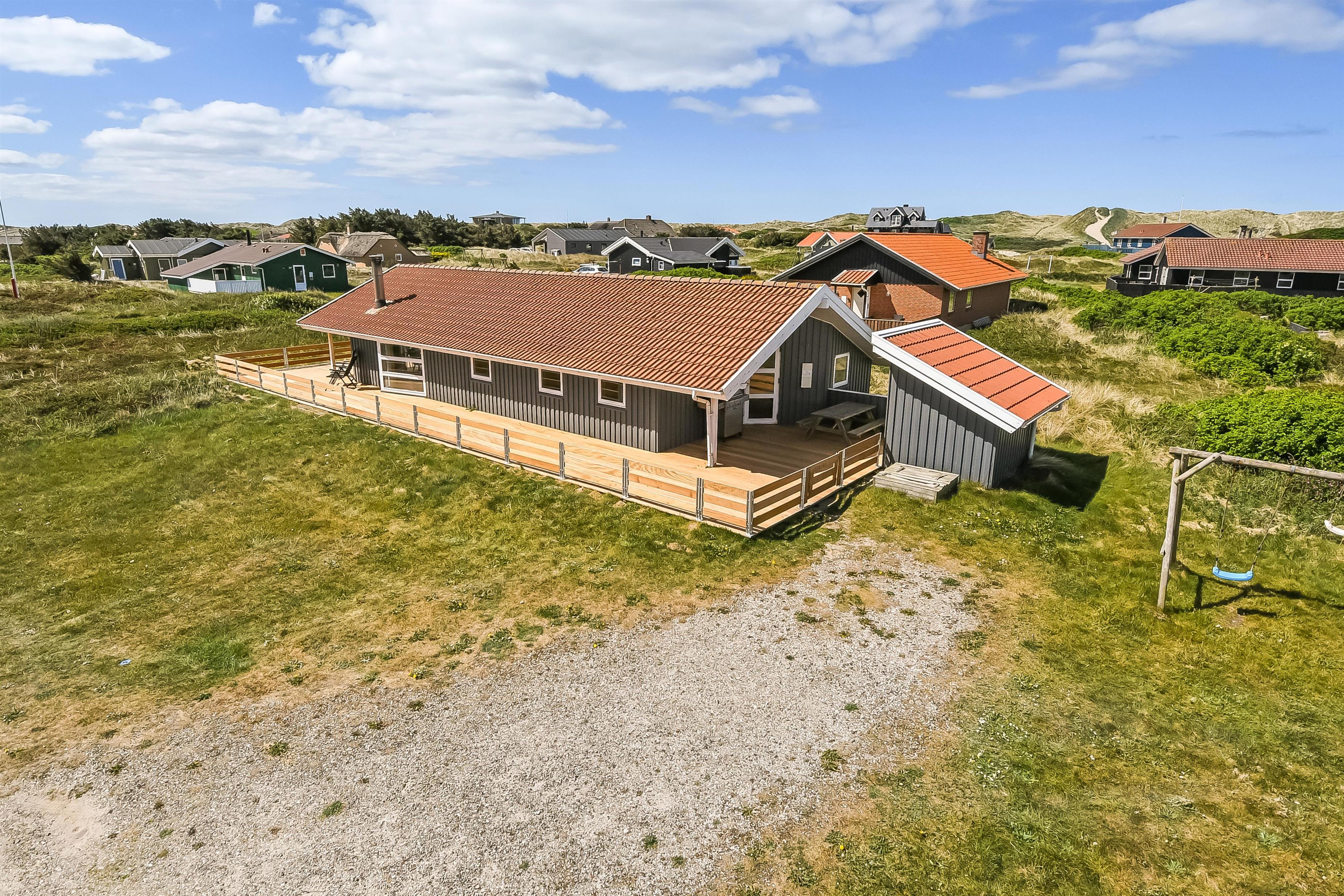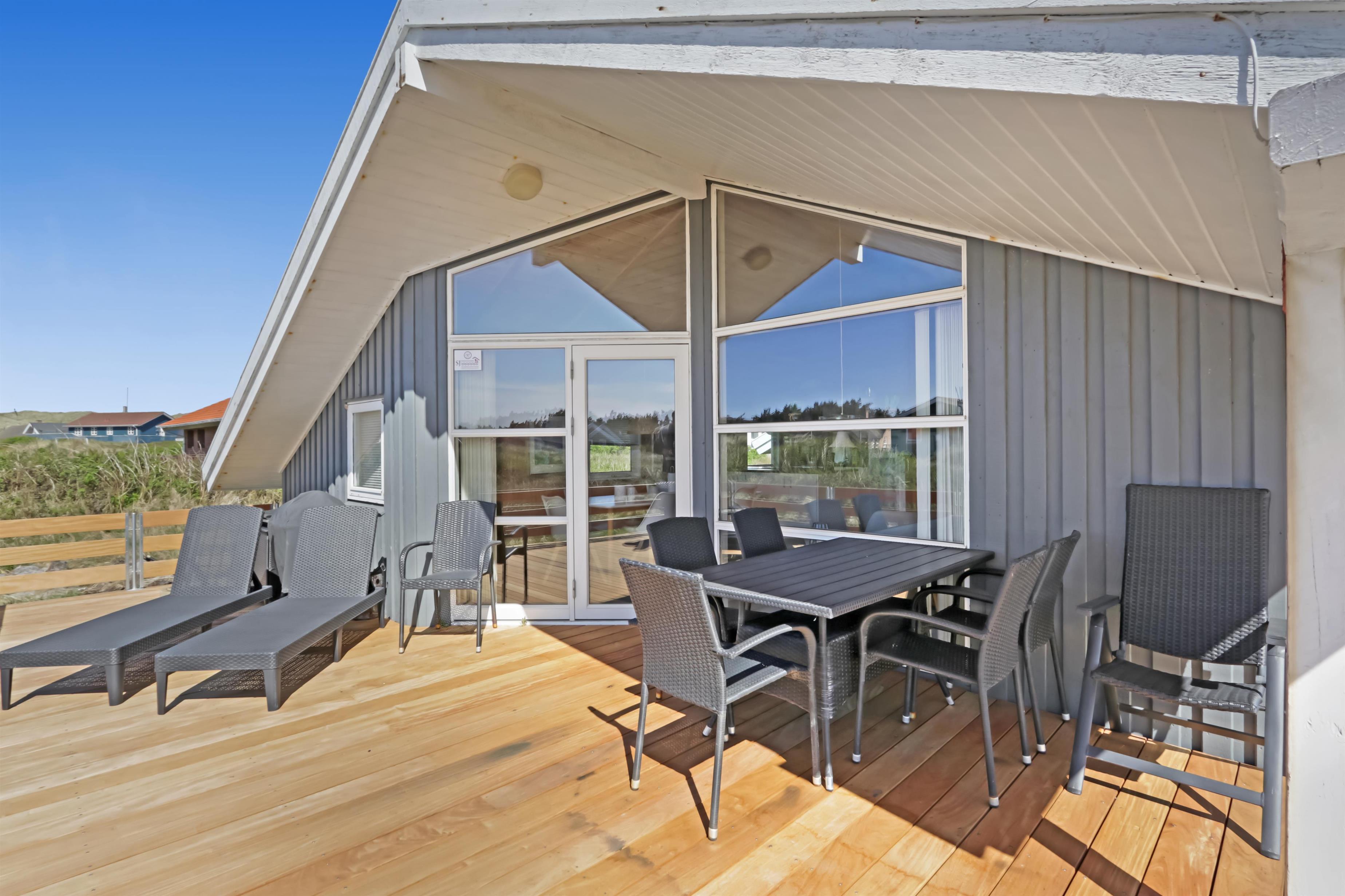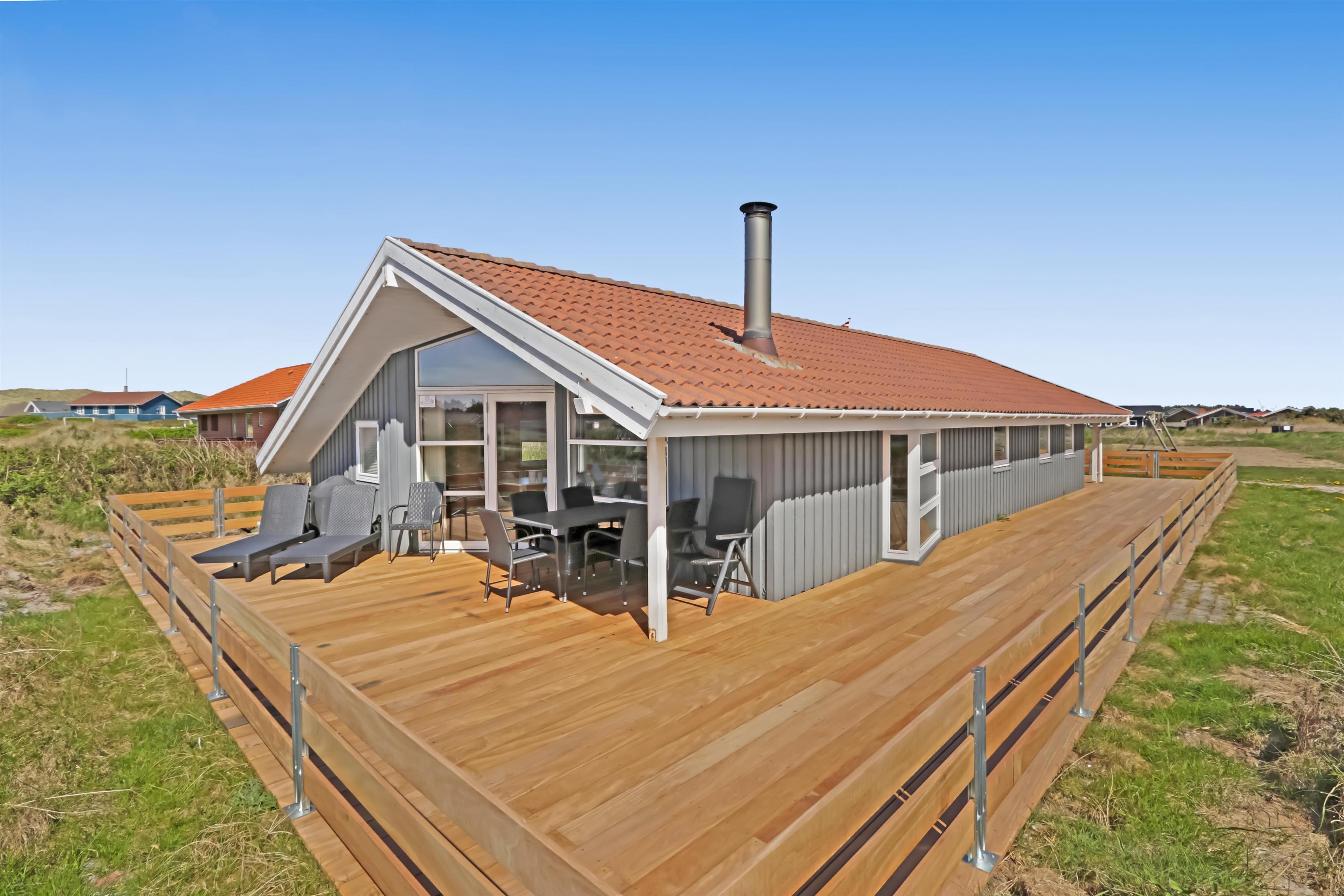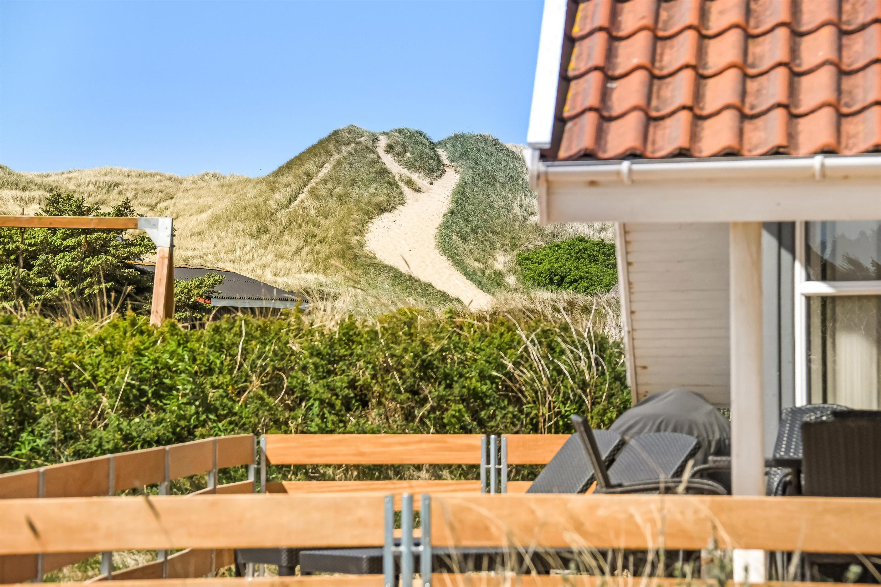 Um das Haus herum gibt es eine schöne grosse Terrasse mit 88 m². Hier gibt es Gartenmöbel, Grill und 2 Sonnenliegen, so sind die Grundbestandteile vieler angenehmer Stunden definitiv vorhanden. Für die Kinder gibt es Schaukel und Sandkasten auf dem Grundstück, hier können die Kinder Spass haben und die Erwachsenen können es sich auf der Terrasse gemütlich machen. Wenn Sie sich bewegen wollen, sind die Dünen und das Meer fast vor der Tür und wenn Sie die 170 m bis zum Meer über die Dünen laufen, befinden Sie sich sofort in einer ganz anderen Welt, in der Sie schwimmen, wandern, Sandburgen bauen, Drachen fliegen lassen oder angeln können.
