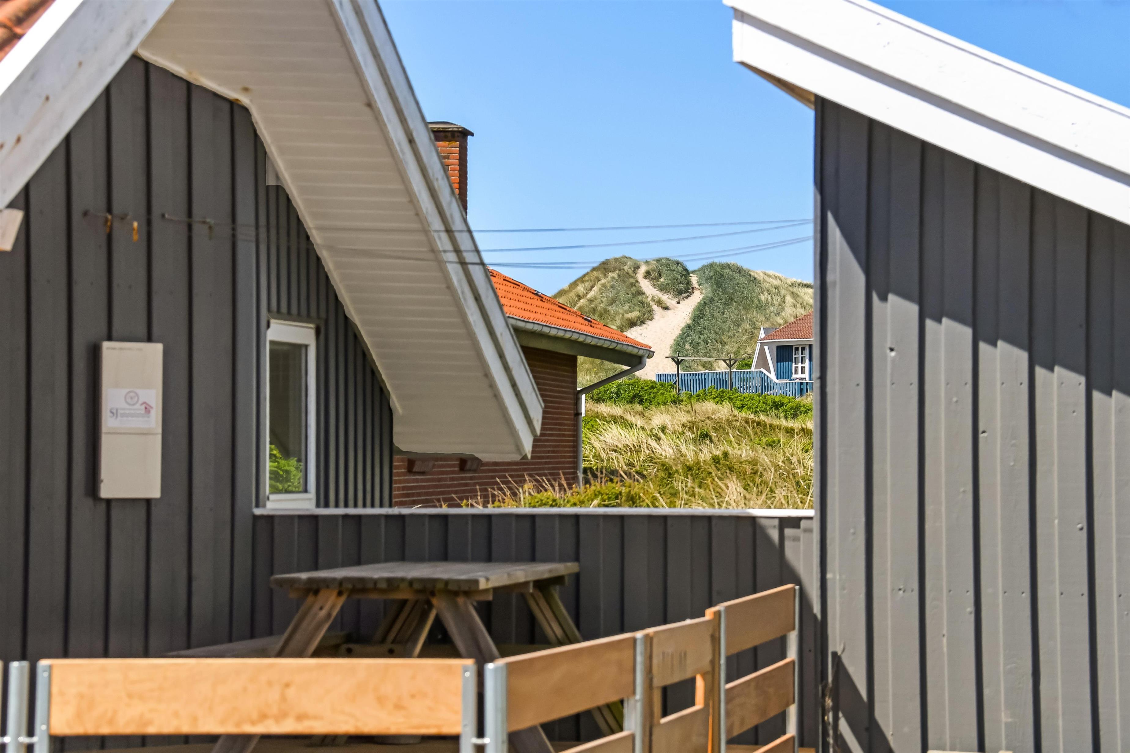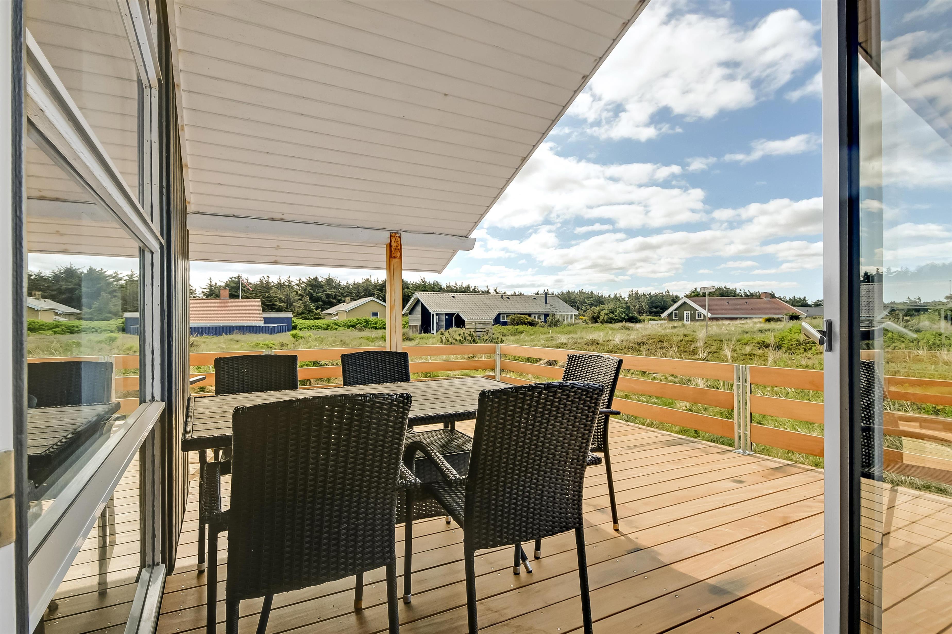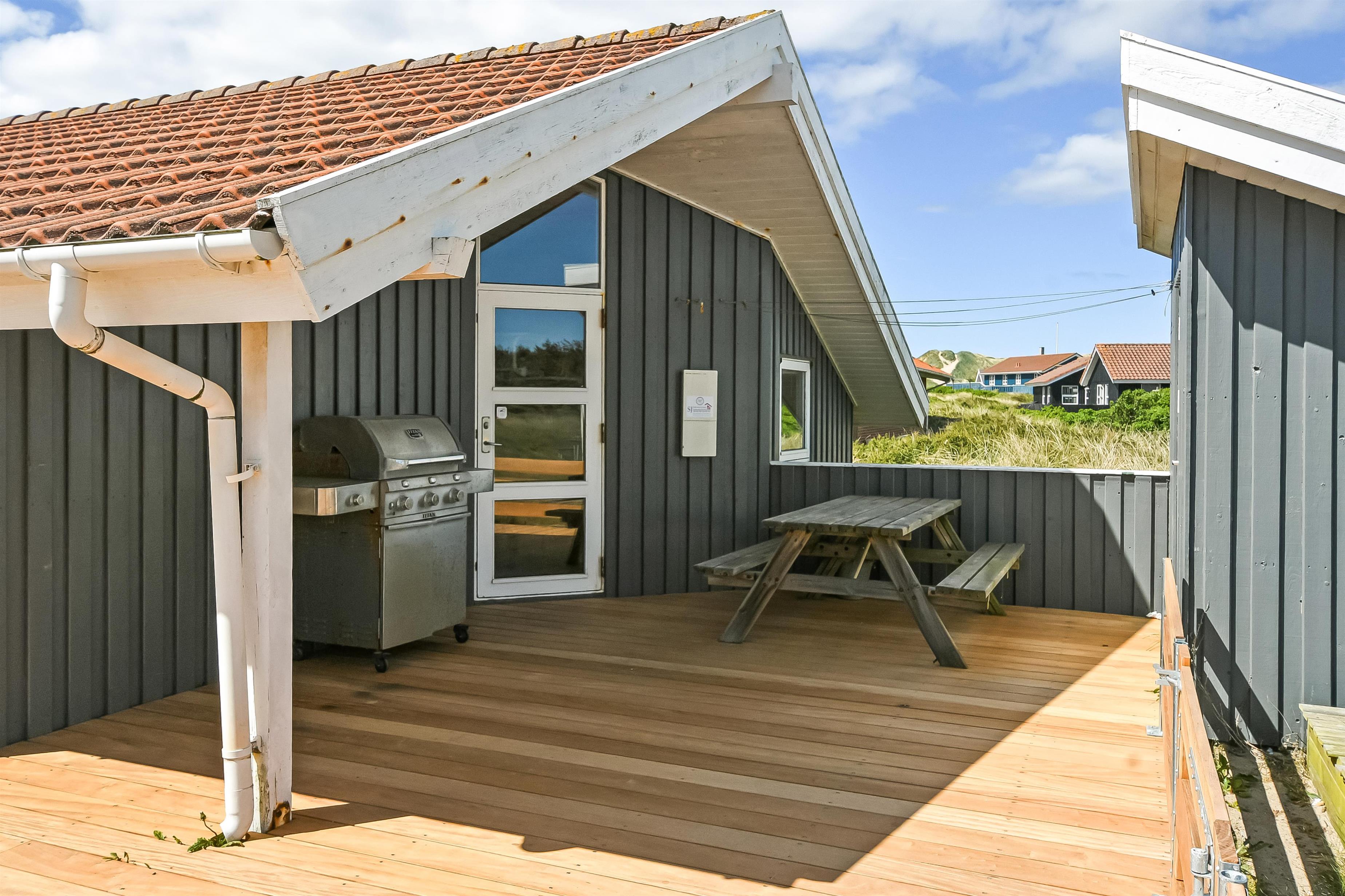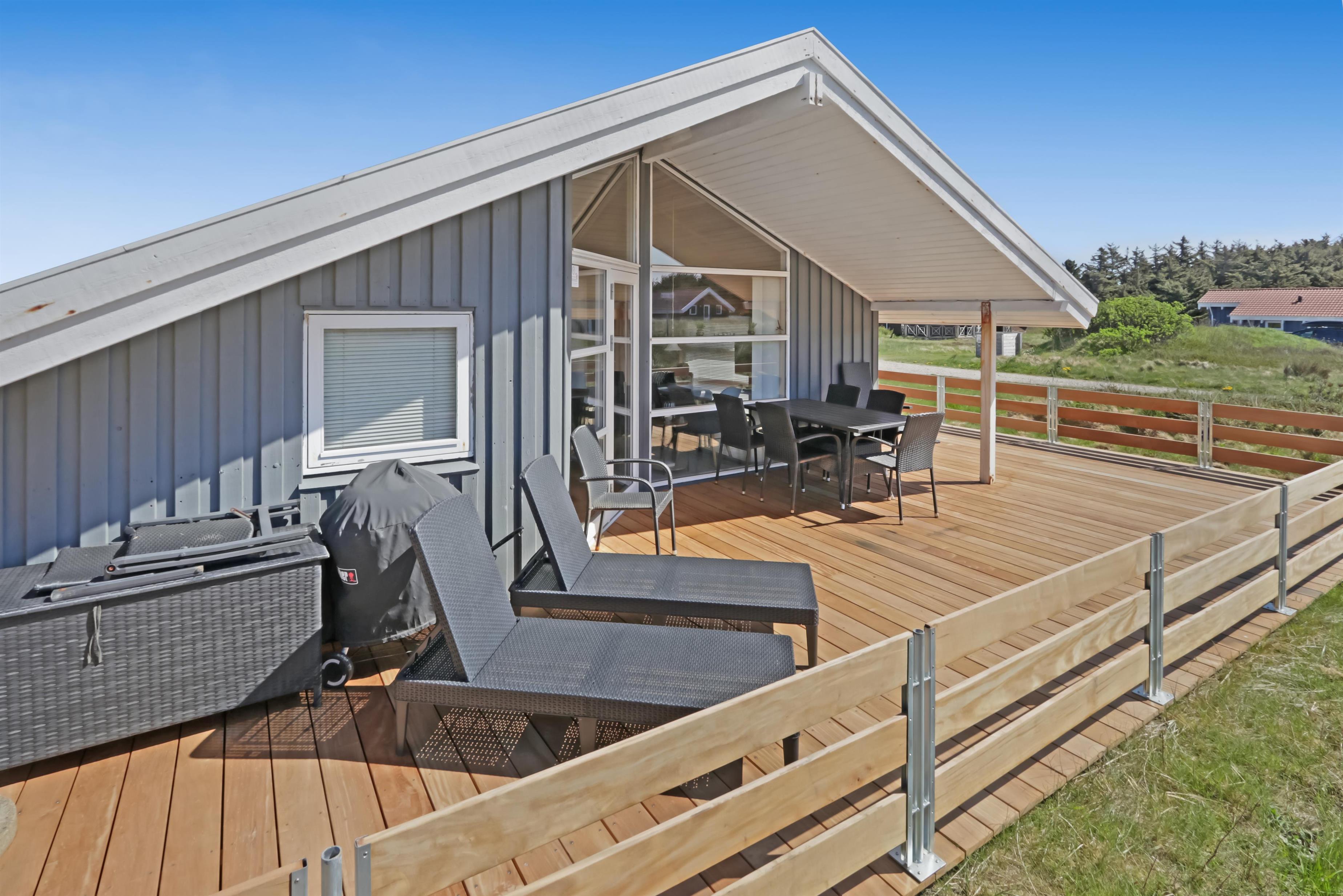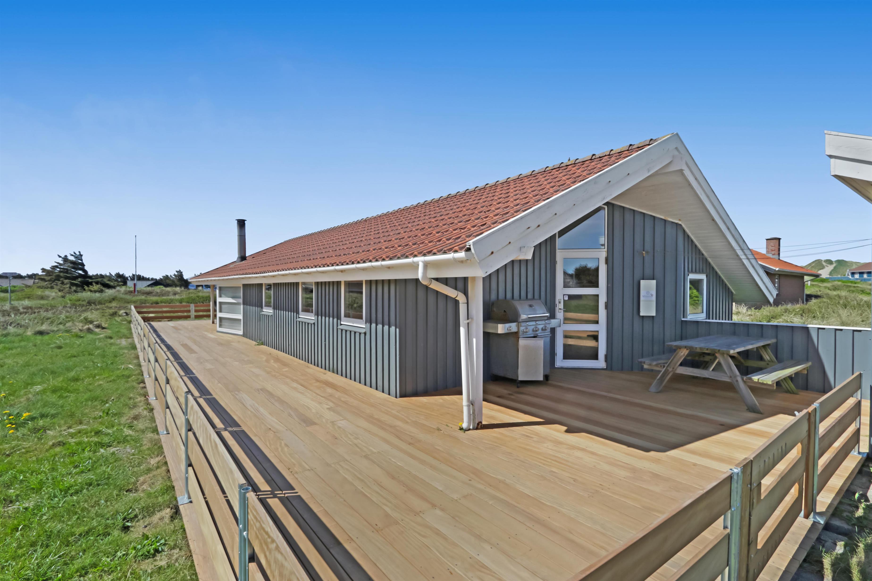 Um das Haus herum gibt es eine schöne grosse Terrasse mit 88 m². Hier gibt es Gartenmöbel, Grill und 2 Sonnenliegen, so sind die Grundbestandteile vieler angenehmer Stunden definitiv vorhanden. Für die Kinder gibt es Schaukel und Sandkasten auf dem Grundstück, hier können die Kinder Spass haben und die Erwachsenen können es sich auf der Terrasse gemütlich machen. Wenn Sie sich bewegen wollen, sind die Dünen und das Meer fast vor der Tür und wenn Sie die 170 m bis zum Meer über die Dünen laufen, befinden Sie sich sofort in einer ganz anderen Welt, in der Sie schwimmen, wandern, Sandburgen bauen, Drachen fliegen lassen oder angeln können.