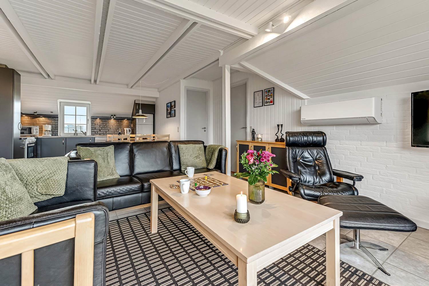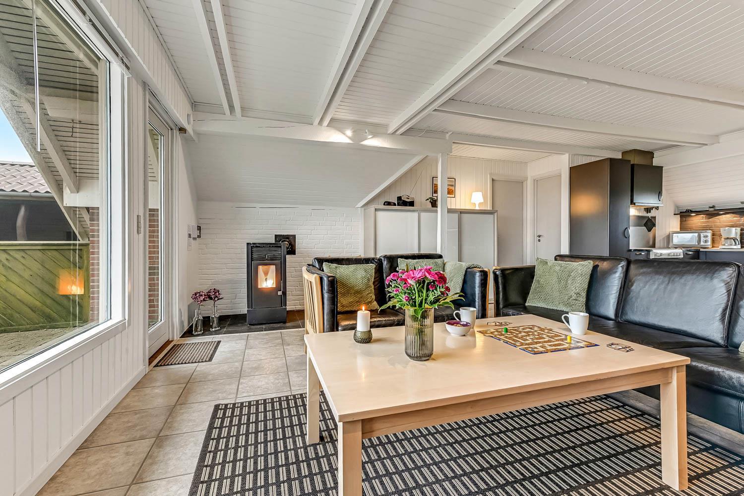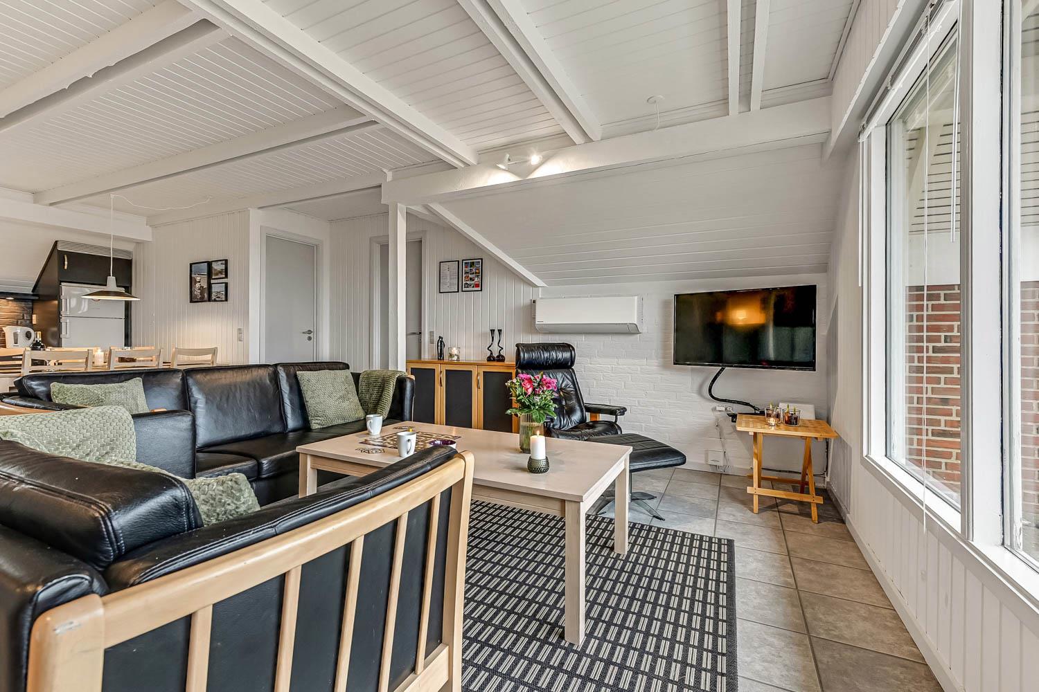 Das Wohnzimmer lädt zu gemütlichen Abenden ein und ist mit komfortablen Möbeln ausgestattet. Hier finden Sie einen Fernseher mit dänischen Sendern (DR ) sowie deutschen Programmen über Satellit. Zusätzlich gibt es Chromecast, sodass Sie Ihre eigenen Streaming-Abonnements nutzen können, sowie Bluetooth-Lautsprecher, damit Sie Ihre Lieblingsmusik im Urlaub genießen können. Natürlich steht auch kostenloses WLAN zur Verfügung. Vom Wohnraum haben Sie ein schönen Blick zu die Dünen. An kühleren Tagen sorgen eine energieeffiziente Wärmepumpe und der gemütliche Pelletofen für angenehme Wärme und eine besonders behagliche Atmosphäre.