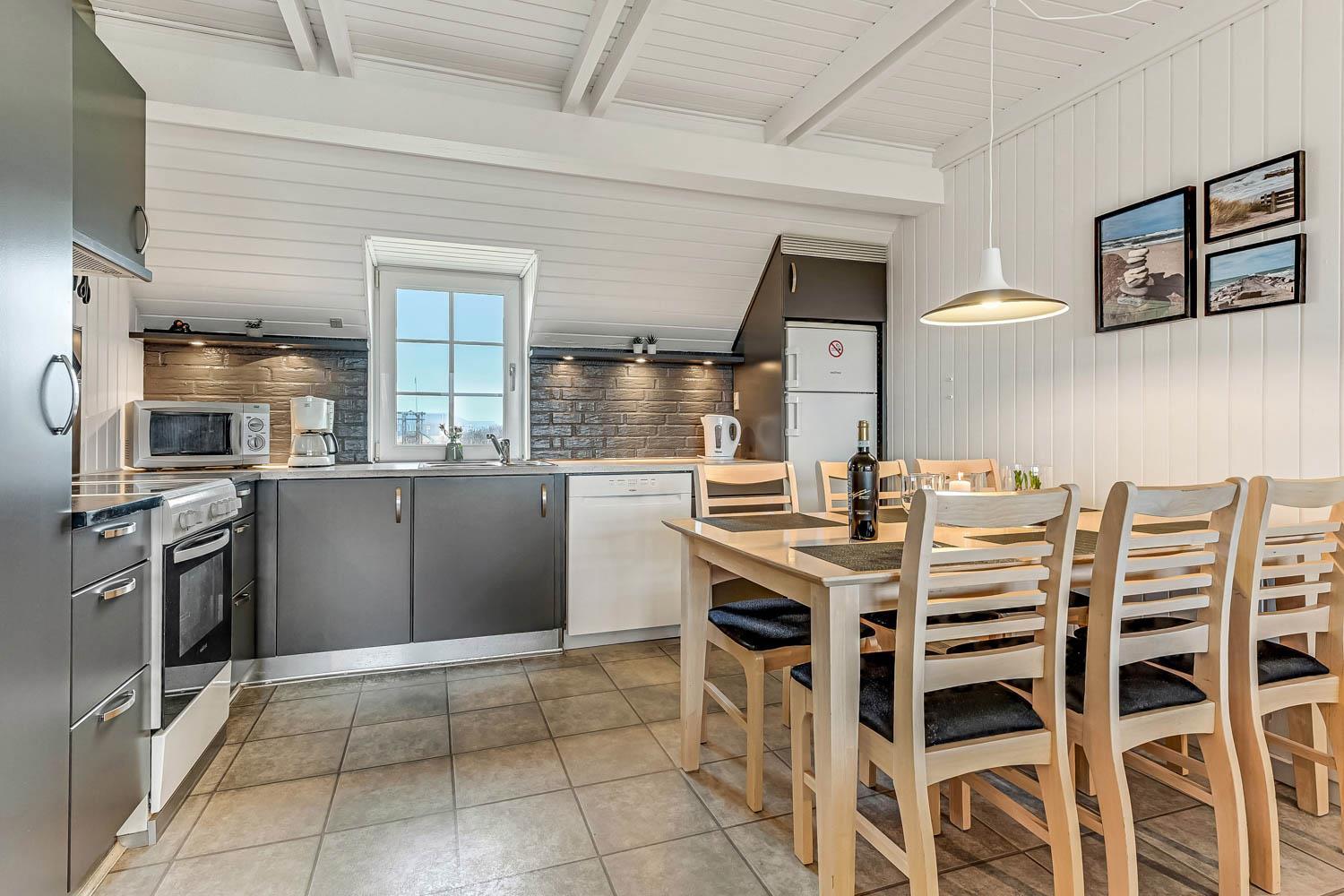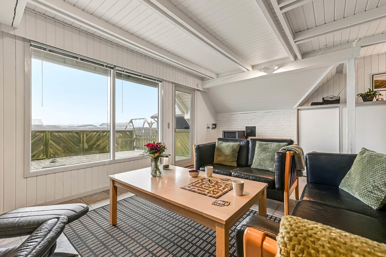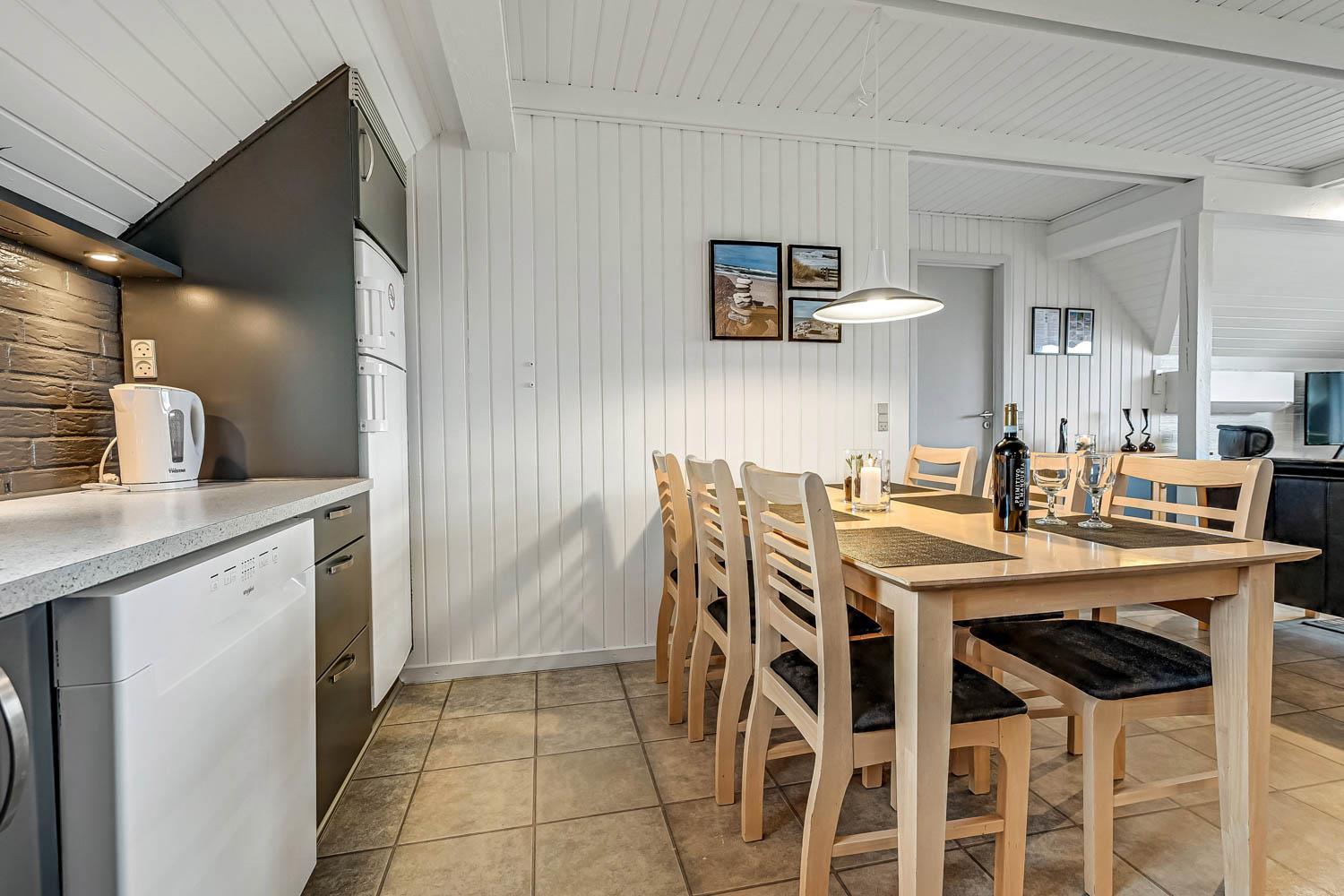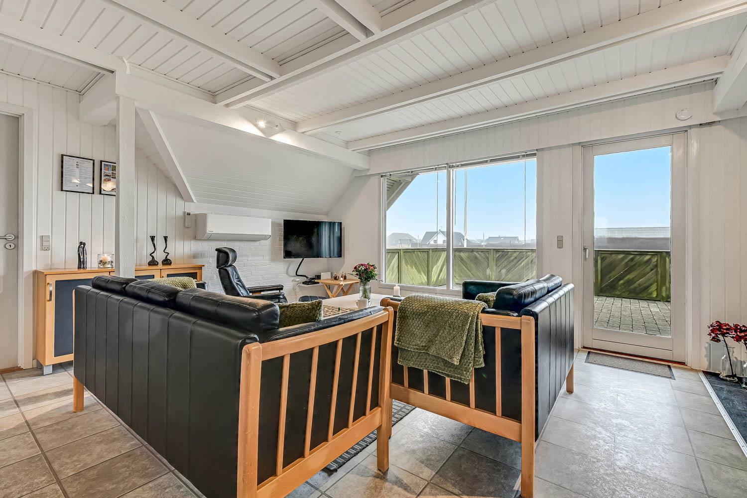 Das Wohnzimmer lädt zu gemütlichen Abenden ein und ist mit komfortablen Möbeln ausgestattet. Hier finden Sie einen Fernseher mit dänischen Sendern (DR ) sowie deutschen Programmen über Satellit. Zusätzlich gibt es Chromecast, sodass Sie Ihre eigenen Streaming-Abonnements nutzen können, sowie Bluetooth-Lautsprecher, damit Sie Ihre Lieblingsmusik im Urlaub genießen können. Natürlich steht auch kostenloses WLAN zur Verfügung. Vom Wohnraum haben Sie ein schönen Blick zu die Dünen. An kühleren Tagen sorgen eine energieeffiziente Wärmepumpe und der gemütliche Pelletofen für angenehme Wärme und eine besonders behagliche Atmosphäre.