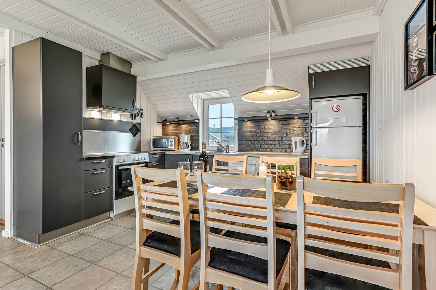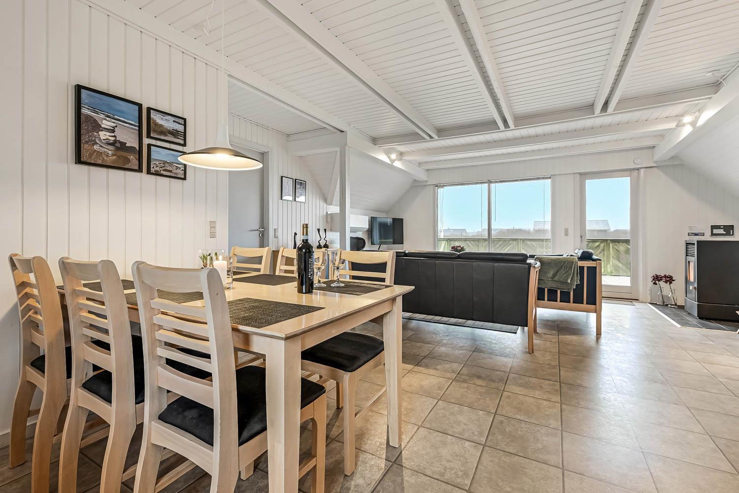 Schon beim Betreten des Hauses empfängt Sie eine warme und angenehme Atmosphäre. Die schönen Holzdecken, die hellen Räume und die großen Fenster sorgen für viel Tageslicht und eine gemütliche Urlaubsstimmung. Der Wohnbereich ist offen gestaltet und verbindet Küche, Essbereich und Wohnzimmer, sodass die ganze Familie zusammen sein kann – egal ob beim Kochen, bei gemeinsamen Spielen am Tisch oder beim Entspannen auf dem Sofa.
