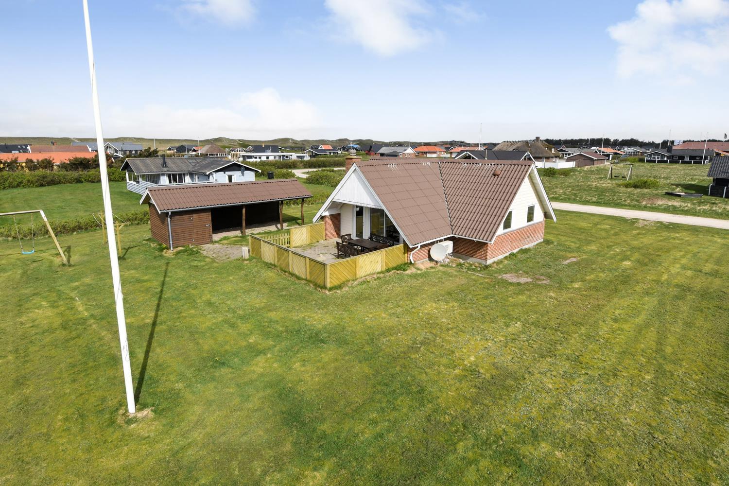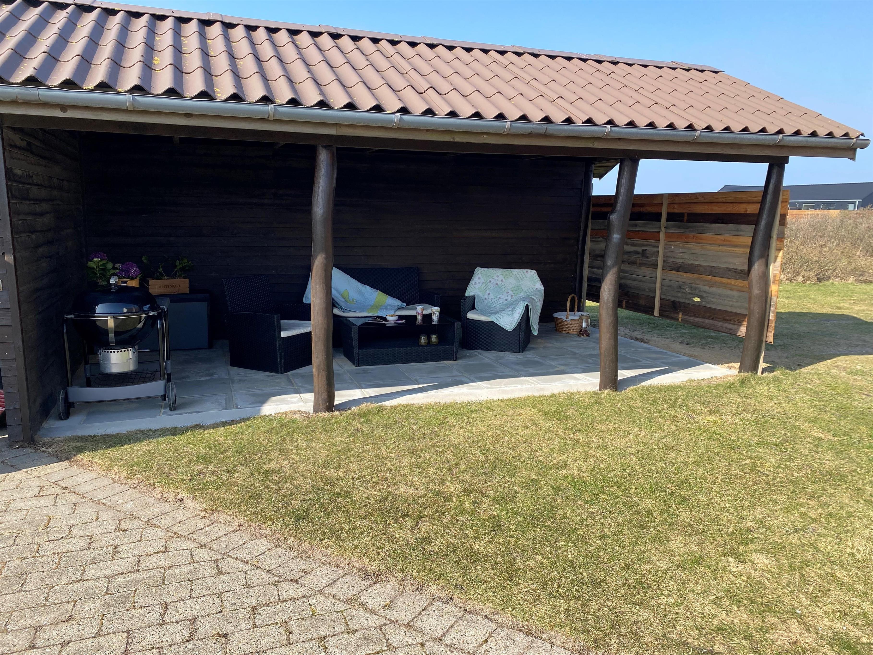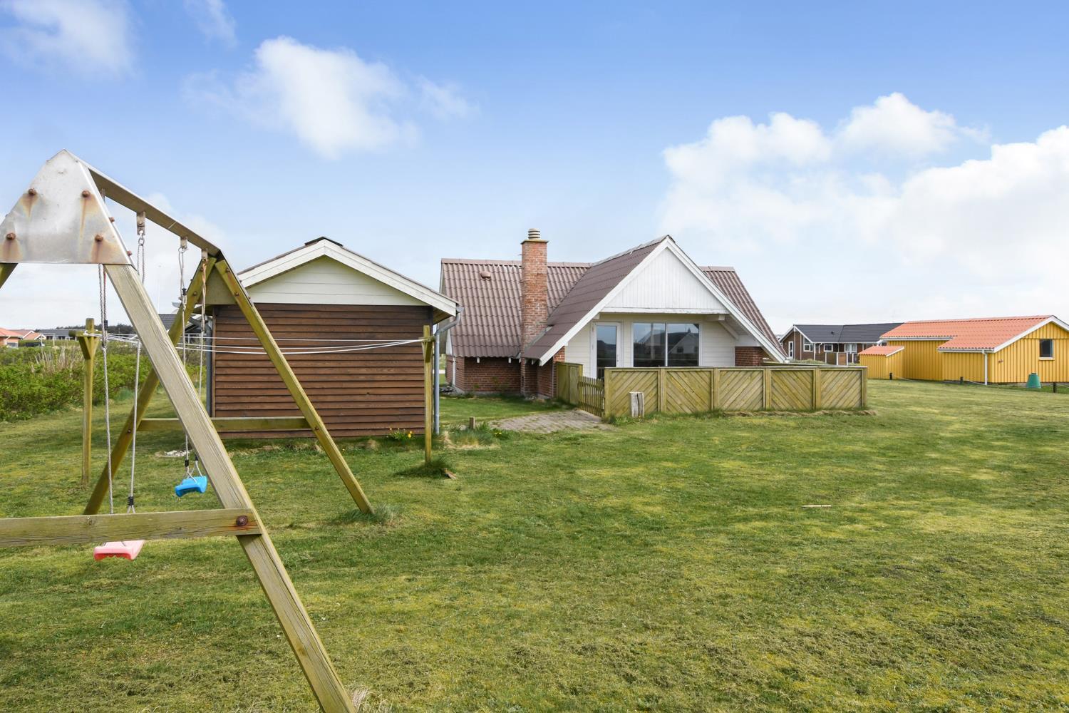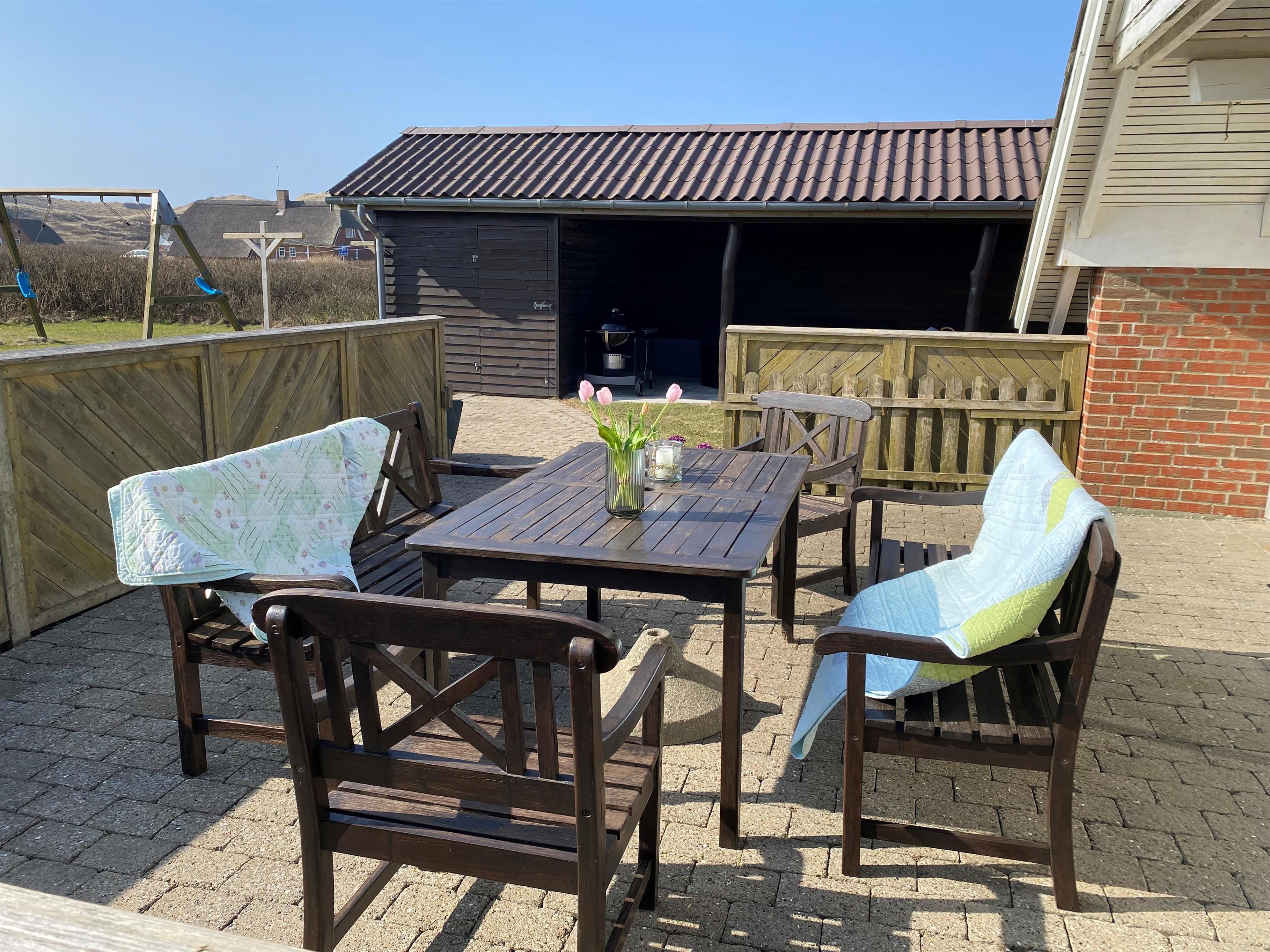Vom Wohnzimmer aus haben Sie direkten Zugang zu einer schönen Terrasse, auf der Sie die Sonne, die frische Meeresluft und lange Sommerabende genießen können. Die Terrasse ist eingezäunt und daher ideal für Kinder und Hunde. Hier stehen Gartenmöbel, Grill, Sonnenschirm und Liegestühle bereit – perfekt für den Morgenkaffee und gemütliche Grillabende. Außerdem haben Sie von der Terrasse aus einen schönen Blick auf die Dünen, und es gibt einen überdachten Loungebereich, in dem Sie geschützt vor Wind und Regen sitzen können. Für die Kinder gibt es Schaukeln.