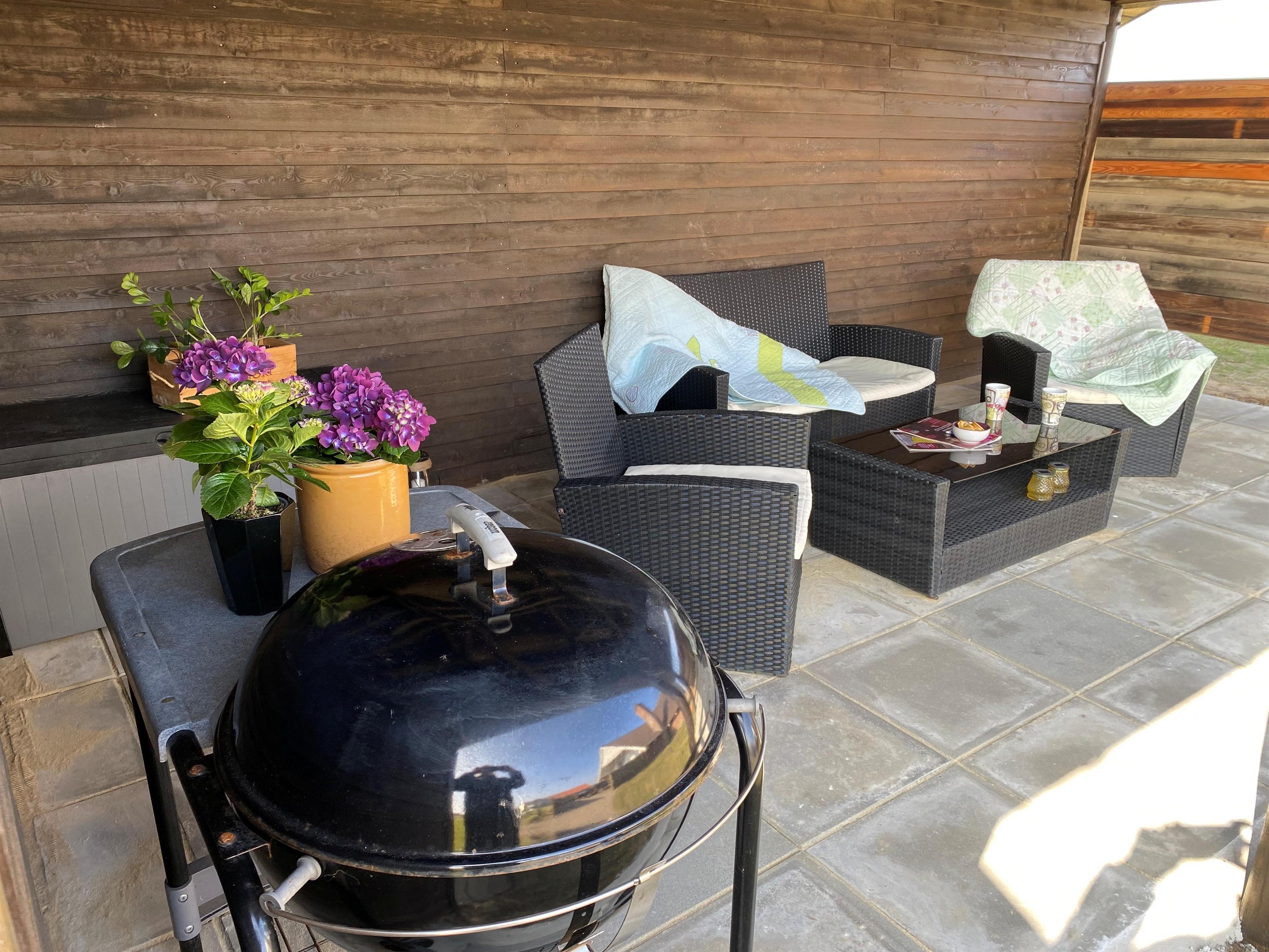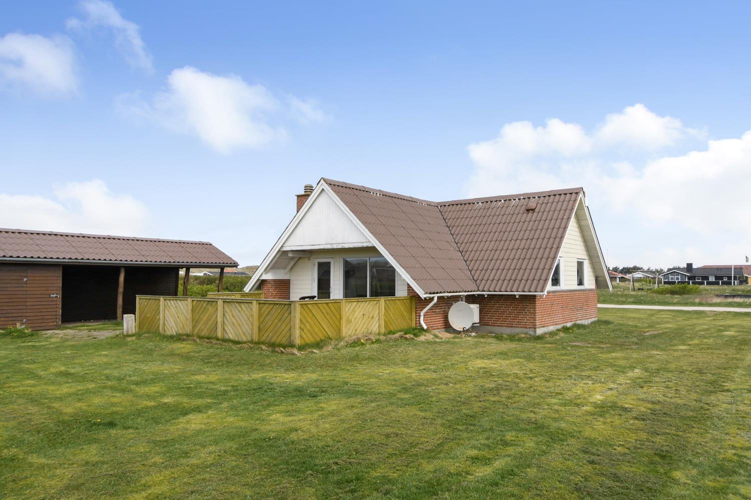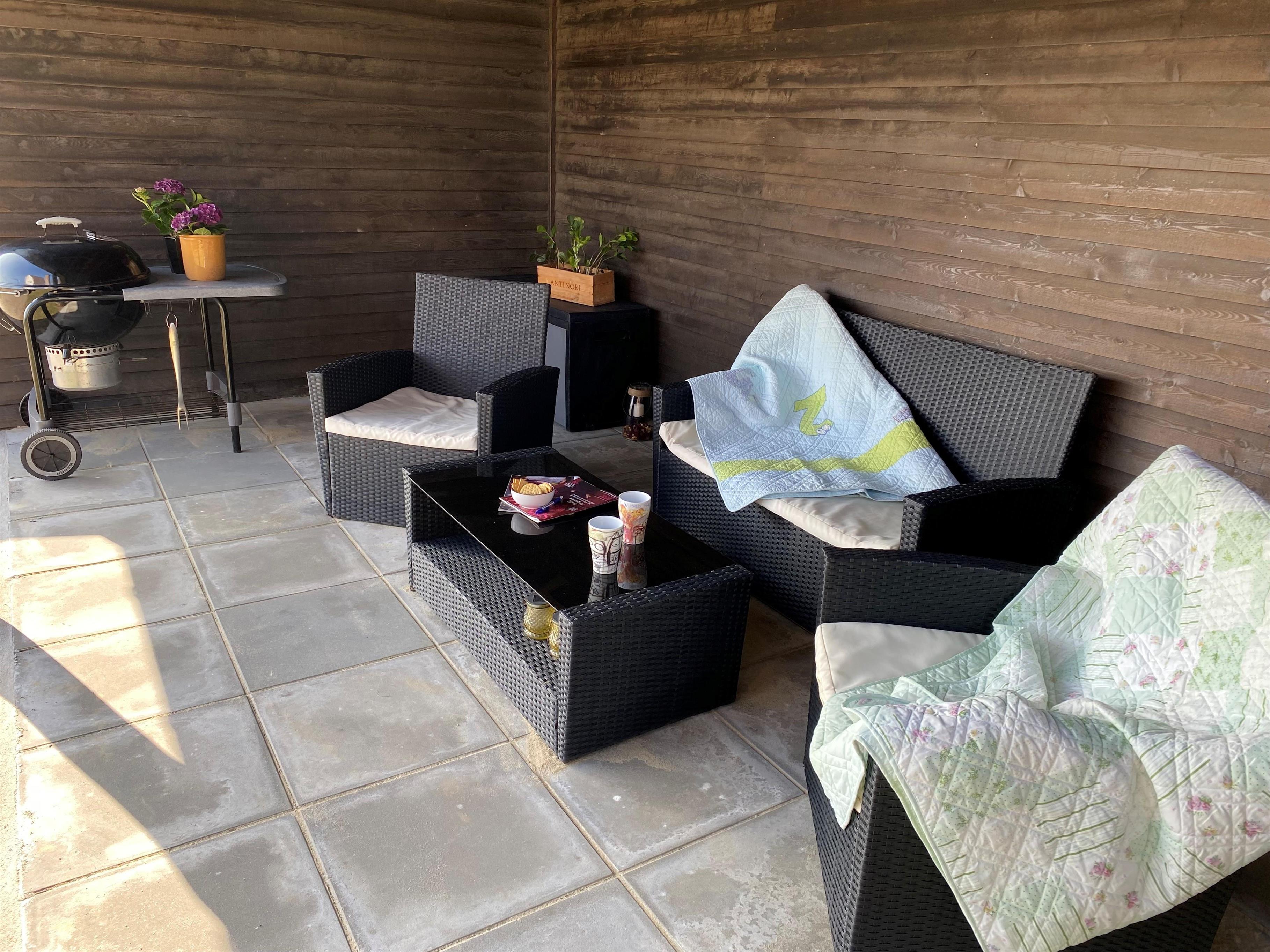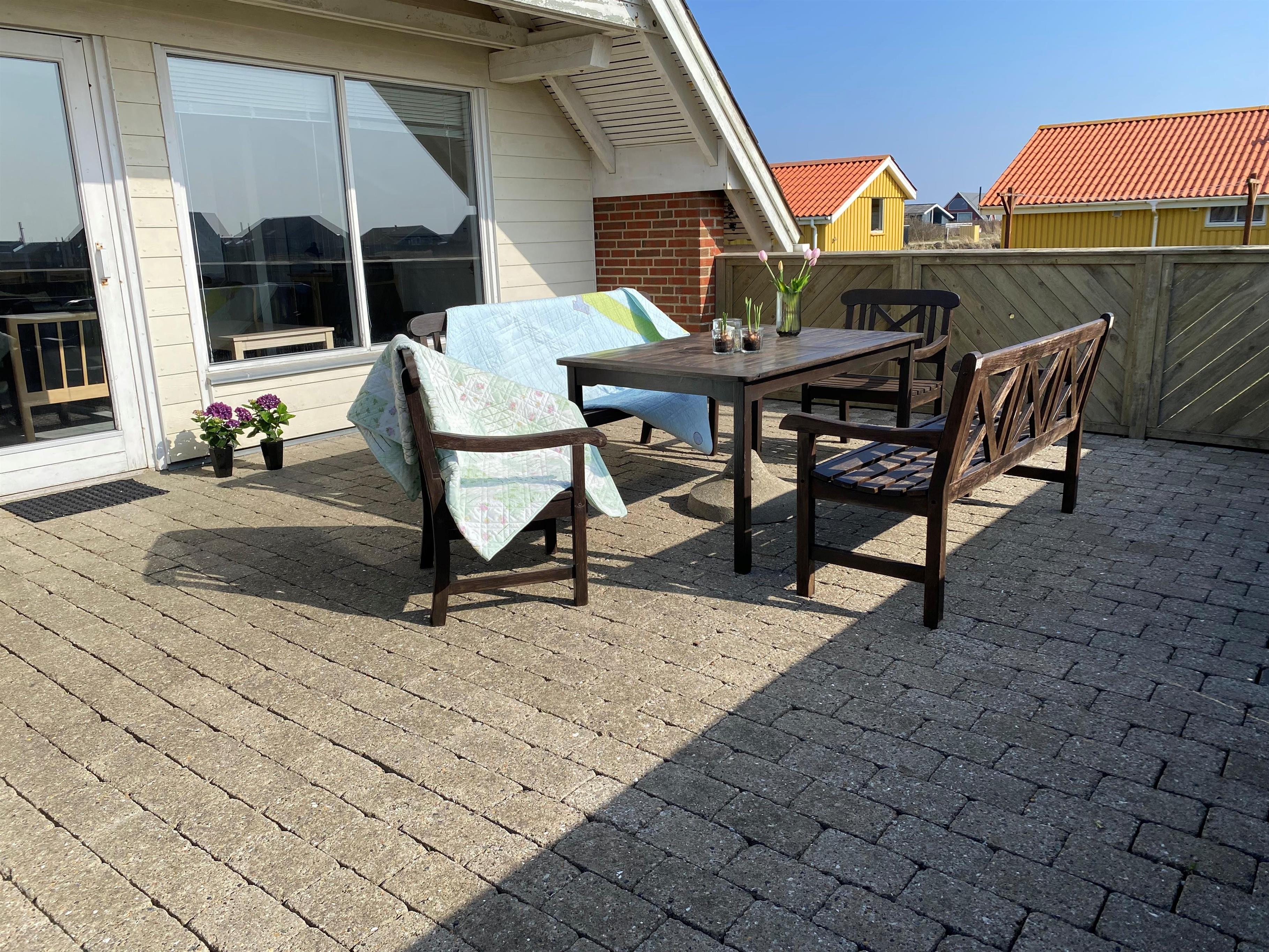 Vom Wohnzimmer aus haben Sie direkten Zugang zu einer schönen Terrasse, auf der Sie die Sonne, die frische Meeresluft und lange Sommerabende genießen können. Die Terrasse ist eingezäunt und daher ideal für Kinder und Hunde. Hier stehen Gartenmöbel, Grill, Sonnenschirm und Liegestühle bereit – perfekt für den Morgenkaffee und gemütliche Grillabende. Außerdem haben Sie von der Terrasse aus einen schönen Blick auf die Dünen, und es gibt einen überdachten Loungebereich, in dem Sie geschützt vor Wind und Regen sitzen können. Für die Kinder gibt es Schaukeln.