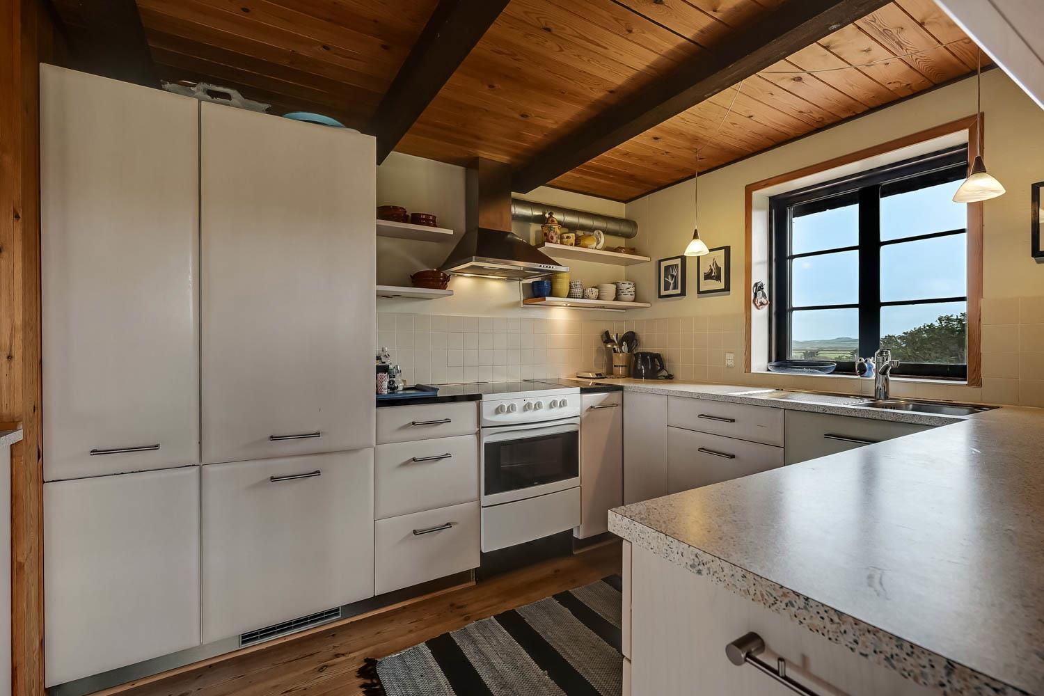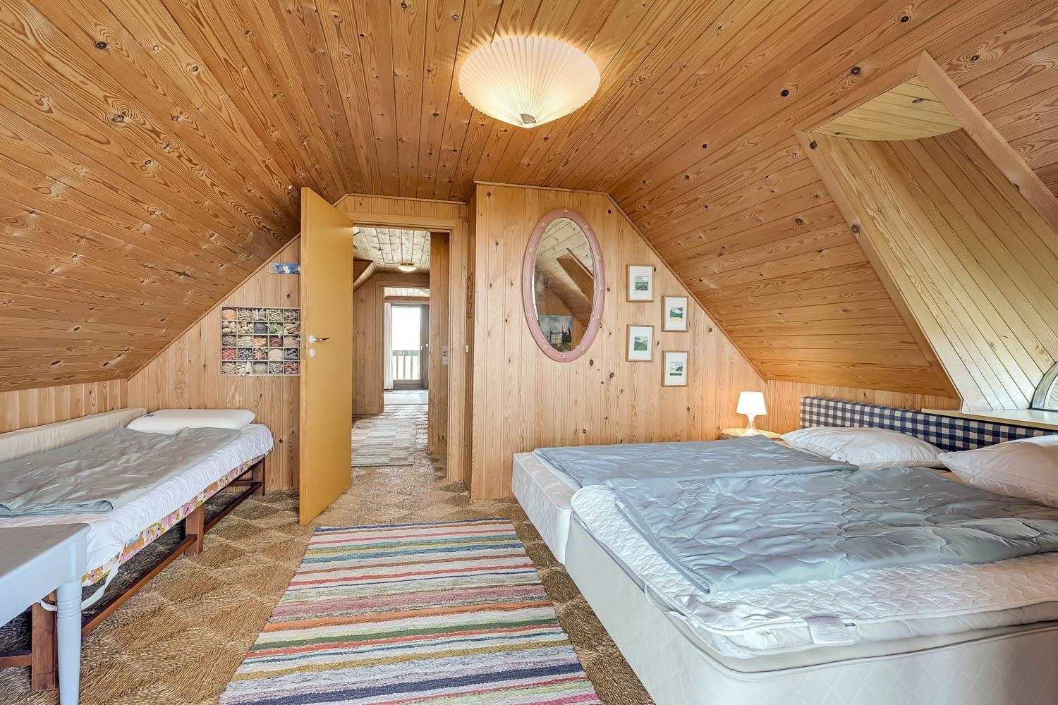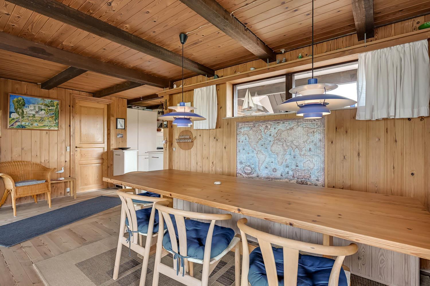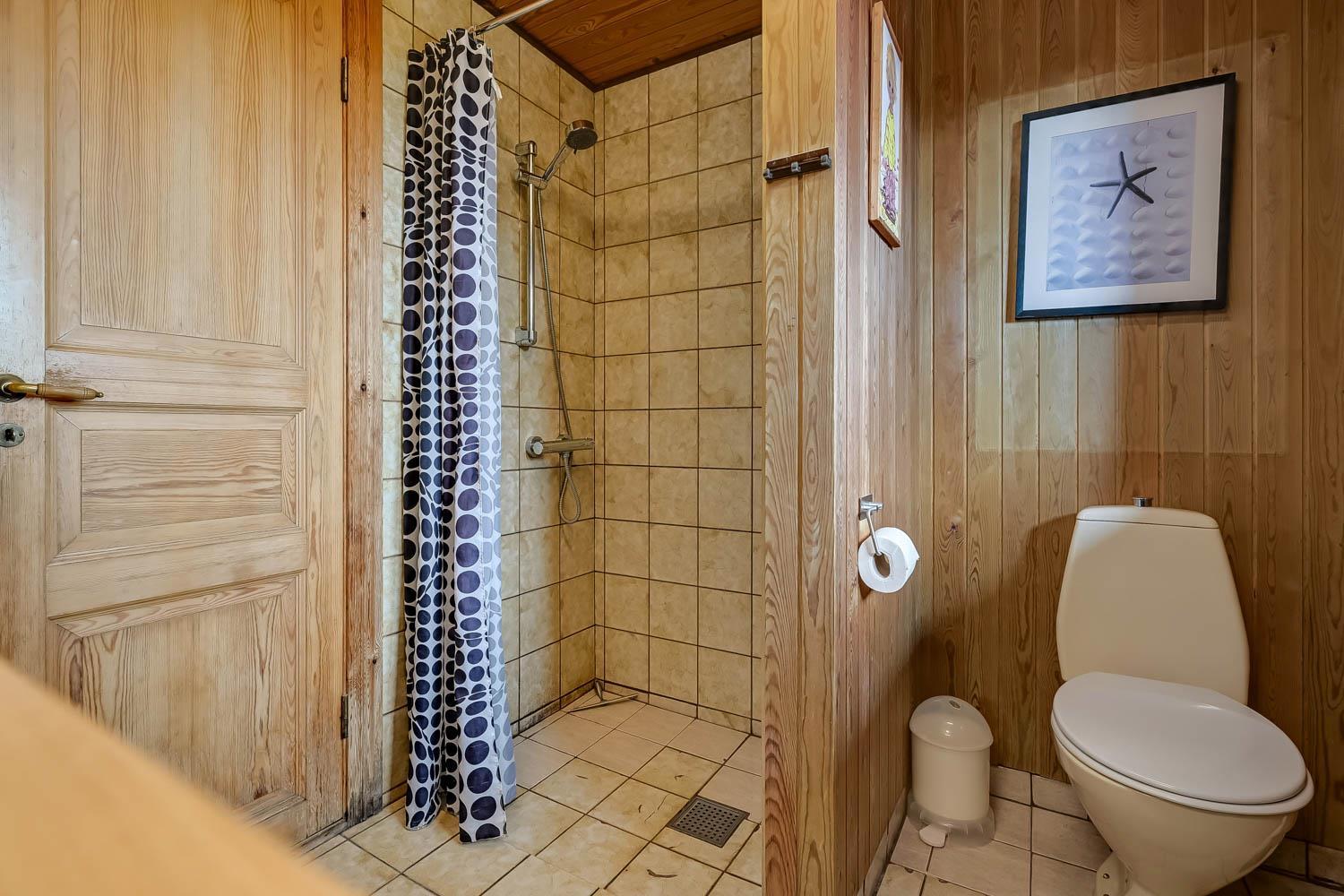 Schönes Steinhaus auf 2 Etagen mit 160 m², gebaut im Jahr 1977. Ein steiler, gepflasterter Weg führt zum Haus hinauf. Der erste Raum, den man betritt, ist der Eingangsbereich des Hauses. Hier gibt es Platz, um Jacken aufzuhängen und Schuhe abzustellen. Vom Eingangsbereich aus gelangt man ins Badezimmer des Hauses: Toilette, Waschbecken, Dusche und Waschmaschine. Weiter vom Eingang gelangt man in den Wohnbereich des Hauses, der aus der Küche, dem Esszimmer und dem Wohnzimmer besteht, alle Räume sind mit Holzböden ausgestattet. Die Küchenecke mit hellen Küchenelementen ist mit einem Glaskeramikherd, Dunstabzugshaube, Mikrowelle, Kühl-/Gefrierschrank und Geschirrspüler ausgestattet. Um die Ecke von der Küche befindet sich das Esszimmer, wo alle Bewohner des Hauses Platz finden. Im Wohnzimmer gibt es eine gemütliche Sofaecke mit Polstermöbeln und eine Sitzecke mit Kissen, wo man sich beispielsweise hinsetzen und ein Buch lesen oder fernsehen kann. Der Fernseher ist ein Smart-TV mit DR1, deutschen Kanälen und der Möglichkeit, eigene Streamingdienste zu nutzen, für die man selbst ein Abonnement hat.Im 1. Stock befinden sich die 3 Schlafzimmer des Hauses, von denen 2 Zimmer Zugang zu einem überdachten Balkon haben. In jedem Schlafzimmer gibt es 2 Einzelbetten, die zu einem Doppelbett zusammengeschoben sind, und in 2 der Zimmer befindet sich zusätzlich ein weiteres Einzelbett. (1DB + 1EB, 1DB + 1EB, 1DB). Im 1. Stock gibt es auch eine Gästetoilette mit Toilette und Waschbecken.