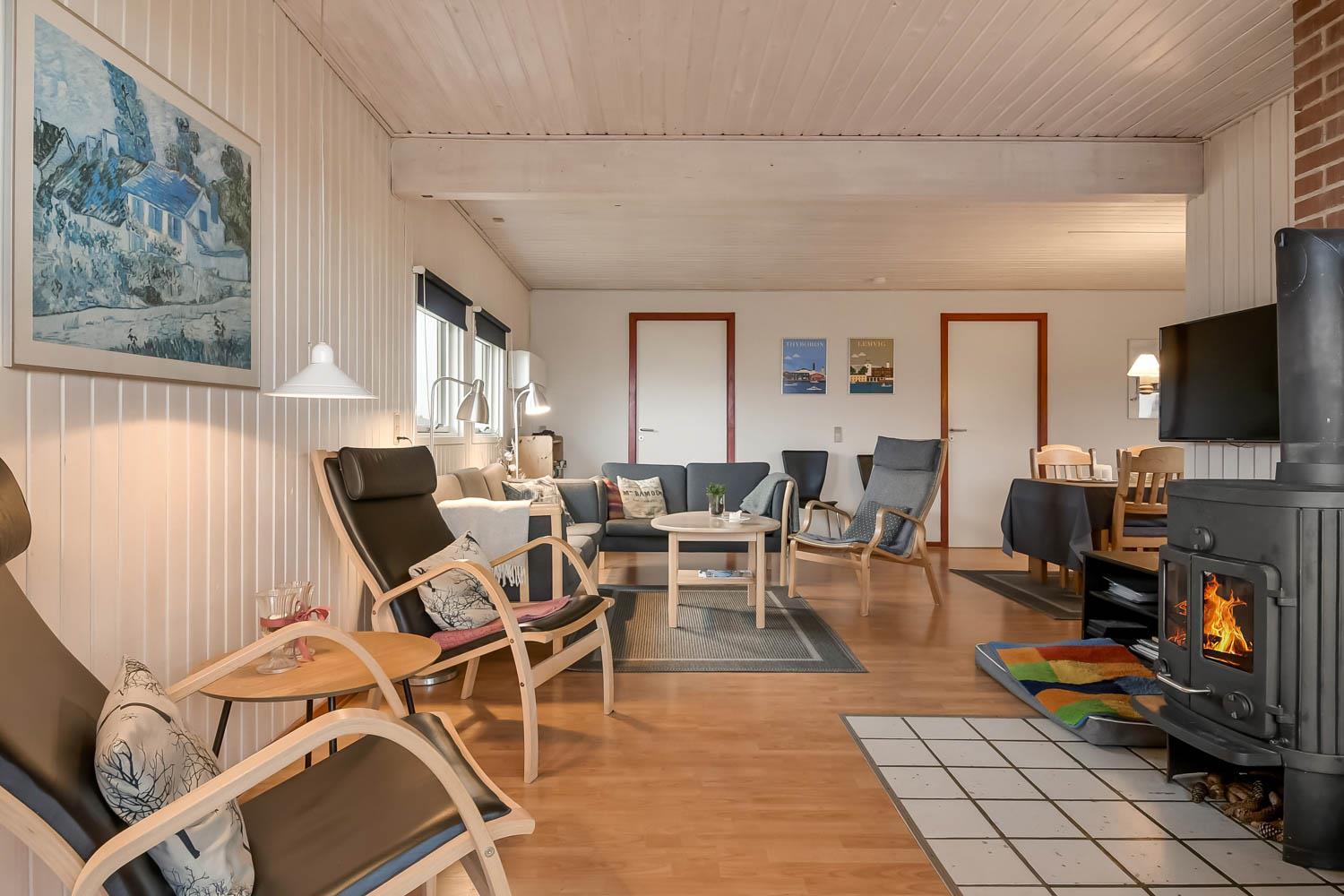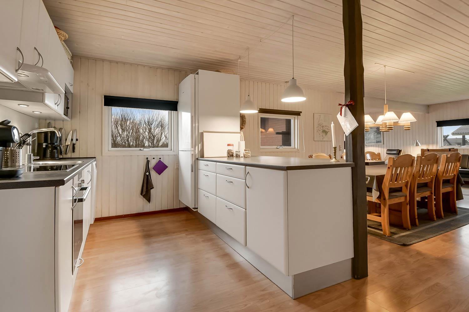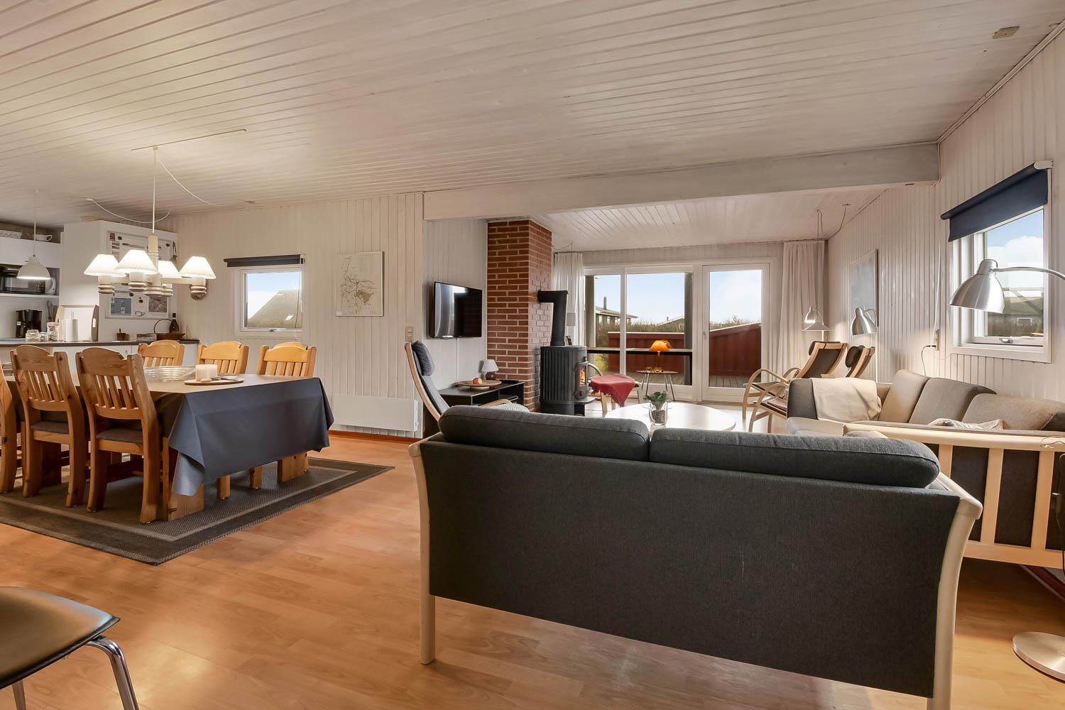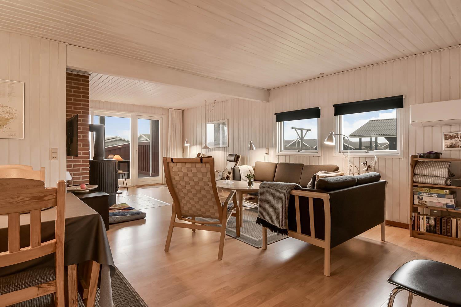 Gut eingerichtetes Ferienhaus auf 96 m² mit 4 Schlafräumen: 1DB + 1DB + 2B + 1E. Gemütlicher Wohnraum mit Polstermöbeln, Esstisch, Smart-TV mit dänischen und deutschen Programmen und Radioprogrammen, DVD, Chromecast mit möglichkeit für streaming von Apps / TV / Radio wofür Sie selber einen abonnement haben. Gemütlicher Kaminofen und eine energiesparende Wärmepumpe sorgen dafür, dass Sie auch in den kühlen Zeiten die Wärme halten können. Schöne, neue Küche mit Geschirrspüler, Ceranfeld, eingebauten Ofen, Abzugshaube, Mikrowelle und Kühlschrank mit Gefrierfach. Badezimmer mit Toilette, Dusche, Waschmaschine, Fliesenboden mit Fussbodenheizung und Zugang zur Sauna. Nichtraucher-Haus. Max. 1 Haustier erlaubt.
