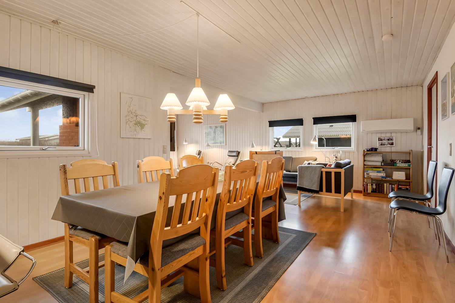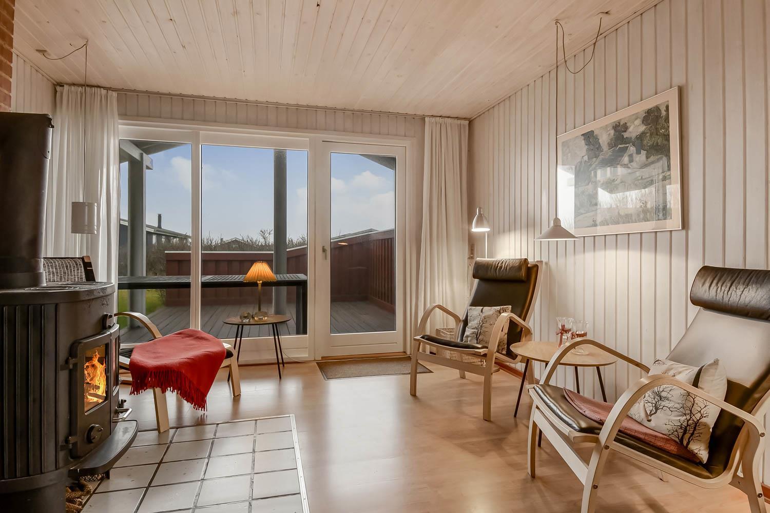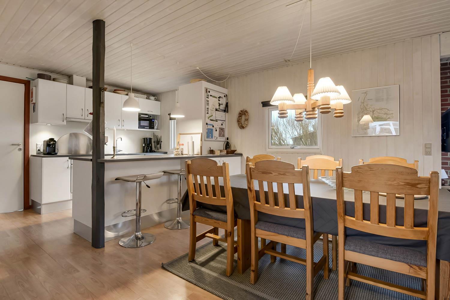 Gut eingerichtetes Ferienhaus auf 96 m² mit 4 Schlafräumen: 1DB + 1DB + 2B + 1E. Gemütlicher Wohnraum mit Polstermöbeln, Esstisch, Smart-TV mit dänischen und deutschen Programmen und Radioprogrammen, DVD, Chromecast mit möglichkeit für streaming von Apps / TV / Radio wofür Sie selber einen abonnement haben. Gemütlicher Kaminofen und eine energiesparende Wärmepumpe sorgen dafür, dass Sie auch in den kühlen Zeiten die Wärme halten können. Schöne, neue Küche mit Geschirrspüler, Ceranfeld, eingebauten Ofen, Abzugshaube, Mikrowelle und Kühlschrank mit Gefrierfach. Badezimmer mit Toilette, Dusche, Waschmaschine, Fliesenboden mit Fussbodenheizung und Zugang zur Sauna. Nichtraucher-Haus. Max. 1 Haustier erlaubt.