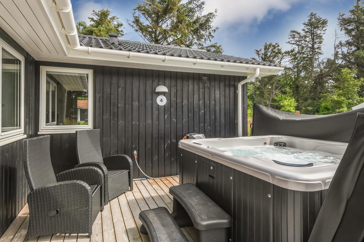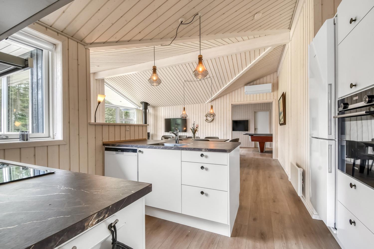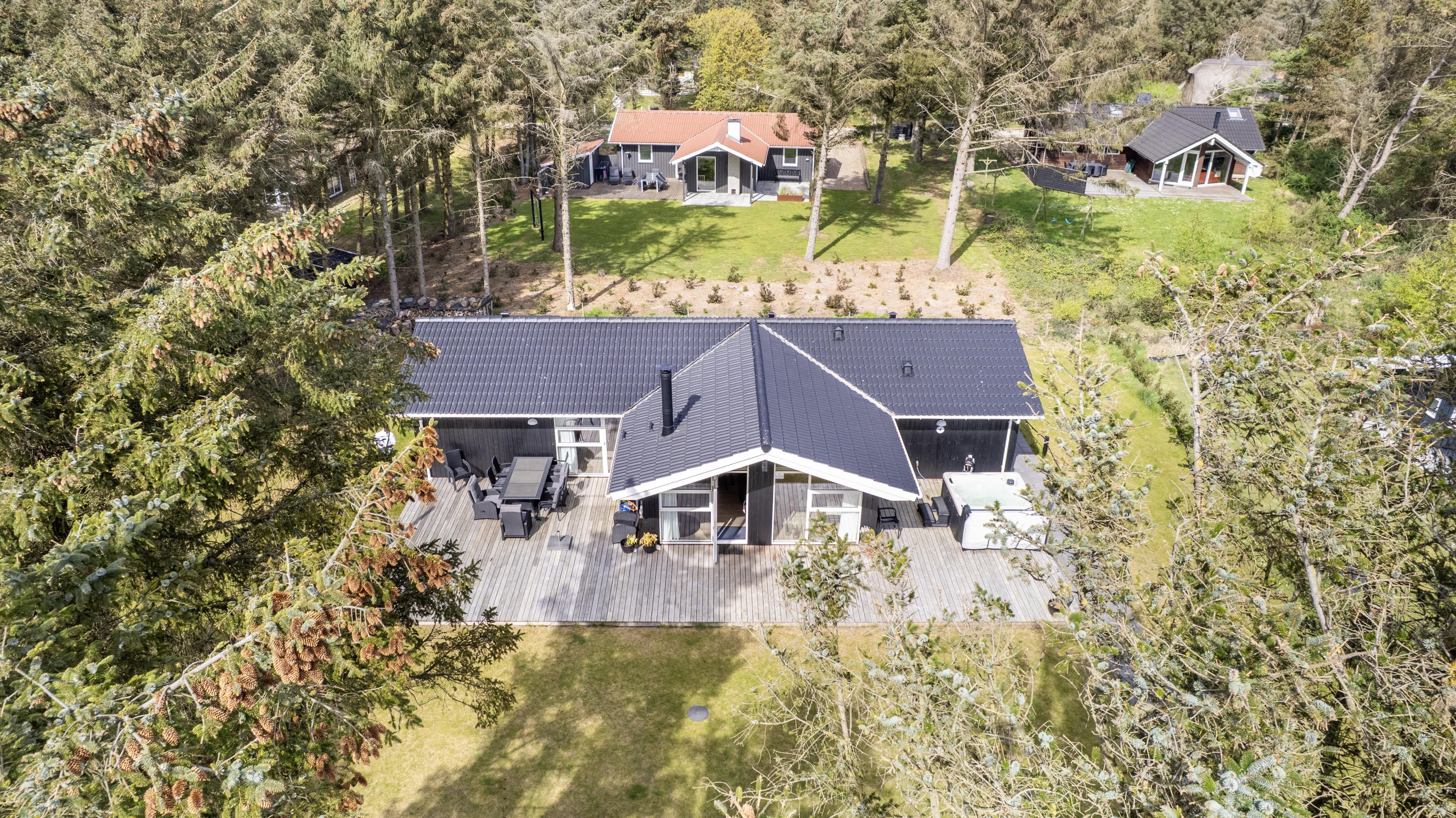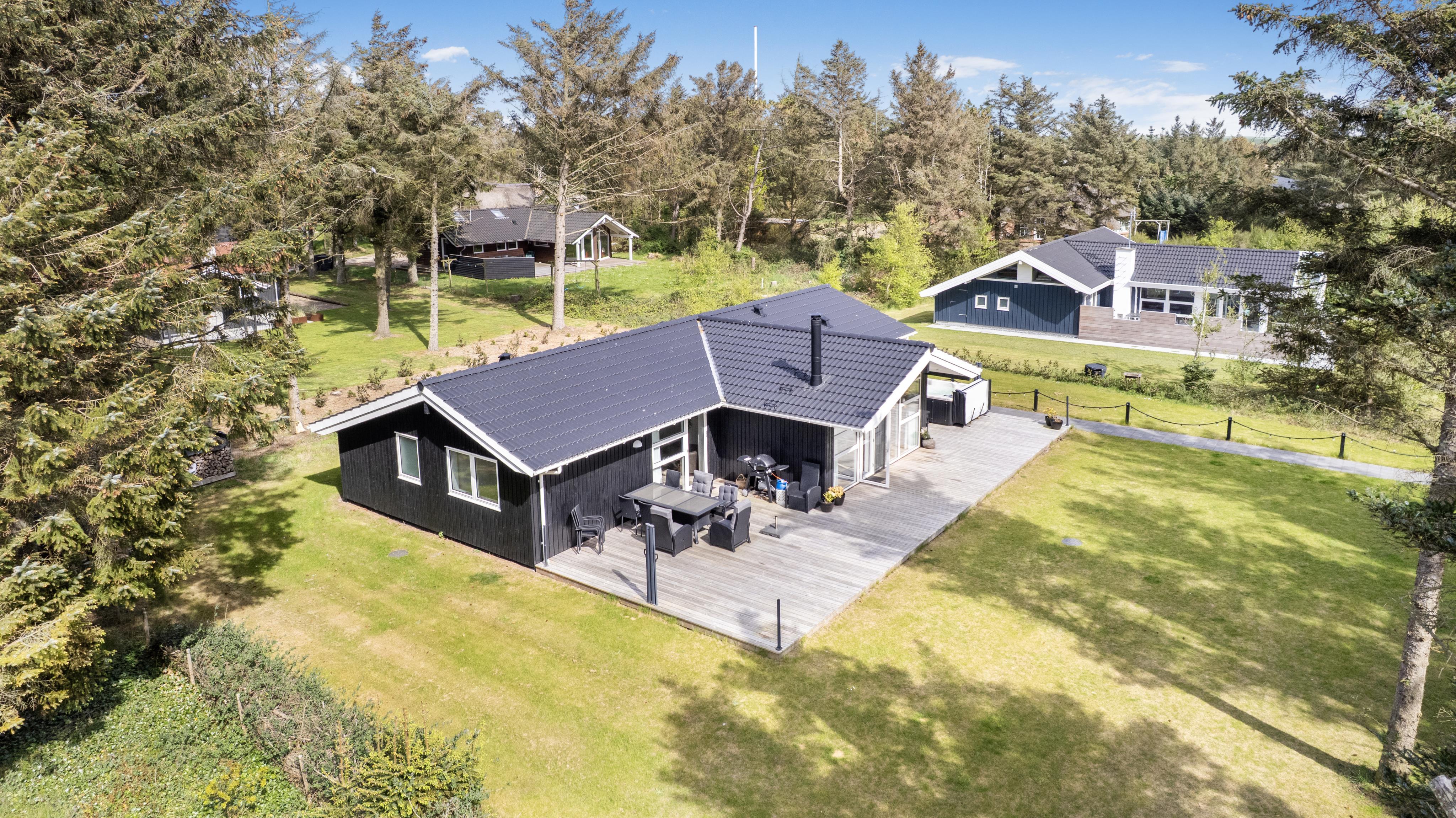 Schon wenn das Auto auf dem Kiesweg wenige Meter vom Haus entfernt ist, wird klar, daß Lage und Haus etwas Besonderes sind. Das Haus liegt auf einem schönen Grundstück in Vejlby Klit mit höheren Bewachsungen. Das Haus ist 120 qm groß und hat 4 schöne Schlafräume: 1DB + 1DB + 1DB + 2B. In der Mitte des Hauses befindet sich eine große, gut ausgestattete Küche/Wohnraum mit allem an Geschirr/Kochgeschirr . Die offene Küche ist mit Ceranfeld-Kochplatten, eingebautem Ofen, Abzugshaube, Geschirrspüler, Mikrowelle, Kühlschrank mit Gefrierfach und vielem mehr ausgestattet. Genießen Sie Ihr zubereitetes Essen am Esstisch dicht an der Küche. Genießen Sie den Blick aus den Fenstern auf die Gegend an der Nordsee. Entspannen Sie sich in den weichen Qualitätsmöbeln. Smart-TV mit Soundbar mit eingebauten dänischen Programmen, Radio und der Möglichkeit zum Streaming von Apps, wofür die Sie selber ein Abonnement haben. Es gibt praktische Holzböden im Haus, die sehr reinigungsfreundlich sind und praktische und schöne Akustikpaneelen sorgen für eine gedämpfte und angenehme Lautstärke im Haus für alle. Der Wellnessbereich in einem der Badezimmer ist mit Innen-Whirlpool und Sauna ausgestattet und es gibt von dort einen Ausgang zu einer großen und einzigartigen Terrassenanlage, wo es auch einen Aussen-Whirlpool gibt. Der separate Aktivitätsraum verfügt über Billard und Tischtennis. Hier kann man viele Stunden verbringen. 2 Badezimmer jeweils mit Toilette , Waschbecken und Fußbodenheizung. Waschmaschine ist auch vorhanden. Wärmepumpe und Kaminofen machen das Haus sehr energiefreundlich und verhelfen auch zu einer günstigen Nebenkostenrechnung. Das Haus wird nicht an Jugendgruppen vermietet. Haben Sie ein Elektro-Auto oder einen Plug-in Hybrid, so können Sie eine Ladebox Type 2 nutzen, die bis 11 kWh aufladen kann. Nichtraucher-Haus. Max. 2 Hunde sind erlaubt.