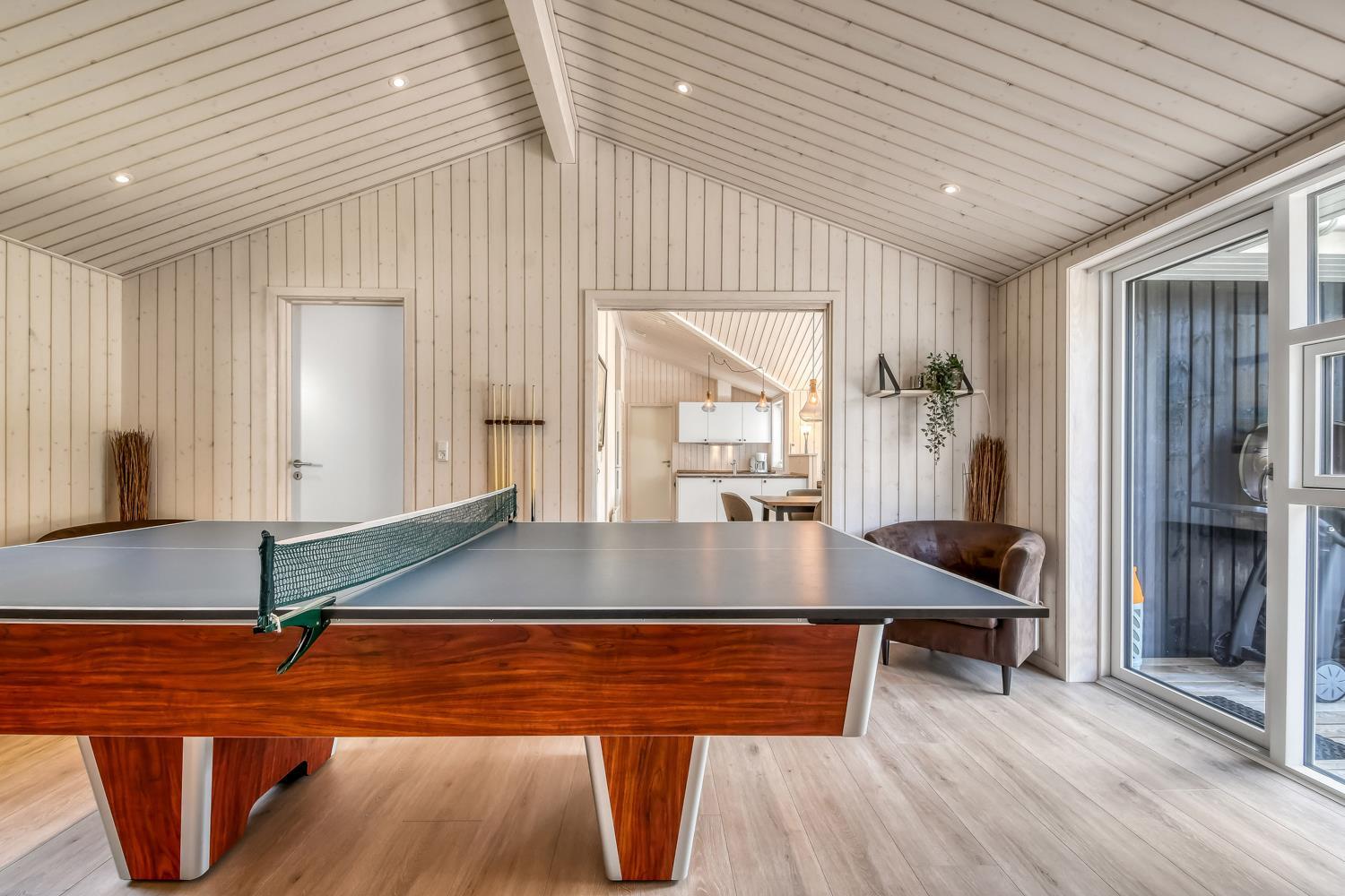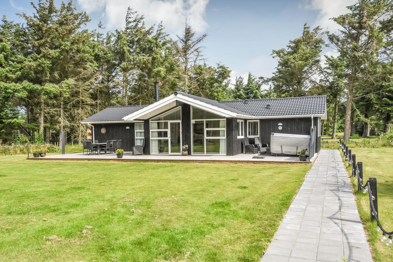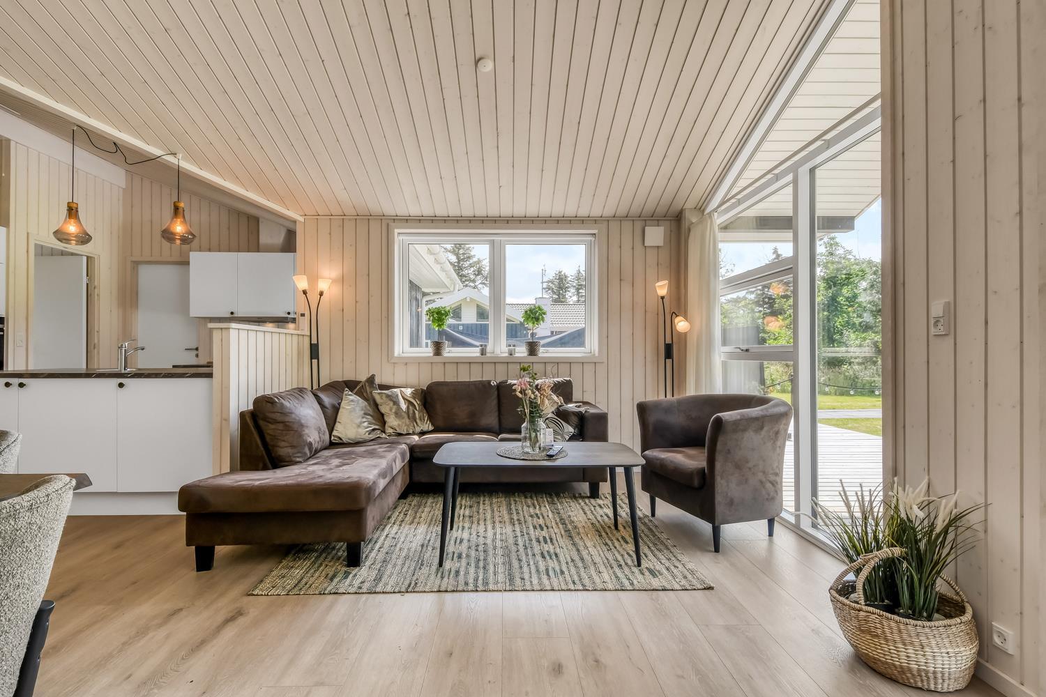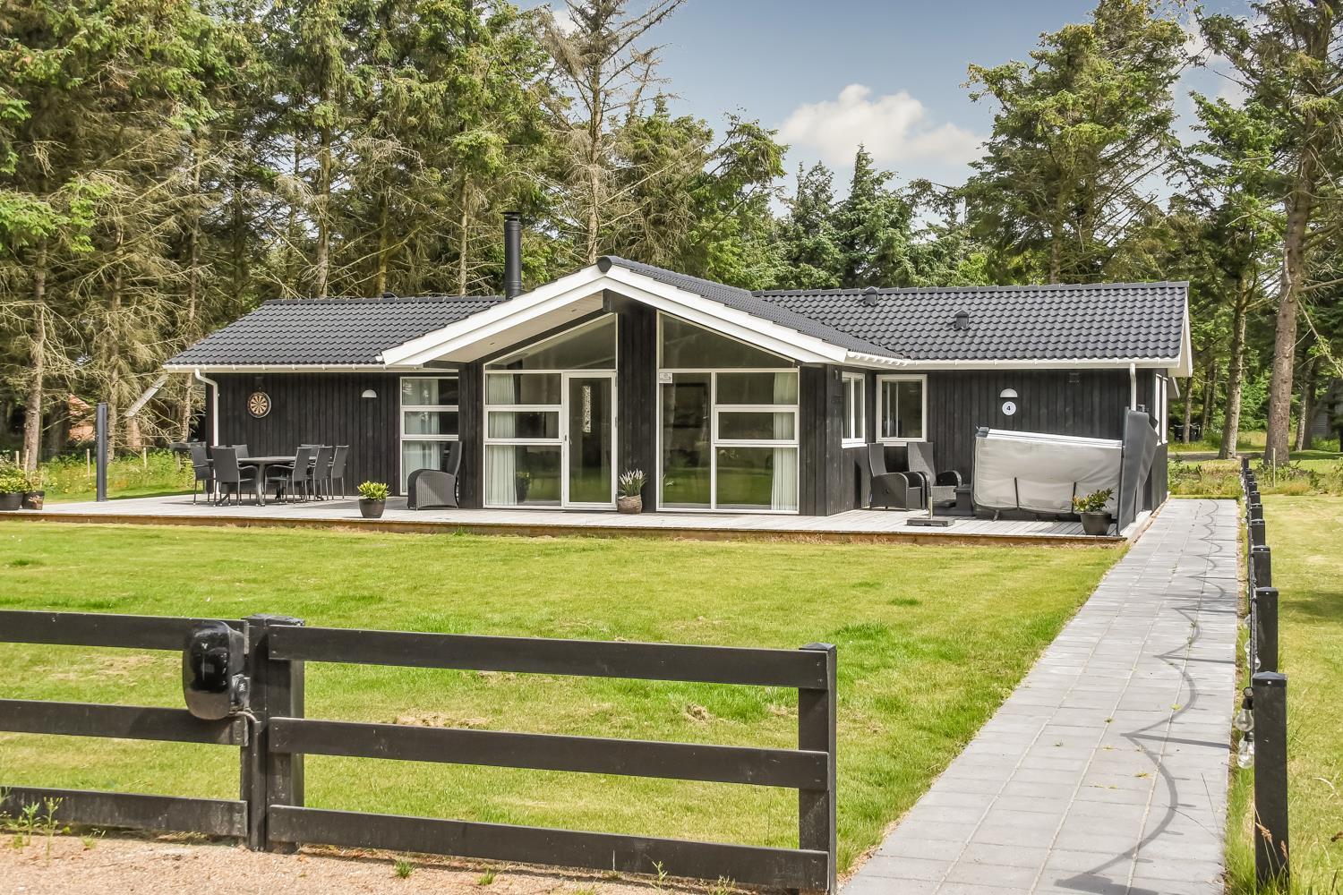 Schon wenn das Auto auf dem Kiesweg wenige Meter vom Haus entfernt ist, wird klar, daß Lage und Haus etwas Besonderes sind. Das Haus liegt auf einem schönen Grundstück in Vejlby Klit mit höheren Bewachsungen. Das Haus ist 120 qm groß und hat 4 schöne Schlafräume: 1DB + 1DB + 1DB + 2B. In der Mitte des Hauses befindet sich eine große, gut ausgestattete Küche/Wohnraum mit allem an Geschirr/Kochgeschirr . Die offene Küche ist mit Ceranfeld-Kochplatten, eingebautem Ofen, Abzugshaube, Geschirrspüler, Mikrowelle, Kühlschrank mit Gefrierfach und vielem mehr ausgestattet. Genießen Sie Ihr zubereitetes Essen am Esstisch dicht an der Küche. Genießen Sie den Blick aus den Fenstern auf die Gegend an der Nordsee. Entspannen Sie sich in den weichen Qualitätsmöbeln. Smart-TV mit Soundbar mit eingebauten dänischen Programmen, Radio und der Möglichkeit zum Streaming von Apps, wofür die Sie selber ein Abonnement haben. Es gibt praktische Holzböden im Haus, die sehr reinigungsfreundlich sind und praktische und schöne Akustikpaneelen sorgen für eine gedämpfte und angenehme Lautstärke im Haus für alle. Der Wellnessbereich in einem der Badezimmer ist mit Innen-Whirlpool und Sauna ausgestattet und es gibt von dort einen Ausgang zu einer großen und einzigartigen Terrassenanlage, wo es auch einen Aussen-Whirlpool gibt. Der separate Aktivitätsraum verfügt über Billard und Tischtennis. Hier kann man viele Stunden verbringen. 2 Badezimmer jeweils mit Toilette , Waschbecken und Fußbodenheizung. Waschmaschine ist auch vorhanden. Wärmepumpe und Kaminofen machen das Haus sehr energiefreundlich und verhelfen auch zu einer günstigen Nebenkostenrechnung. Das Haus wird nicht an Jugendgruppen vermietet. Haben Sie ein Elektro-Auto oder einen Plug-in Hybrid, so können Sie eine Ladebox Type 2 nutzen, die bis 11 kWh aufladen kann. Nichtraucher-Haus. Max. 2 Hunde sind erlaubt.