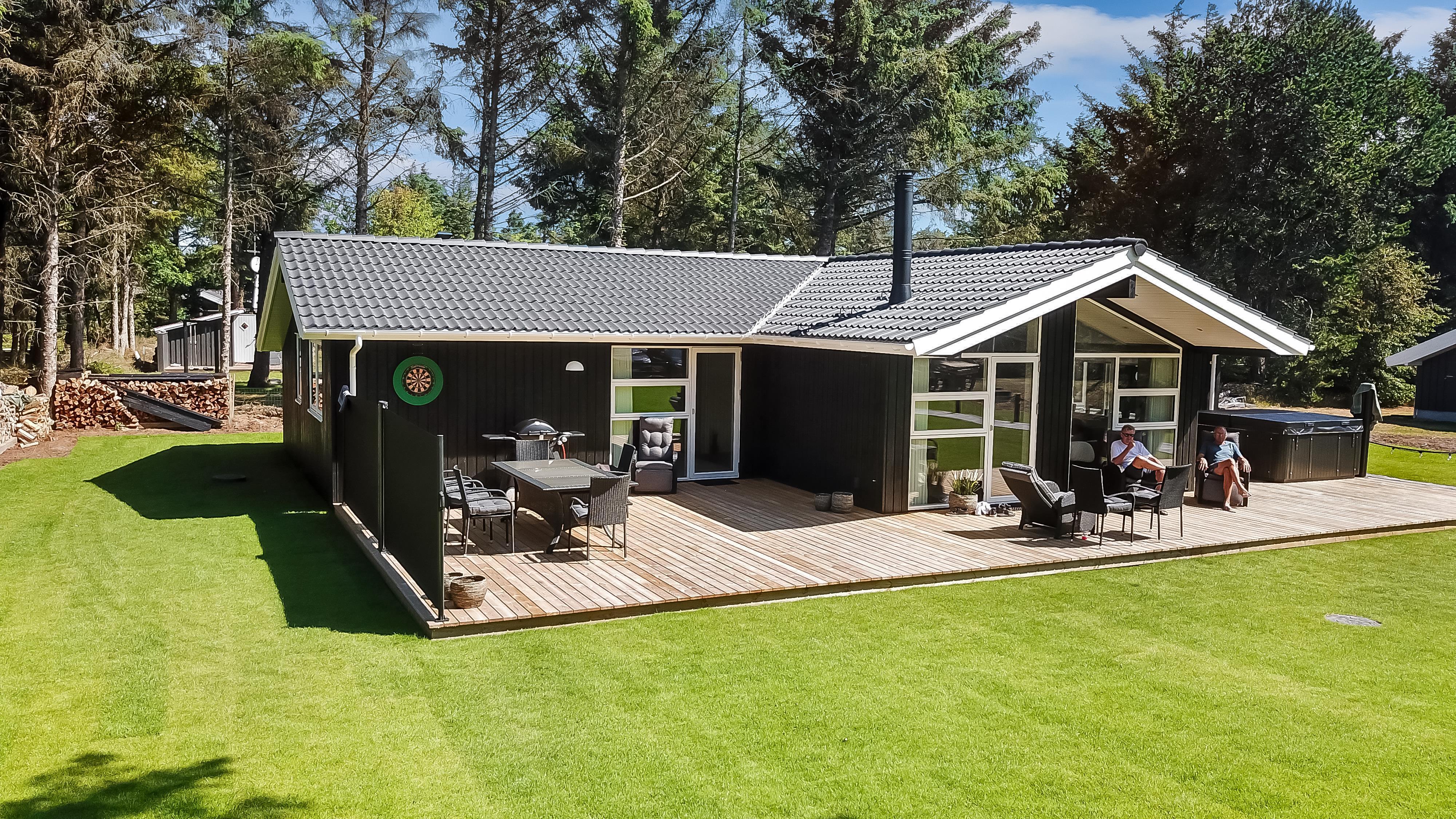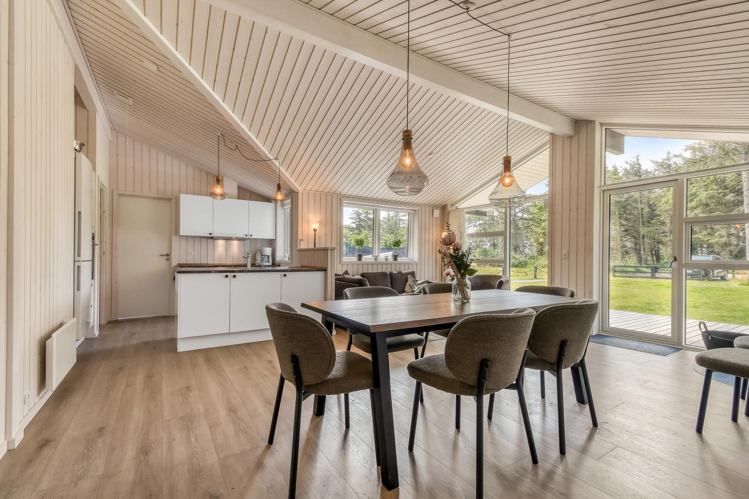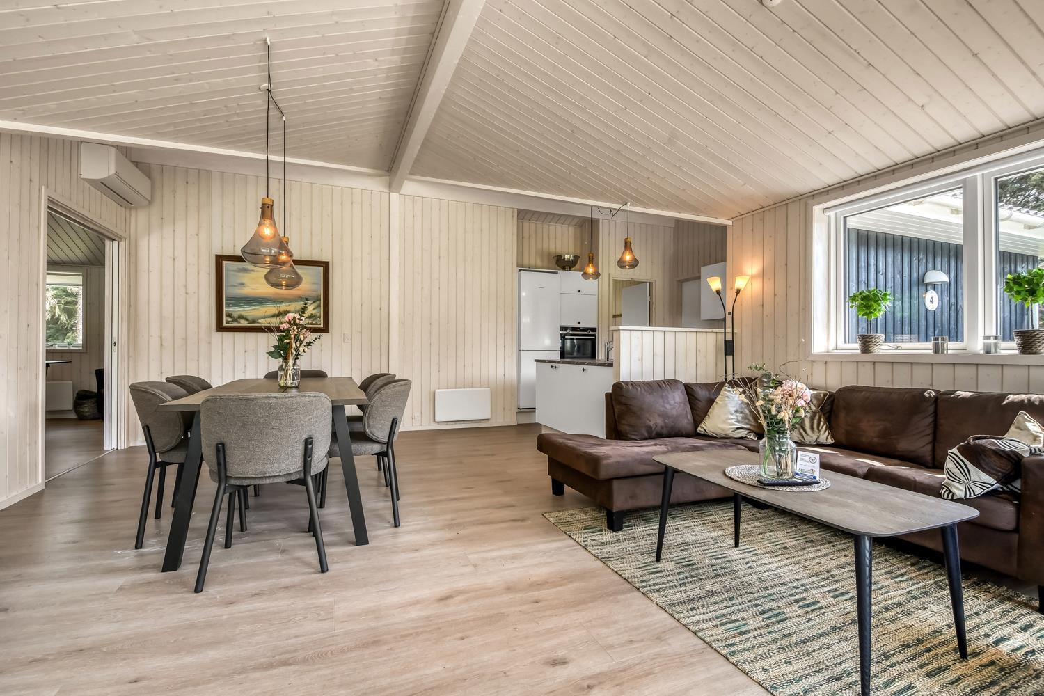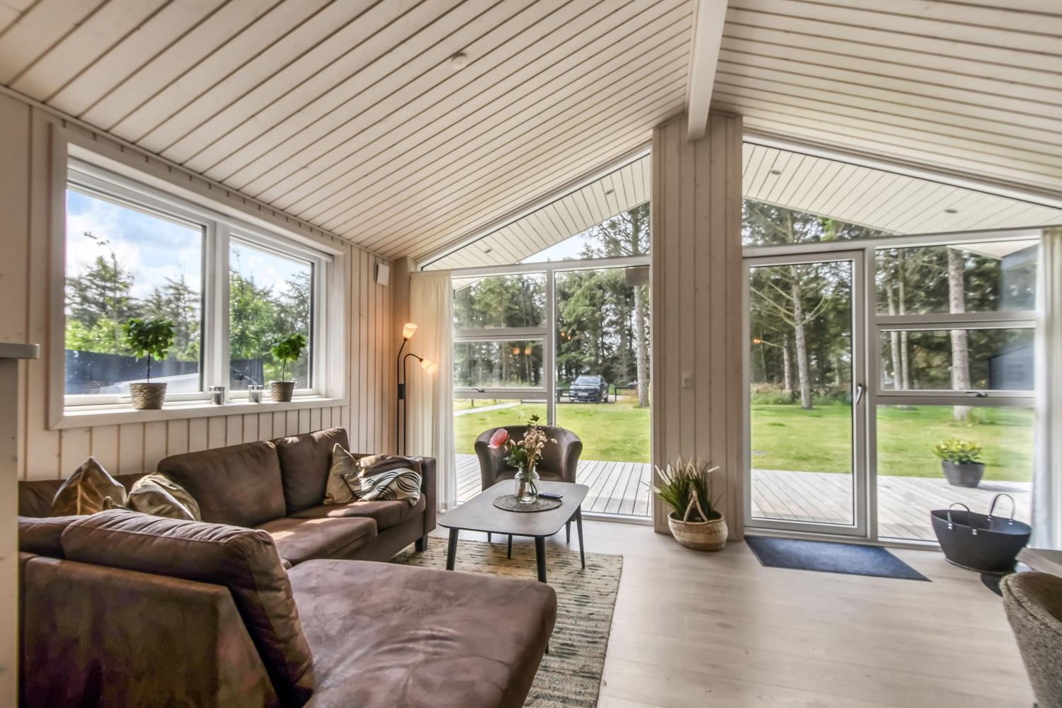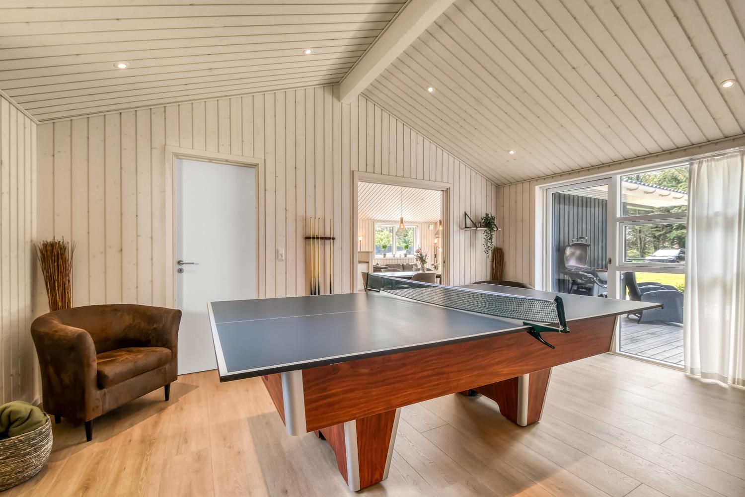 Schon wenn das Auto auf dem Kiesweg wenige Meter vom Haus entfernt ist, wird klar, daß Lage und Haus etwas Besonderes sind. Das Haus liegt auf einem schönen Grundstück in Vejlby Klit mit höheren Bewachsungen. Das Haus ist 120 qm groß und hat 4 schöne Schlafräume: 1DB + 1DB + 1DB + 2B. In der Mitte des Hauses befindet sich eine große, gut ausgestattete Küche/Wohnraum mit allem an Geschirr/Kochgeschirr . Die offene Küche ist mit Ceranfeld-Kochplatten, eingebautem Ofen, Abzugshaube, Geschirrspüler, Mikrowelle, Kühlschrank mit Gefrierfach und vielem mehr ausgestattet. Genießen Sie Ihr zubereitetes Essen am Esstisch dicht an der Küche. Genießen Sie den Blick aus den Fenstern auf die Gegend an der Nordsee. Entspannen Sie sich in den weichen Qualitätsmöbeln. Smart-TV mit Soundbar mit eingebauten dänischen Programmen, Radio und der Möglichkeit zum Streaming von Apps, wofür die Sie selber ein Abonnement haben. Es gibt praktische Holzböden im Haus, die sehr reinigungsfreundlich sind und praktische und schöne Akustikpaneelen sorgen für eine gedämpfte und angenehme Lautstärke im Haus für alle. Der Wellnessbereich in einem der Badezimmer ist mit Innen-Whirlpool und Sauna ausgestattet und es gibt von dort einen Ausgang zu einer großen und einzigartigen Terrassenanlage, wo es auch einen Aussen-Whirlpool gibt. Der separate Aktivitätsraum verfügt über Billard und Tischtennis. Hier kann man viele Stunden verbringen. 2 Badezimmer jeweils mit Toilette , Waschbecken und Fußbodenheizung. Waschmaschine ist auch vorhanden. Wärmepumpe und Kaminofen machen das Haus sehr energiefreundlich und verhelfen auch zu einer günstigen Nebenkostenrechnung. Das Haus wird nicht an Jugendgruppen vermietet. Haben Sie ein Elektro-Auto oder einen Plug-in Hybrid, so können Sie eine Ladebox Type 2 nutzen, die bis 11 kWh aufladen kann. Nichtraucher-Haus. Max. 2 Hunde sind erlaubt.