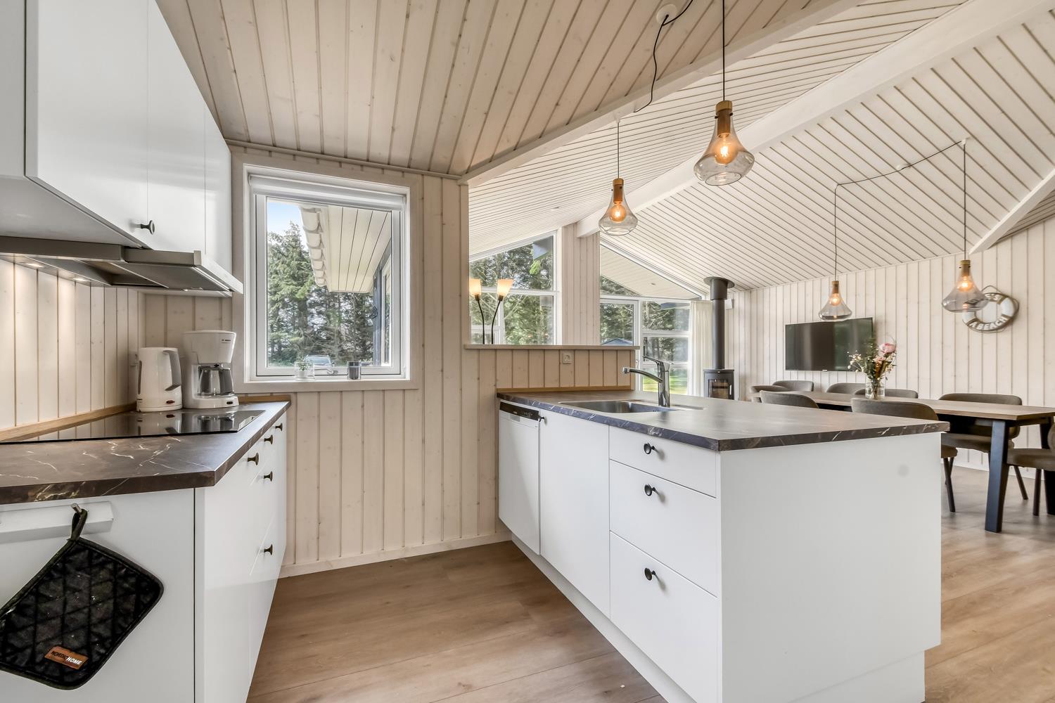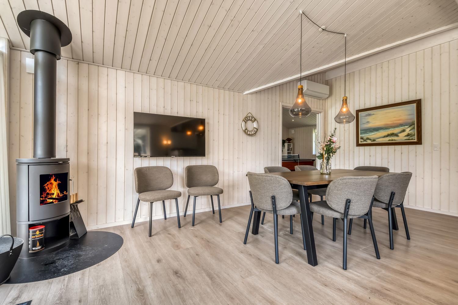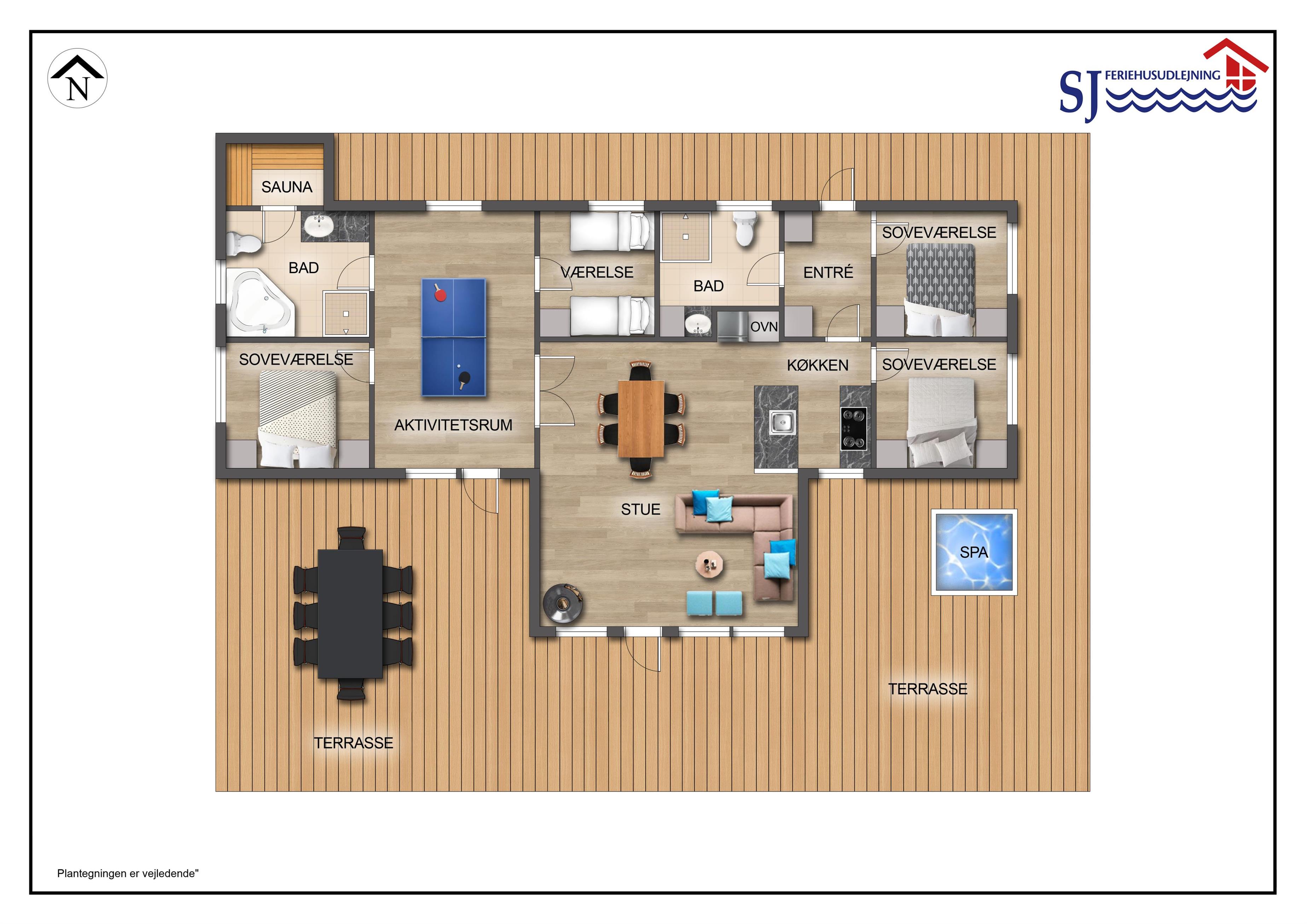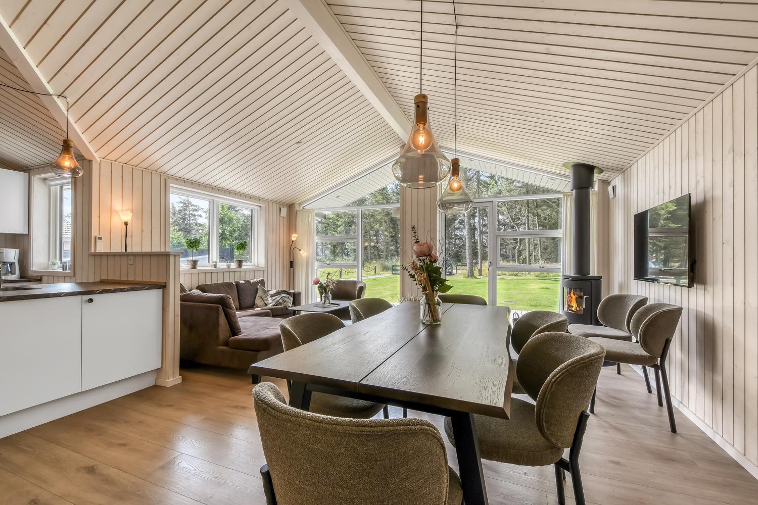 Schon wenn das Auto auf dem Kiesweg wenige Meter vom Haus entfernt ist, wird klar, daß Lage und Haus etwas Besonderes sind. Das Haus liegt auf einem schönen Grundstück in Vejlby Klit mit höheren Bewachsungen. Das Haus ist 120 qm groß und hat 4 schöne Schlafräume: 1DB + 1DB + 1DB + 2B. In der Mitte des Hauses befindet sich eine große, gut ausgestattete Küche/Wohnraum mit allem an Geschirr/Kochgeschirr . Die offene Küche ist mit Ceranfeld-Kochplatten, eingebautem Ofen, Abzugshaube, Geschirrspüler, Mikrowelle, Kühlschrank mit Gefrierfach und vielem mehr ausgestattet. Genießen Sie Ihr zubereitetes Essen am Esstisch dicht an der Küche. Genießen Sie den Blick aus den Fenstern auf die Gegend an der Nordsee. Entspannen Sie sich in den weichen Qualitätsmöbeln. Smart-TV mit Soundbar mit eingebauten dänischen Programmen, Radio und der Möglichkeit zum Streaming von Apps, wofür die Sie selber ein Abonnement haben. Es gibt praktische Holzböden im Haus, die sehr reinigungsfreundlich sind und praktische und schöne Akustikpaneelen sorgen für eine gedämpfte und angenehme Lautstärke im Haus für alle. Der Wellnessbereich in einem der Badezimmer ist mit Innen-Whirlpool und Sauna ausgestattet und es gibt von dort einen Ausgang zu einer großen und einzigartigen Terrassenanlage, wo es auch einen Aussen-Whirlpool gibt. Der separate Aktivitätsraum verfügt über Billard und Tischtennis. Hier kann man viele Stunden verbringen. 2 Badezimmer jeweils mit Toilette , Waschbecken und Fußbodenheizung. Waschmaschine ist auch vorhanden. Wärmepumpe und Kaminofen machen das Haus sehr energiefreundlich und verhelfen auch zu einer günstigen Nebenkostenrechnung. Das Haus wird nicht an Jugendgruppen vermietet. Haben Sie ein Elektro-Auto oder einen Plug-in Hybrid, so können Sie eine Ladebox Type 2 nutzen, die bis 11 kWh aufladen kann. Nichtraucher-Haus. Max. 2 Hunde sind erlaubt.