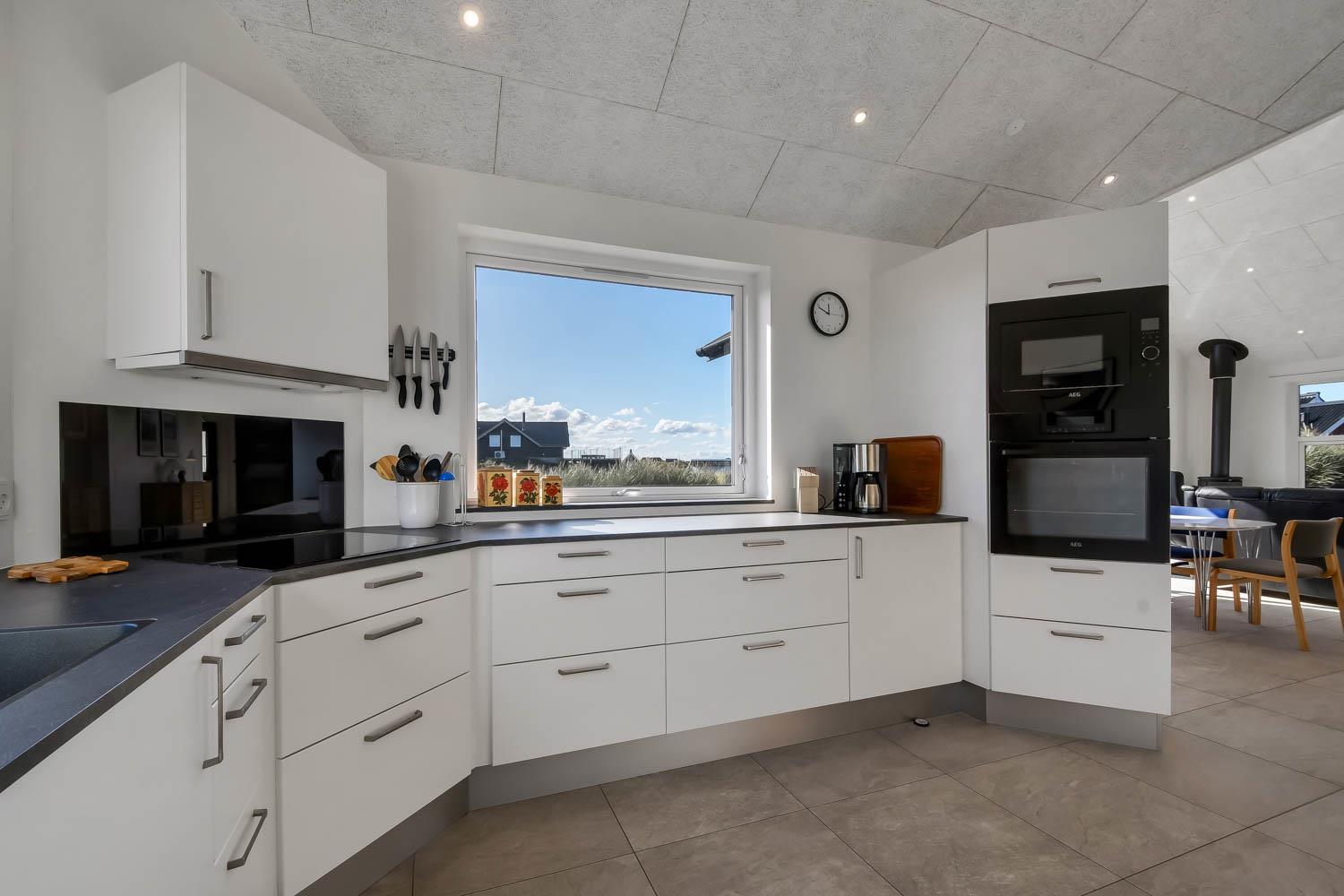 Auf einem etwa 1.250 m2 schönen, kupierten Naturgrundstück mit Blick zu den Dünen und bloss 200 m von der Nordsee entfernt, liegt dieses prachtvolle Ferienhaus auf etwa 124 m2. Das Haus ist minimalistisch im Ausdruck und praktisch eingerichtet. Ein schöner Flur mit Schränken, extra Waschbecken und Waschmaschine und Trockner heisst Sie willkommen. Die Küche ist mit offener Decke und Fliesenboden mit Fussbodenheizung. Vom Wohnraum aus haben Sie Blick zu den Dünen an der Nordsee. Der Wohnraum ist mit Smart-TV mit der Möglichkeit für Streaming von TV/Radio/Apps, neuen Ledermöbeln und Esstisch. Entspannen Sie sich vor dem Kaminofen, der zusammen mit der Wärmepumpe für einen niedrigen
