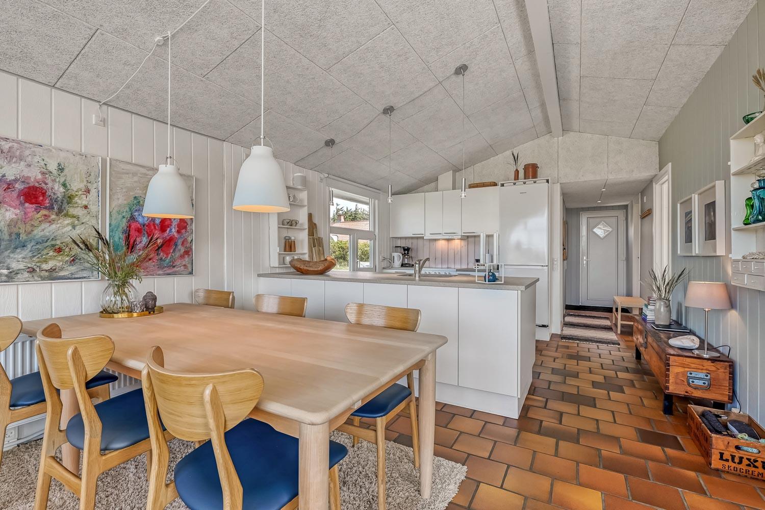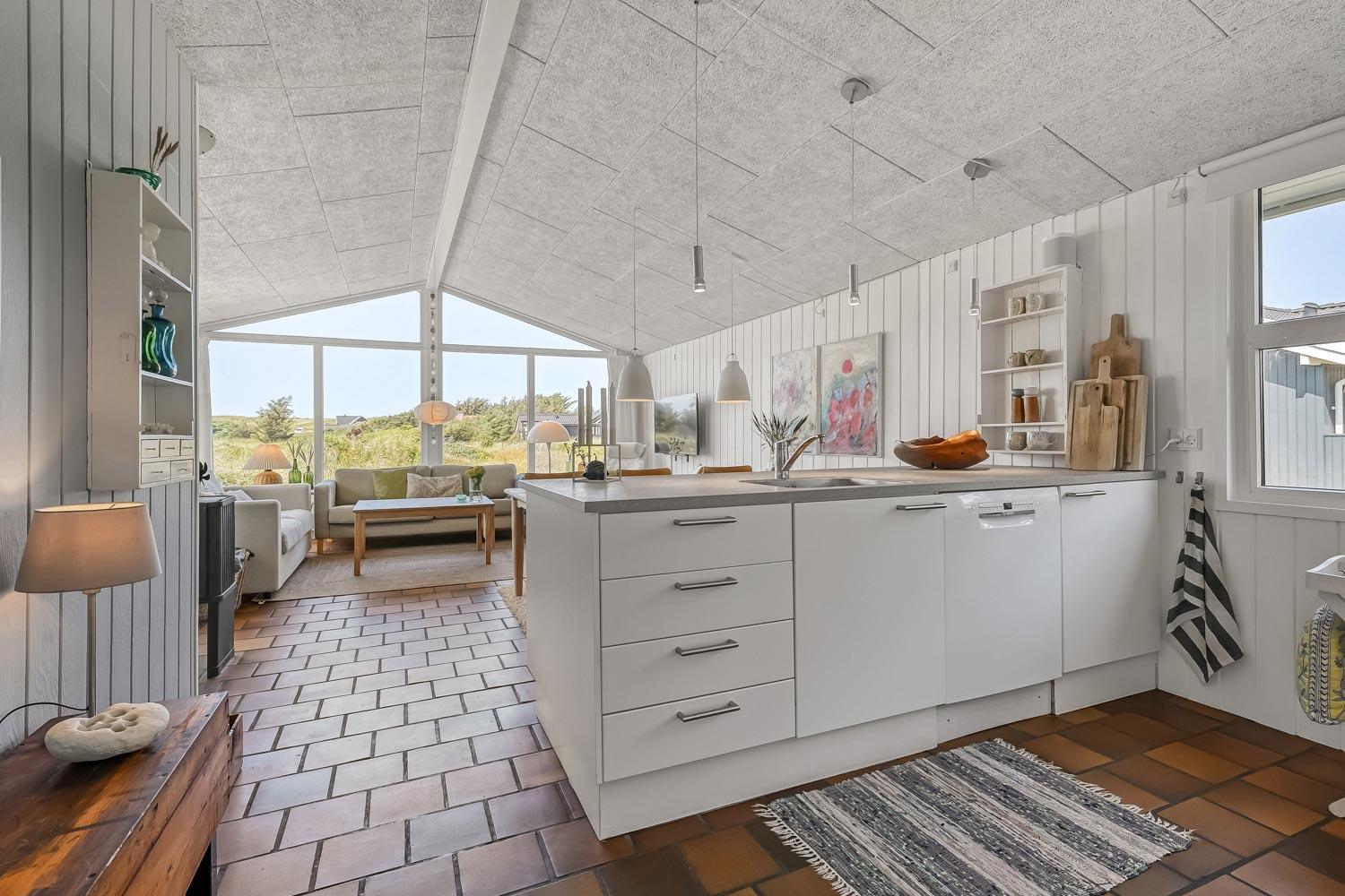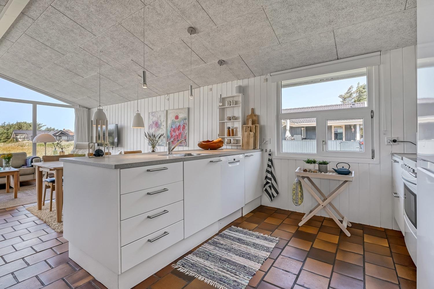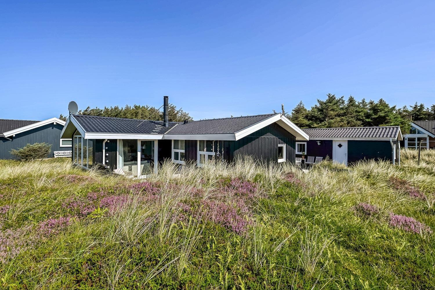 Schon wenn das Auto den Kiesweg erreicht, nur wenige Minuten vom Haus, werden Sie die Lage und das besondere Haus bemerken. Wenn Sie auf dem Grundstück das Auto am Haus geparkt haben fängt der Urlaub an. Das Haus hat etwa 92 m2. Ein schöner Flur heisst Sie wilkommen und führt Sie direkt zur schönen und modernen Küche. Von der Küche und dem Wohnraum haben Sie ein tollen Blick zu den Dünen. Die Küche ist sehr gut eingerichtet und hat einen Herd mit Cerankochfeld, Abzugshaube, Mikrowelle, Kühlschrank mit Gerfrierfach und Geschirrspüler. Dicht bei der Küche steht der Esstisch, wo es Platz für die ganze Familie gibt. Der Wohnraum ist mit schönen Polstermöbeln eingerichtet und von hier können Sie dänische und deutsche Programme sehen und es gibt die Möglichkeit , TV / Radio / Apps über Chromecast zu streamen. Wenn Sie ein Mobiltelefon oder ein anderes Gerät bei sich haben, können Sie über Ihr Abonnement streamen. Sie können dies alles auf dem Flachbildschirm, der auf der Wand hängt geniessen. Ein sehr energiefreundliches Haus mit einer energiesparenden Wärmepumpe, die beide für eine schöne Wärme einfach und günstig sorgen. So hat man auch eine schöne Wärme an den kalten Herbsttagen. 3 Schlafräume: 1DB + 2B + 1B alle mit Holzböden. Badezimmer mit Dusche, Toilette, Waschbecken und Fliesenboden mit Fussbodenheizung. Extra Toilette mit Toilette, Waschbecken und Fussbodenheizung. Waschmaschine und Kinderstuhl sind vorhanden. Alle Aufenthaltsräume sind mit Holzboden mit Fussbodenheizung. Nichtraucher-Haus. Haustiere sind nicht erlaubt. Haben Sie ein elektrisches Auto gibt es beim Haus ein aussen Ladestation auf cee 16 amp. Schönes Schuppen zum Aufbewahren von Fahrräder u.a. Es gibt ein einen 3 Fasen 16 A,mp CEE Steck, der bis 11 KwH aufladen können. So haben Sie ein E-Bike oder ein Plug-in-Hydrid Auto können Sie beim Haus aufladen.