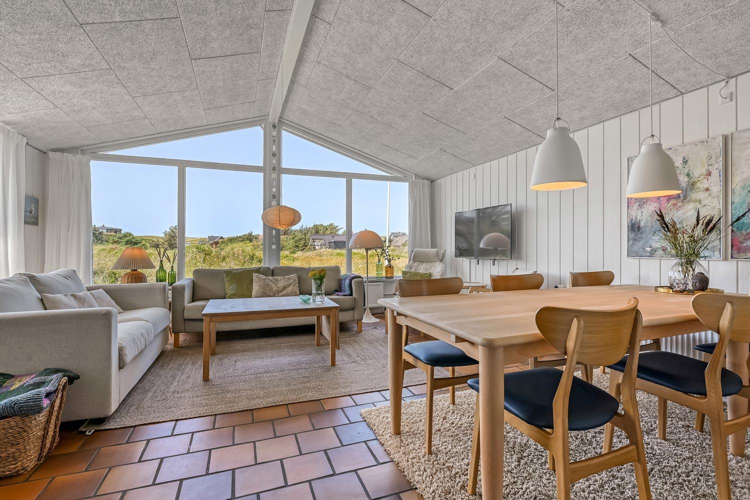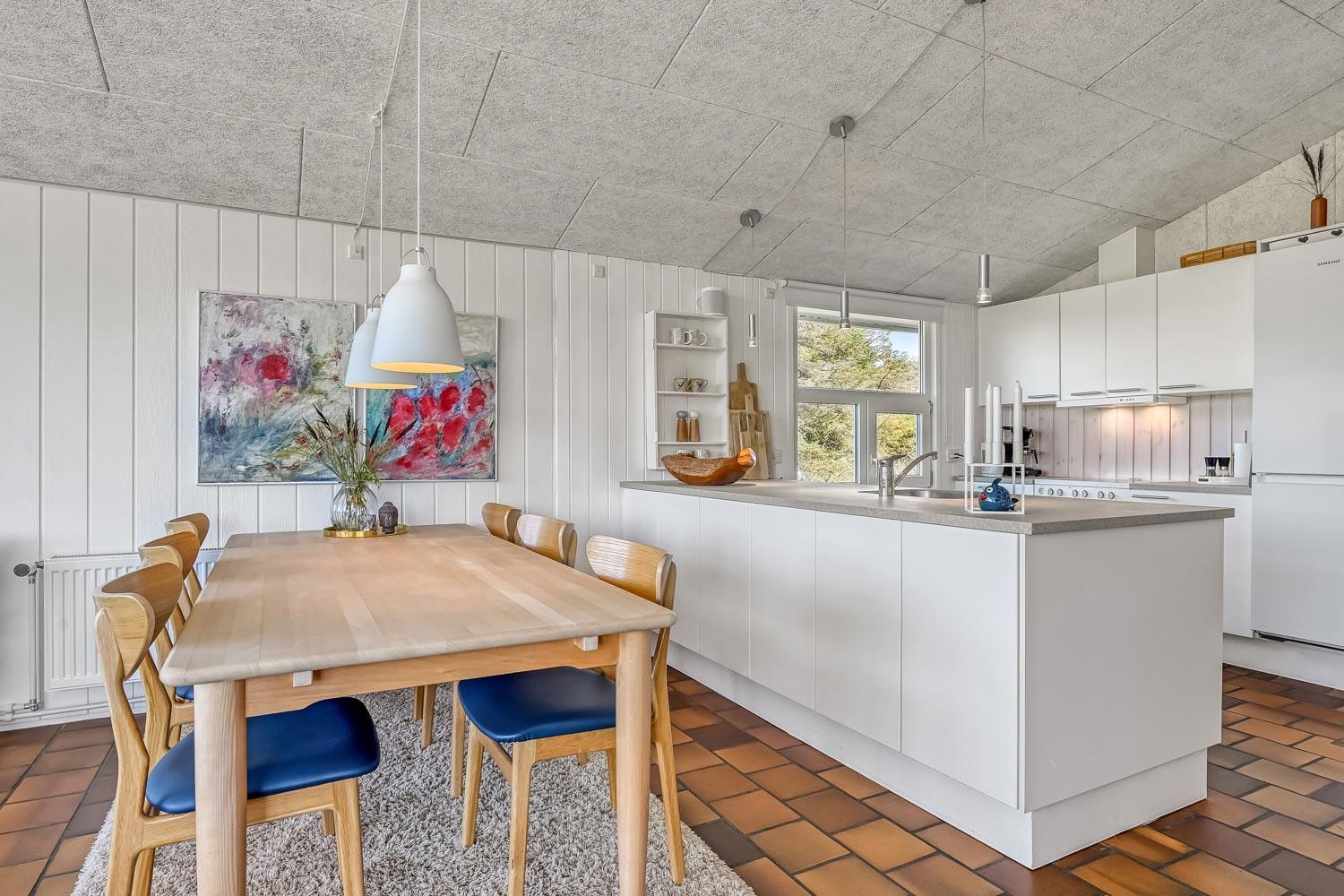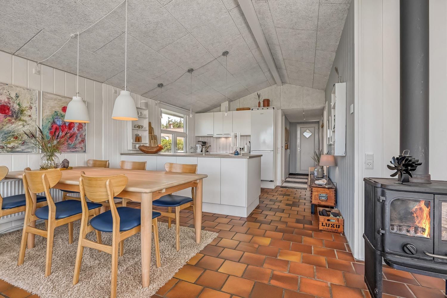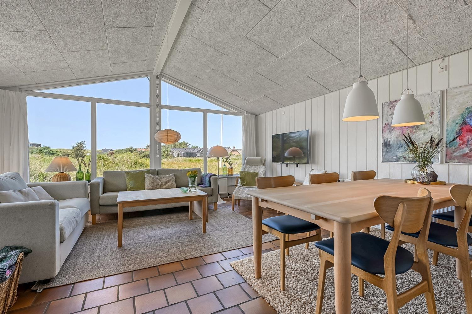 Schon wenn das Auto den Kiesweg erreicht, nur wenige Minuten vom Haus, werden Sie die Lage und das besondere Haus bemerken. Wenn Sie auf dem Grundstück das Auto am Haus geparkt haben fängt der Urlaub an. Das Haus hat etwa 92 m2. Ein schöner Flur heisst Sie wilkommen und führt Sie direkt zur schönen und modernen Küche. Von der Küche und dem Wohnraum haben Sie ein tollen Blick zu den Dünen. Die Küche ist sehr gut eingerichtet und hat einen Herd mit Cerankochfeld, Abzugshaube, Mikrowelle, Kühlschrank mit Gerfrierfach und Geschirrspüler. Dicht bei der Küche steht der Esstisch, wo es Platz für die ganze Familie gibt. Der Wohnraum ist mit schönen Polstermöbeln eingerichtet und von hier können Sie dänische und deutsche Programme sehen und es gibt die Möglichkeit , TV / Radio / Apps über Chromecast zu streamen. Wenn Sie ein Mobiltelefon oder ein anderes Gerät bei sich haben, können Sie über Ihr Abonnement streamen. Sie können dies alles auf dem Flachbildschirm, der auf der Wand hängt geniessen. Ein sehr energiefreundliches Haus mit einer energiesparenden Wärmepumpe, die beide für eine schöne Wärme einfach und günstig sorgen. So hat man auch eine schöne Wärme an den kalten Herbsttagen. 3 Schlafräume: 1DB + 2B + 1B alle mit Holzböden. Badezimmer mit Dusche, Toilette, Waschbecken und Fliesenboden mit Fussbodenheizung. Extra Toilette mit Toilette, Waschbecken und Fussbodenheizung. Waschmaschine und Kinderstuhl sind vorhanden. Alle Aufenthaltsräume sind mit Holzboden mit Fussbodenheizung. Nichtraucher-Haus. Haustiere sind nicht erlaubt. Haben Sie ein elektrisches Auto gibt es beim Haus ein aussen Ladestation auf cee 16 amp. Schönes Schuppen zum Aufbewahren von Fahrräder u.a. Es gibt ein einen 3 Fasen 16 A,mp CEE Steck, der bis 11 KwH aufladen können. So haben Sie ein E-Bike oder ein Plug-in-Hydrid Auto können Sie beim Haus aufladen.