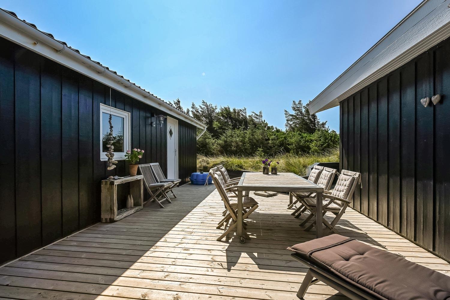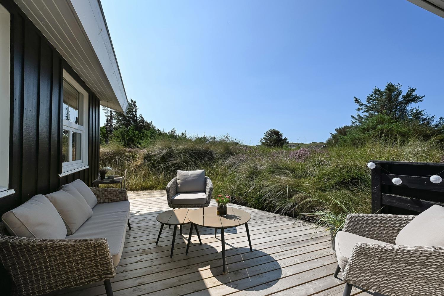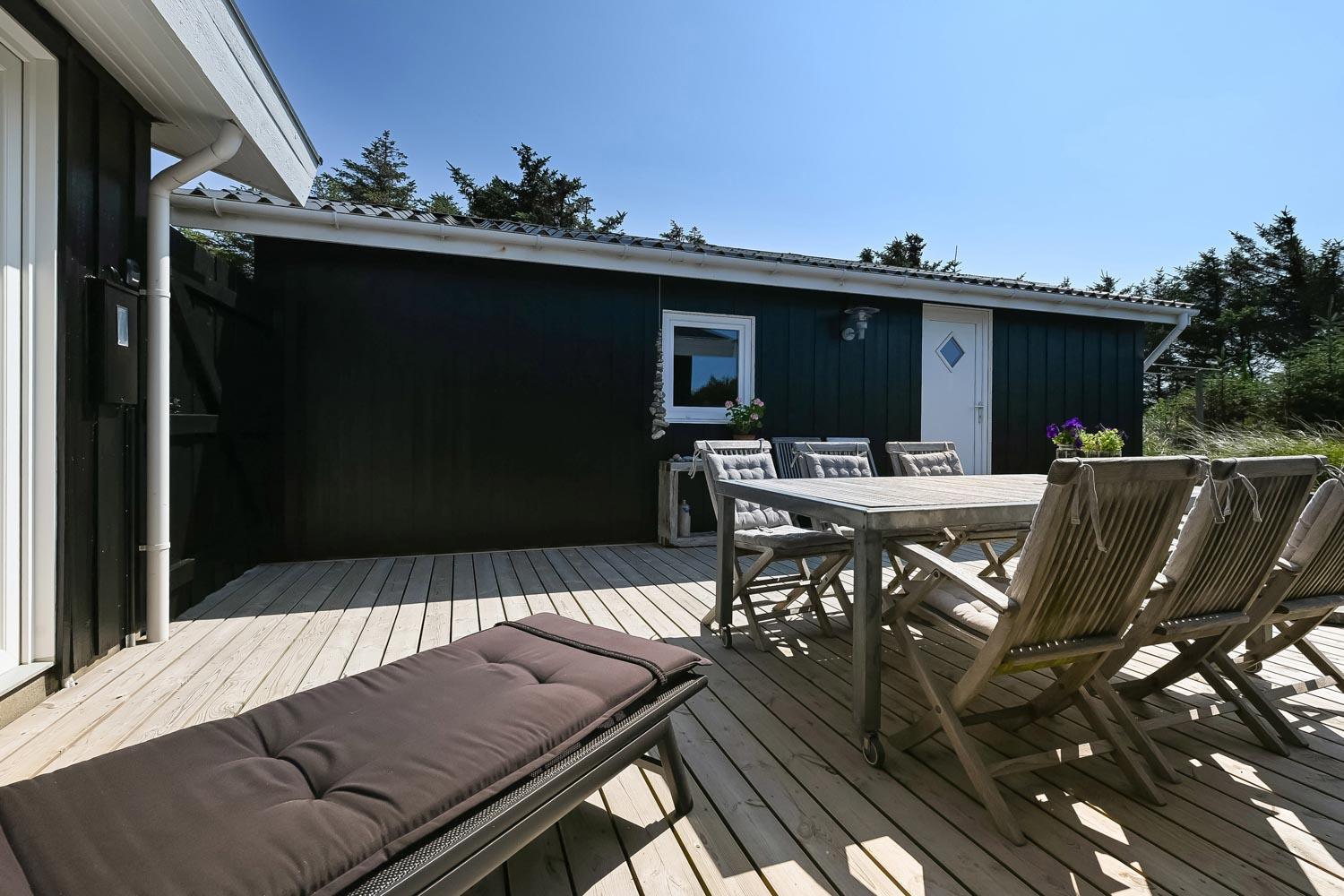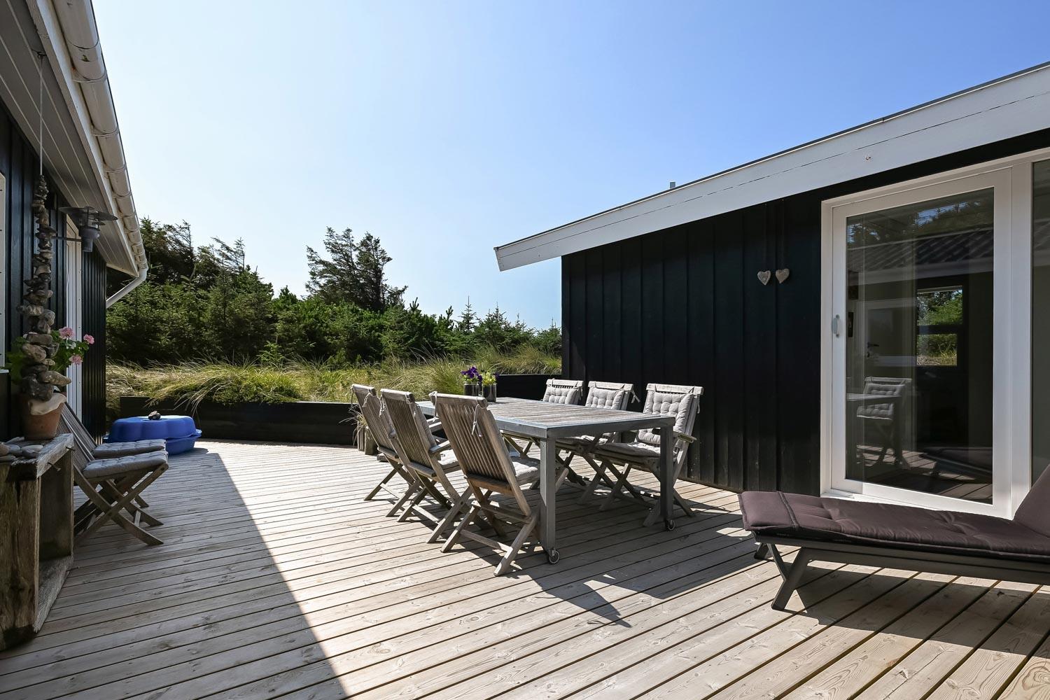 Das Haus liegt auf einem etwa 2.500 m2 grossen Naturgrundstück . Vom Flur gibt es einen Ausgang zu einer ganz fantastischen, geschlossenen und überdachten Terrassenanlage von etwa 60 m2 mit guten Gartenmöbeln, Sonnenliegen, Sonnenschirm und Grill. Eine Anlage, wo Sie immer Windschutz finden, auch an den windigen Tagen. Geniessen Sie einen Grillabend, egal wie das Wetter ist,Ein schönes Naturgrundstück mit vielen Möglichkeiten. In Vejlby Klit und Umgebung gibt es gute Möglichkeiten um Fahrrad zu fahren, Wanderungen zu unternehmen oder zu laufen. Das Haus liegt bloss etwa 200 m von der Nordsee entfernt, die jeden Tag aufs neue malerische Erlebnisse bietet. Bloss 400 m vom Haus liegt Ferring See hier ist gute möglichkeiten für Kite Surfing. In der Saison können Sie Ihre Brötchen und Lebensmitteln beim Kaufladen besorgen, oder Sie können im kleinen Restaurant John Wayne zum Essen gehen. Dieses sehr spezielle und sehr charmante Haus ist eine Klasse für sich und bietet ein Urlaubserlebniss, egal zu welcher Jahreszeit.
