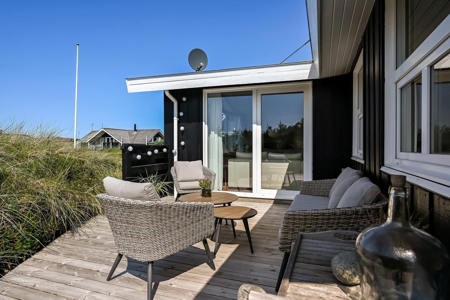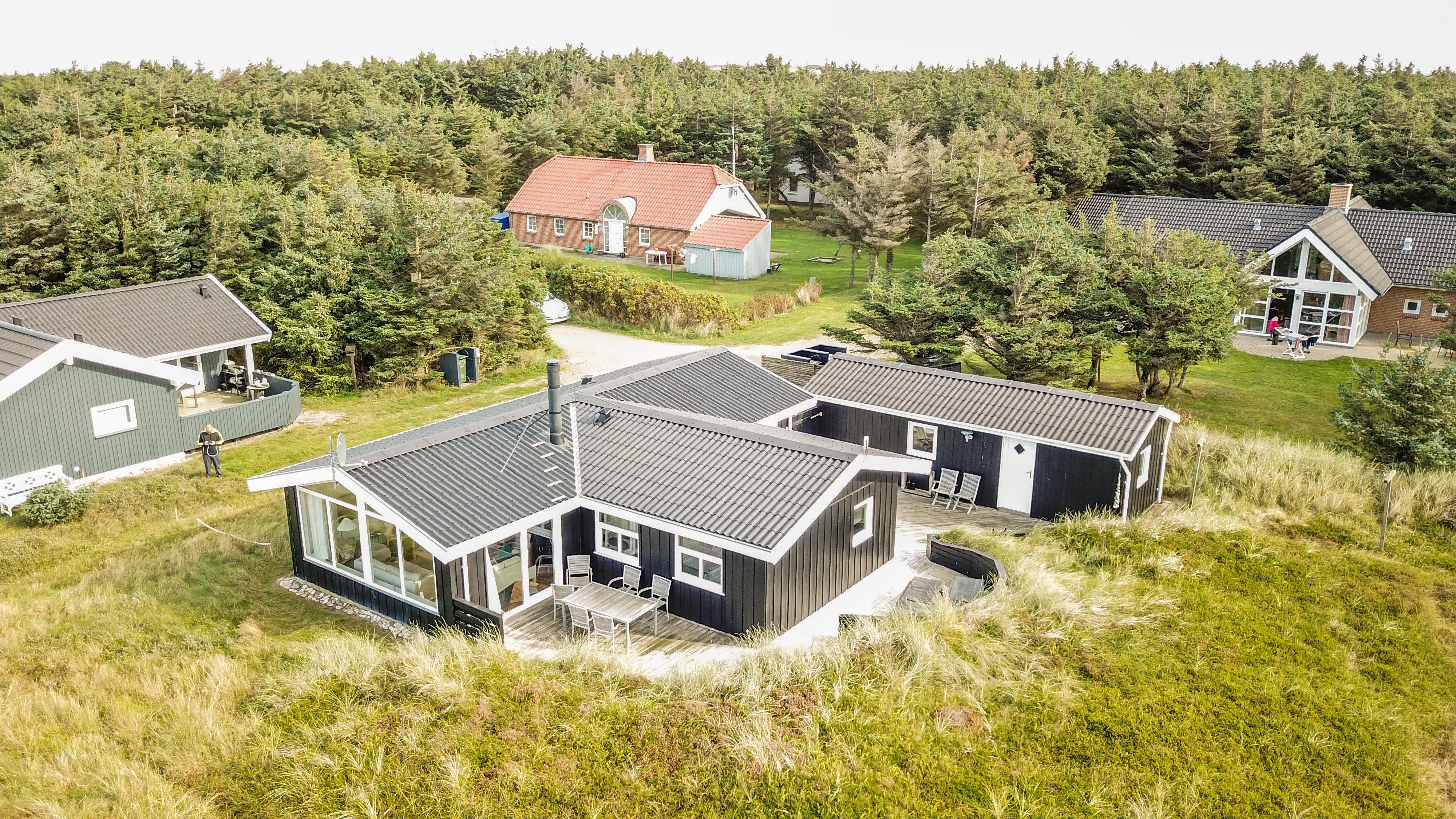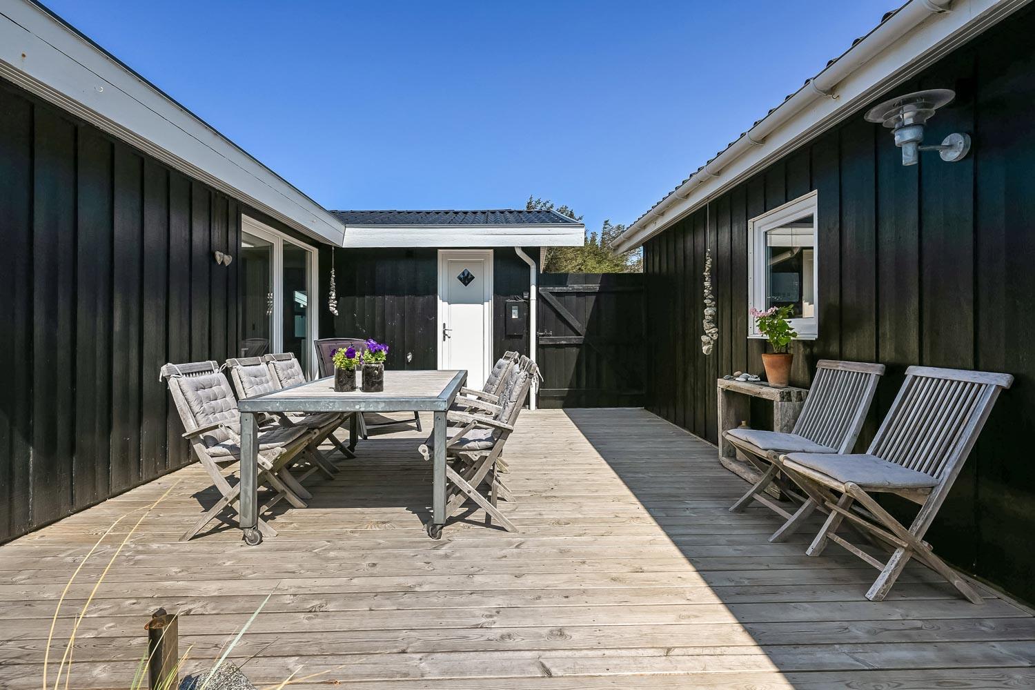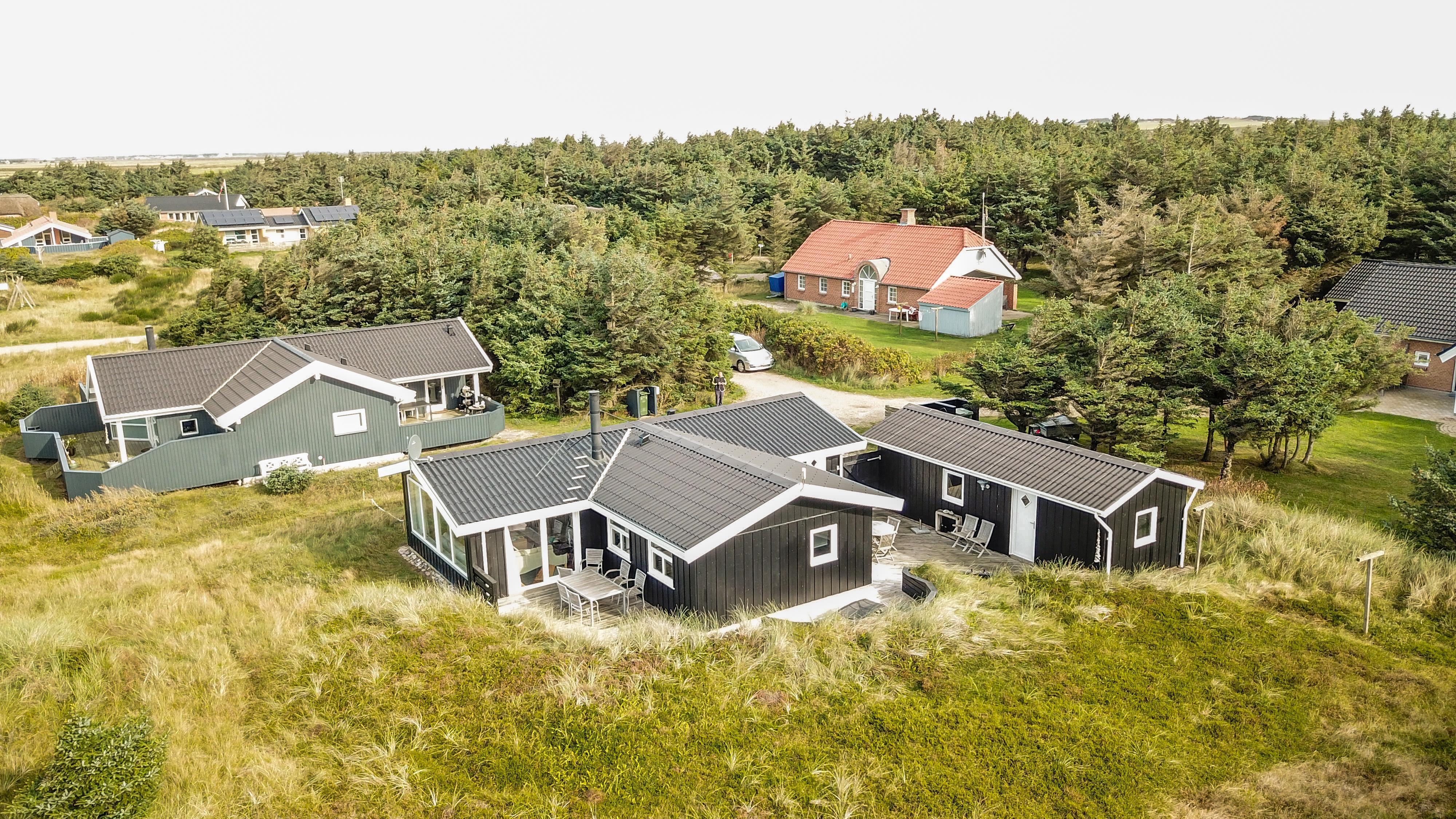 Das Haus liegt auf einem etwa 2.500 m2 grossen Naturgrundstück . Vom Flur gibt es einen Ausgang zu einer ganz fantastischen, geschlossenen und überdachten Terrassenanlage von etwa 60 m2 mit guten Gartenmöbeln, Sonnenliegen, Sonnenschirm und Grill. Eine Anlage, wo Sie immer Windschutz finden, auch an den windigen Tagen. Geniessen Sie einen Grillabend, egal wie das Wetter ist,Ein schönes Naturgrundstück mit vielen Möglichkeiten. In Vejlby Klit und Umgebung gibt es gute Möglichkeiten um Fahrrad zu fahren, Wanderungen zu unternehmen oder zu laufen. Das Haus liegt bloss etwa 200 m von der Nordsee entfernt, die jeden Tag aufs neue malerische Erlebnisse bietet. Bloss 400 m vom Haus liegt Ferring See hier ist gute möglichkeiten für Kite Surfing. In der Saison können Sie Ihre Brötchen und Lebensmitteln beim Kaufladen besorgen, oder Sie können im kleinen Restaurant John Wayne zum Essen gehen. Dieses sehr spezielle und sehr charmante Haus ist eine Klasse für sich und bietet ein Urlaubserlebniss, egal zu welcher Jahreszeit.