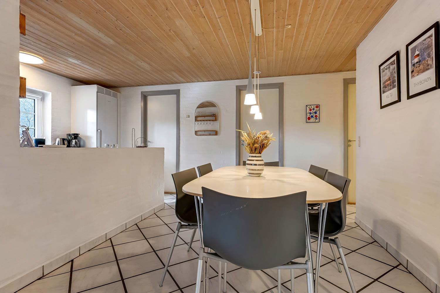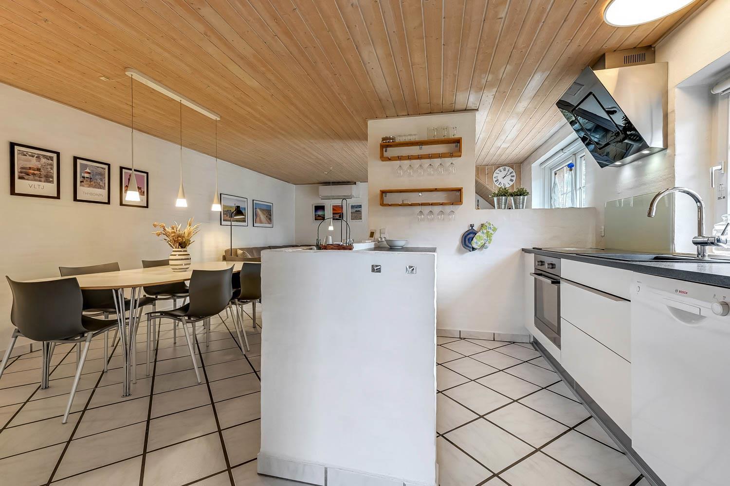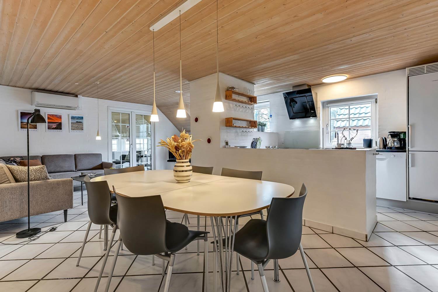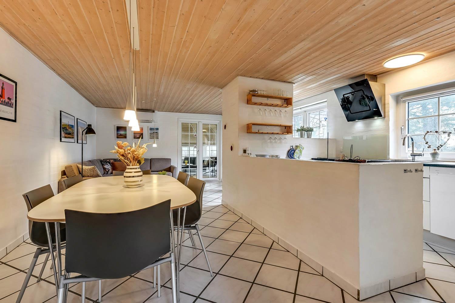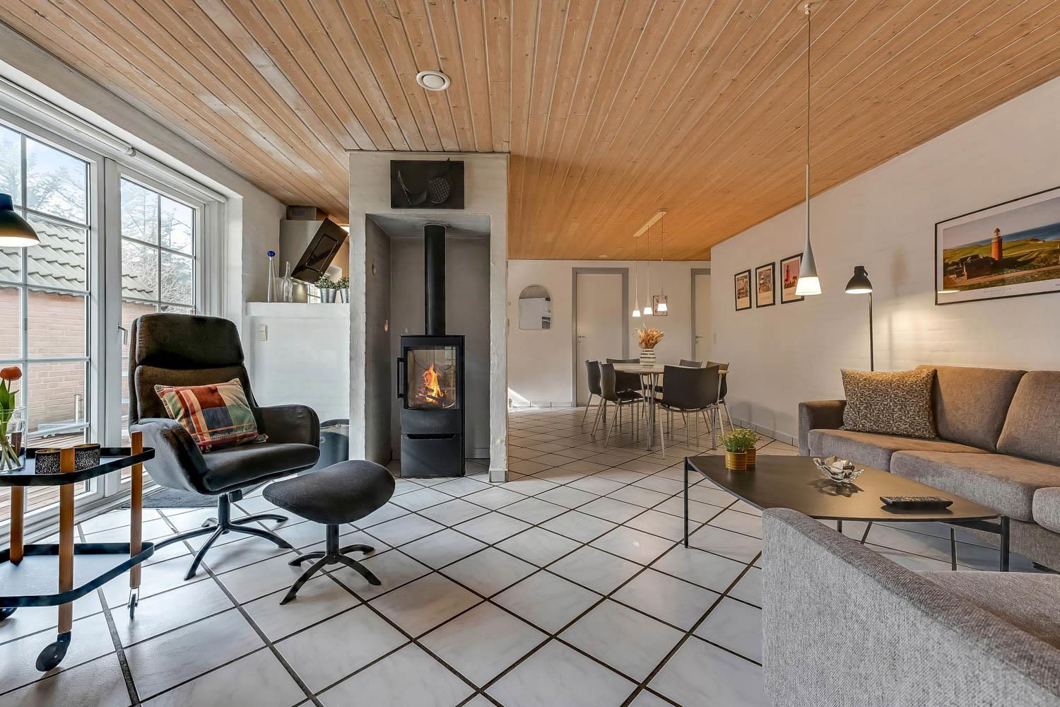 Parken Sie das Auto auf dem angelegten Hofplatz und beginnen Sie mit dem Auspacken. Ein schöner Eingangbereich mit Waschbecken, Waschmaschine und Trockner heißt Sie willkommen und führt direkt in die neue, moderne Küche aus 2018. Hier gibt es alles an Geschirr und Kochgeräten. Die schicke, offene Küche ist ausgestattet mit Cerankochfeld, Backofen, Dunstabzugshaube, Mikrowelle, Kühlschrank mit Gefrierfach und Geschirrspüler. Neben der Küche befindet sich der Esstisch für 8 Personen mit ausreichend Platz für die ganze, hungrige Familie. Der Wohnraum hat ein schönes Ecksofa, von dem Sie dänische und deutsche Programme auf dem Flachbild-Schirm sehen können, der an der Wand hängt. Ein schöner Kaminofen und eine stromsparende Wärmepumpe sorgen dafür, dass Sie das Haus aufwärmen können und die Wärme an kalten Tagen halten können; die moderne Genvexanlage sorgt im Haus für einen Luftaustausch bis zu 92%, schafft ein fantastisches Raumklima und hilft, bei der Stromrechnung zu sparen. Vier große und helle Zimmer (1 DB, 1 DB, 2 EB, 1 Etagenbett). Das Badezimmer verfügt über Dusche, Toilette, Waschbecken und Fliesenboden mit Fußbodenheizung. Gehen Sie am Fernseher vorbei und schließen Sie die Tür zu einem ganz besonderen und einzigartigen Wellnessraum mit großem Whirlpool, Sauna sowie einem zusätzlichen Badezimmer mit Dusche, Toilette, Waschbecken und Fliesenboden mit Fußbodenheizung. Im Wellnessbereich gibt es auch bequeme Sitzmöglichkeiten. Das Haus hat Fliesenböden im Wohnzimmer und in der Küche sowie Holzböden in den Schlafzimmern. Es ist daher sehr pflegeleicht. Nichtraucherhaus. 2 Haustiere erlaubt.